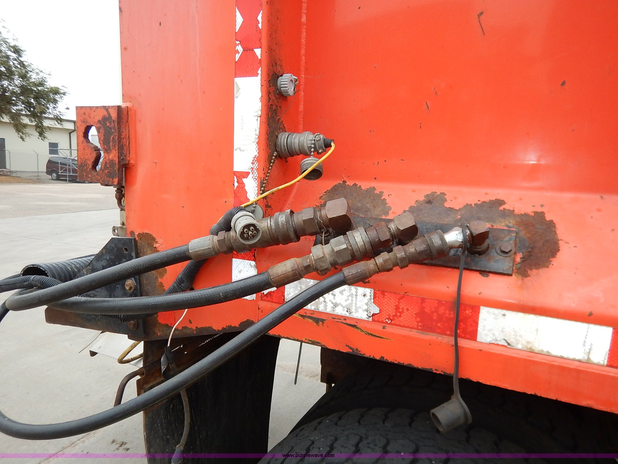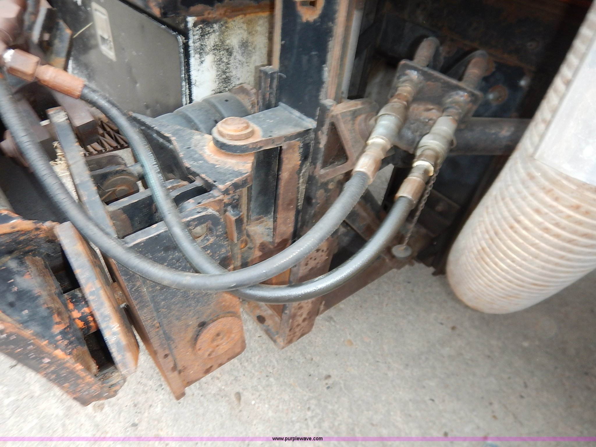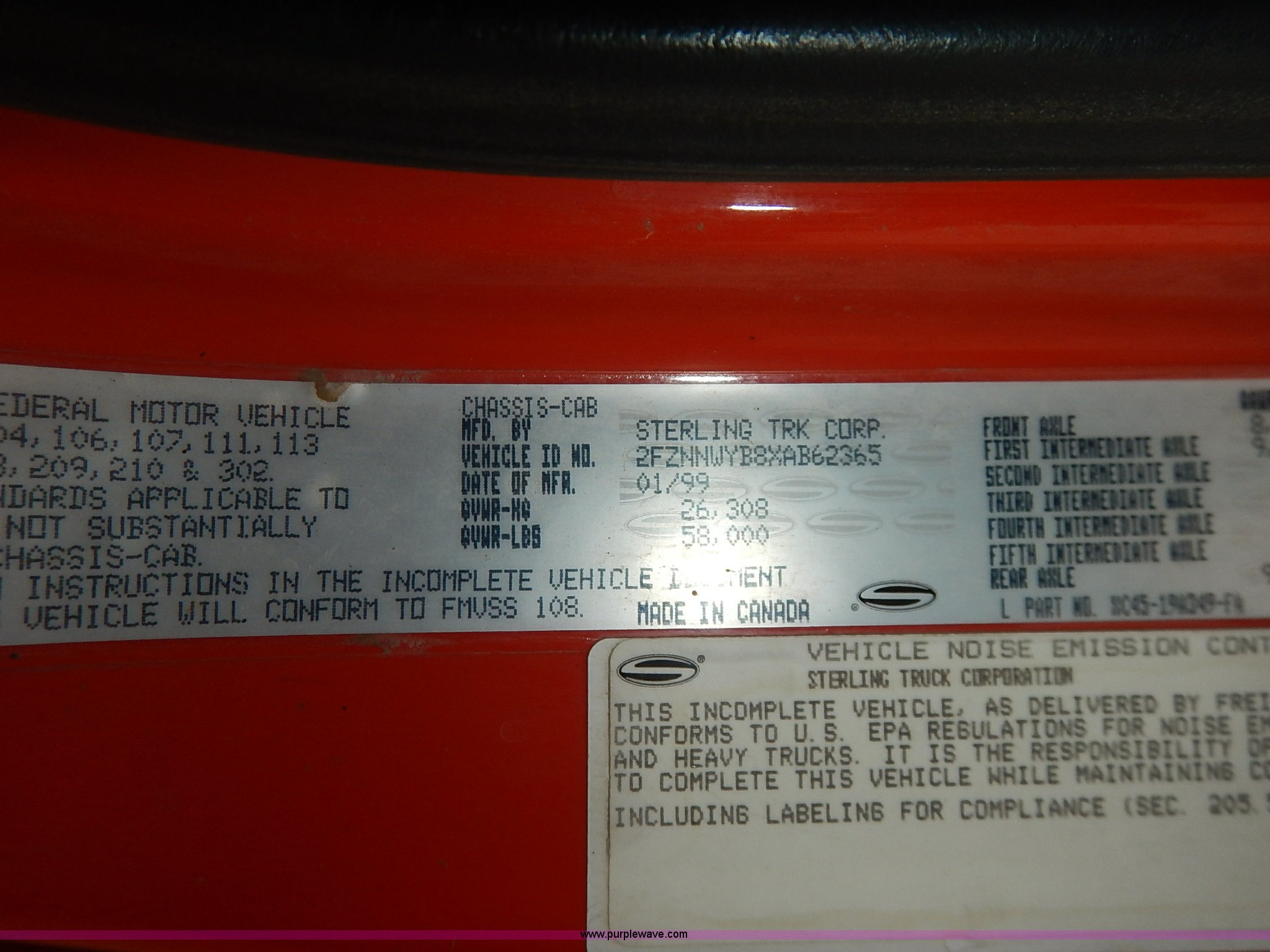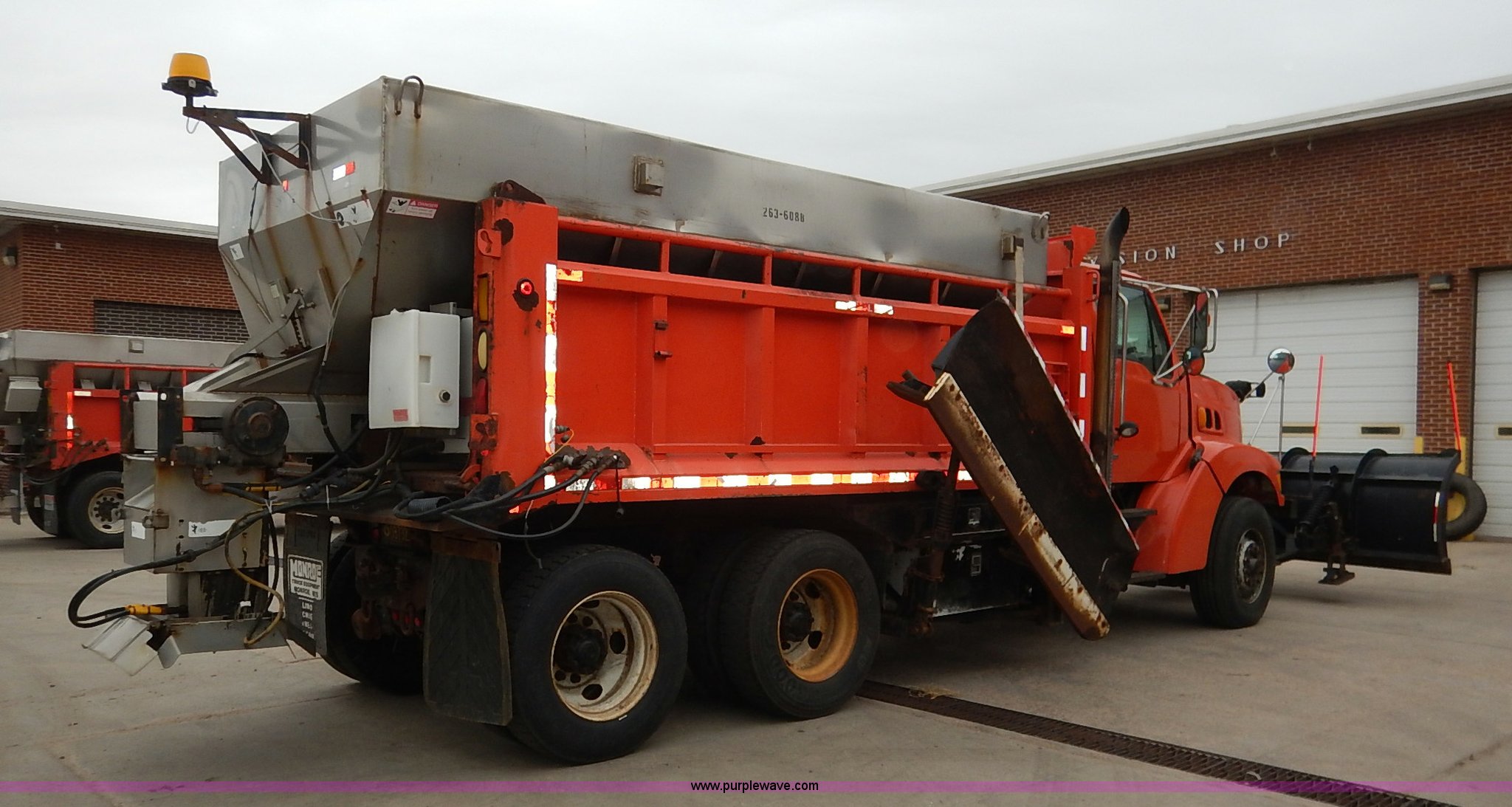 Purple Wave is selling a used Construction Dump Truck in Kansas. This item is a 1999 Sterling L9511 dump truck with the following: 235,154 miles on odometer, 8,814 hours on meter, Caterpillar 3306 1035L L6 turbo diesel engine, Eaton Fuller nine speed manual transmission, Heat, AM/FM, Heated mirrors, Air suspension seat, PTO, 15'L x 8'W steel dump bed, Toolboxes, Monroe reversible snow plow, 11'W, Side wing snow plow, 8'W, Warren V-box stainless steel spreader, Nine cubic yard capacity, Gresen spreader contorls, 200 gallon pre-wet tanks, Backup alarm, Work lights, Pintle hitch, Trailer wiring, Spring suspension, Air brakes, 18' wheelbase, 315/80R22.5 front tires, 295/75R22.5 rear tires, GVWR 58,000 lbs, FAWR 18,000 lbs, RAWR 20,000 lbs, Strobe lights will be removed prior to auction, Paint faded, Dents and scratches, Rust, Brakes adjusters need replaced, KDOT ID 263-6119