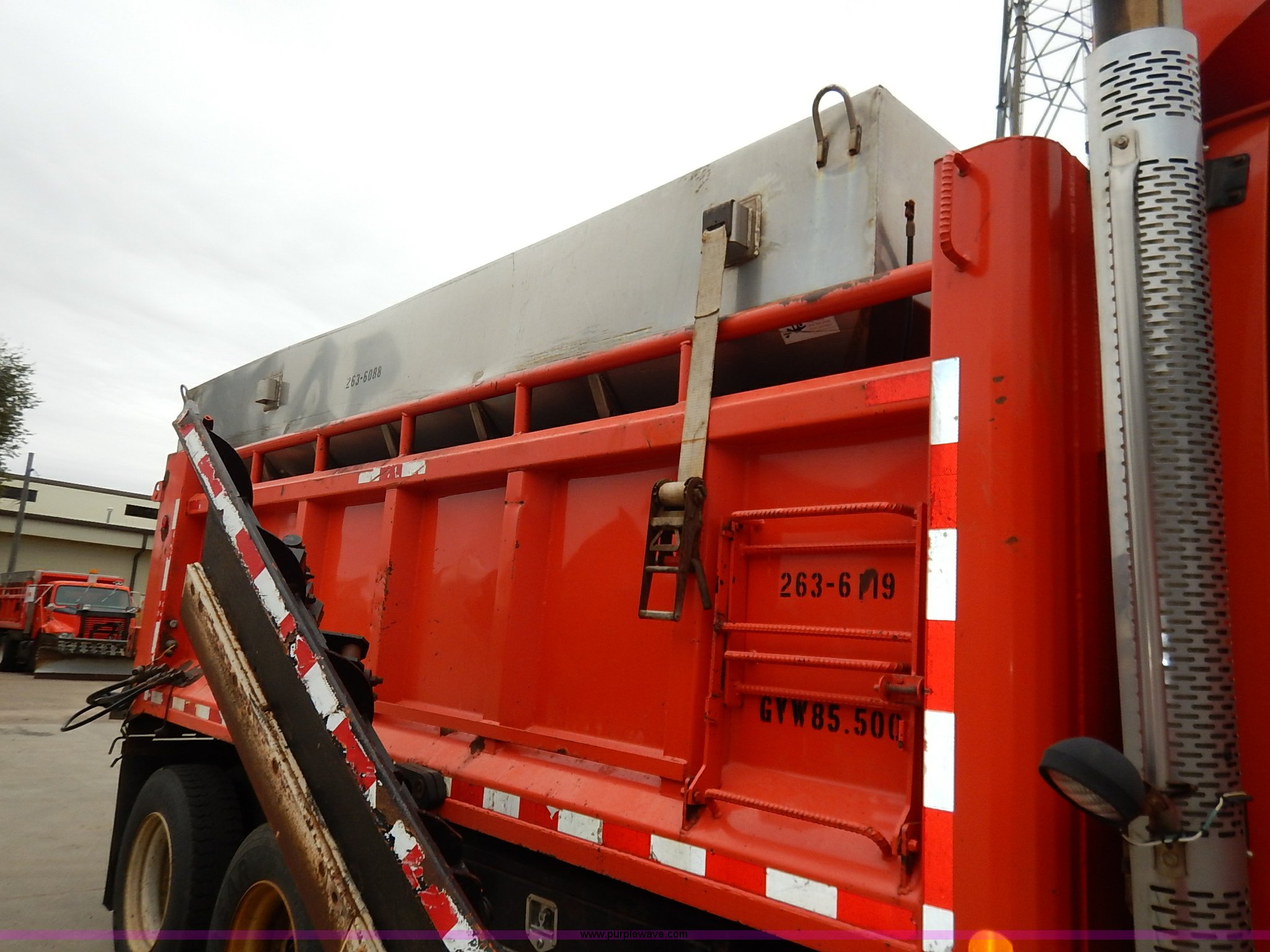 1999 Sterling L9511 dump truck. 235,154 miles on odometer, 8,814 hours on meter, Caterpillar 3306 1035L L6 turbo diesel engine, Eaton Fuller nine speed manual transmission, Heat, AM/FM, Heated mirrors, Air suspension seat, PTO, 15'L x 8'W steel dump bed Toolboxes, Monroe reversible snow plow 11'W, Side wing snow plow 8'W, Warren V-box stainless steel spreader Nine cubic yard capacity, Gresen spreader contorls, 200 gallon pre-wet tanks, Backup alarm, Work lights, Pintle hitch, Trailer wiring, Spring suspension, Air brakes, 18' wheelbase, 315/80R22.5 front tires, 295/75R22.5 rear tires, GVWR 58,000 lbs, FAWR 18,000 lbs, RAWR 20,000 lbs, Strobe lights will be removed prior to auction, Paint faded, Dents and scratches, Rust, Brakes adjusters need replaced, KDOT ID 263-6119. Titles will be distributed after confirmation of payment and removal. 2FZNNWYB8XAB62365. View equipment video. Kansas Department of Transportation - Garden City. 121 N. Campus Drive. Garden City, KS 67846