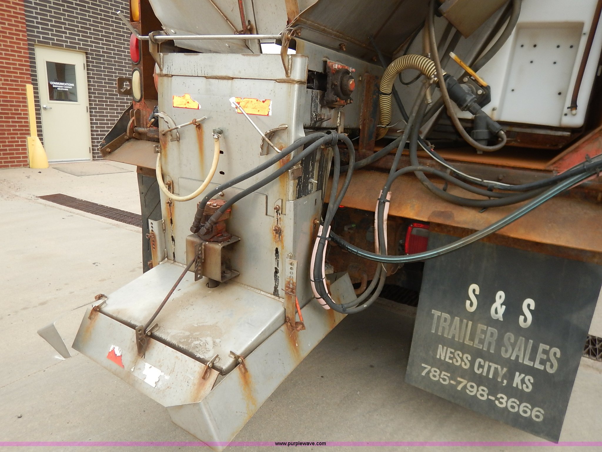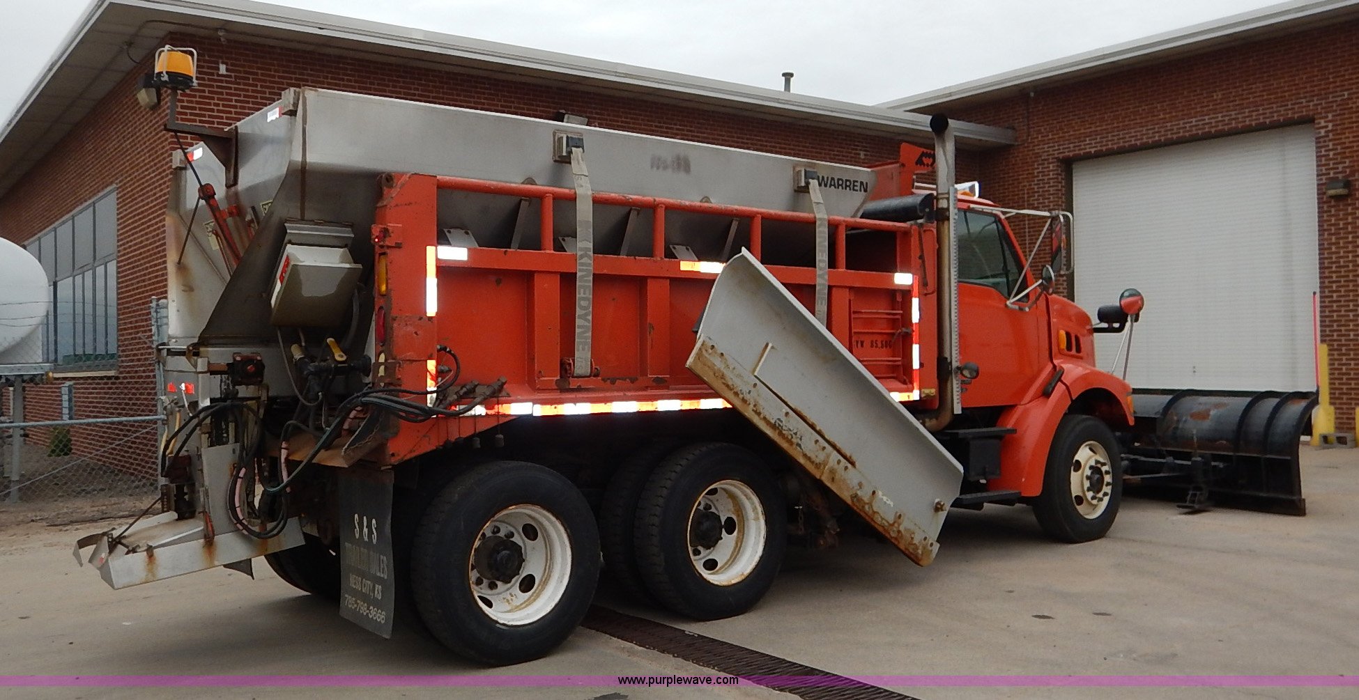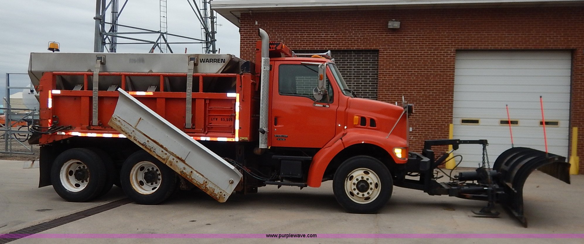 Purple Wave is selling a used Construction Dump Truck in Kansas. This item is a 2001 Sterling LP7500 dump truck with the following: 163,598 miles on odometer, 6,351 hours on meter, Caterpillar 3126 7.2L L6 turbo diesel engine, 250 HP, Allison MD3060 automatic transmission, Tandem axle, AC and heat, Cruise, AM/FM, Heated mirrors, Air suspension seat, Block heater, Front mounted PTO, Warren WFL651-13 steel dump bed, 13'L x 8'W, Nine to 11 cubic yard capacity, Roll-over tarp, Flink reversible snow plow, 11'W, 8' wing plow, Warren V-box stainless steel spreader, Nine cubic yard capacity, 200 gallon pre-wet tanks, Force SSC1500 spreader control, Work lights, Backup alarm, Pintle hitch, Trailer wiring, Spring suspension, Air brakes, 295/75R22.5 front tires, GVWR 53,200 lbs, FAWR 13,200 lbs, RAWR 20,000 lbs, Strobe lights will be removed prior to auction, Paint faded, Dents and scratches, Hydraulic leaks, Rust, Brake adjusters and shoes need replaced, Engine uses oil, Engine leaks oil, KDOT ID 263-6051