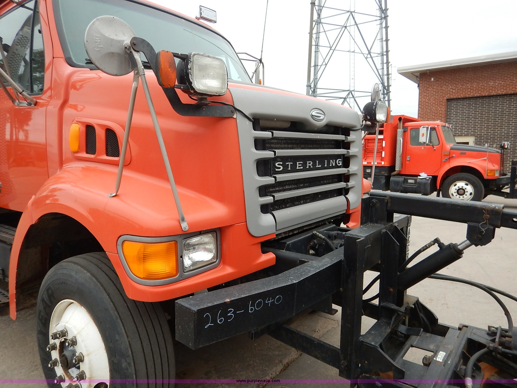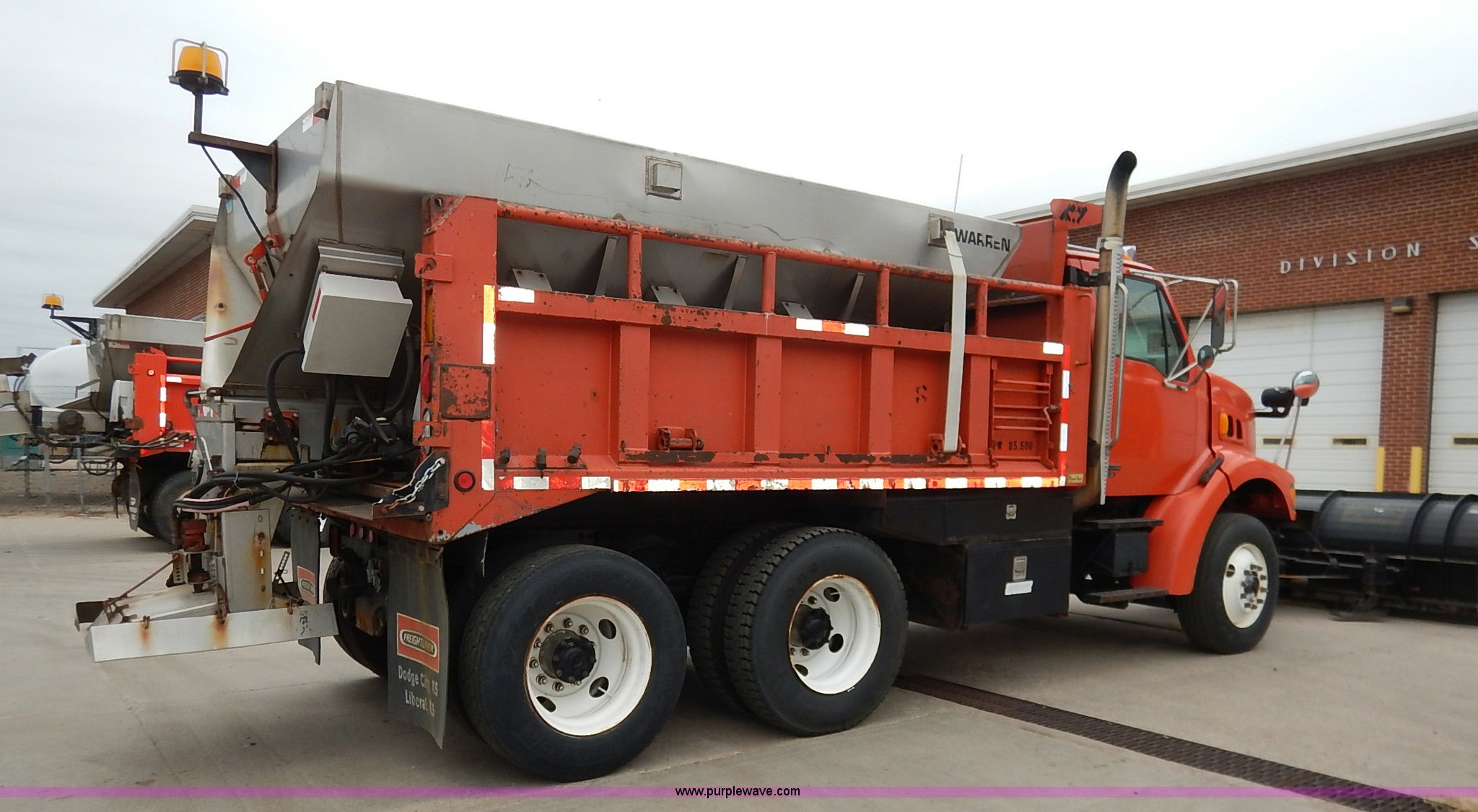 Purple Wave is selling a used Construction Dump Truck in Kansas. This item is a 2001 Sterling LT7500 dump truck with the following: 176,560 miles on odometer, 8,726 hours on meter, Caterpillar 3126 7.2L L6 turbo diesel engine, 250 HP, Serial 8YL94850, Tandem axle, AC and heat, Cruise, AM/FM, Heated mirrors, Block heater, Front mounted PTO, Warren WFL650-13 steel dump bed, 13'L x 8'W, Toolboxes, Roll-over tarp frame, No tarp,, Flink reversible snow plow, 11'L, Warren V-box stainless steel spreader, Nine cubic yard capacity, 200 gallon pre-wet tanks, Gresen spreader controls, 15' wheelbase, 295/75R22.5 front tires, GVWR 53,200 lbs, FAWR 13,200 lbs, RAWR 20,000 lbs, Paint faded, Dents and scratches, Rust, Engine oil leaks, KDOT ID 263-6040