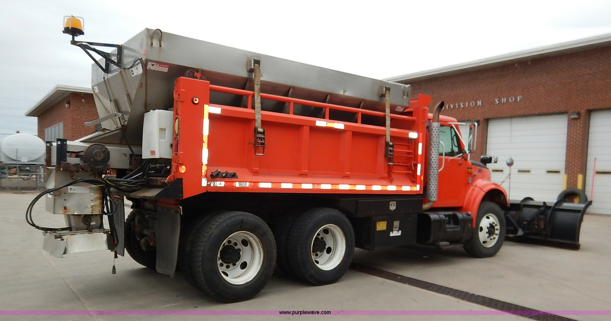 Purple Wave is selling a used Construction Dump Truck in Kansas. This item is a 1999 International 4900 dump truck with the following: 165,343 miles on odometer, 7,599 hours on meter, International DT530 8.7L L6 turbo diesel engine, Allison MD3060 automatic transmission, Inter-axle differential lock, Tandem axle, Heat, Cruise, AM/FM/Weatherband, Air suspension seat, Block heater, PTO, Work lights, Backup alarm, 13'L x 8'W steel dump bed, 200 gallon pre-wet kit, Force SSC1500 spreader control, Toolbox, Monroe reversible snowplow, 11'W, Warren V-box stainless steel spreader, Nine cubic yard capacity, Single fuel tank, Pintle hitch, Trailer wiring, Spring suspension, Air brakes, 295/75R22.5 tires, Strobe lights are not included, Paint faded, Dents and scratches, Rear suspension bushings need replaced, KDOT ID 264-6039