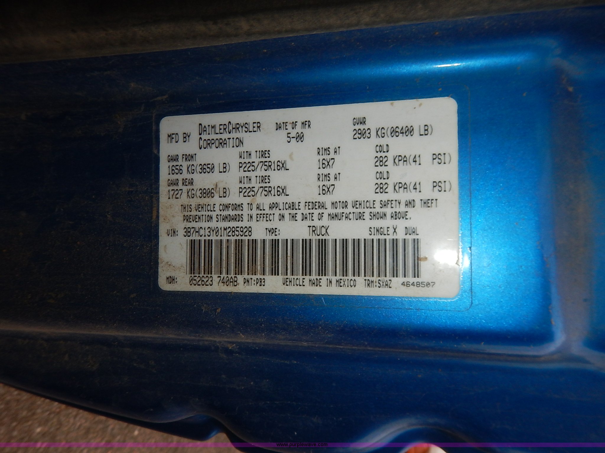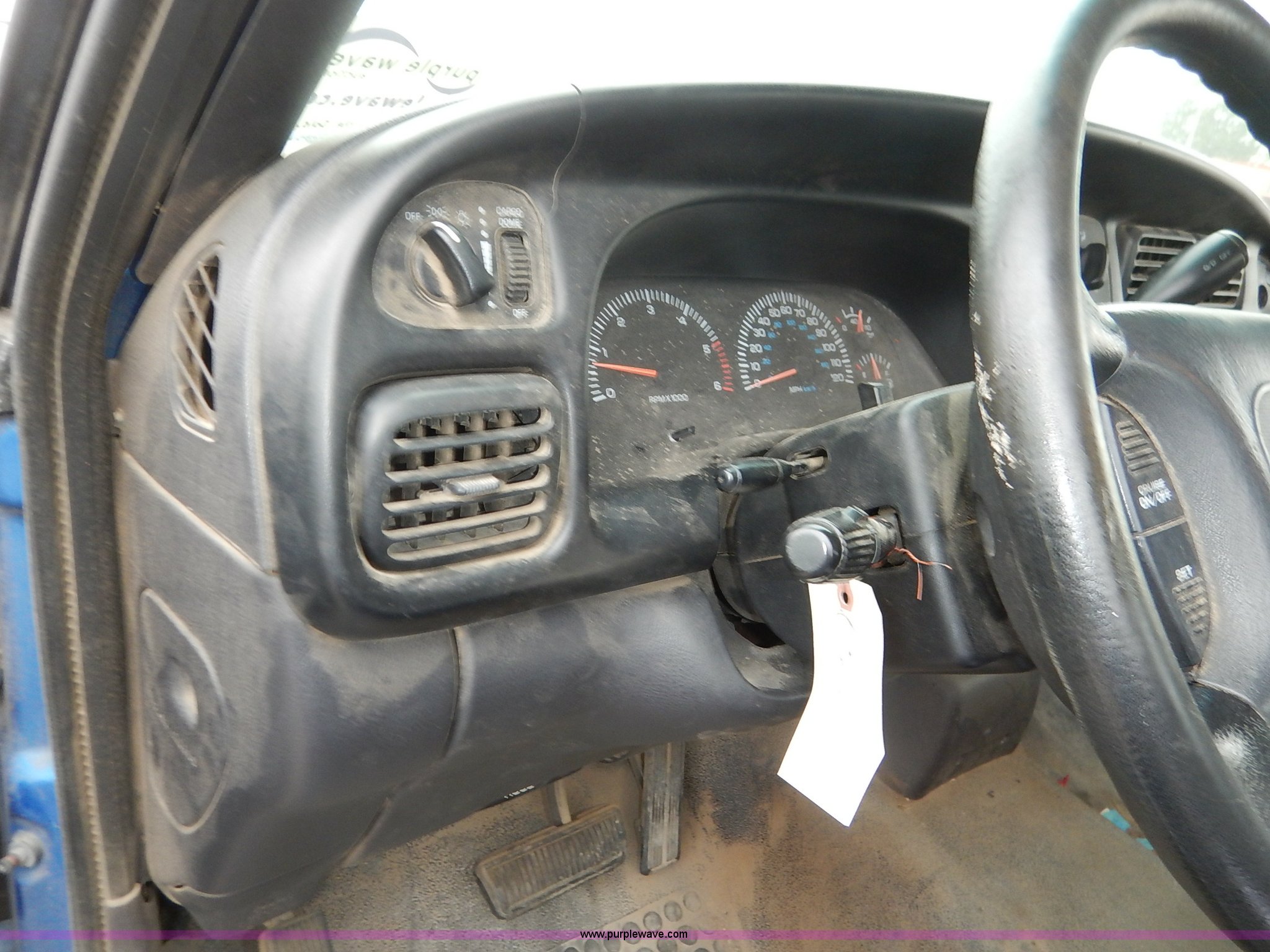 Purple Wave is selling a used 1/2 Ton Pickup or Van in Kansas. This item is a 2001 Dodge Ram 1500 Quad Cab pickup truck with the following: 156,990 miles on odometer, 5.2L V8 OHV 16V gas engine, Automatic transmission, AC and heat, Tilt, Cruise, AM/FM/cassette, Manual windows and locks, Vinyl interior, Bed cover, 225/75R16 tires, Battery dead, Paint faded, Dents and scratches, Rust, Seat torn, Ball joints bad, Dash damaged, KDOT ID 051-0060