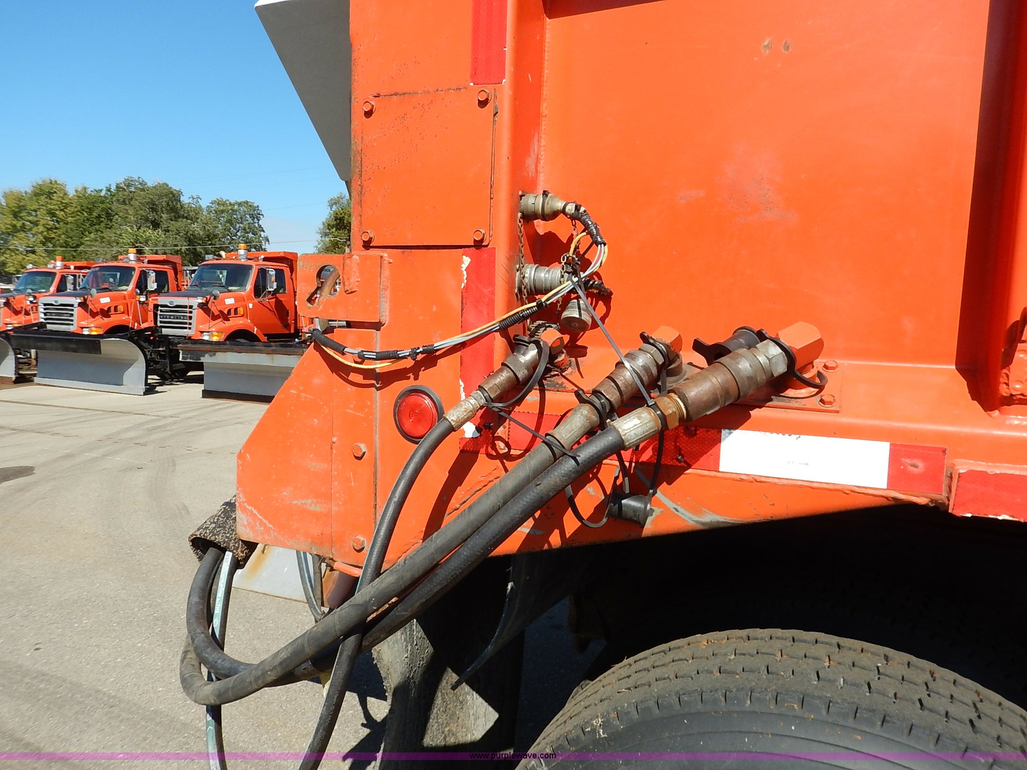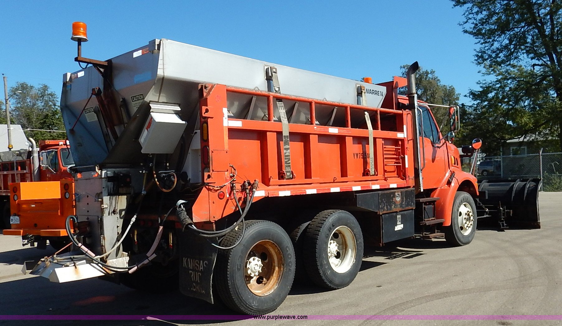 2001 Sterling LT7501 dump truck. 187,052 miles on odometer, 8,806 hours on meter, Caterpillar 3126 7.2L L6 turbo diesel engine 250 HP, Serial 8YL92974, Allison MD3060P automatic transmission, Tandem axle, AC and heat, Cruise, AM/FM, Heated mirrors, Air suspension seat, Block heater, Front mounted PTO, Warren WFL650-13 steel dump bed 15'L x 8'W, 9 to 11 cubic yard capacity, Roll-over tarp, Toolboxes, Flink rotating trip snow plow 11'W, Warren V-Box spreader Stainless steel construction, 9 cubic yard capacity, 200 gallon pre-wet side tanks, Electric controlled hydraulic system, Strobe lights, Front work lights, Backup alarm, Gressen spreader controls, Pintle hitch, Trailer wiring, Spring suspension, Air brakes, 6:43 gear ratio, 295/75R22.5 tires, Meritor RT-40-145 differentials, GVWR 53,200 lbs, FAWR 13,200 lbs, RAWR 20,000 lbs, Dents and scratches, Paint faded, Oil and coolant needs added weekly, KDOT ID 263-2120. Titles will be distributed after confirmation of payment and removal. 2FZHATAK41AH88844. View equipment video. Kansas Department of Transportation - Salina. 1006 N 3rd. Salina, KS 67402
