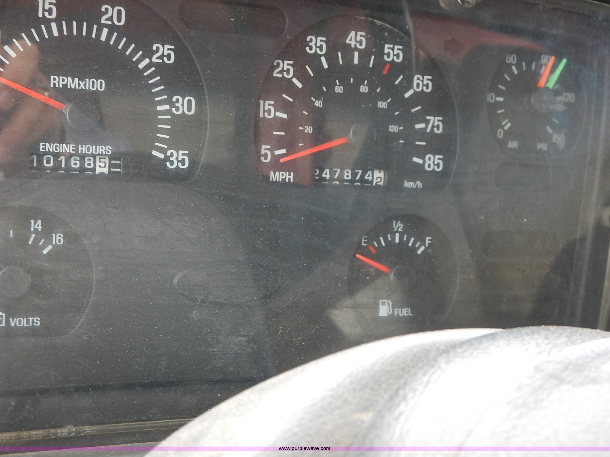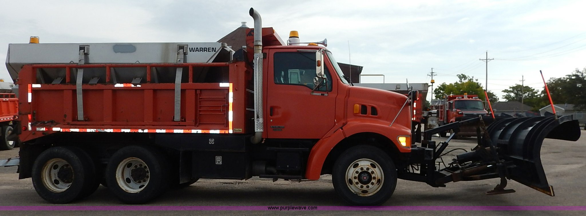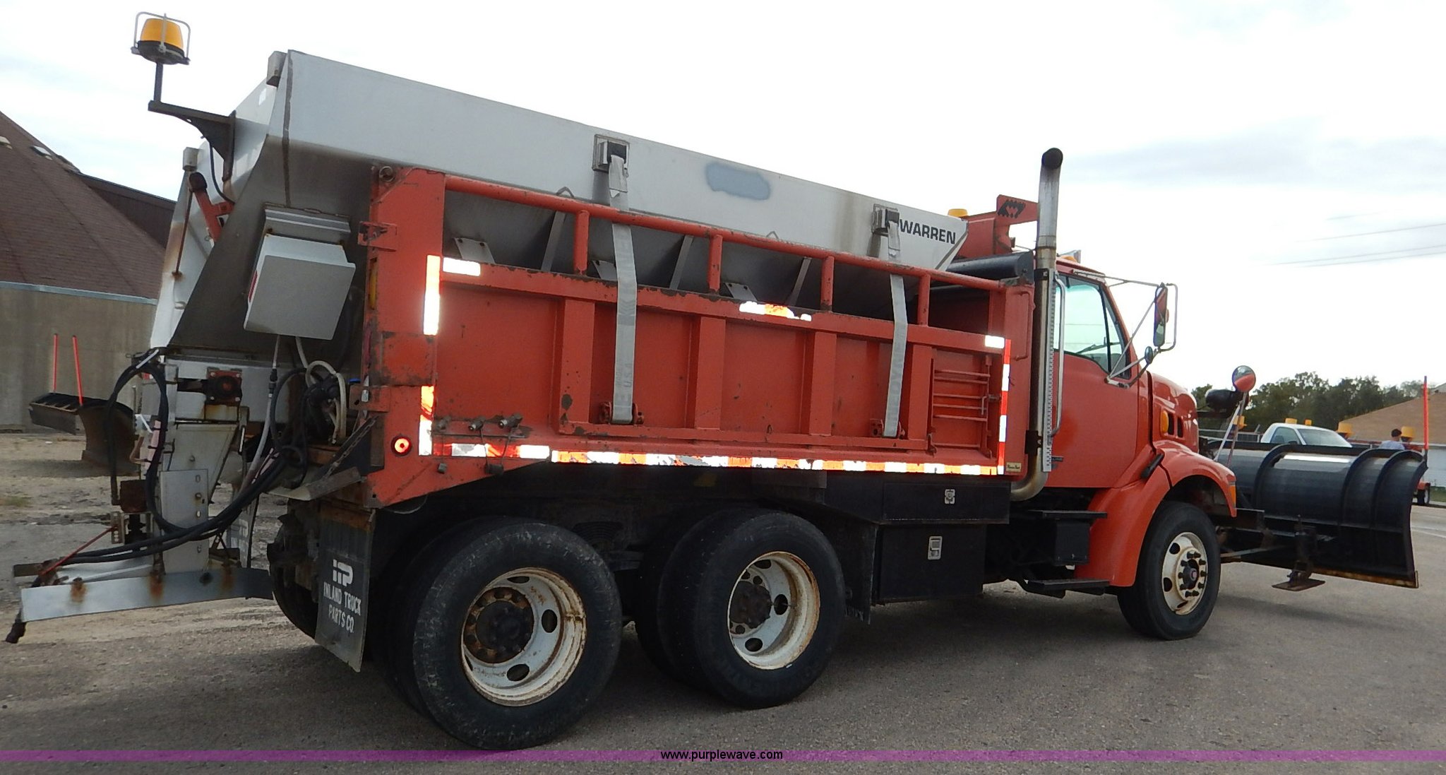 Purple Wave is selling a used Construction Dump Truck in Kansas. This item is a 2001 Sterling LT7501 dump truck with the following: 247,874 miles on odometer, 10,168 hours on meter, Caterpillar 3126 7.2L L6 diesel engine, 250 HP, Serial 8YL87802, Allison automatic transmission, Tandem axle, AC and heat, AM/FM, Heated mirrors, Air suspension seat, Block heater, Front mounted PTO, Warren 13'L x 8'W steel dump bed, Nine cubic yard capacity, Flink snow plow, 11'W, Warren V-box stainless steel spreader, 13'L x 7'W, Nine cubic yard capacity, 200 gallon pre-wet tanks, Greesen spreader controls, Strobe lights, Backup alarm, Single fuel tank, Spring suspension, Air brakes, 15' wheelbase, 275/80R22.5 front tires, GVWR 53,200 lbs, FAWR 13,200 lbs, RAWR 20,000 lbs, Windshield cracked, Paint faded, Dents and scratches, Brakes soft, Engine oil leaks, Front seal leaks, Hoist leaks, Tires worn, KDOT ID 263-3150