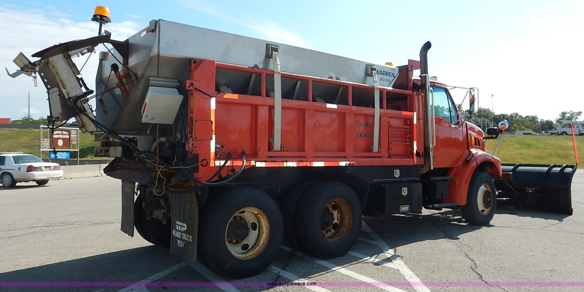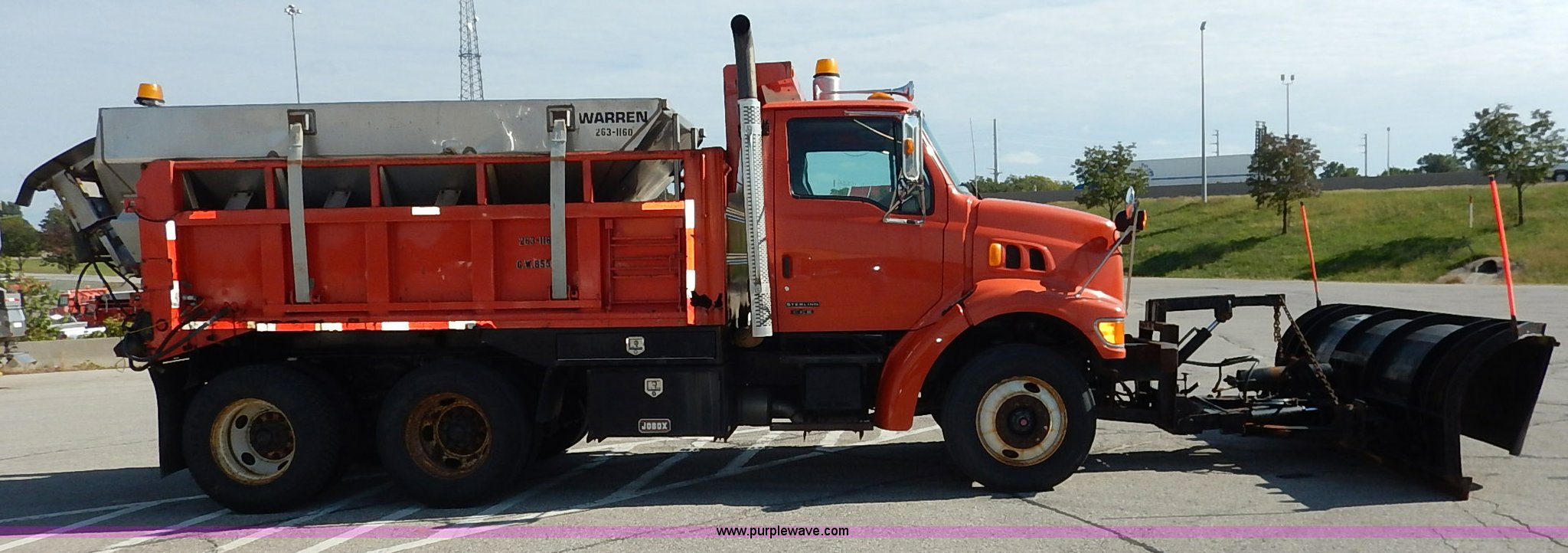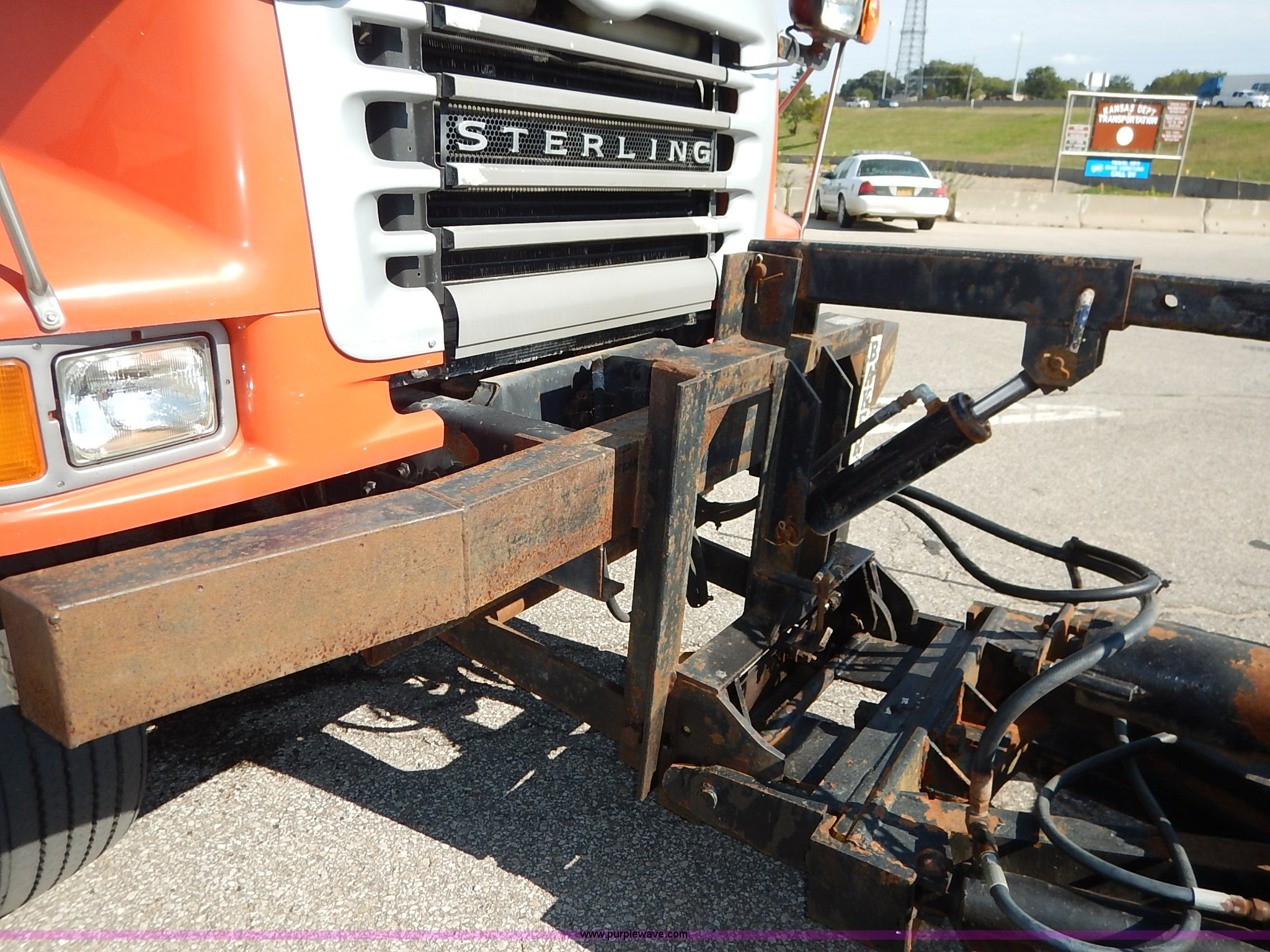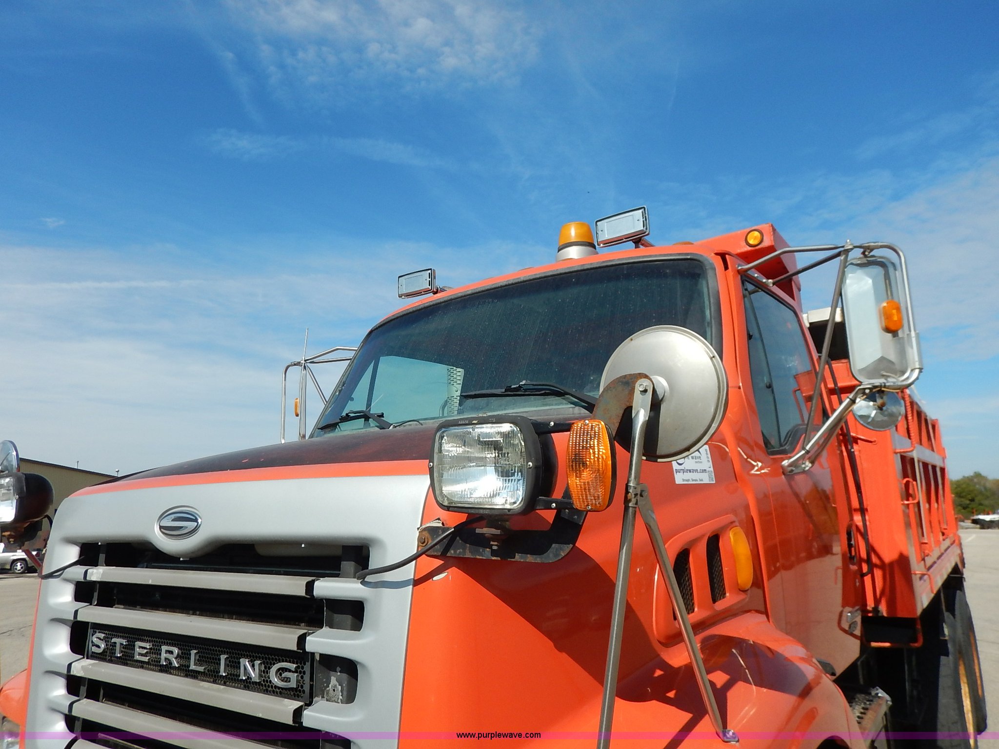 Purple Wave is selling a used Construction Dump Truck in Kansas. This item is a 2001 Sterling LT7500 dump truck with the following: 115,740 miles on odometer, 11,176 hours on meter, Caterpillar 3126 7.2L L6 turbo diesel engine, 250 HP, Allison automatic transmission, Tandem axle, AC and heat, Cruise, AM/FM, Air suspension seat, Heated mirrors, Block heater, Strobe lights, Work lights, Air horn, Front mount PTO, Warren steel dump bed, 13'L x 8'W, Nine yard capacity, Flink 11'W plow, Reversible, Warren V-box spreader, 13' x 7', Stainless steel construction, 200 gallon pre-wet side tanks, Gresen spreader control, Toolboxes, Pintle hitch, Trailer wiring, Spring suspension, Air brakes, 15' wheelbase, 275/80R22.5 tires, GVWR 53,200 lbs, FAWR 13,200 lbs, RAWR 20,000 lbs, Paint faded, Dents, Scratches, Exhaust leak, Bed lift cylinder leaks, Rust, No end gate, KDOT ID 263-1160