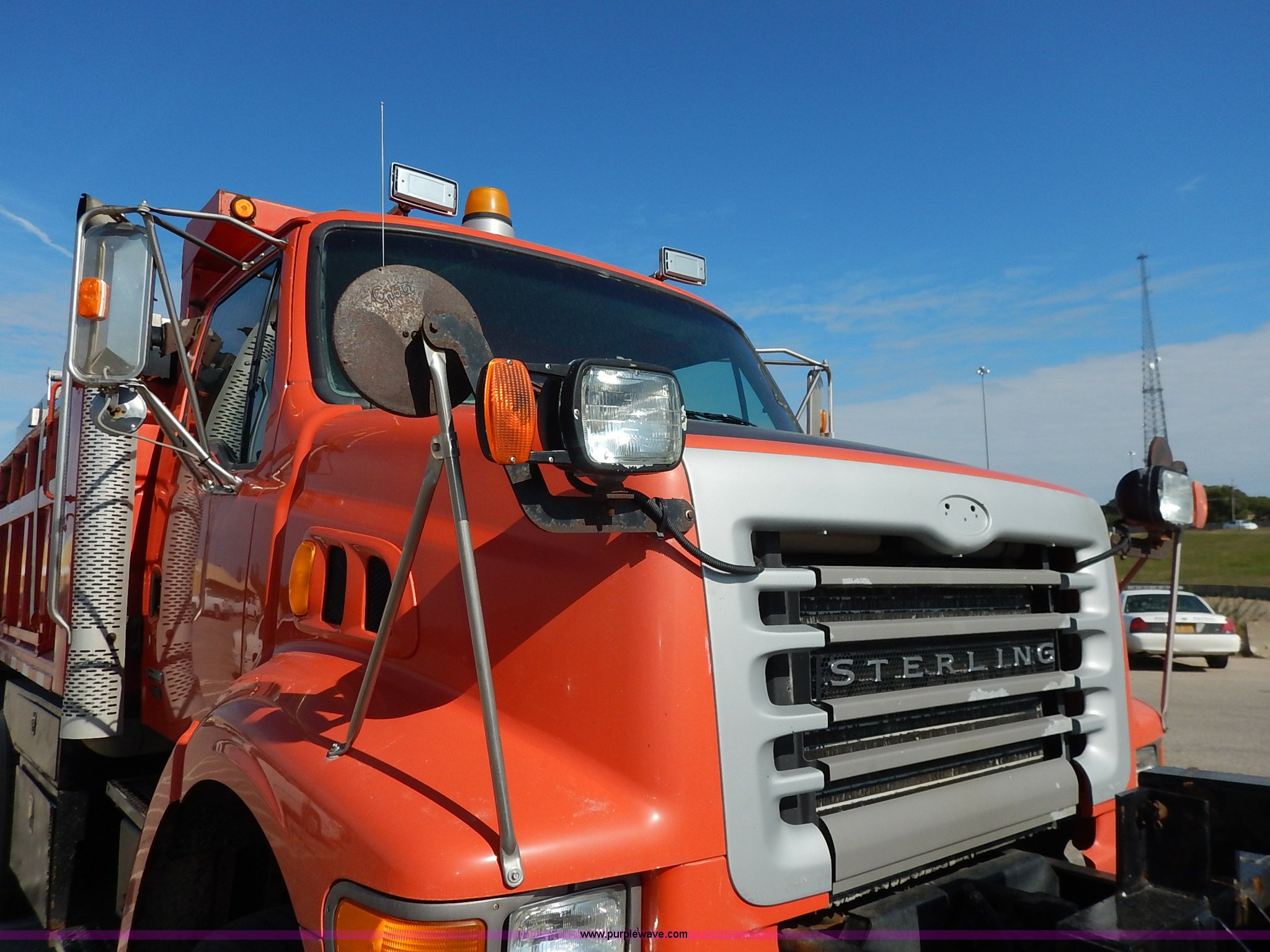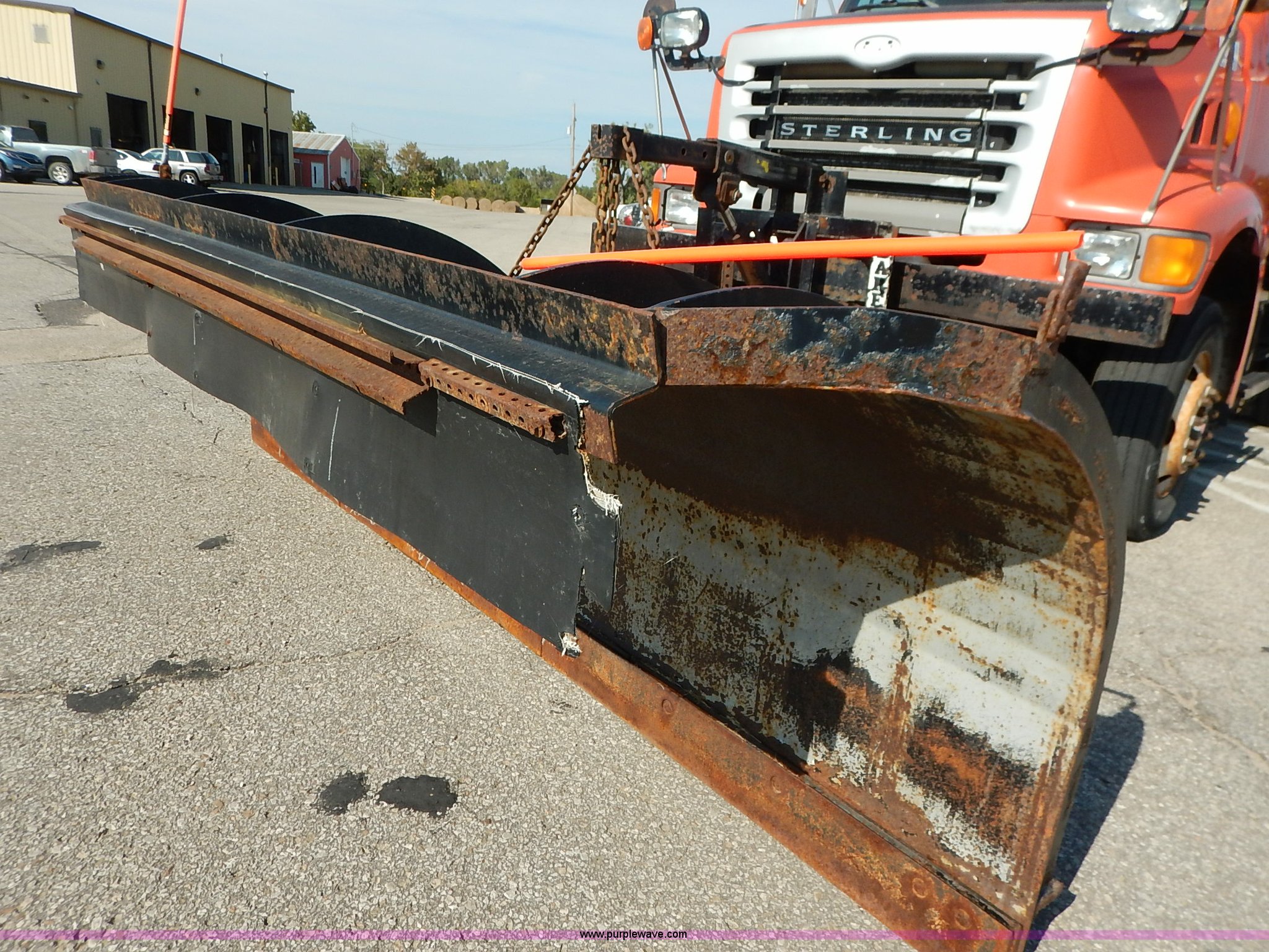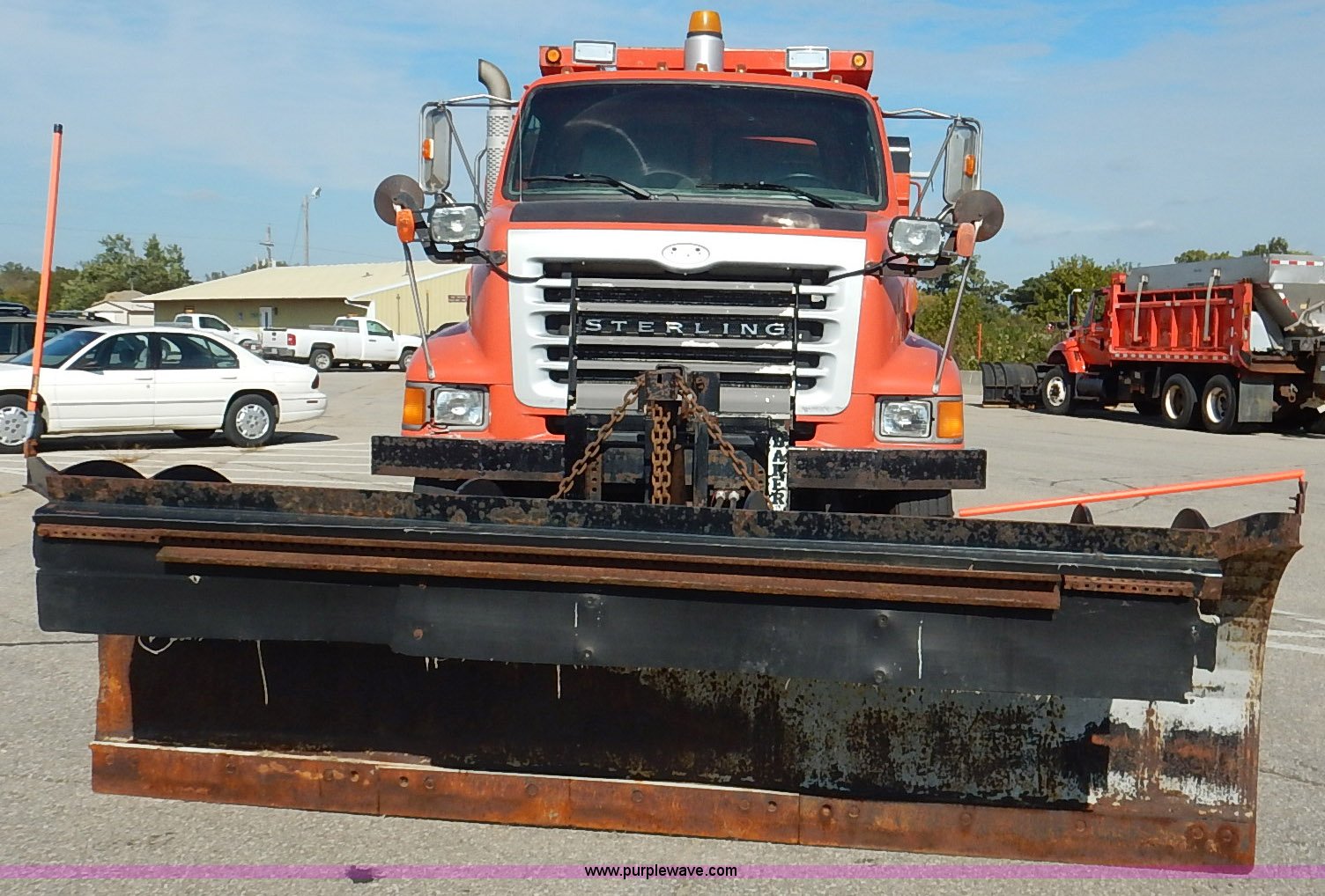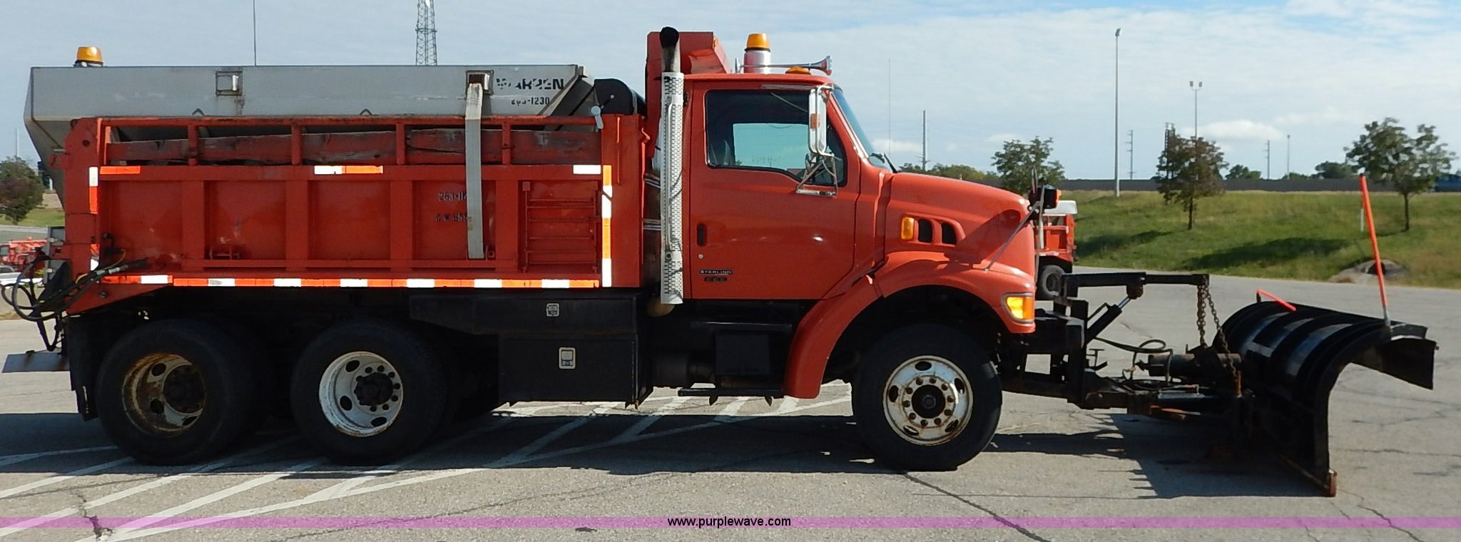 Purple Wave is selling a used Construction Dump Truck in Kansas. This item is a 2001 Sterling LT7500 dump truck with the following: 188,894 miles on odometer, 8,412 hours on meter, Caterpillar 3126 7.2L L6 turbo diesel engine, 250 HP, Allison automatic transmission, Tandem axle, AC and heat, Cruise, AM/FM, Air suspension seat, Heated mirrors, Block heater, Strobe lights, Work lights, Air horn, Front mount PTO, Warren steel dump bed, 13'L x 8'W, Nine yard capacity, Rollover tarp, Flink 11'W plow, Reversible, Warren V-box spreader, 13' x 7', Stainless steel construction, 200 gallon pre-wet side tanks, Force SSC1500 spreader controls, Toolboxes, Pintle hitch, Trailer wiring, Spring suspension, Air brakes, 15' wheelbase, 275/80R22.5 tires, GVWR 53,200 lbs, FAWR 13,200 lbs, RAWR 20,000 lbs, Dents, Scratches, Dead battery, Driver side front mirror broken, Paint faded, Wiring issues, Cosmetic damage to front fender, Rust, End gate missing, KDOT ID 263-1140