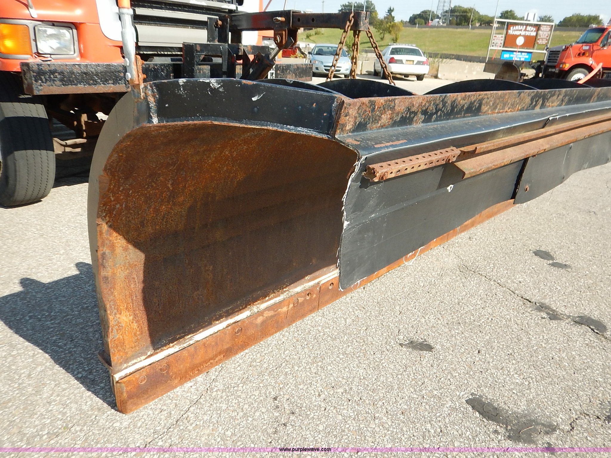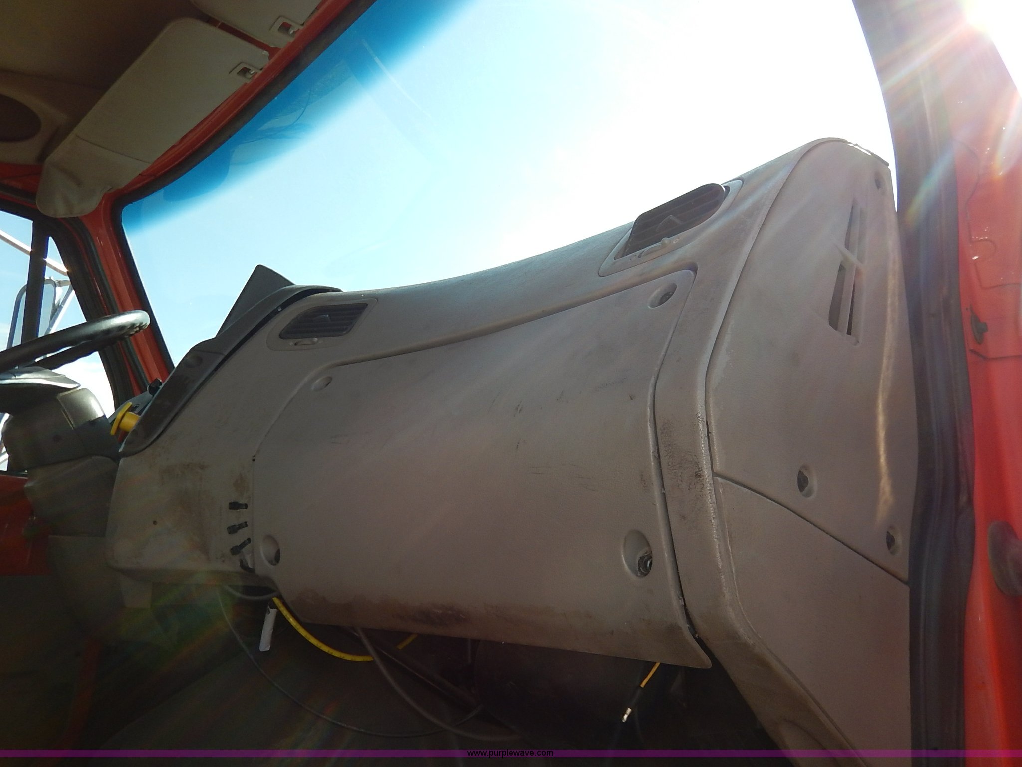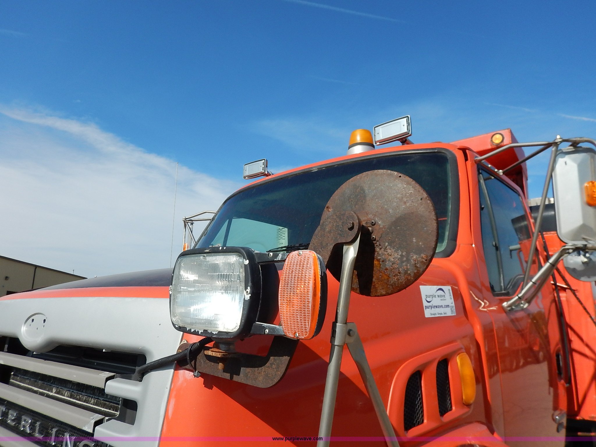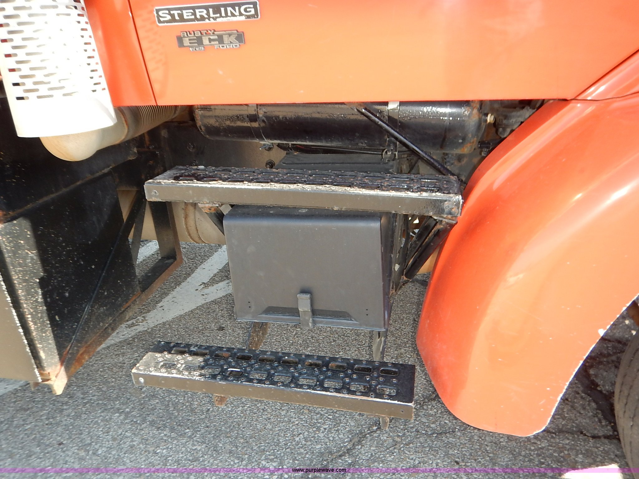 Purple Wave is selling a used Construction Dump Truck in Kansas. This item is a 2001 Sterling LT7500 dump truck with the following: 188,894 miles on odometer, 8,412 hours on meter, Caterpillar 3126 7.2L L6 turbo diesel engine, 250 HP, Allison automatic transmission, Tandem axle, AC and heat, Cruise, AM/FM, Air suspension seat, Heated mirrors, Block heater, Strobe lights, Work lights, Air horn, Front mount PTO, Warren steel dump bed, 13'L x 8'W, Nine yard capacity, Rollover tarp, Flink 11'W plow, Reversible, Warren V-box spreader, 13' x 7', Stainless steel construction, 200 gallon pre-wet side tanks, Force SSC1500 spreader controls, Toolboxes, Pintle hitch, Trailer wiring, Spring suspension, Air brakes, 15' wheelbase, 275/80R22.5 tires, GVWR 53,200 lbs, FAWR 13,200 lbs, RAWR 20,000 lbs, Dents, Scratches, Dead battery, Driver side front mirror broken, Paint faded, Wiring issues, Cosmetic damage to front fender, Rust, End gate missing, KDOT ID 263-1140