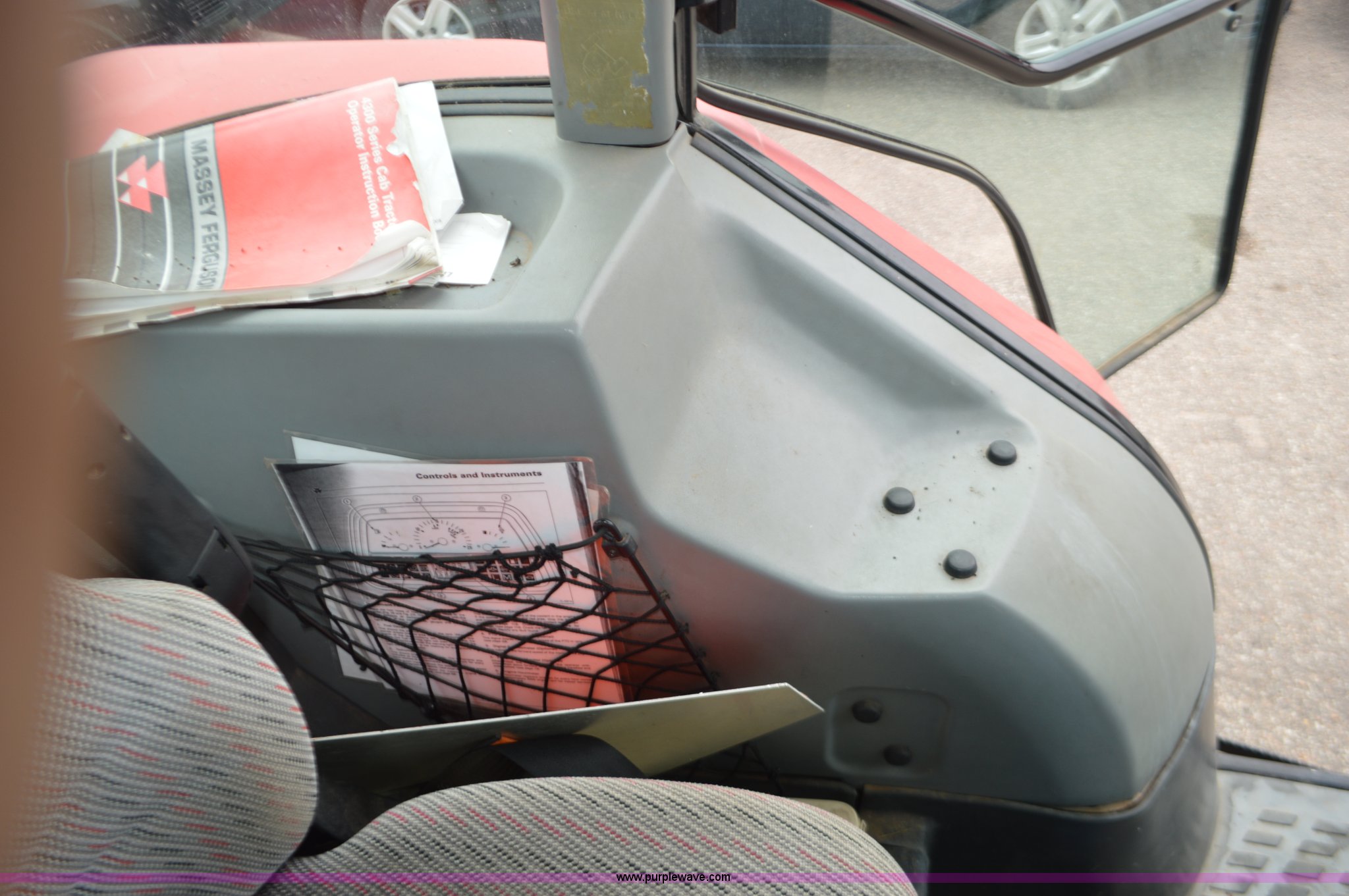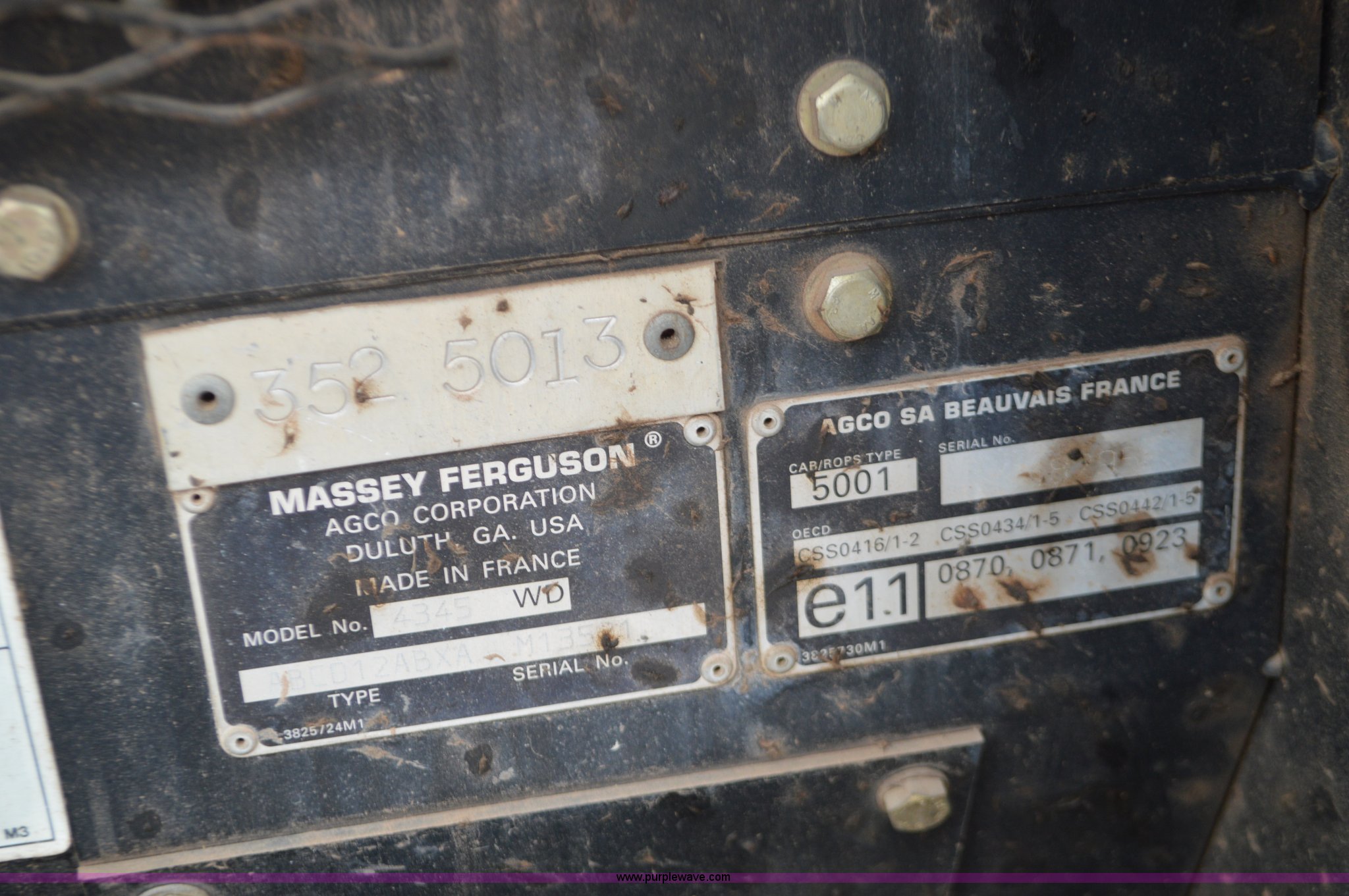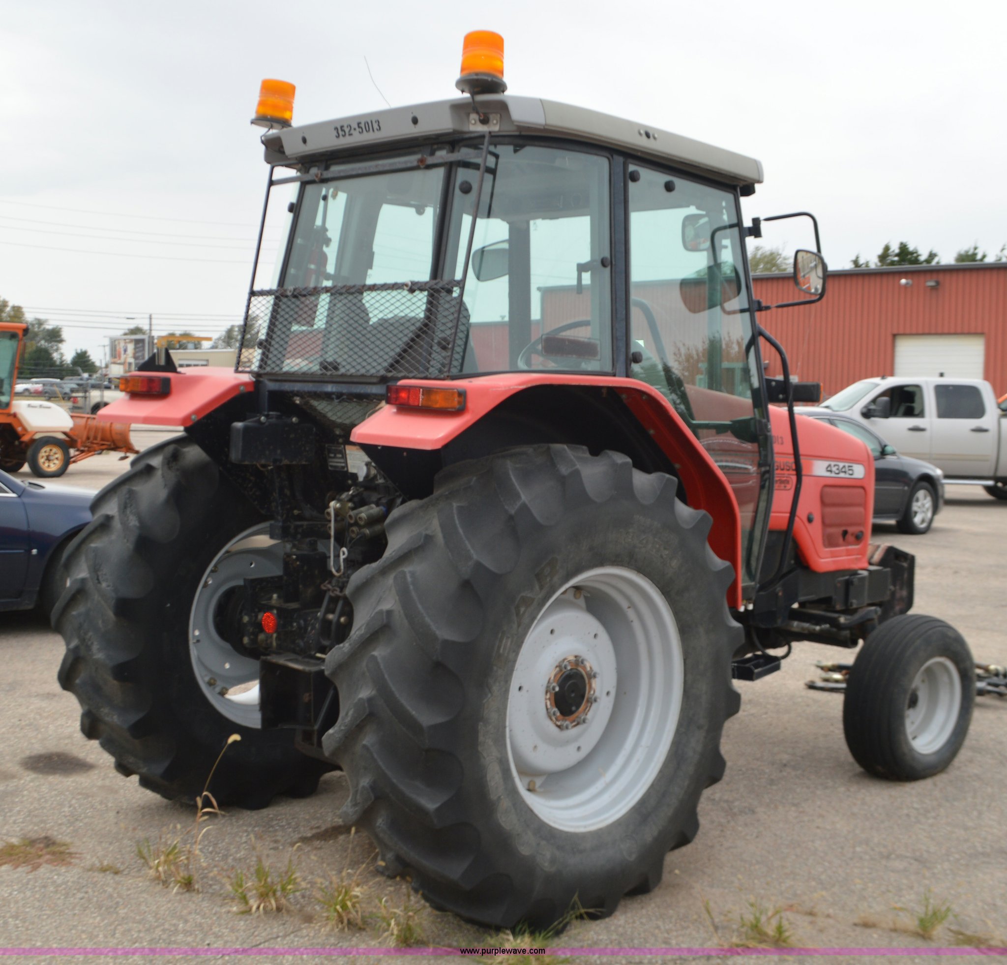 Purple Wave is selling a used Tractor in Kansas. This item is a 2003 Massey Ferguson 4345 tractor with the following: 1,444 hours on meter, Four cylinder diesel engine, 72 HP, Power shuttle transmission, 12F-12R gears, AC and heat, AM/FM/CD, Three point, Top link, 540, (3) rear hydraulic remote sets, 18.4-30 rear tires, 93"W front axle, 100"W rear axle, Transmission slips, Battery dead, Tractor stops, Serial ABCD12ABXAM13521, KDOT ID 352-5013