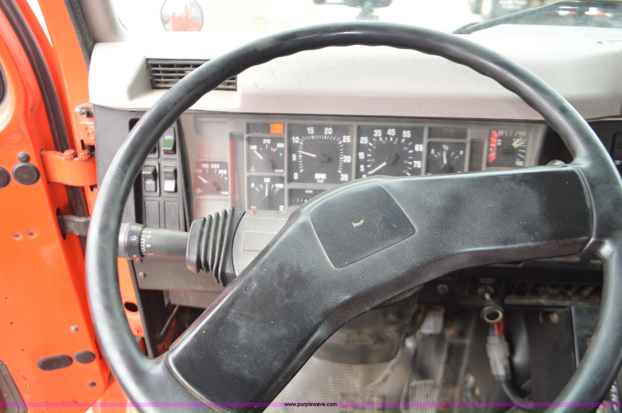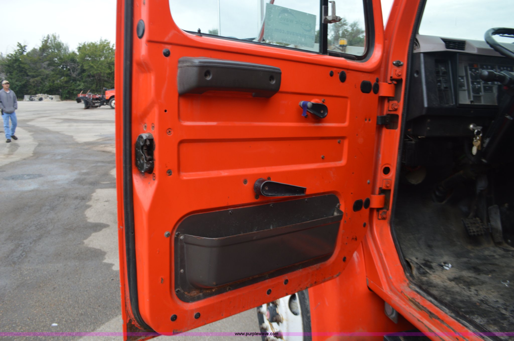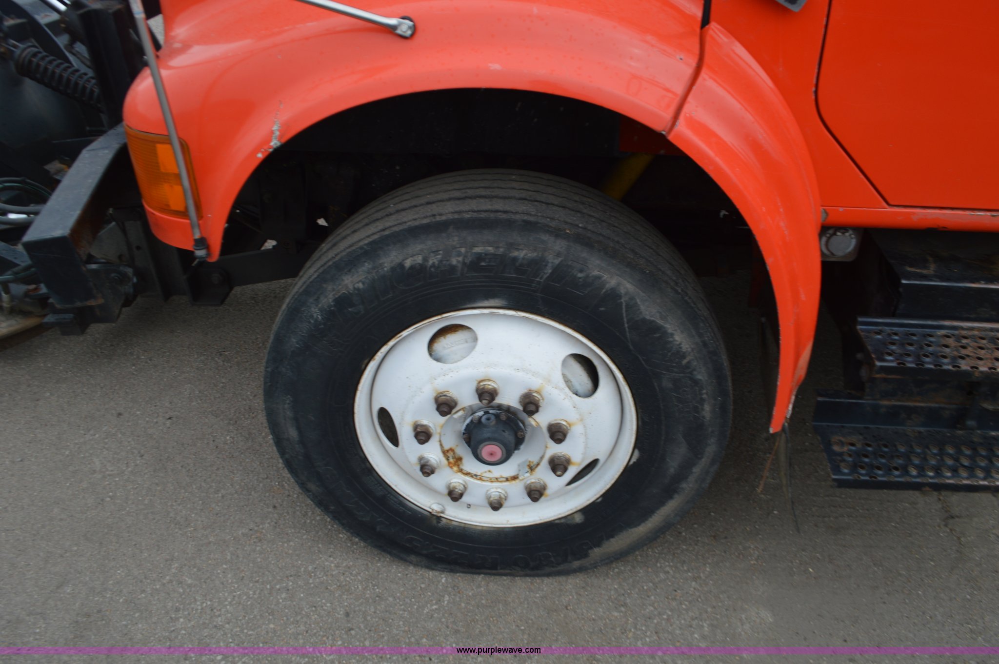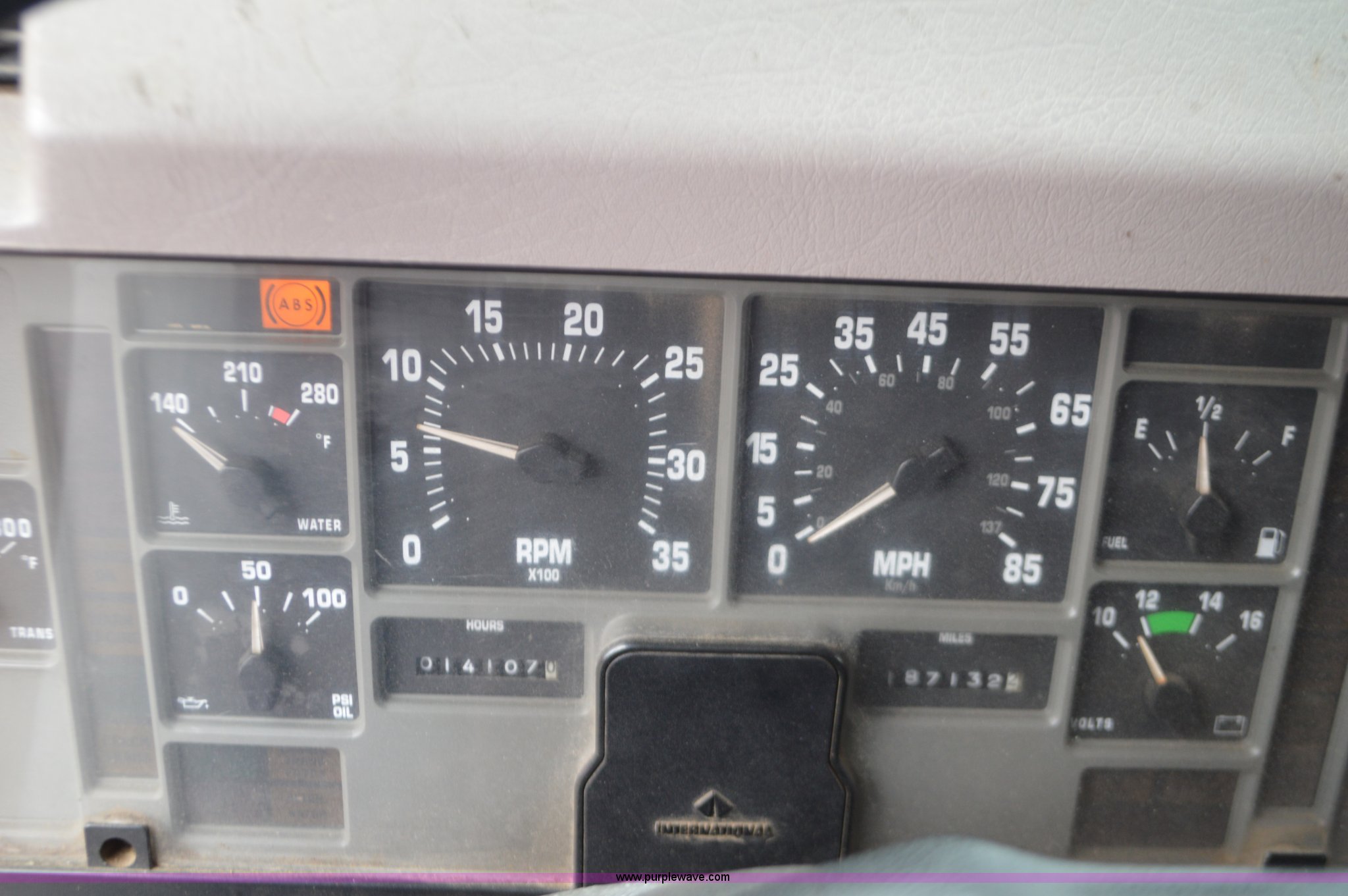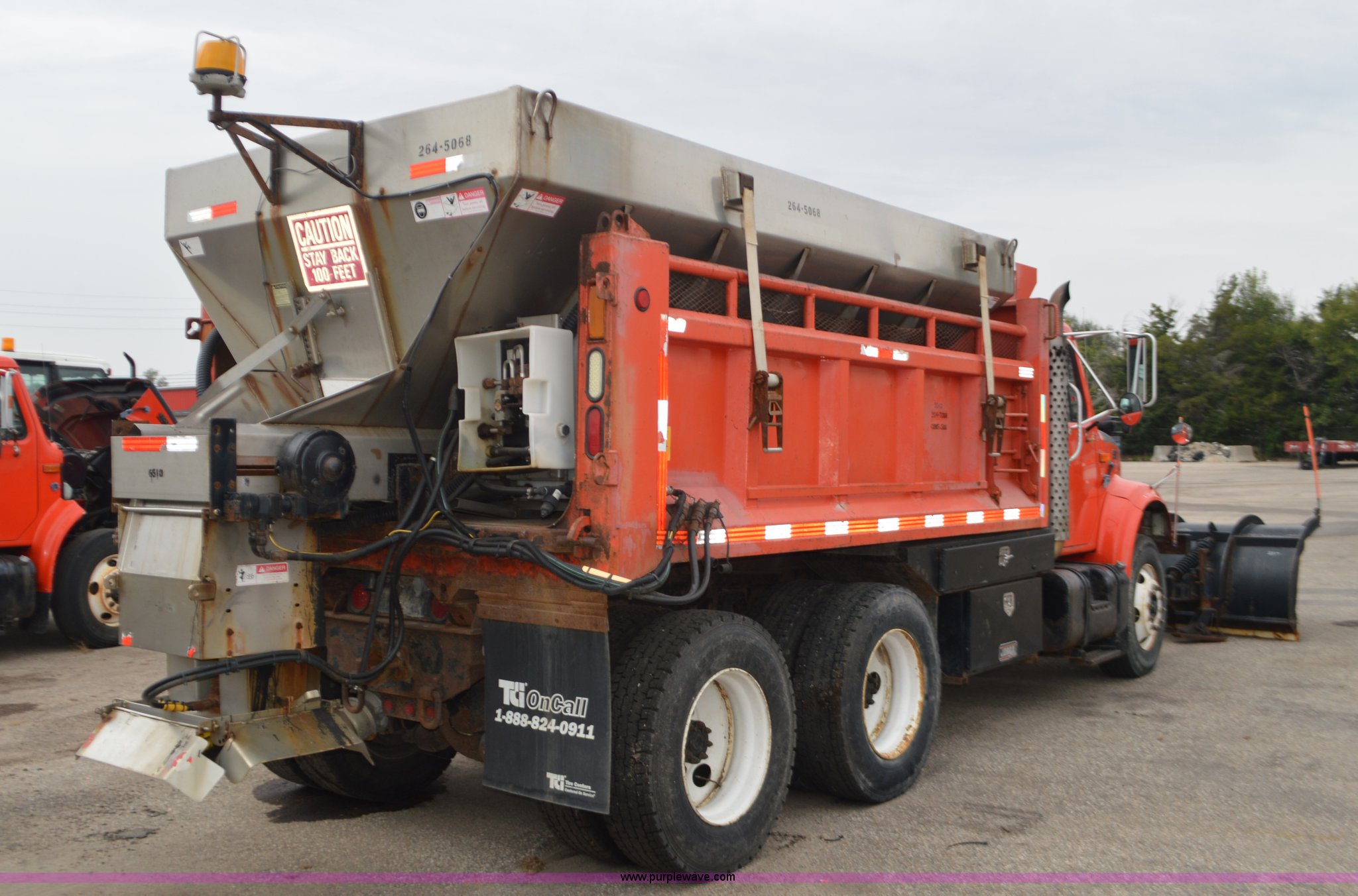Purple Wave is selling a used Construction Dump Truck in Kansas. This item is a 1999 International 4900 dump truck with the following: 187,132 miles on odometer, 14,107 hours on meter, International DT530 8.7L L6 diesel engine, Allison MD3060 automatic transmission, Tandem axle, Inter-axle differential lock, Heat, Cruise, Heated mirrors, Air suspension seat, Block heater, Front mounted PTO, 13'L x 8'W steel dump bed, 42" side height, Monrow snow plow, 11'W, Monroe stainless steel spreader, Nine cubic yard capacity, Pinlte hitch, Spring suspension, Air brakes, 295/75R22.5 front tires, Batteries dead, Rust, ABS light is on, Tires worn, KDOT ID 264-5068