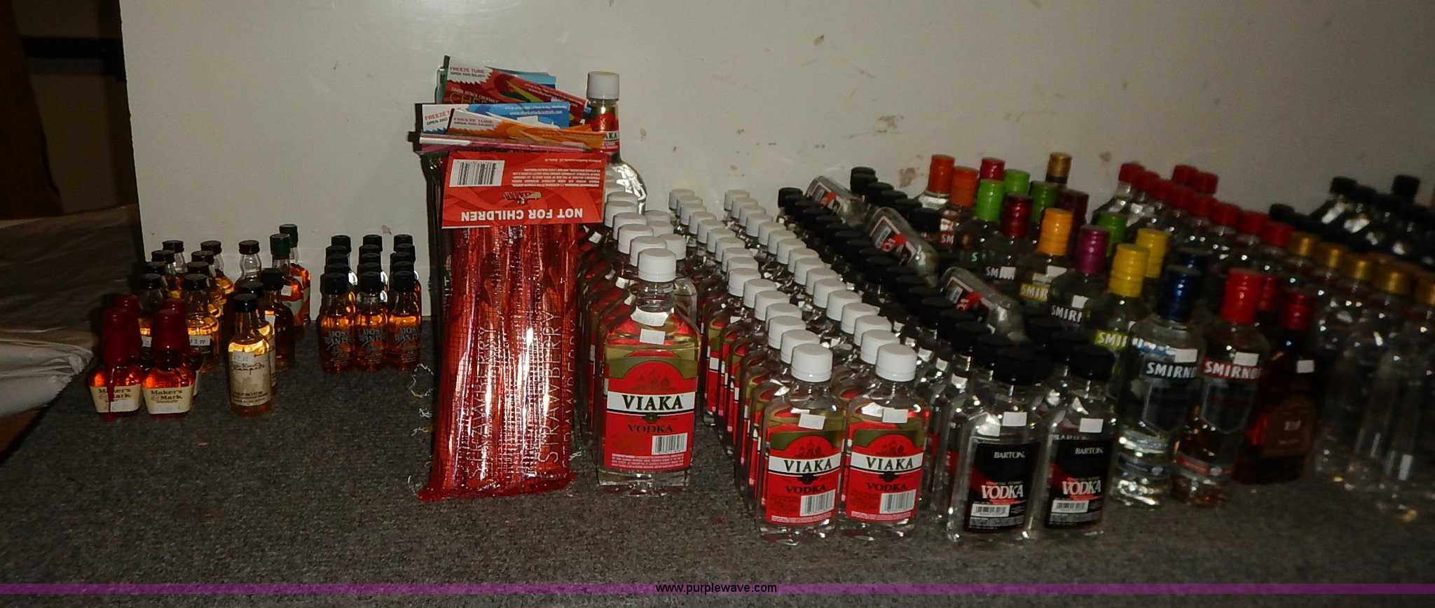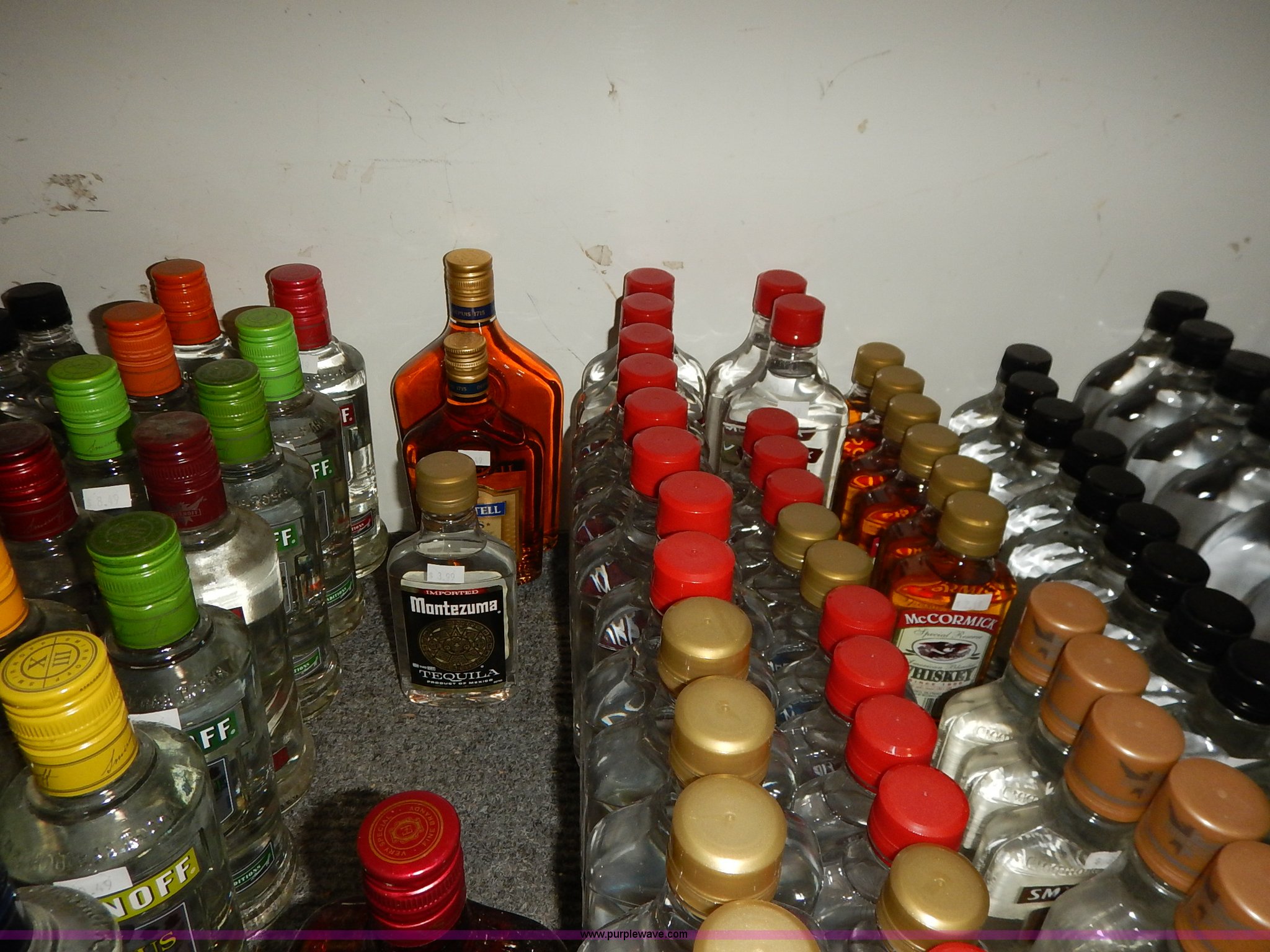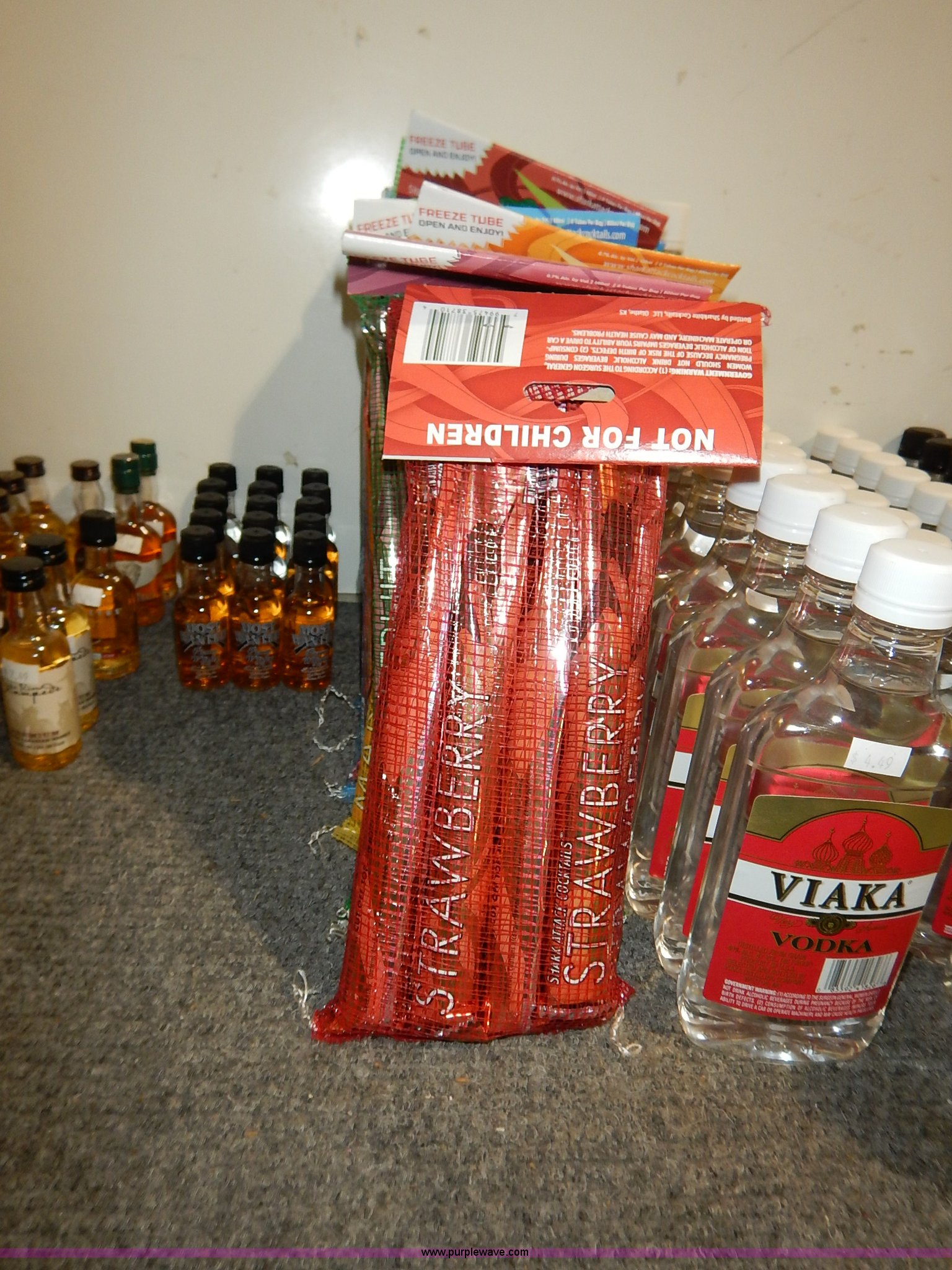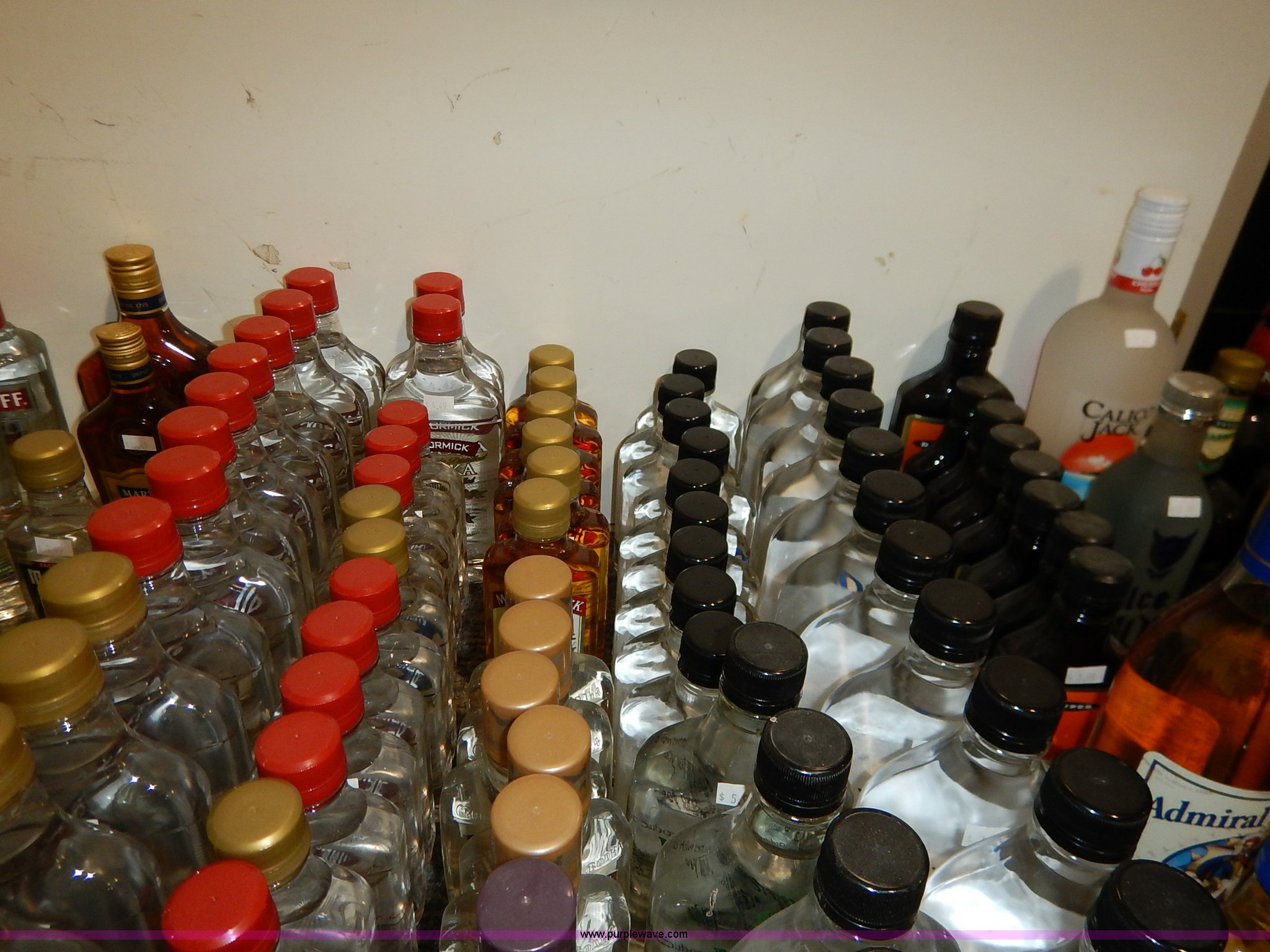 Purple Wave is selling a used All Other Household Items in Kansas. This item is a Assorted alcohol with the following: (4) Makers Mark whiskey 50 ml, (2) Snake River Stampede Canadian whiskey 50 ml, Pendleton Canadian whiskey 50 ml, (2) Buffalo Trace Kentucky whiskey 50 ml, (9) Chivas Regal Scotch whiskey 50 ml, Most Wanted, (3) vodka 50 ml, (10) Pioneer whiskey 50 ml, (2) moonshine 50 ml, (8) various Shark Attack freeze tubes, Viaka vodka, 1.75 liter, (9) 375 ml, (35) 200 ml, Barton vodka, (6) 375 ml, (31) 200 ml, Smirnoff flavorded vodka, Strawberry 375 ml, Watermelon 375 ml, (2) orange 375 ml, (2) blueberry 375 ml, Passion fruit 375 ml, Raspberry 375 ml, (2) citrus 375 ml, (2) green apple 375 ml, Cherry 375 ml, Cranberry 375 ml, (2) lime 375 ml, (2) E&J brandy 375 ml, Montezuma tequila 200 ml, Martell V.S. fine cognac 200 ml, Martell V.S. fine cognac 375 ml, McCormick vodka, (11) original 375 ml, (11) original 200 ml, (5) 100 proof 375 ml, (3) 100 proof 200 ml, (2) Blue label 200 ml, Smirnoff flavored vodka, Black cherry 200 ml, (5) vanilla 200 ml, (6) McCormick Special Reserve American whiskey 200 ml, Most Wanted vodka, (14) 375 ml, (8) 200 ml, (2) Most Wanted gin 375 ml, (2) Most Wanted tequila 375 ml, (2) New Amsterdam vodka 375 ml, (2) Hennessy Very Special cognac 200 ml, Bartenders Bananna 200 ml, Ice 101 peppermint schnapps 375 ml, Calico Jack cherry rum 750 ml, Admiral Nelsons spiced rum, 750 ml, (2) 200 ml, Dekuyper flavored schnapps, Hot cinnamon 375 ml, (3) peachtree 200 ml, Buttershots 200 ml, (3) hot cinnamon 200 ml, (4) Canadian Mist whiskey 200 ml, Dekuyper Creme de Cocoa 750 ml, Dekuyper spearmint schnapps, 750 ml, (2) 1 liter, Kamora Coffee liqueur, (5) 375 ml, (2) 750 ml, (2) 1.75 liter, Lieutenant Dan spiced rum, (4) 1.75 liter, (8) 750 ml, (10) Zing Zang bloody mary mix 946 ml, Rumple Minze pepermint schnapps, 375 ml, 750 ml, (7) Barton vodka 1.75 liter, Master of mixers, Sweet-n-sour 1 liter, Margarita 1 liter, Strawberry 1 liter, Sweet-n-sour 1.75 liter, Margarita 1.75 liter, Gozio Amaretto 750 ml, Licor 43 Cuarenta Y Tres 750 ml, McCormick vodka, (3) original 1.75 liter, (6) original 750 ml, (2) 100 proof 750 ml, Lairds Apple Jack brandy, (2) 375 ml, (2) 750 ml, Hirm Walker peppermint schnapps, (6) 750 ml, (5) 375 ml, (3) 200 ml, Disaronno Italian liquer, (2) 200 ml, 375 ml, (2) Wild Turkey American Honey whiskey 375 ml, Cruzan rum, (3) 9 spiced 750 ml, (2) 151 proof 750 ml, (2) coconut 750 ml, Bananna 750 ml, (2) vanilla 750 ml, Strawberry 750 ml, Ice 101 peppermint schnapps 750 ml, Cafe Boheme vanilla creme coffee vodka 750 ml, Carolans Irish cream 750 ml, Copa De Oro coffee liqueur, 750 ml, (2) 1 liter, 1.75 liter, Cragganmore Single Speyside malt 750 ml, Baileys Original Irish Cream, 375 ml, 750 ml, 1 liter, Dekuyper Vanilla Delight liqueur, 750 ml, 1 liter, Alize Wild Passion French cognac 750 ml, Saint Brendans Irish creme whiskey 375 ml, (4) Pendleton Canadian whiskey 375 ml, Kahlua rum, 375 ml, 1.75 liter, Seagrams whiskey, (2) V.O. Canadian 200 ml, (3) 7 American 200 ml, (2) V.O. Canadian 375 ml, (5) 7 American 375 ml, (2) Dark Honey 750 ml, 7 American 750 ml, V.O. Canadian 750 ml, Jose Cuervo Especial Gold tequila 200 ml, El Jimador Reposado tequila, (2) 200 ml, (2) 375 ml, Bombay Sapphire London dry gin, (2) 375 ml, 750 ml, 1 liter, Crown Royal whiskey, (2) 4.75 liter with box, (2) 1 liter with box, (4) 750 ml with box, (3) 375 ml with pouch, (5) 200 ml, Meletti Limoncello liqueur 750 ml, The Kraken black spiced rum 1.75 liter, (2) Bacardi Puerto Rican rum 1.75 liter, Norther Lights Canadian whiskey, 750 ml, 375 ml, (7) 200 ml, Romana black liquer 750 ml, Amarula cream liqueur 750 ml, (2) Beef Eater London dry gin 750 ml, Rum Chata, (2) 750 ml, (6) 375 ml, Mele Hi Italian liqueur, Cioccolate 750 ml, (2) Sambuca 750 ml, Hiram Walker flavored brandy, Sambuca 750 ml, (2) Original 750 ml, (3) cherry 375 ml, Blackberry 375 ml, Peach 375 ml, (2) apricot 375 ml, Southern Comfort, (3) 200 ml, (2) 375 ml, Sailor Jerry spiced rum, (2) 200 ml, (2) 375 ml, Lord Calvert Canadian whiskey, (4) 200 ml, (3) 375 ml, Christian Brothers V.S. brandy, (4) 200 ml, (4) 375 ml, Jagermeister German liqueur, 1 liter, 750 ml, (2) 375 ml, (11) 200 ml, (11) Knickers Irish cream 750 ml, Sobieski vodka, (5) 200 ml, (4) 375 ml, Fleischmanns extra dry gin, (6) 200 ml, (12) 375 ml, McCormick Special Reserve whiskey, 750 ml, (6) 7.75 liter