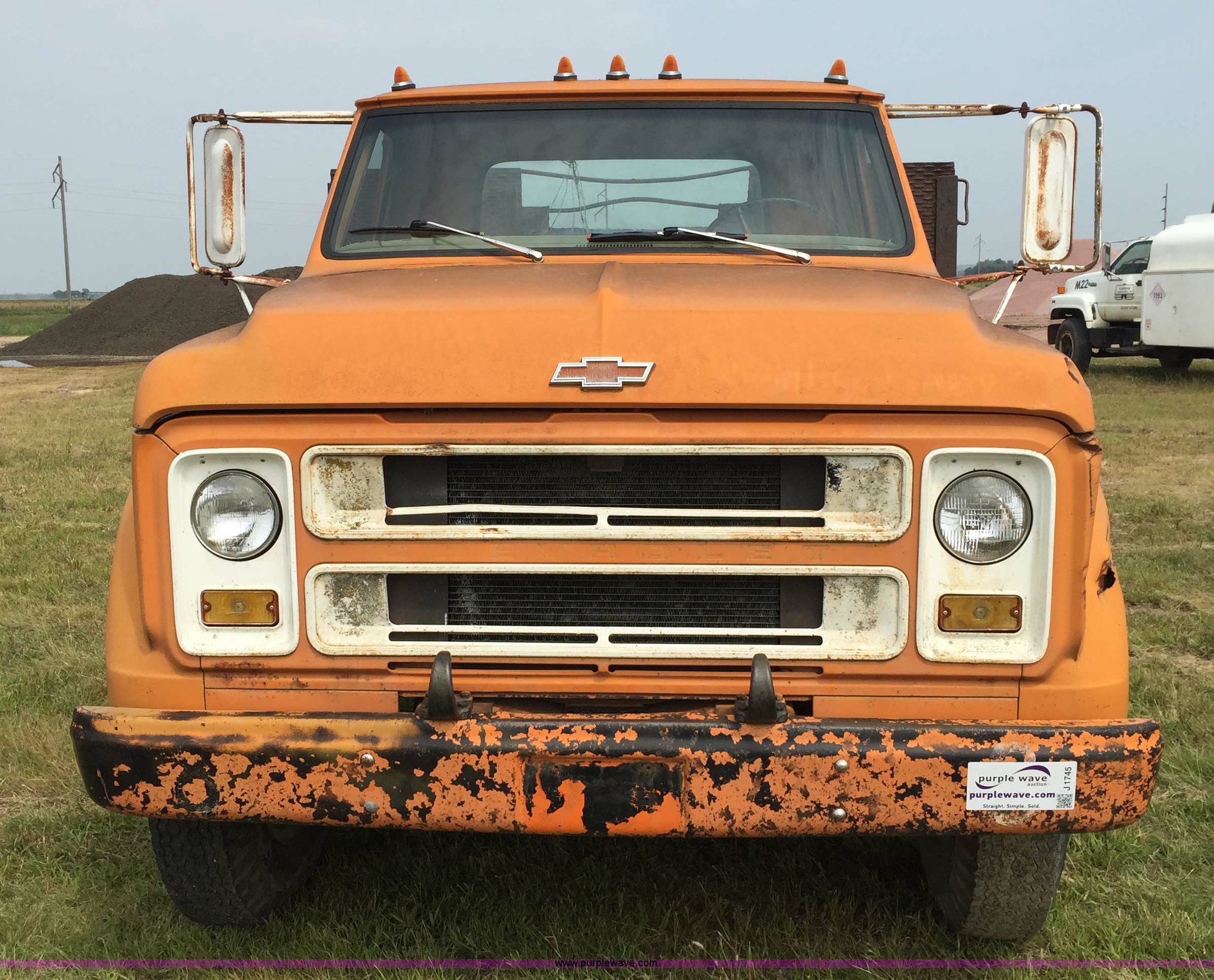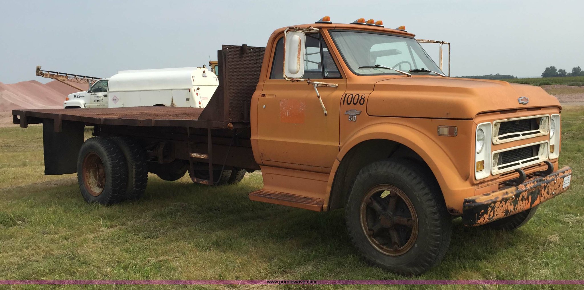 Purple Wave is selling a used Flat Bed Truck in South Dakota. This item is a 1968 Chevrolet C50 flatbed truck with the following: 34,978 miles on odometer, Chevrolet 327 C.I.D. eight cylinder gas engine, Four speed manual transmission, Slip shift, Single axle, Front tow hooks, 191"L x 91"W steel flatbed, Spring suspension, 8.28-20 front tires, 8.25-20 rear tires, GVW 19,500 lbs, Rear window cracked, No passenger door handle, Dump function inoperable, Maintenance records available