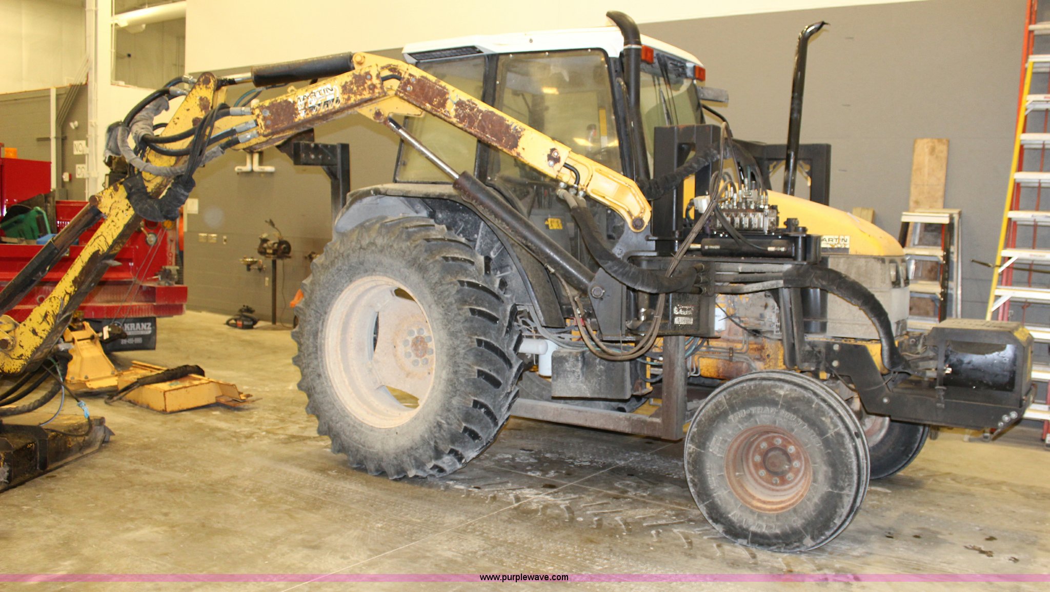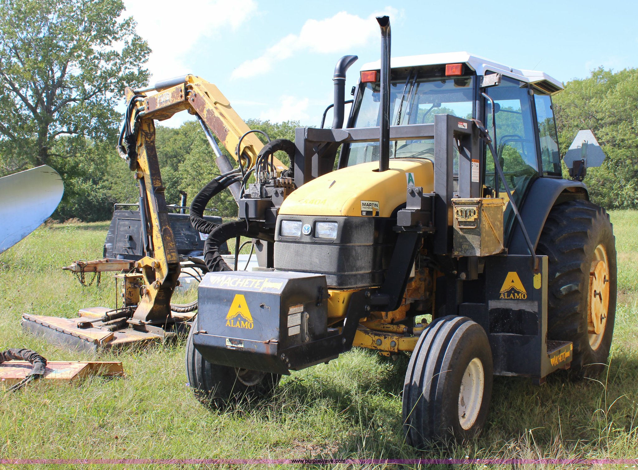 Purple Wave is selling a used Tractor in Kansas. This item is a 1999 New Holland TS110 tractor with the following: 5,004 hours on meter, Four cylinder turbo diesel engine, 110 HP, Electroshift transmission, 16F-8R gears, AC and heat, AM/FM, Air suspension seat, Tilt steering wheel, Alamo MB21 mower boom, Serial 01427, Alamo rotary mower, 60"W, Serial 01377, Alamo sickle bar attachment, 60"W, Front mounted hydraulic pump, Three point, 540 PTO, (2) rear hydraulic remote sets, 1,400 lbs left rear wheel weights, 11.00-16 front tires, 18.4-34 rear tires, Left rear wheel filled with calcium, Serial 618330/135999B, Unit# PWK5404