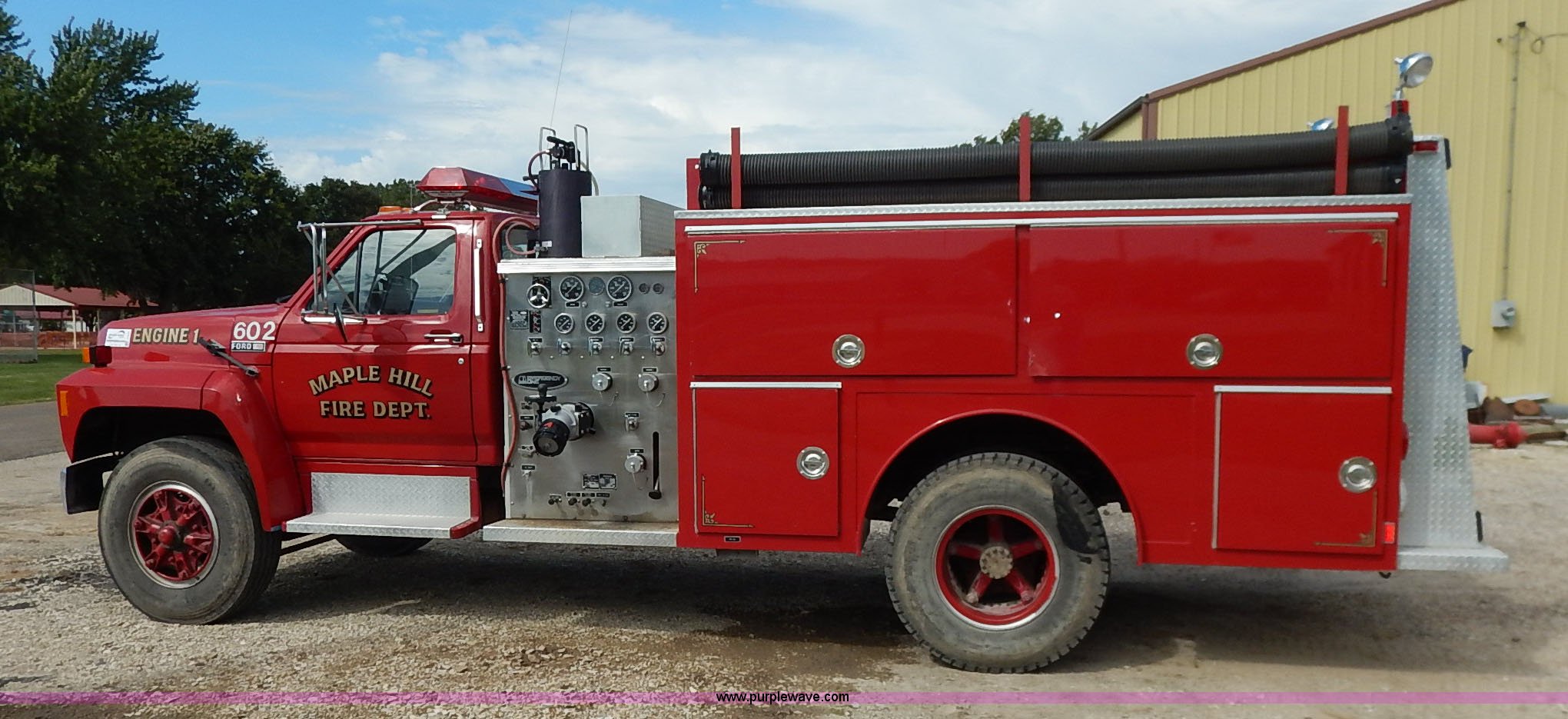 1985 Ford F700 fire truck. 12,842 miles on odometer, 7.0L V8 gas engine, Five speed manual transmission, Two speed rear end, Single axle, Heat, AM/FM, Vinyl interior, Front tow hooks, Light bar, Southern VP SA-400 control unit, E-One body Driver side high side, Officer low side, (2) 10' 5" suction hoses, Hale 750 gpm pump Tested in October 2014, 750 gallon fiberglass tank, Driver side pump panel, (3) 2.5" discharges No. 1 and 2 on driver's side, No. 3 on officer side, 1.5" cross lay, 24' aluminum extension ladder, 14" aluminum roof ladder, 10' pike pole, Pike and flat axes, Kochek 5" low level strainer, Task Force 5" ball intake valve with 4" Storz, Spring suspension, Hydraulic brakes, 172" wheelbase, 10.00R20 tires, GVWR 28,000 lbs, FAWR 9,000 lbs, RAWR 19,000 lbs, Fire apparatus inspection completed in October 2014, View pump and inspection report , Robwen foam proportioner inoperable, Decals will be painted over prior to auction, Dents, Scratches. 1FDPF70K8FVA30877. 825 Levee Drive. manhattan, KS 66502