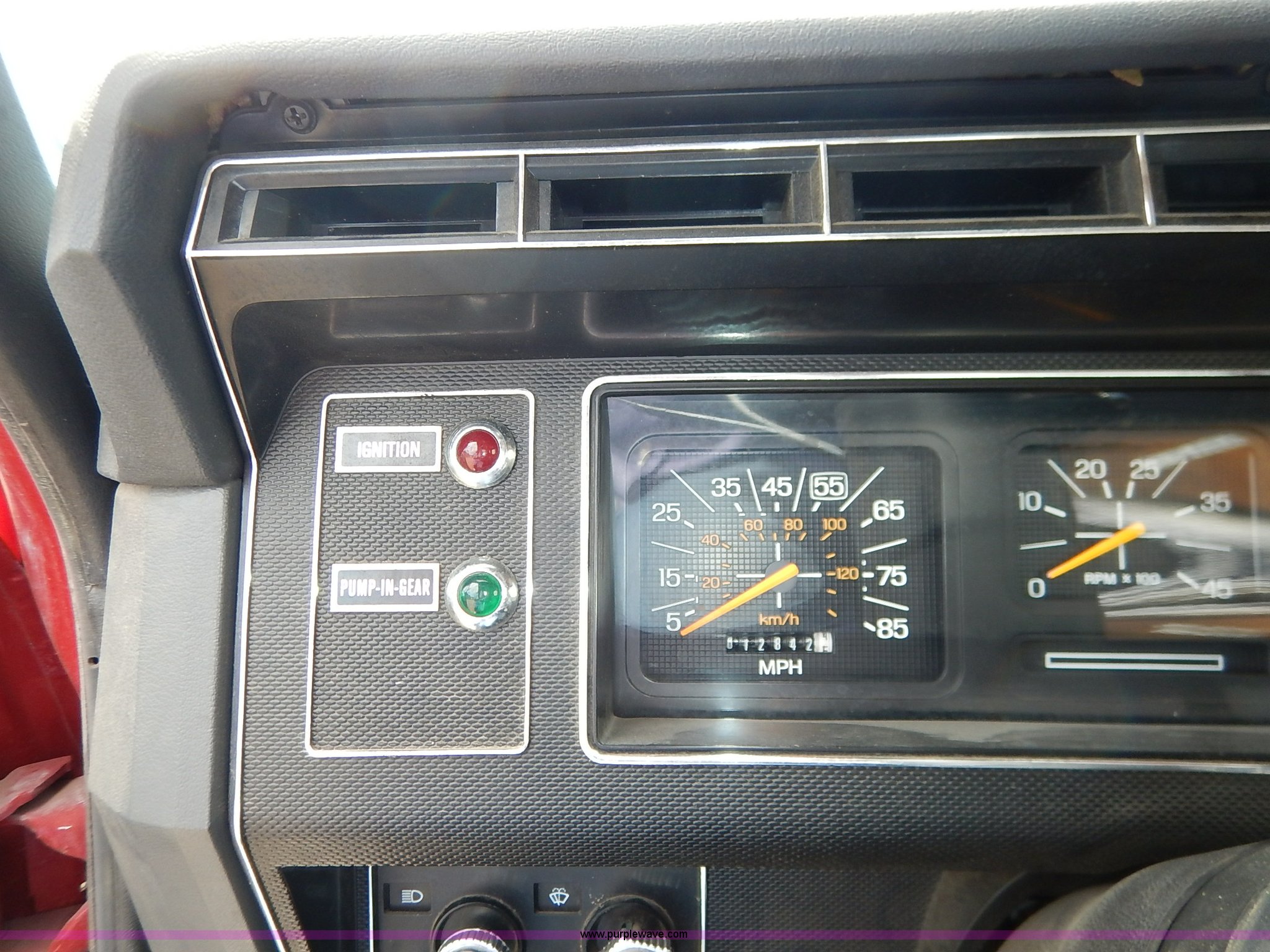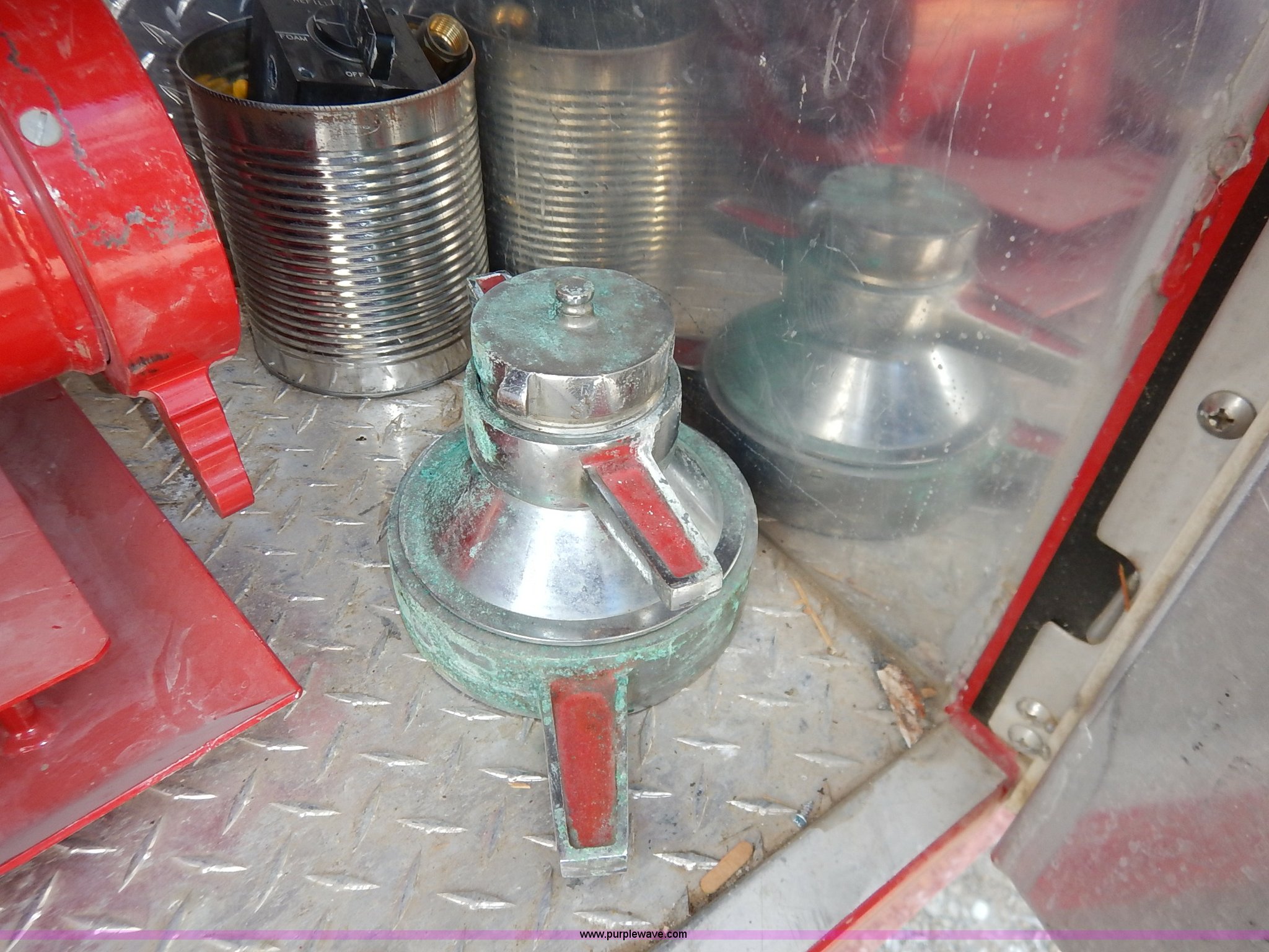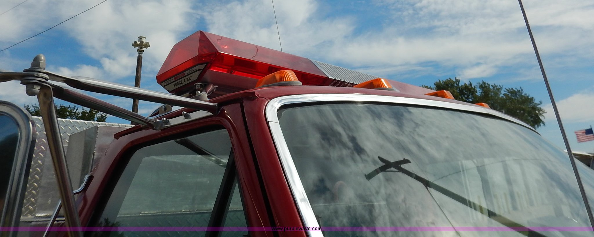 Purple Wave is selling a used Fire Truck or Emergency Vehicle in Kansas. This item is a 1985 Ford F700 fire truck with the following: 12,842 miles on odometer, 7.0L V8 gas engine, Five speed manual transmission, Two speed rear end, Single axle, Heat, AM/FM, Vinyl interior, Front tow hooks, Light bar, Southern VP SA-400 control unit, E-One body, Driver side high side, Officer low side, (2) 10' 5" suction hoses, Hale 750 gpm pump, Tested in October 2014, 750 gallon fiberglass tank, Driver side pump panel, (3) 2.5" discharges, No. 1 and 2 on driver's side, No. 3 on officer side, 1.5" cross lay, 24' aluminum extension ladder, 14" aluminum roof ladder, 10' pike pole, Pike and flat axes, Kochek 5" low level strainer, Task Force 5" ball intake valve with 4" Storz, Spring suspension, Hydraulic brakes, 172" wheelbase, 10.00R20 tires, GVWR 28,000 lbs, FAWR 9,000 lbs, RAWR 19,000 lbs, Fire apparatus inspection completed in October 2014, View pump and inspection report, Robwen foam proportioner inoperable, Decals will be painted over prior to auction, Dents, Scratches