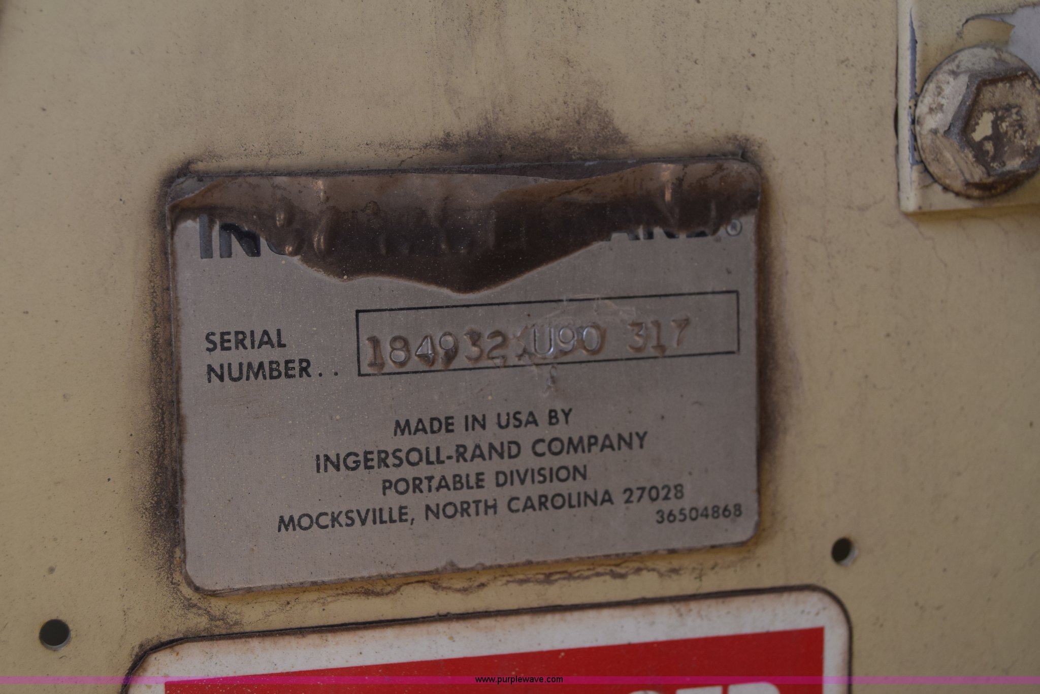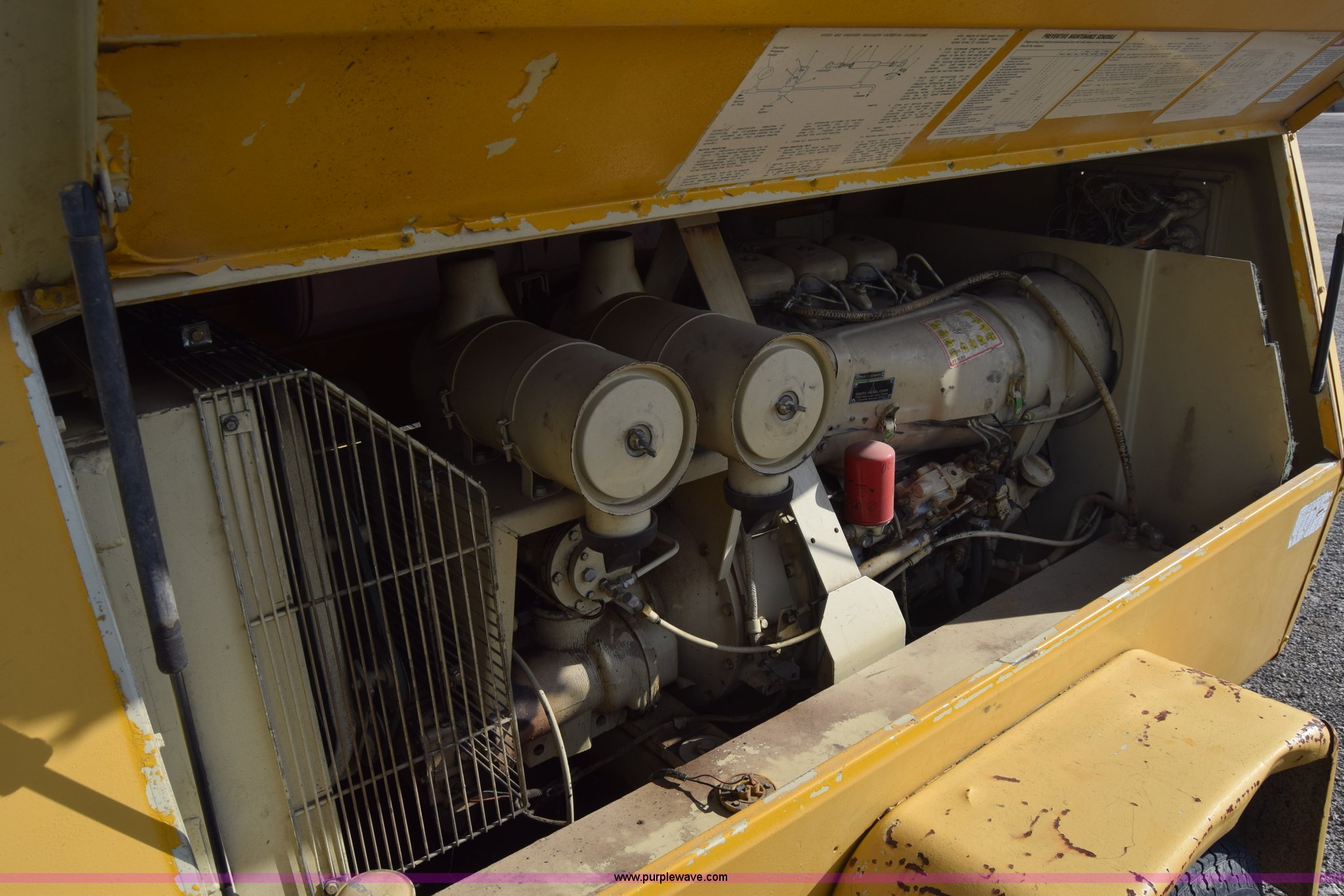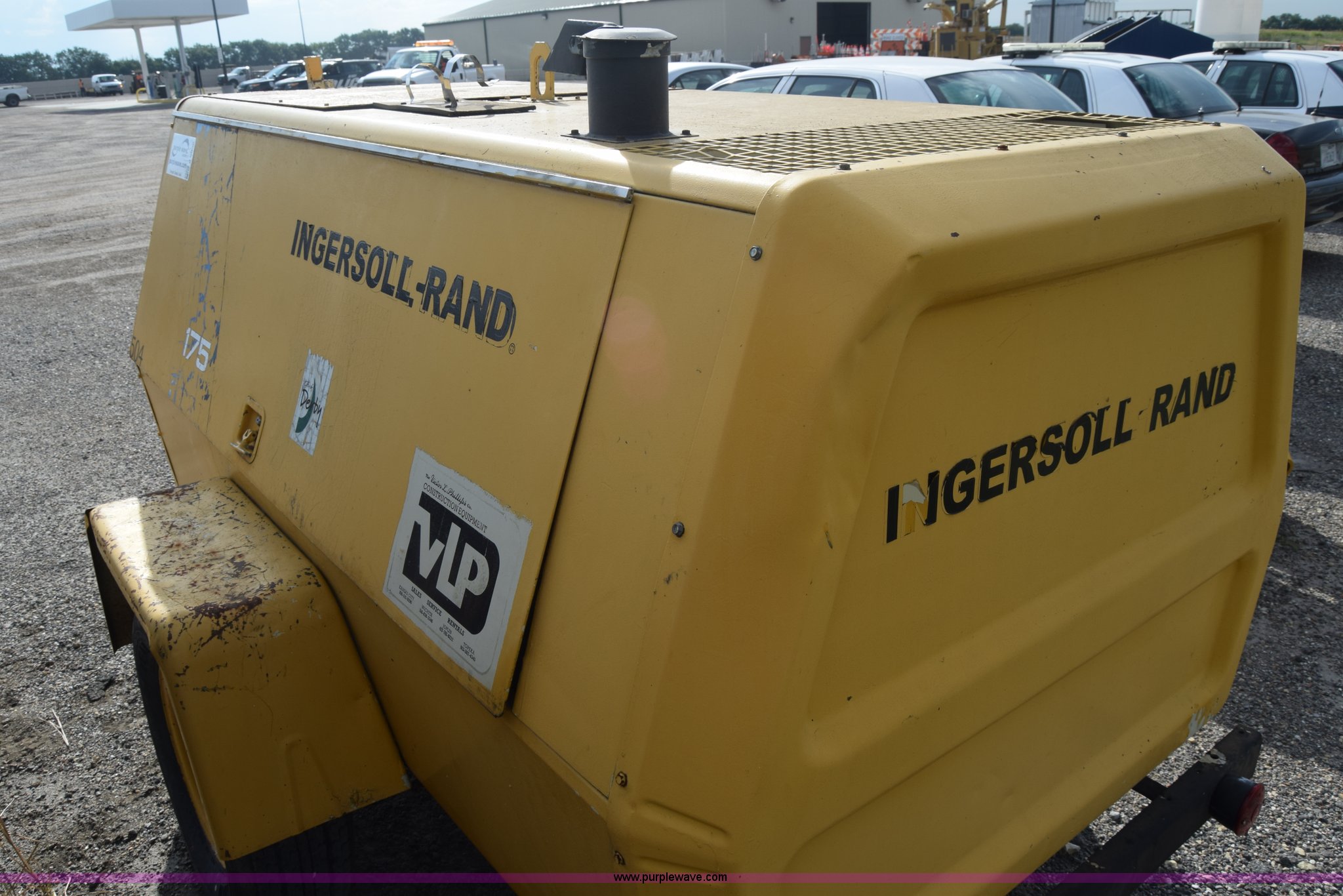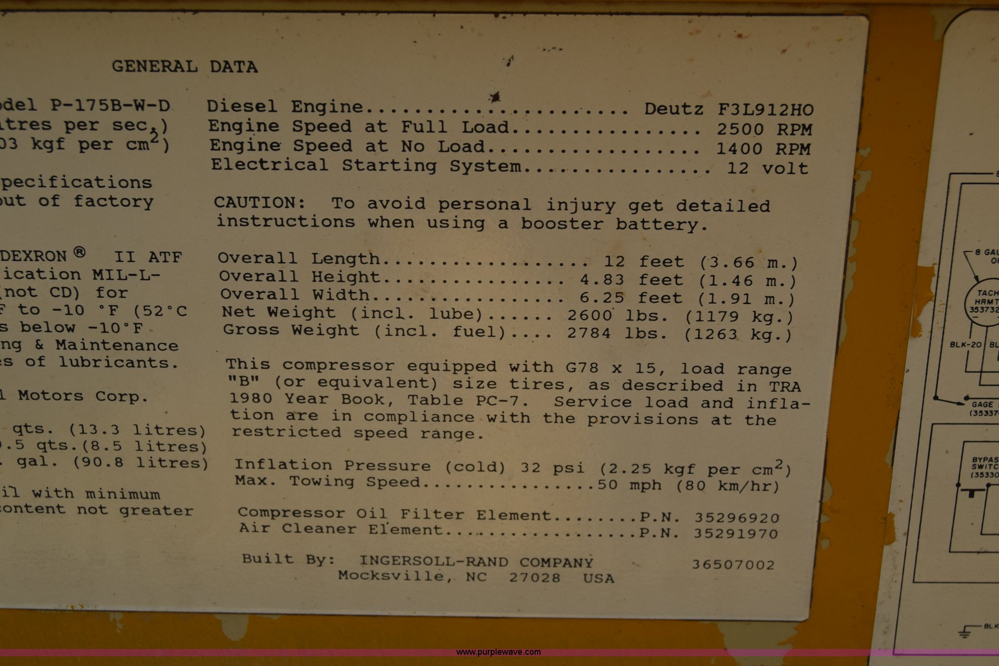 Ingersoll Rand 175 air compressor. 1,999 hours on meter, Deutz F3L912HD three cylinder diesel engine 2,500 RPM, 12'L x 6'3"W x 4'11"H, 175 cfm, Spring suspension, Pintle hitch, 225/75R15 tires, 2,784 lbs. City of Derby. 3531 E 55th St South. Derby, KS 67037