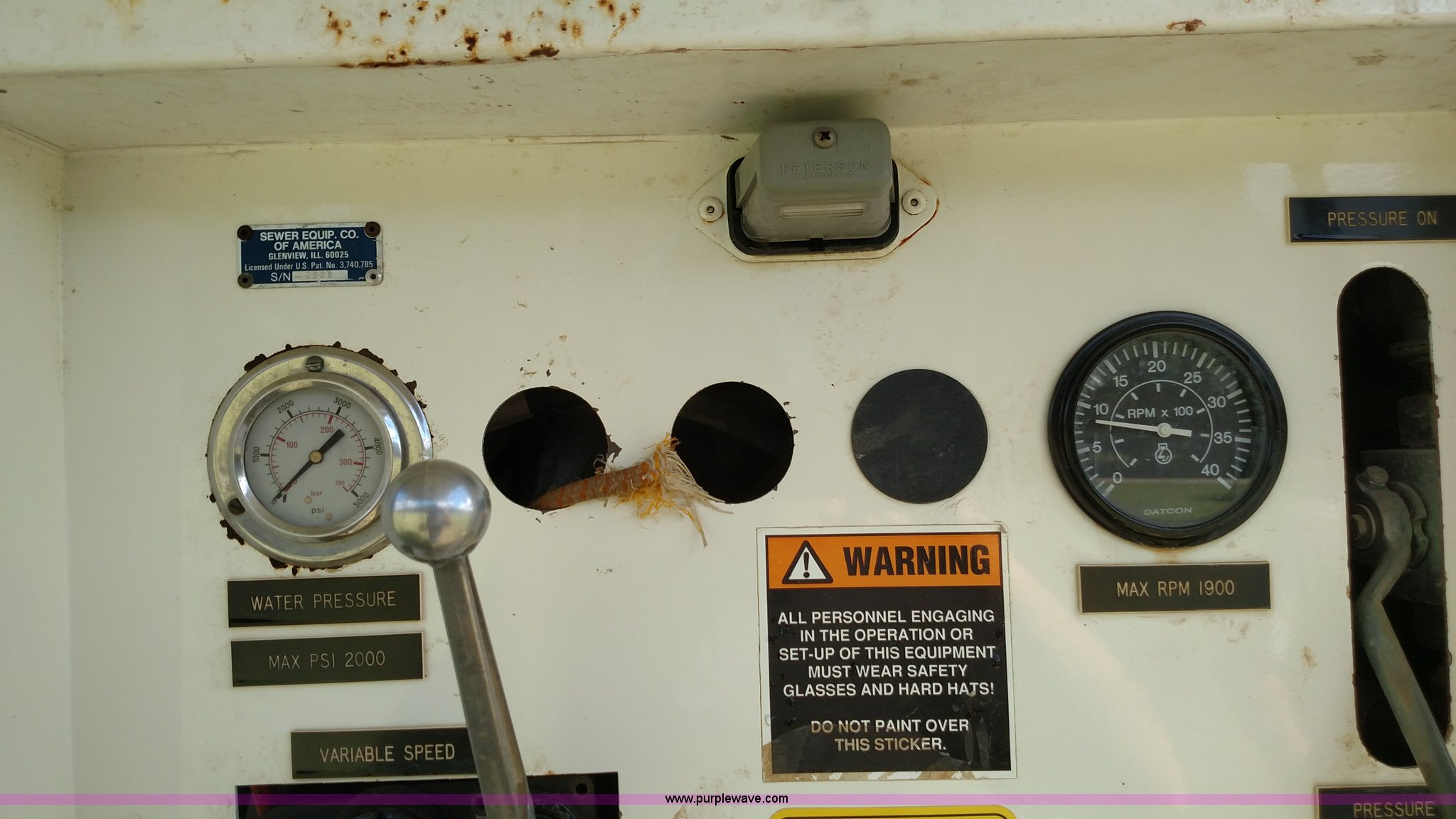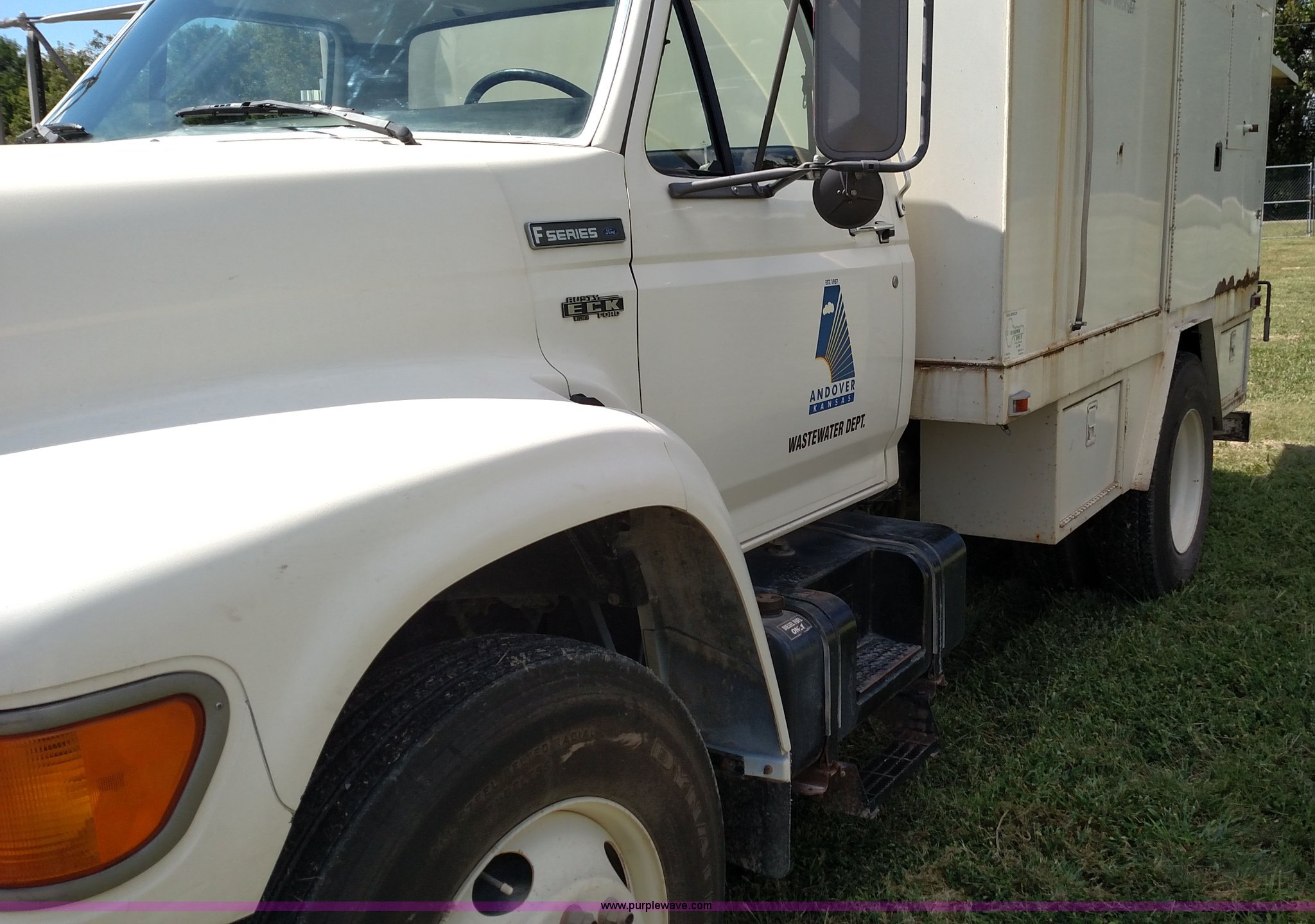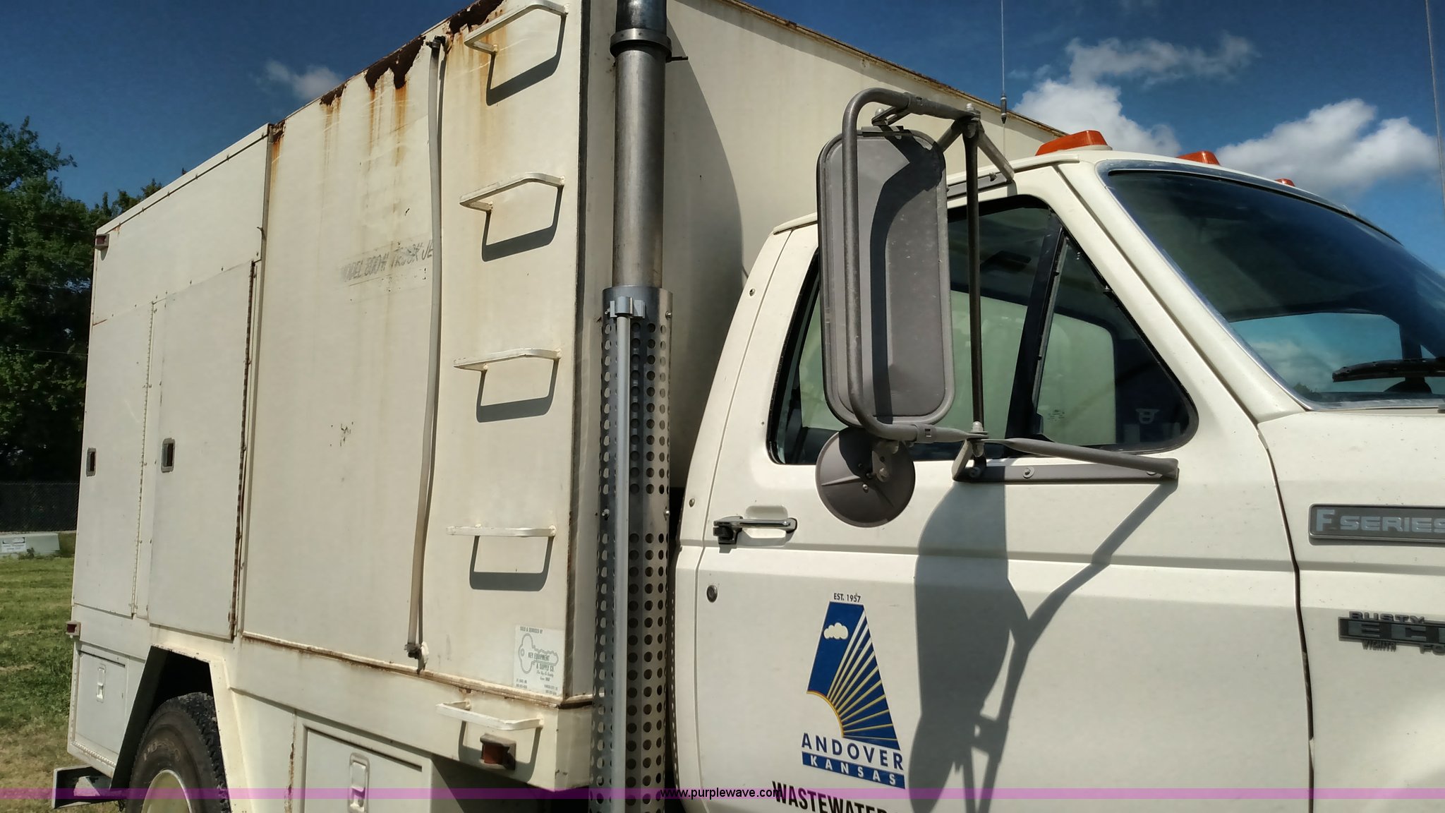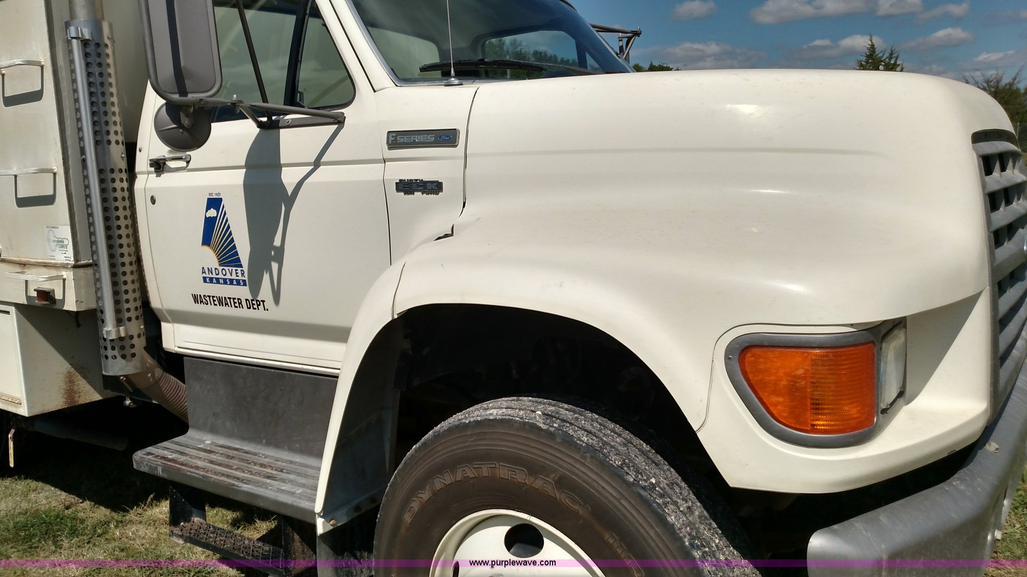 Purple Wave is selling a used Vacuum Truck in Kansas. This item is a 1995 Ford F800 sewer rodder truck with the following: 47,622 miles on odometer, 3,195 hours on meter, Cummins ISC 5.9L L6 diesel engine, Automatic transmission, Manual windows and locks, Vinyl interior, Approximately 700'L sewer hose, 1" diameter, Bean pump, 65 gallon per minute at 2,000 psi capacity, 1,500 gallon water tank, GAWR 31,300 lbs, Rebuilt transmission and PTO