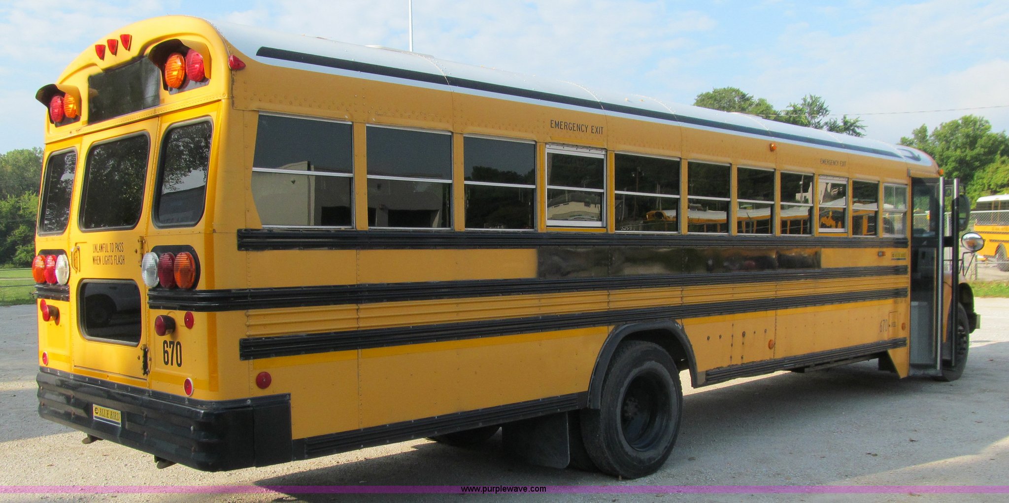 Purple Wave is selling a used Bus in Iowa. This item is a 2003 International 3800 school bus with the following: 88,881 miles on odometer, International T444E 7.3L V8 turbo diesel engine, 210 HP, Automatic transmission, Heat, Tilt, Cruise, AM/FM/cassette, Air suspension driver's seat, Block heater, Bluebird body, 65 passenger capacity, (7) emergency egress, Air suspension, Air brakes, 254" wheelbase, 10R22.5 tires, GVWR 29,500 lbs, FAWR 12,000 lbs, RAWR 19,500 lbs, Security camera and business radio not included, Unit# 670