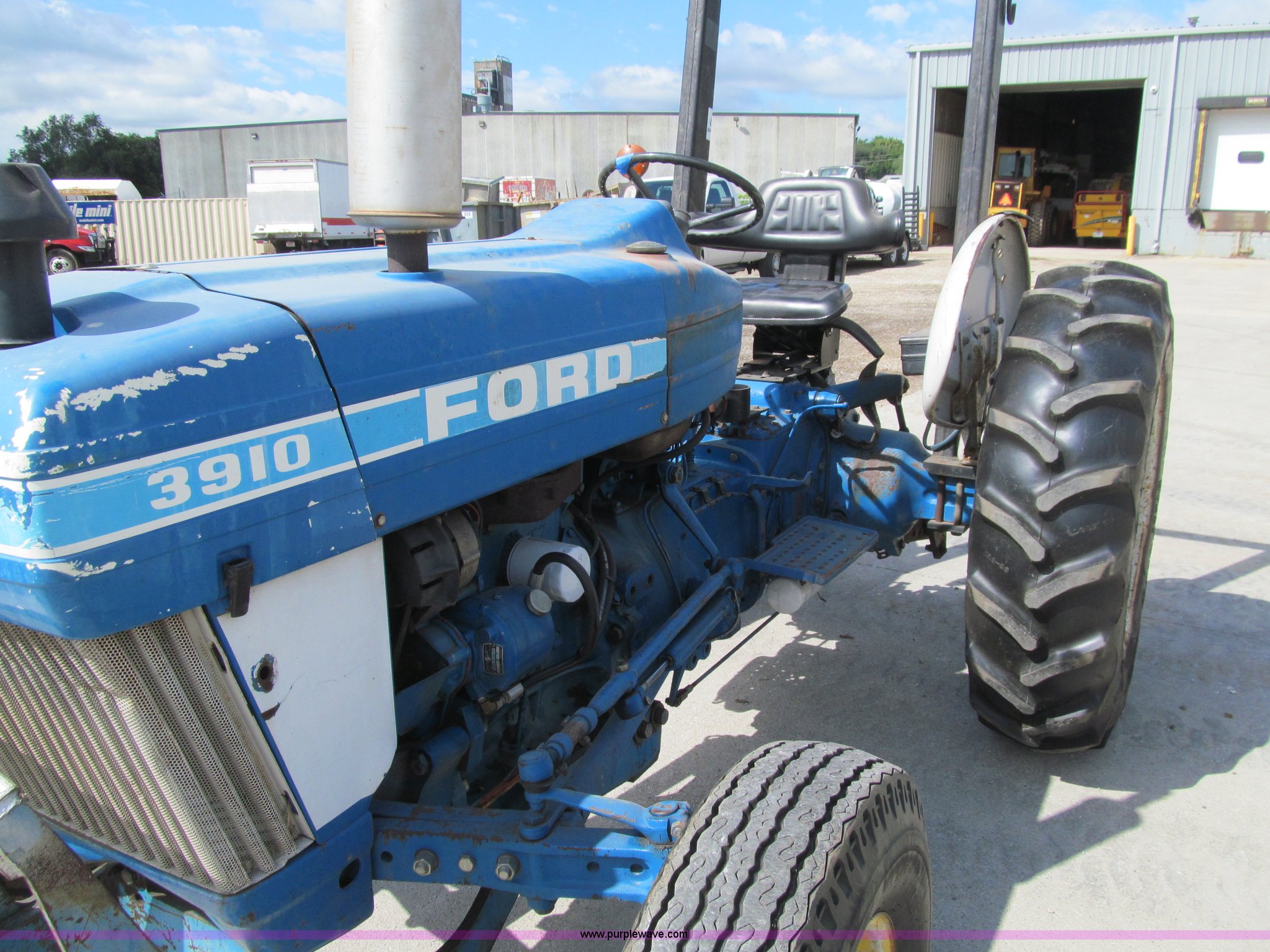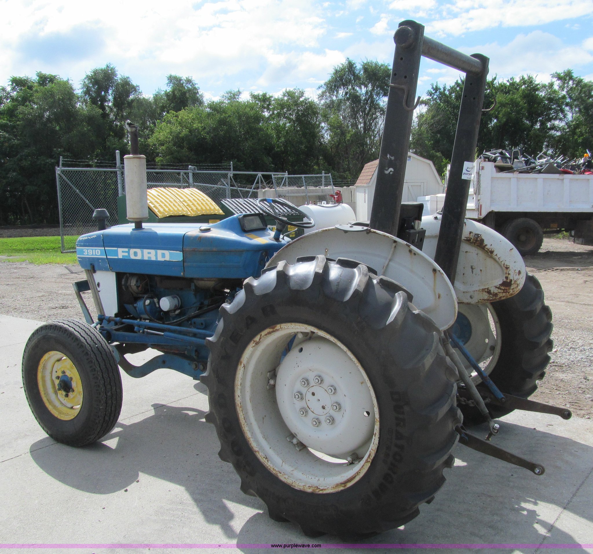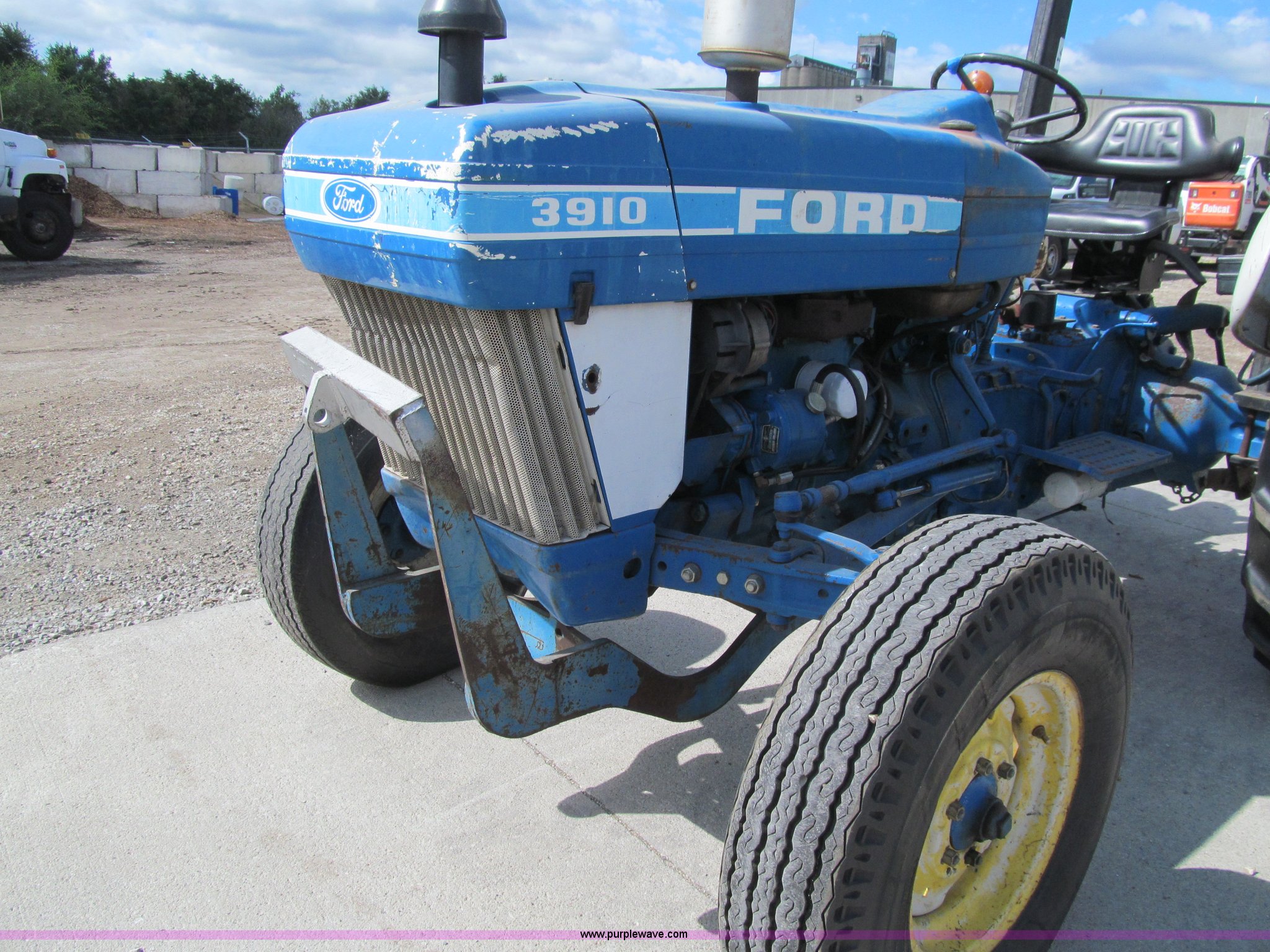 Purple Wave is selling a used Tractor in Iowa. This item is a 1983 Ford 3910 tractor with the following: 5,282 hours on meter, Ford 3F1A 3.1L three cylinder diesel engine, 47.5 HP, Manual transmission, 8F-2R gears, Differential lock, Roll bar, Suspension seat, Grill guard, Three point, Top link, 540 PTO, 77.5" wheelbase, 7.50-16LT front tires, 13.6-28 rear tires, Serial C706002