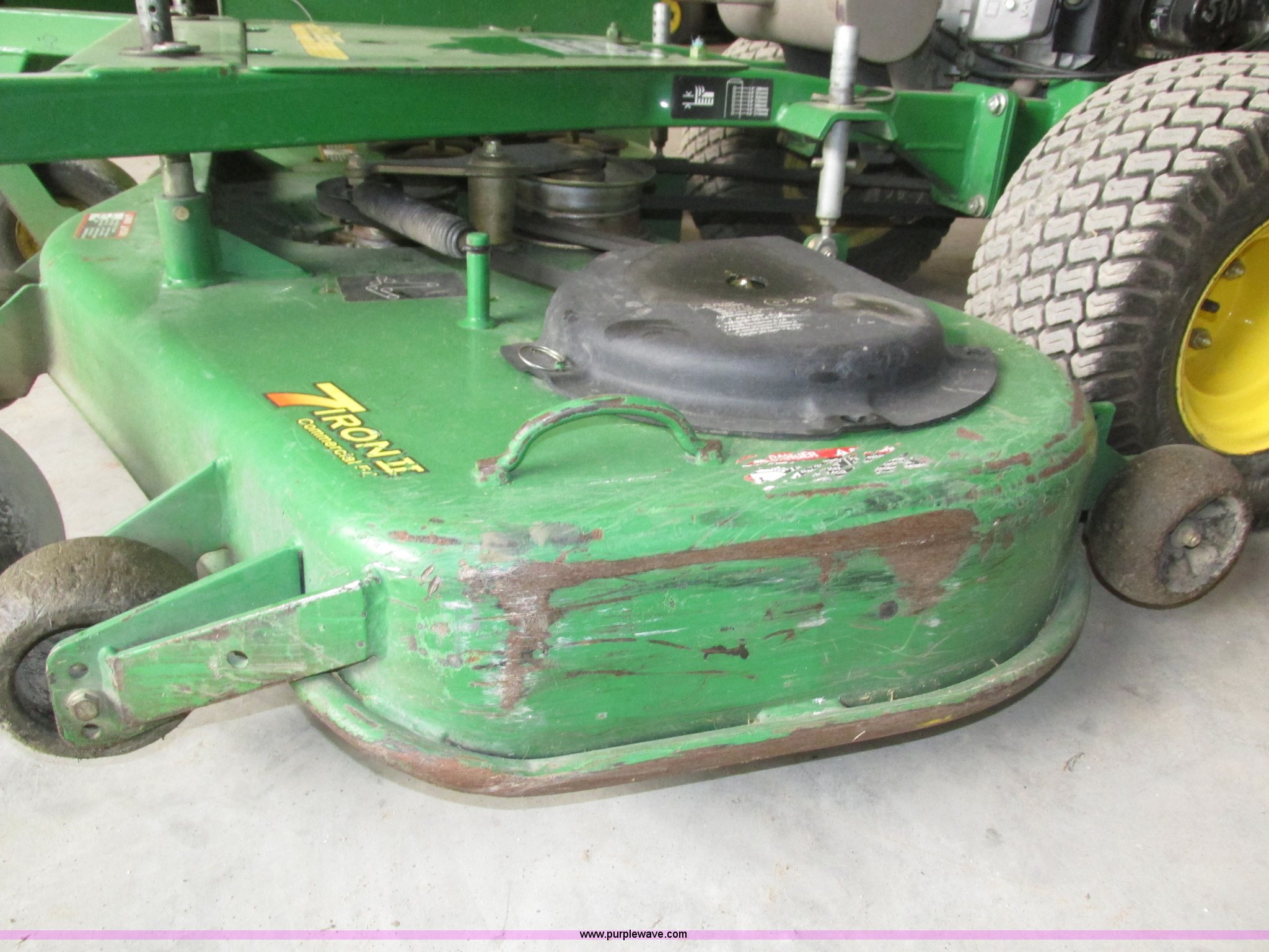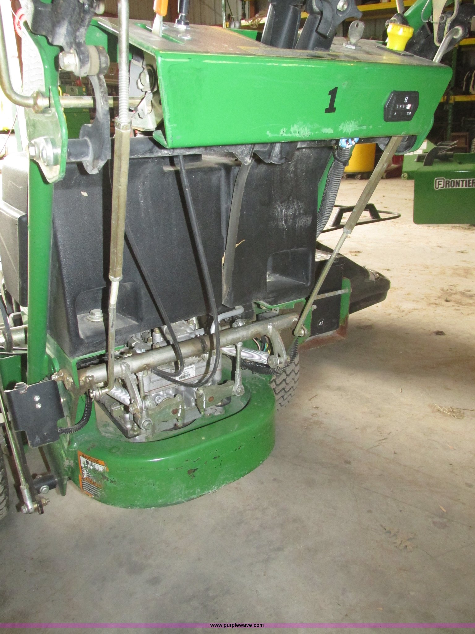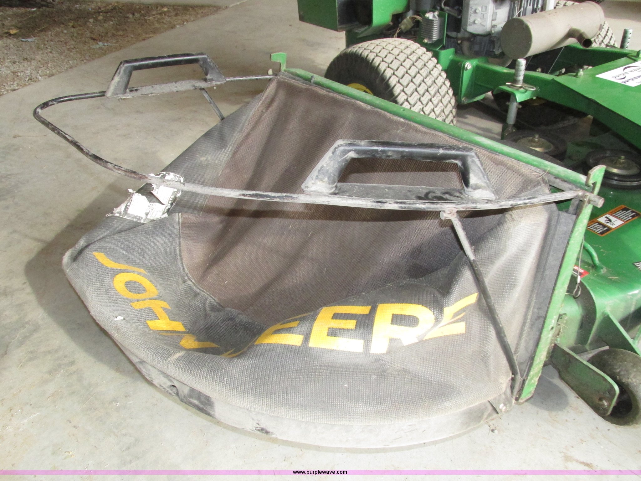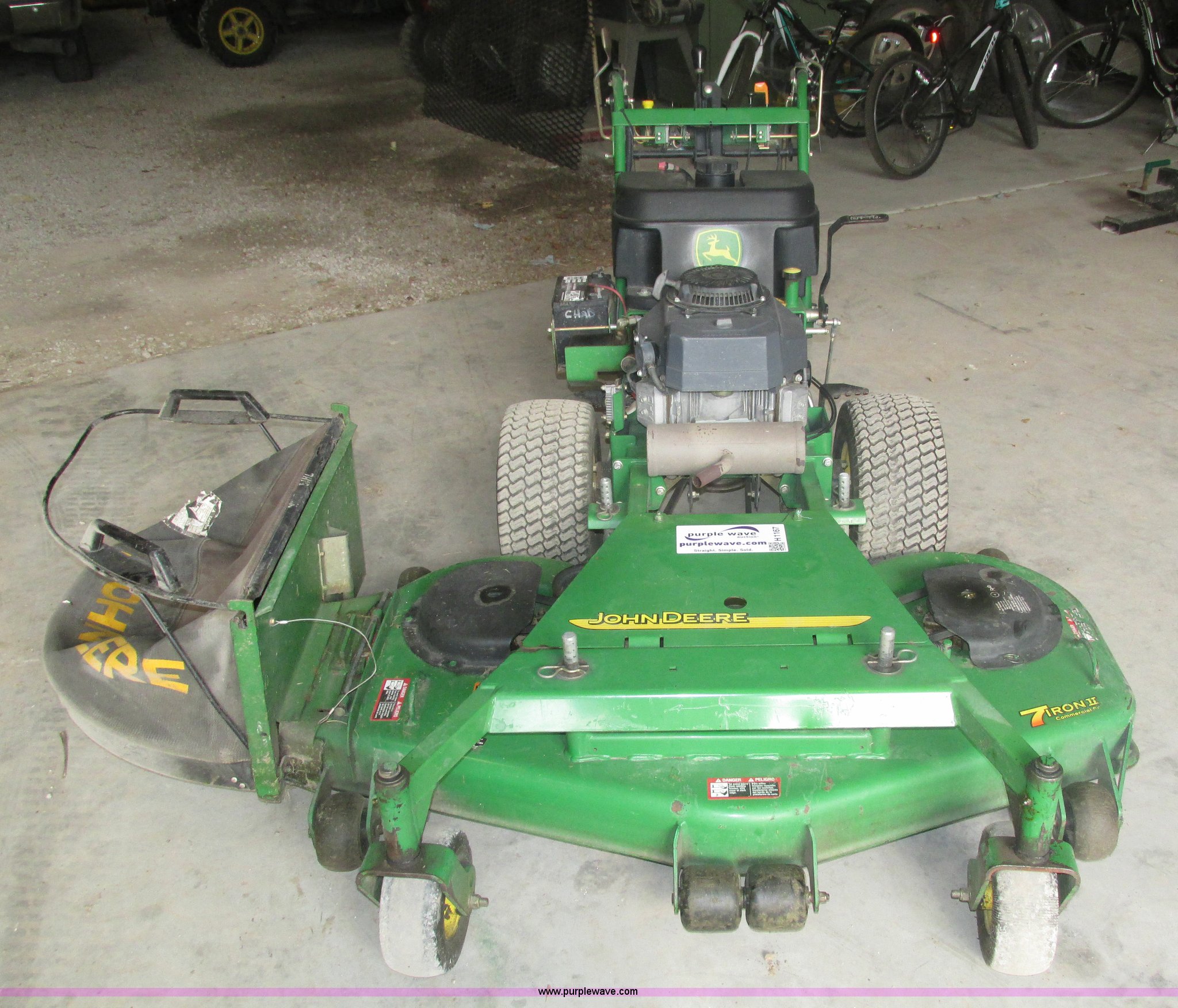 Purple Wave is selling a used Lawn Mower in Nebraska. This item is a John Deere 7 IRON II lawn mower with the following: 598 hours on meter, 54" cut, Kawasaki OHV V-twin gas engine, Electric start, Side bagger, Fuel shut-off, Parking brake, 9x3.50-4 front swivel pneumatic tires, 18x8.50-8 rear pneumatic turf tires, Unit# 1