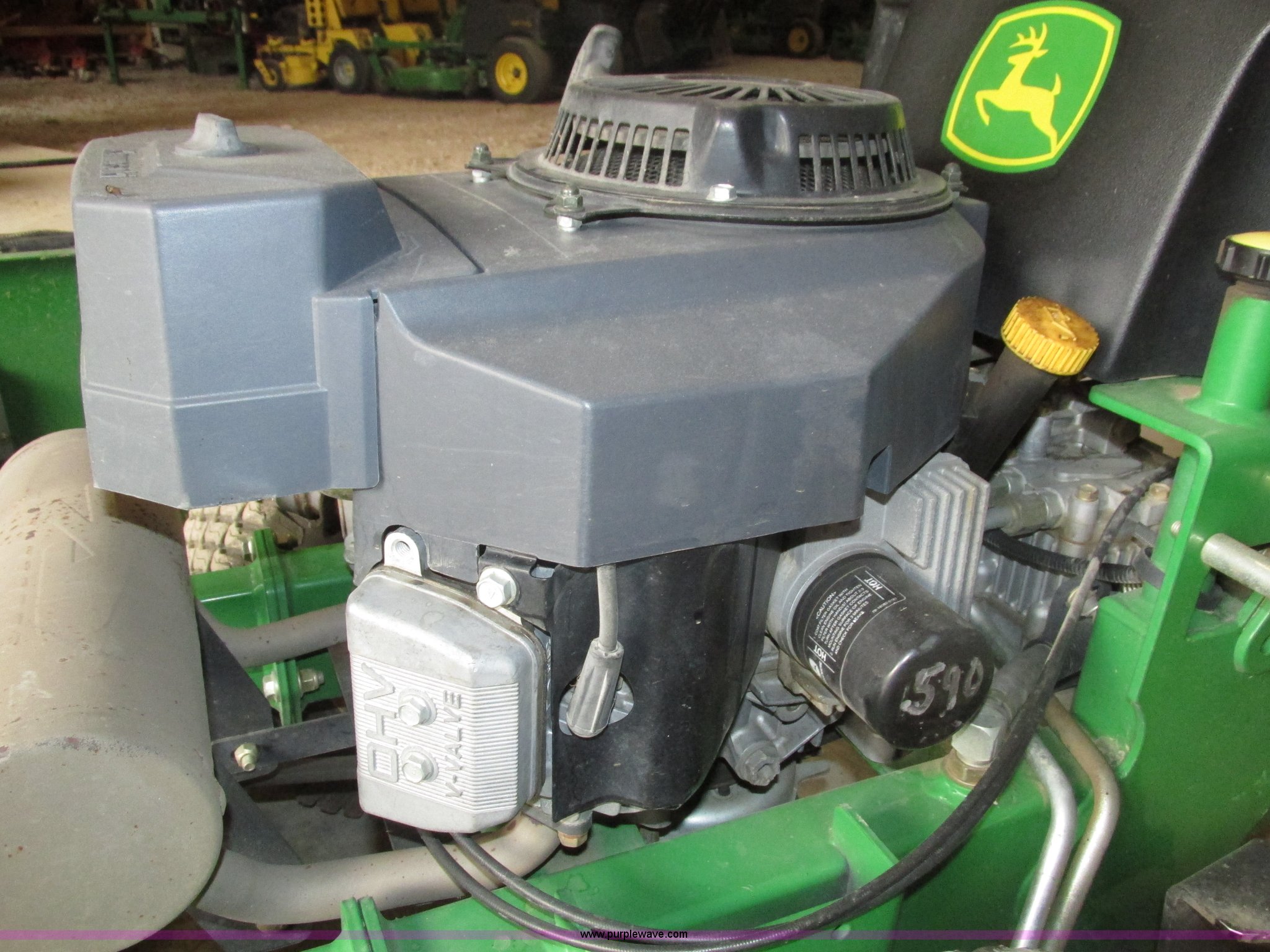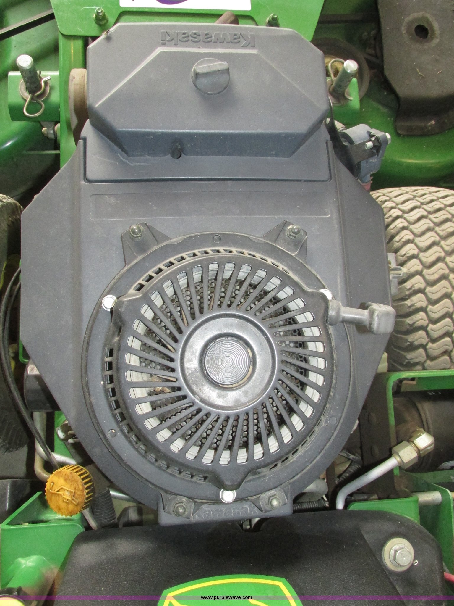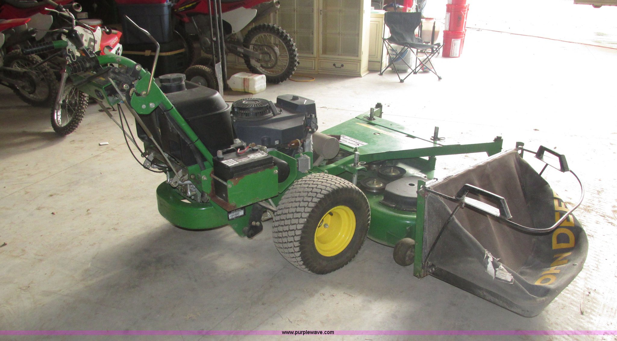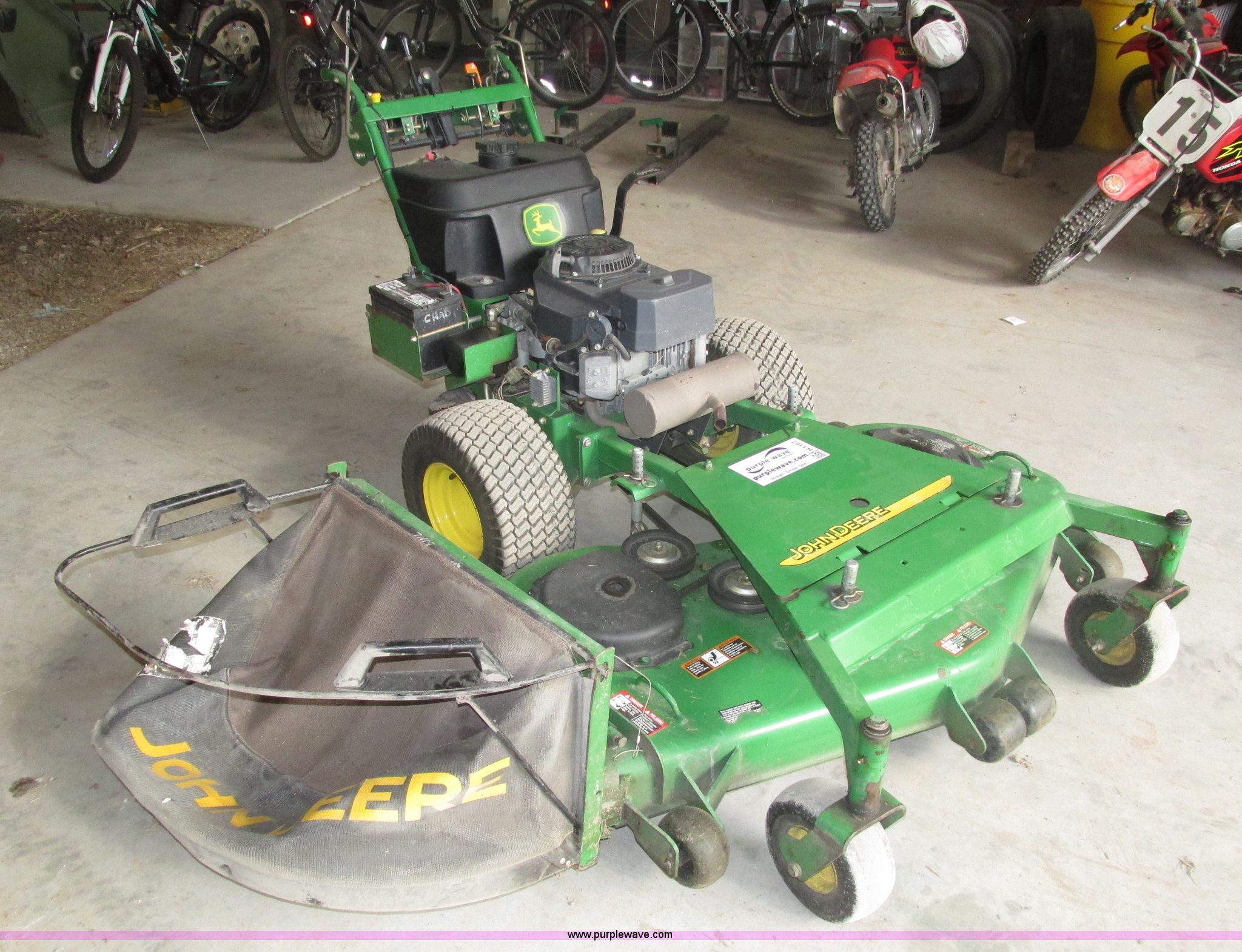 Purple Wave is selling a used Lawn Mower in Nebraska. This item is a John Deere 7 IRON II lawn mower with the following: 598 hours on meter, 54" cut, Kawasaki OHV V-twin gas engine, Electric start, Side bagger, Fuel shut-off, Parking brake, 9x3.50-4 front swivel pneumatic tires, 18x8.50-8 rear pneumatic turf tires, Unit# 1