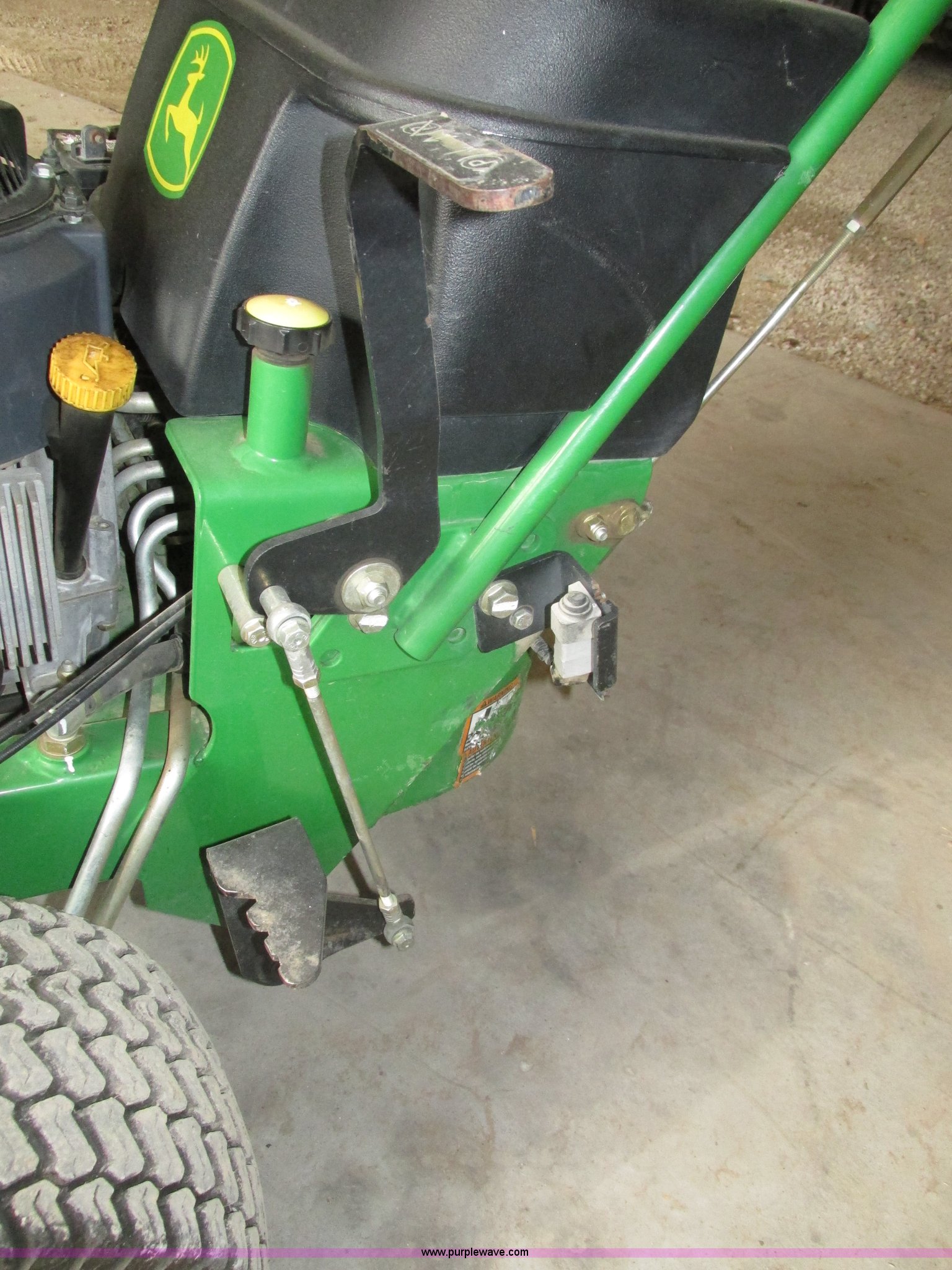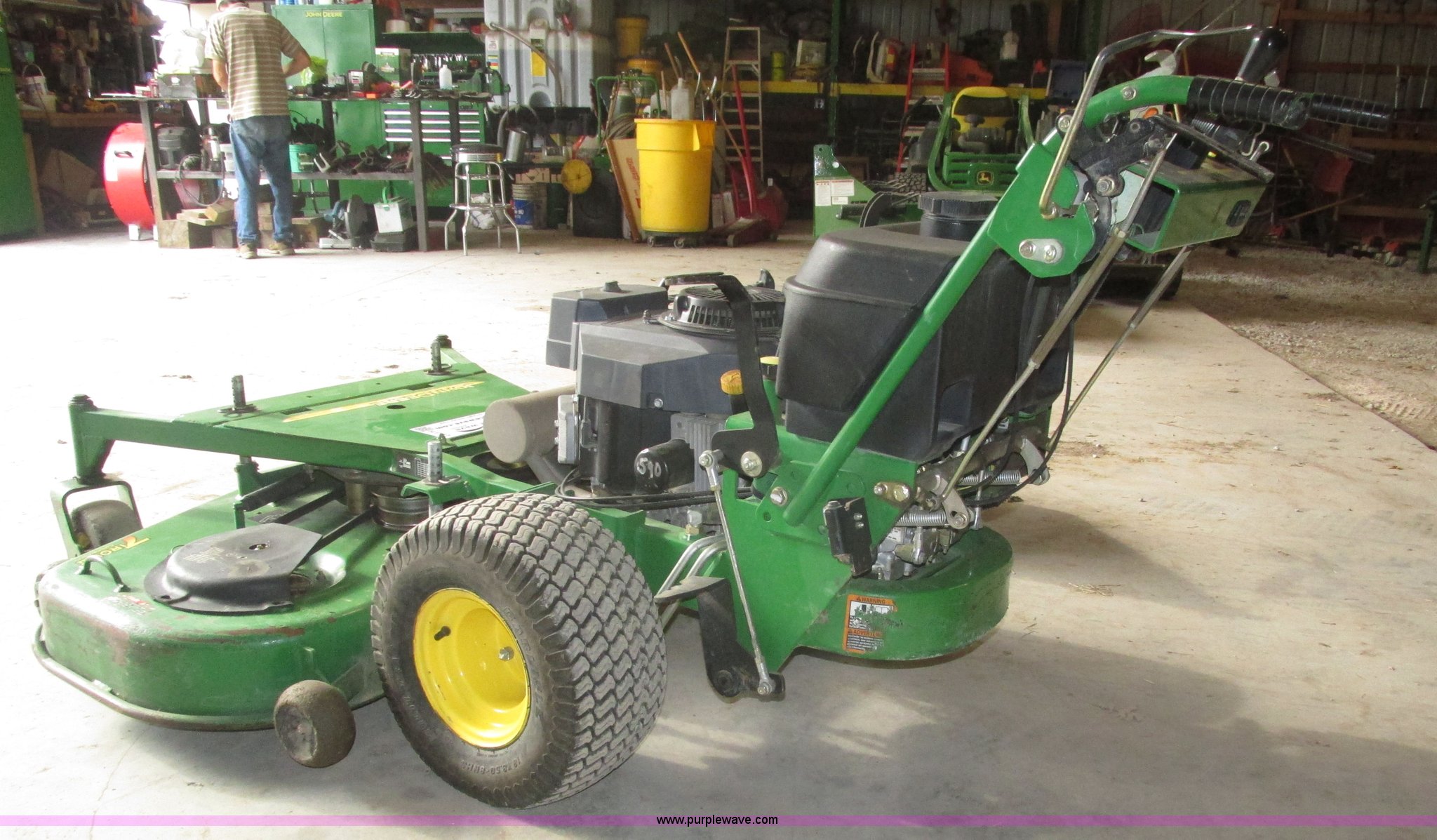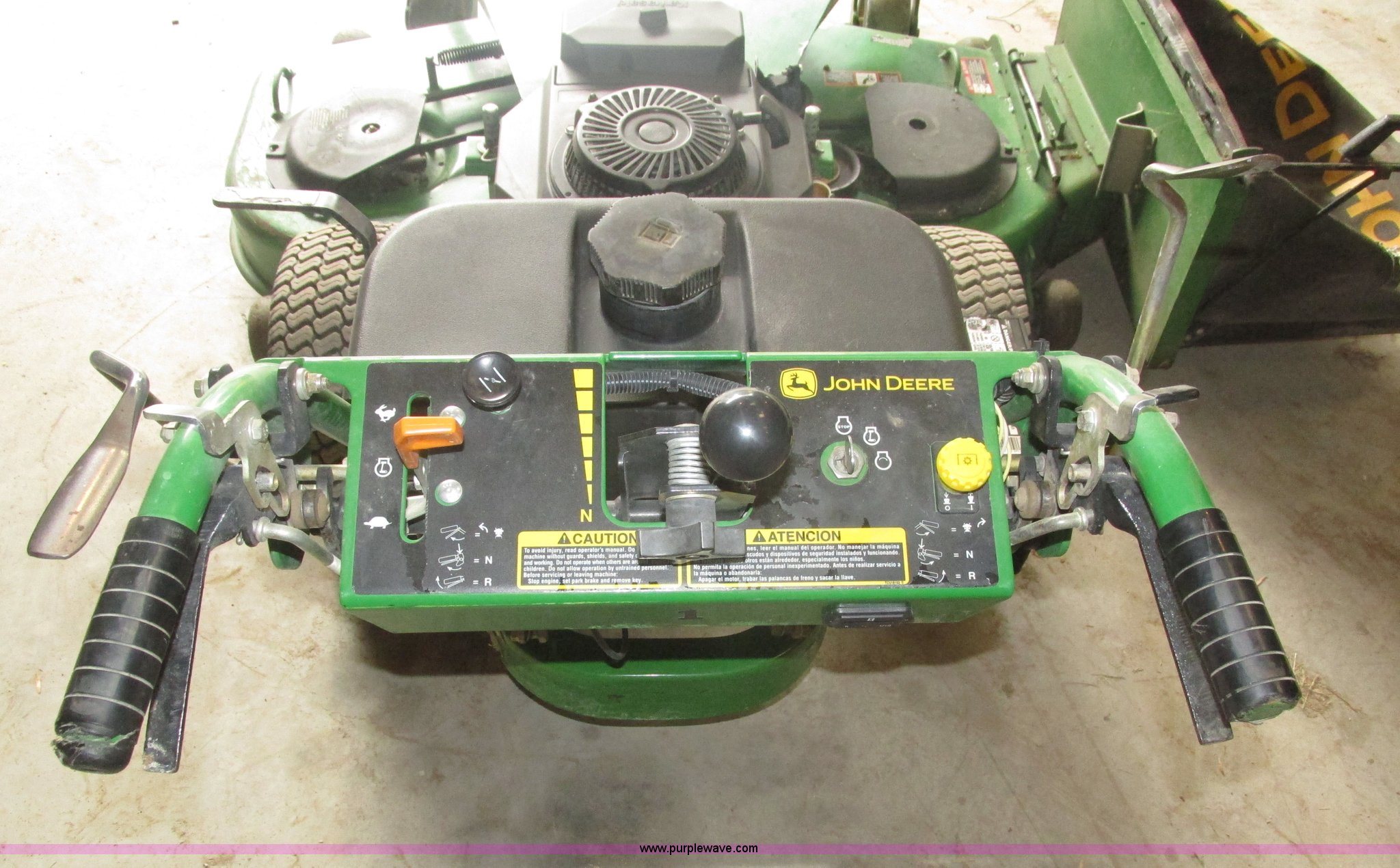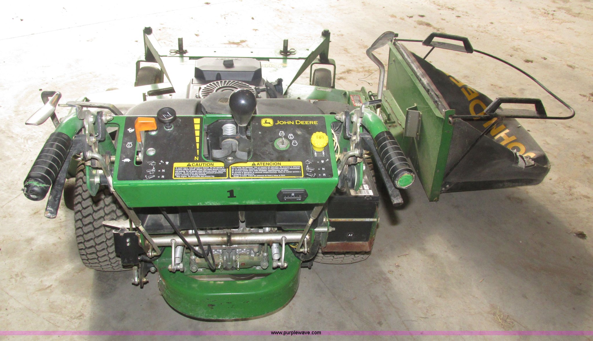 Purple Wave is selling a used Lawn Mower in Nebraska. This item is a John Deere 7 IRON II lawn mower with the following: 598 hours on meter, 54" cut, Kawasaki OHV V-twin gas engine, Electric start, Side bagger, Fuel shut-off, Parking brake, 9x3.50-4 front swivel pneumatic tires, 18x8.50-8 rear pneumatic turf tires, Unit# 1