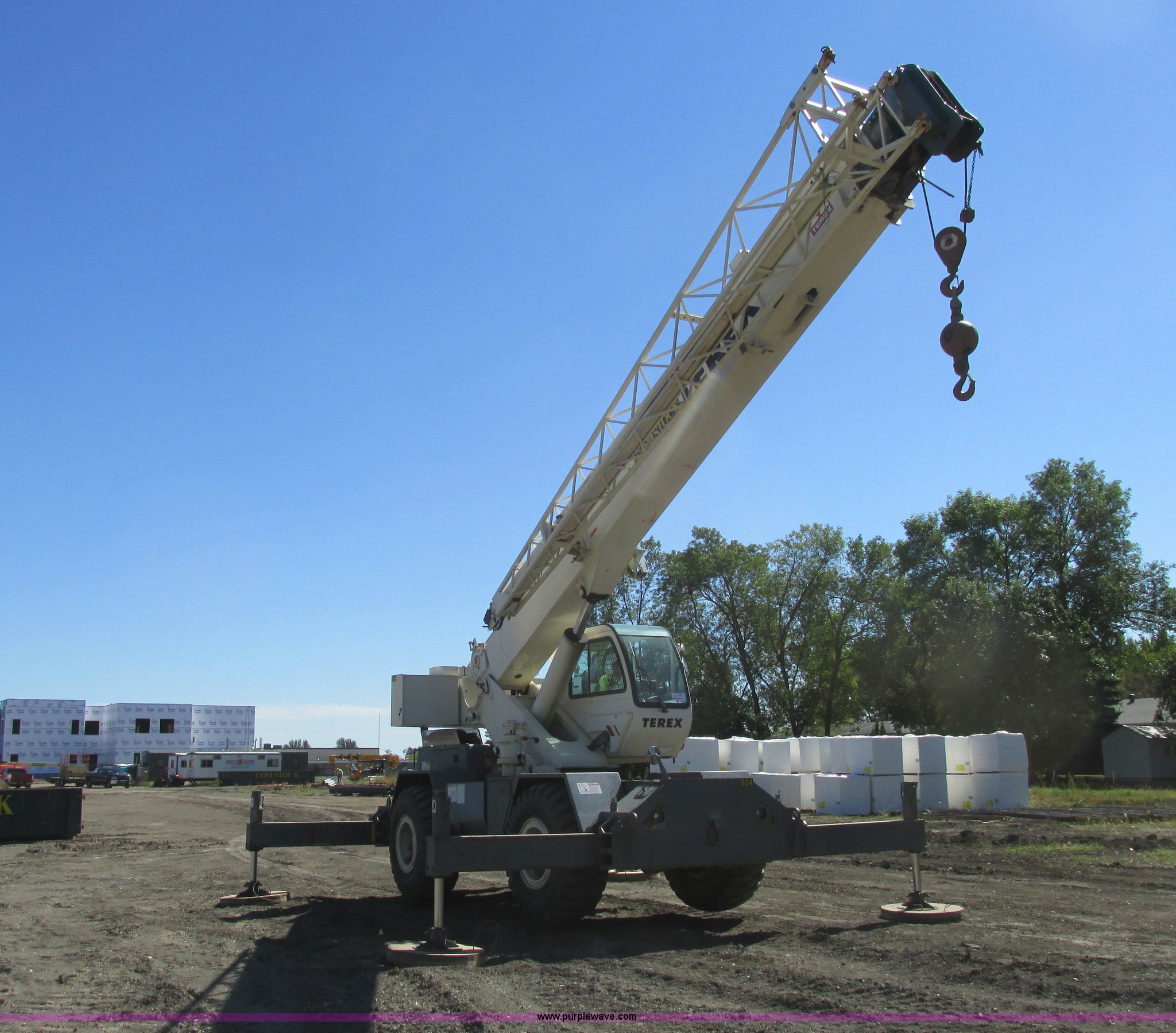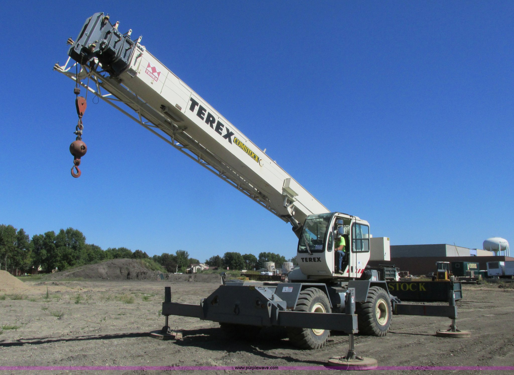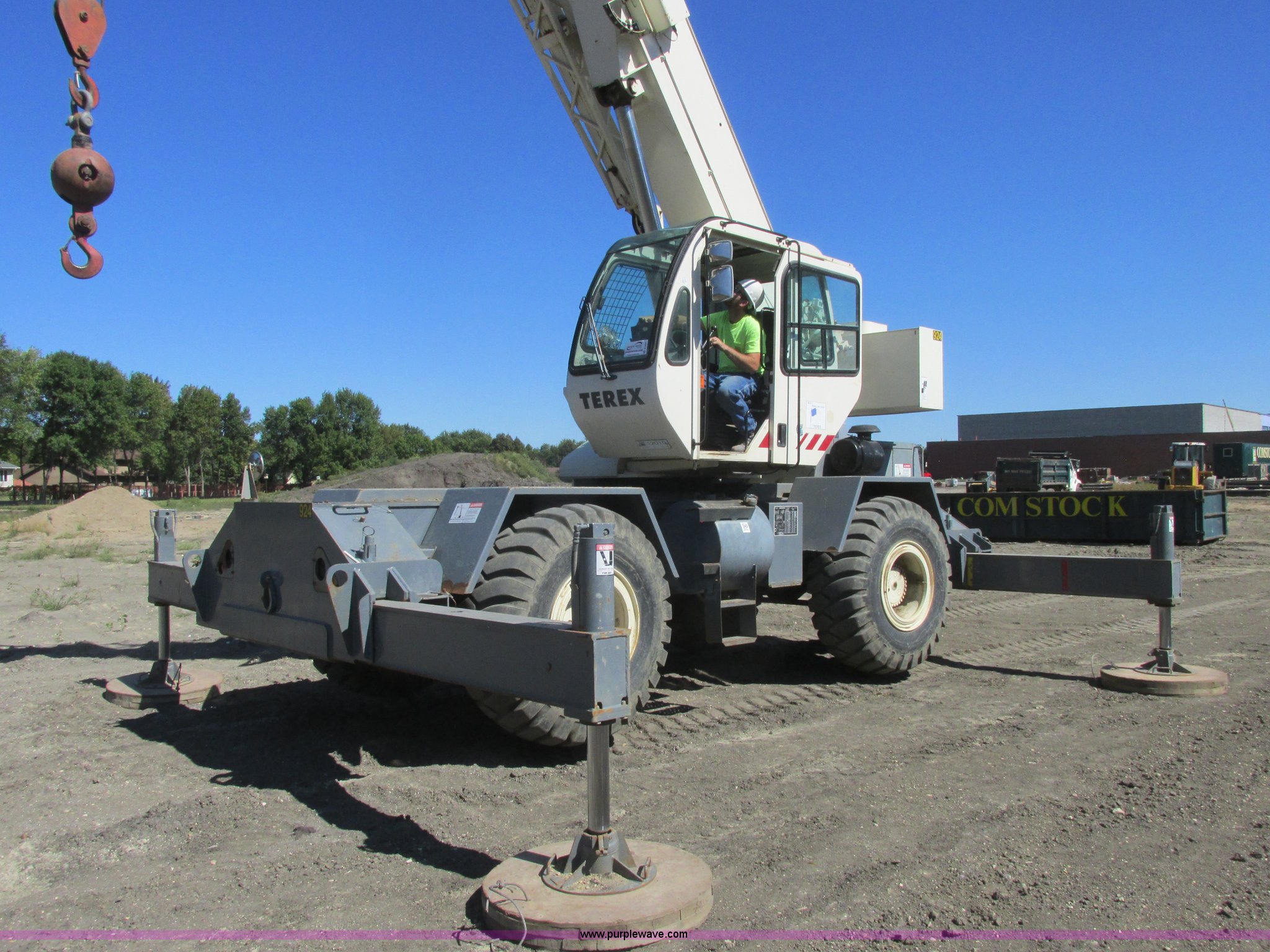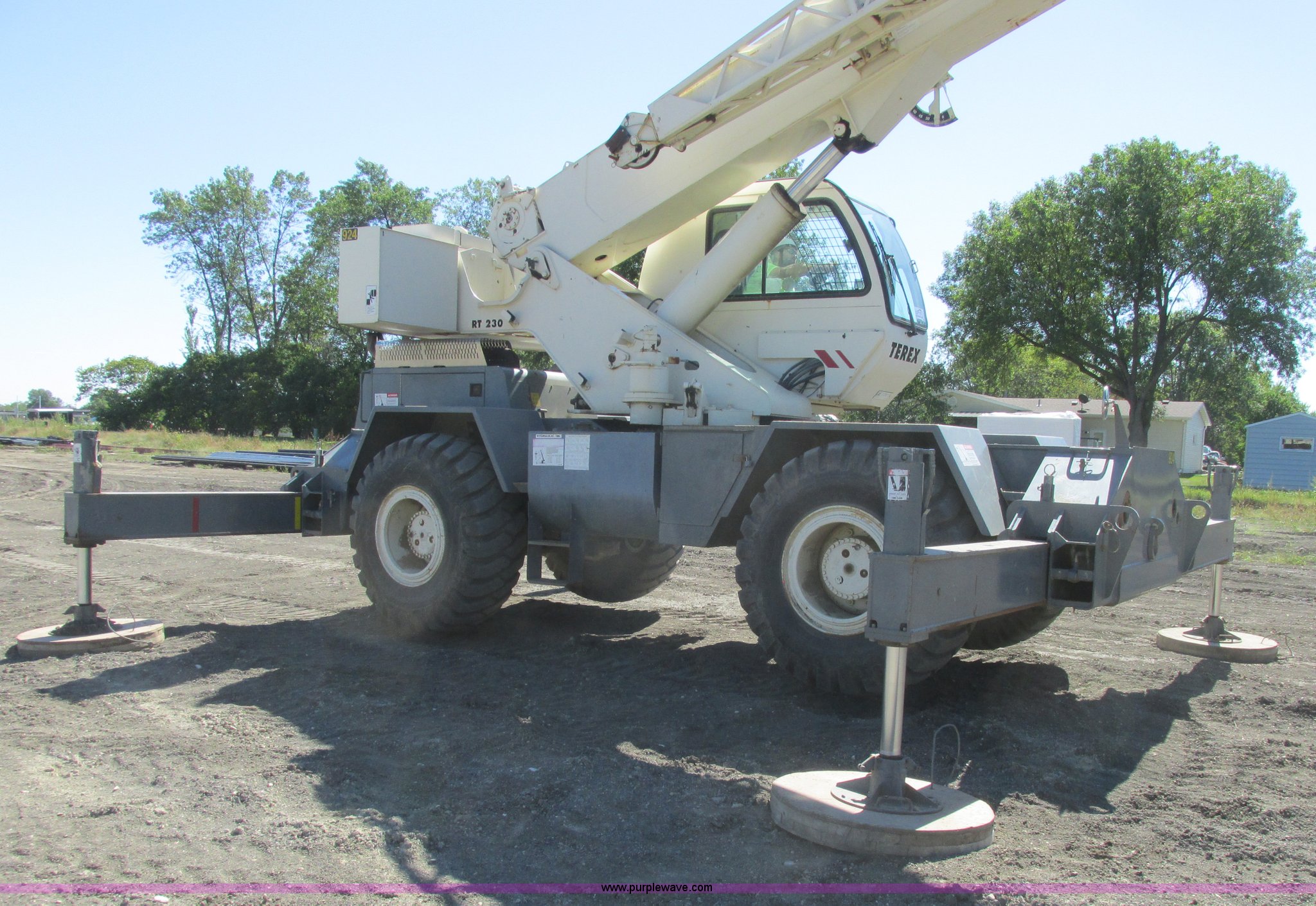 Purple Wave is selling a used Rough or All Terrain Crane in North Dakota. This item is a 2000 Terex RT230 rough terrain crane with the following: 8,769 hours on meter, Cummins 5.9L six cylinder turbo diesel engine, 130 HP, Powershift transmission, 3F-3R gears, Four wheel drive, Front wheel steer, All wheel steer, All wheel crab steer, 30 ton capacity, 94' boom, 147' maximum height with extension, Four section boom, Two section jib, 43'L total, 26' lattice jib, 17' slide out jib, Four part block, Air brakes, General E3 20.5-25 tires, 56,585 lbs. base operating weight, Annual inspection due August 2016, View inspection report, Serial 12010