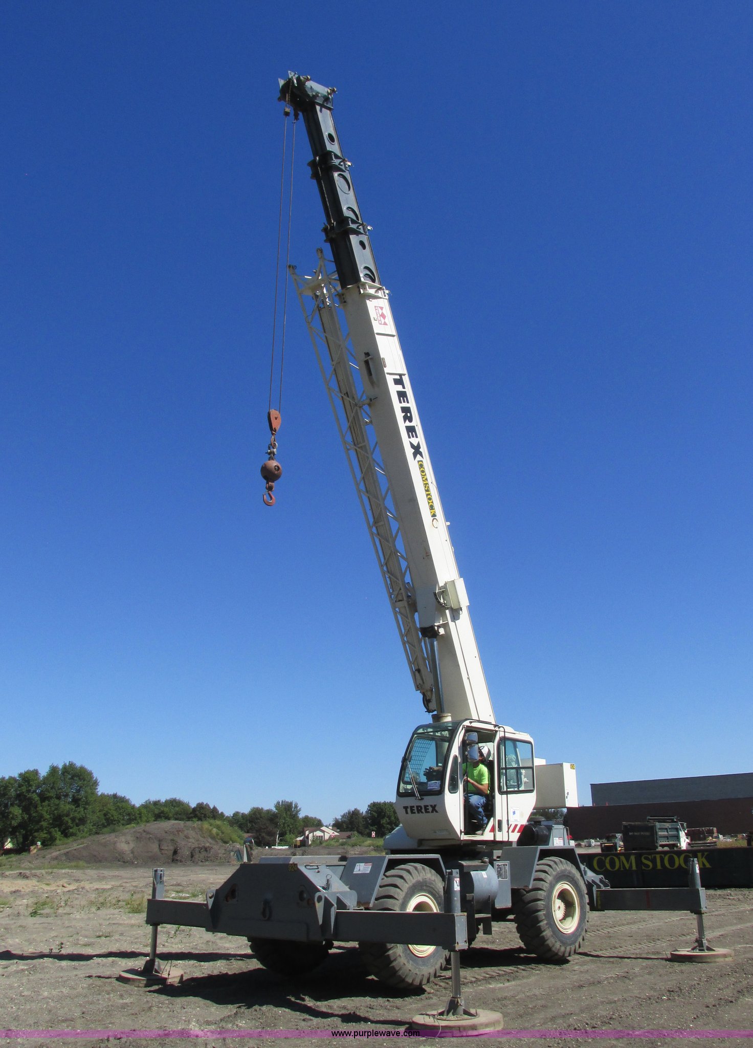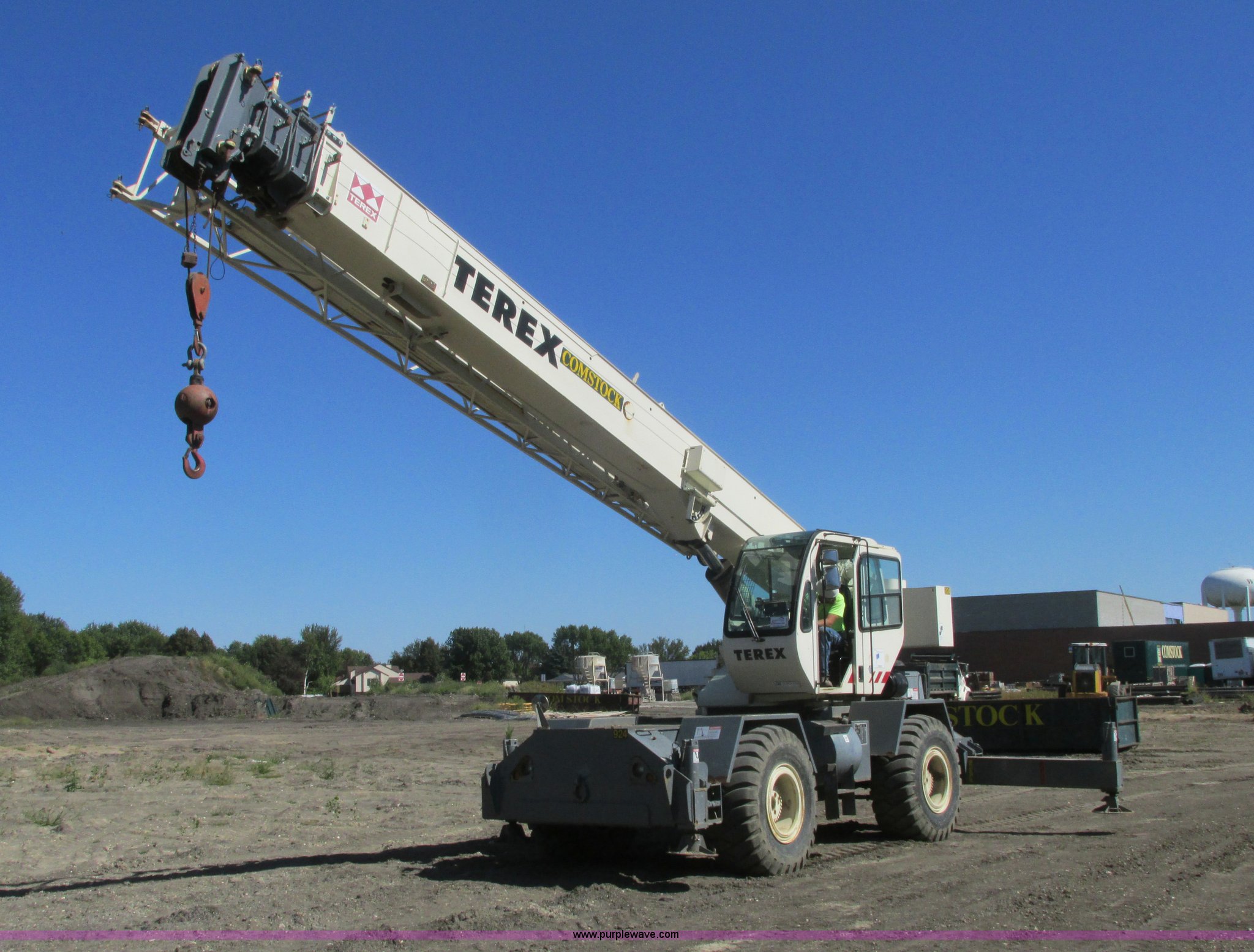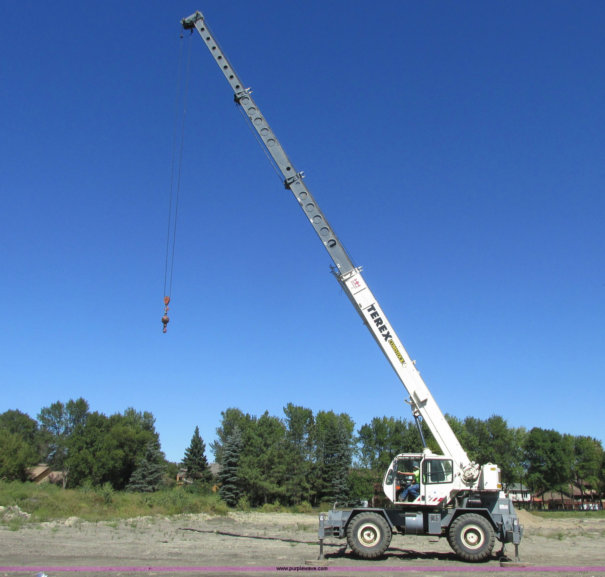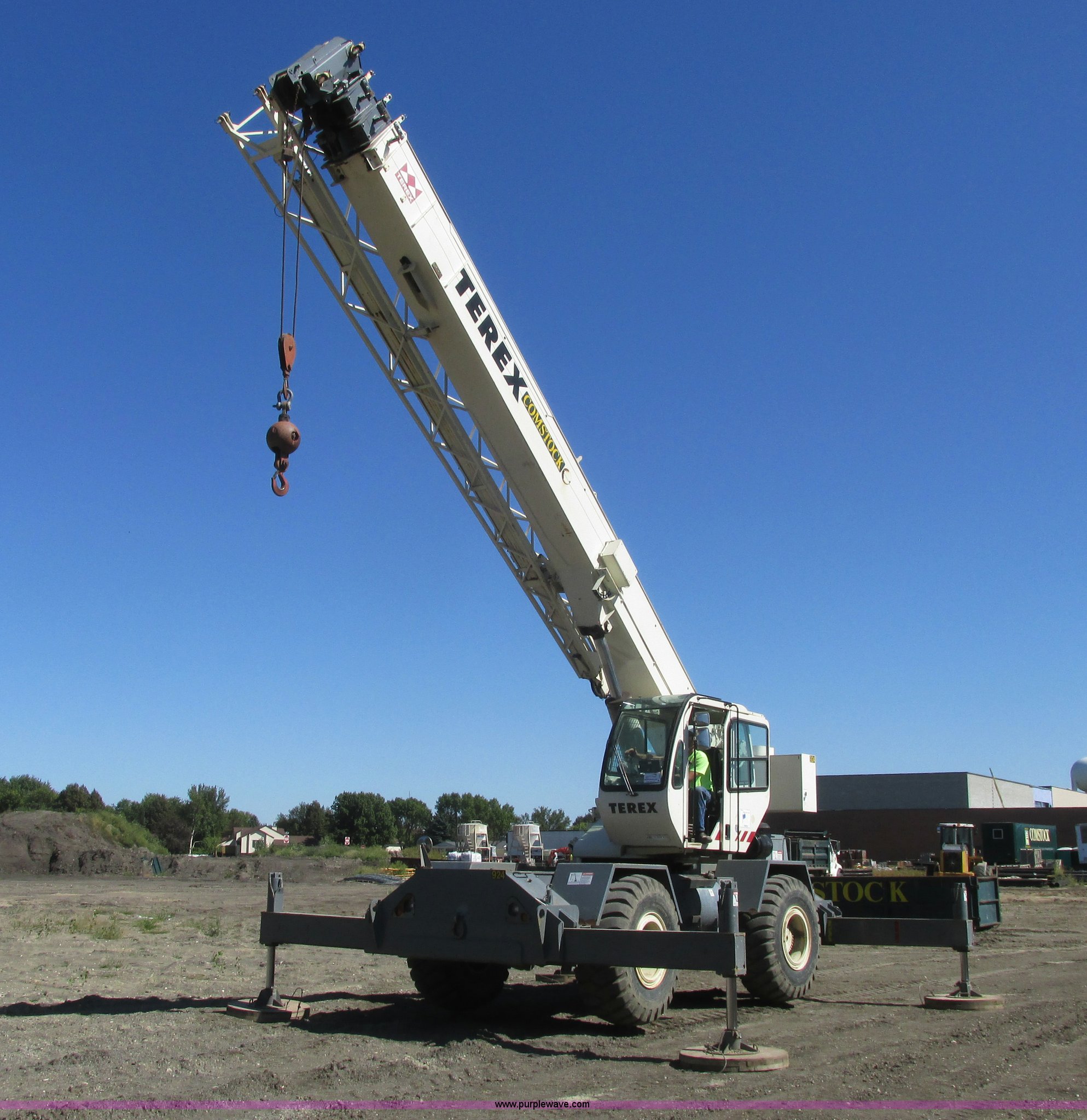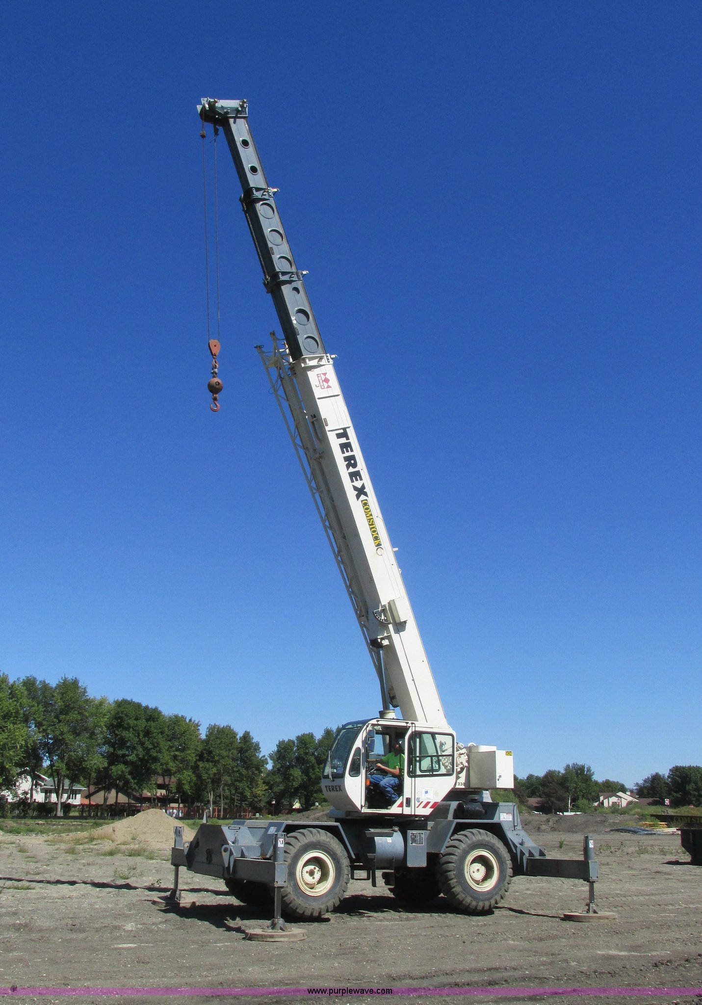 Purple Wave is selling a used Rough or All Terrain Crane in North Dakota. This item is a 2000 Terex RT230 rough terrain crane with the following: 8,769 hours on meter, Cummins 5.9L six cylinder turbo diesel engine, 130 HP, Powershift transmission, 3F-3R gears, Four wheel drive, Front wheel steer, All wheel steer, All wheel crab steer, 30 ton capacity, 94' boom, 147' maximum height with extension, Four section boom, Two section jib, 43'L total, 26' lattice jib, 17' slide out jib, Four part block, Air brakes, General E3 20.5-25 tires, 56,585 lbs. base operating weight, Annual inspection due August 2016, View inspection report, Serial 12010