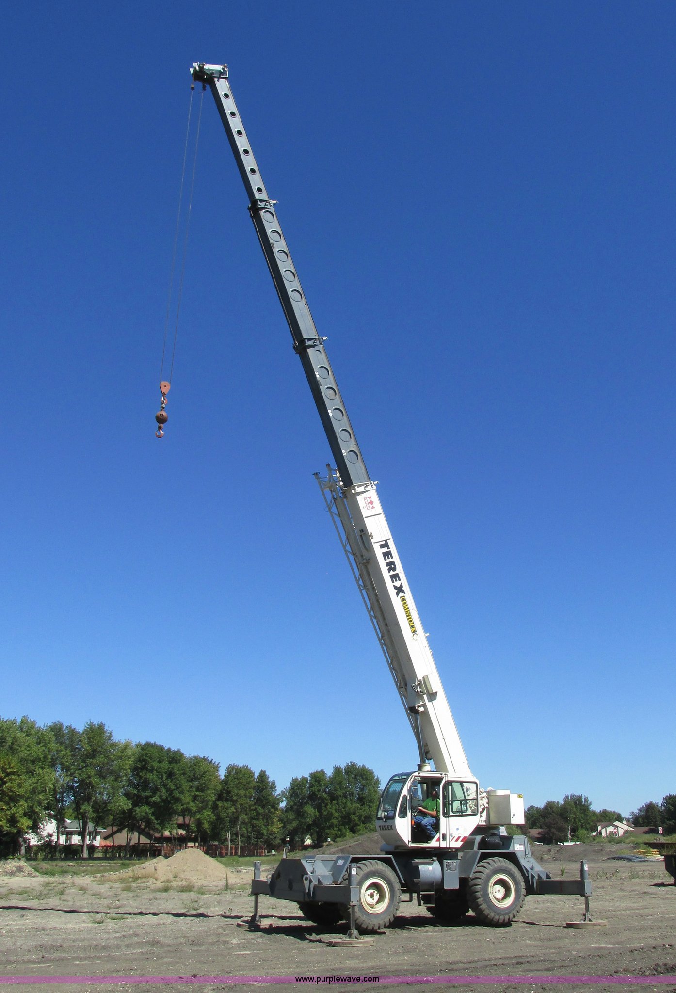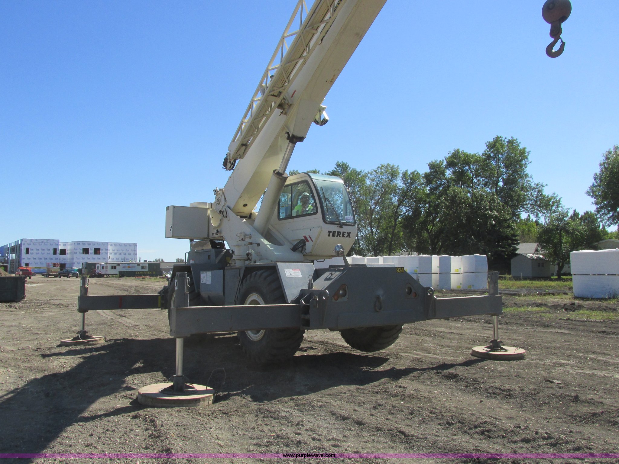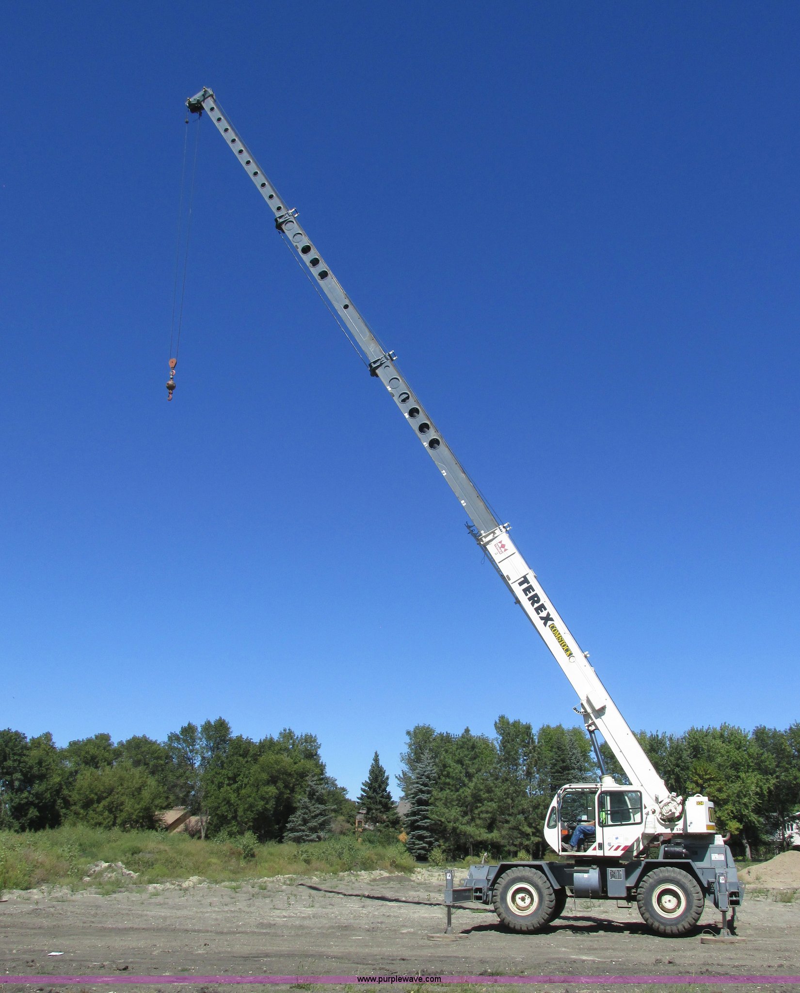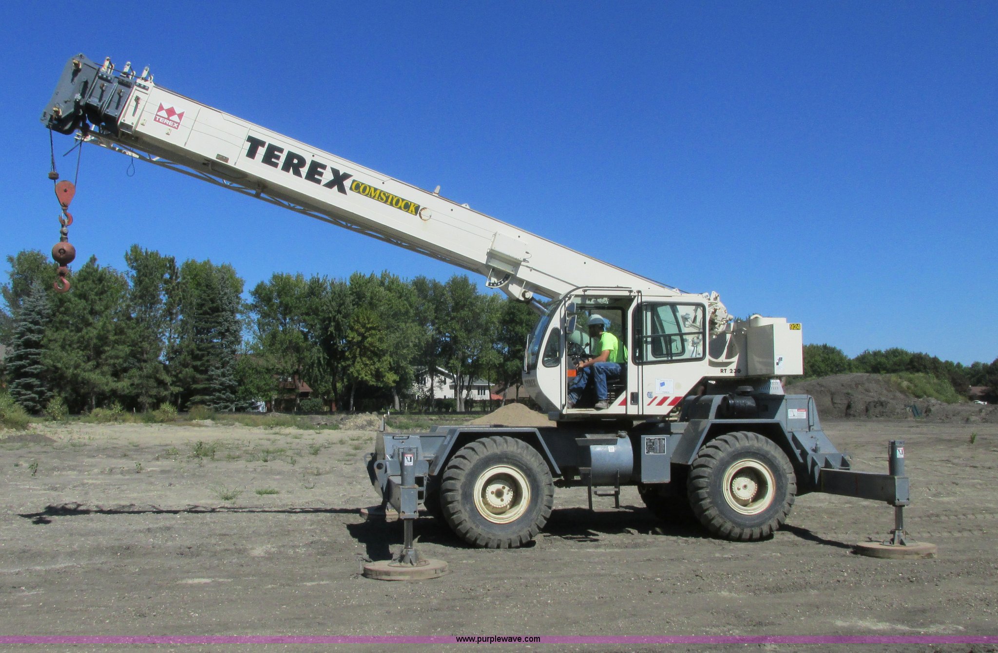 Purple Wave is selling a used Rough or All Terrain Crane in North Dakota. This item is a 2000 Terex RT230 rough terrain crane with the following: 8,769 hours on meter, Cummins 5.9L six cylinder turbo diesel engine, 130 HP, Powershift transmission, 3F-3R gears, Four wheel drive, Front wheel steer, All wheel steer, All wheel crab steer, 30 ton capacity, 94' boom, 147' maximum height with extension, Four section boom, Two section jib, 43'L total, 26' lattice jib, 17' slide out jib, Four part block, Air brakes, General E3 20.5-25 tires, 56,585 lbs. base operating weight, Annual inspection due August 2016, View inspection report, Serial 12010