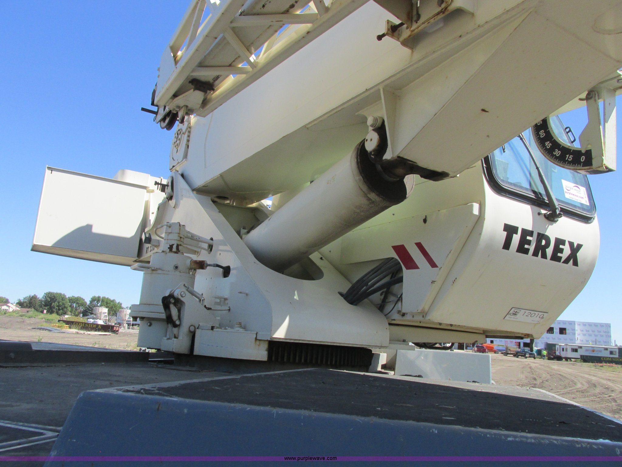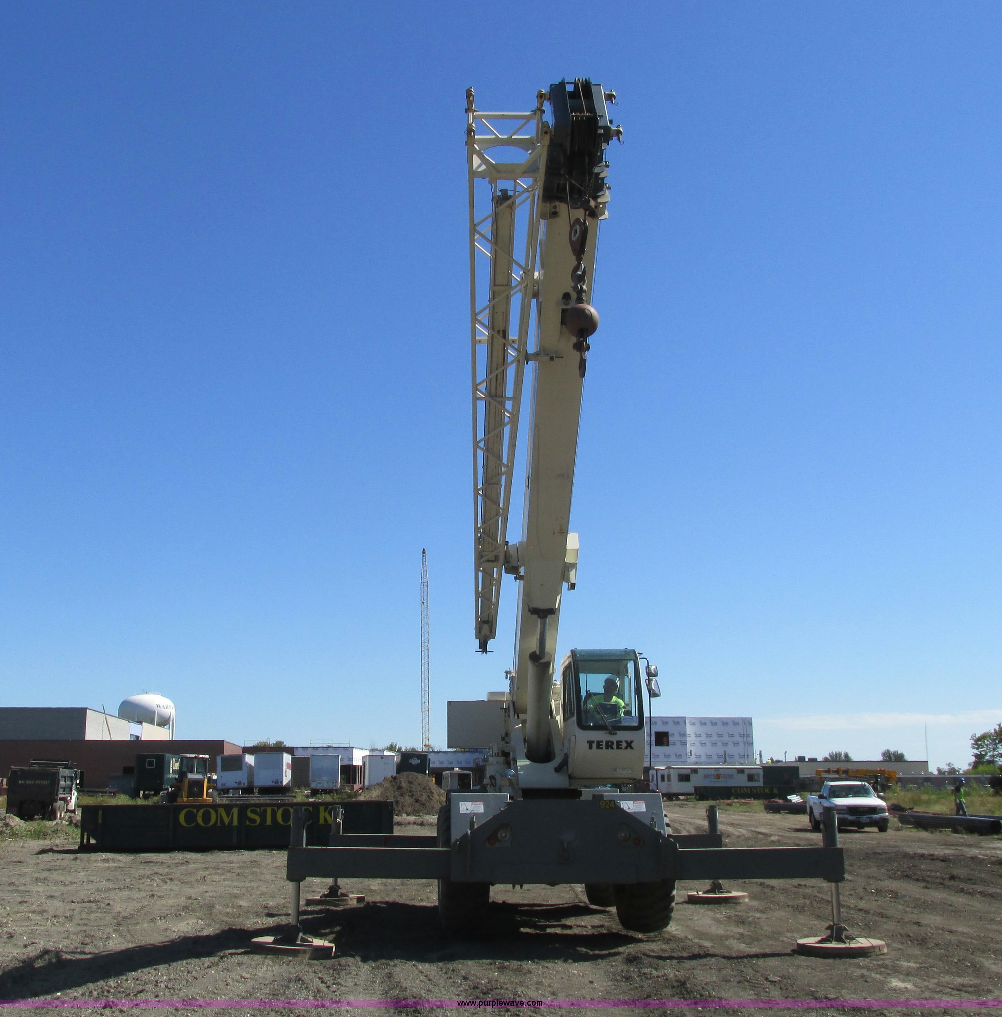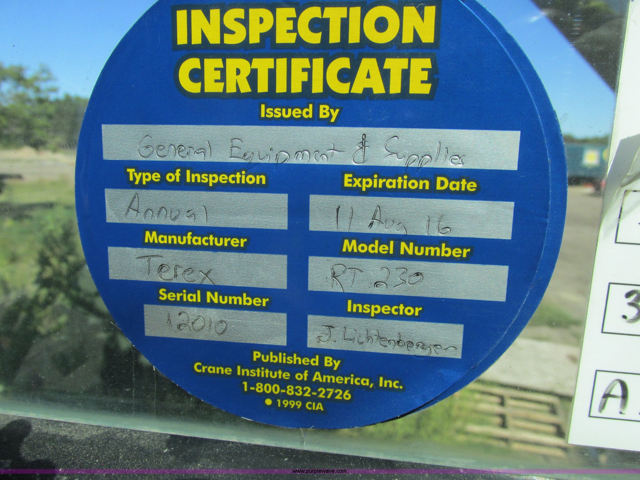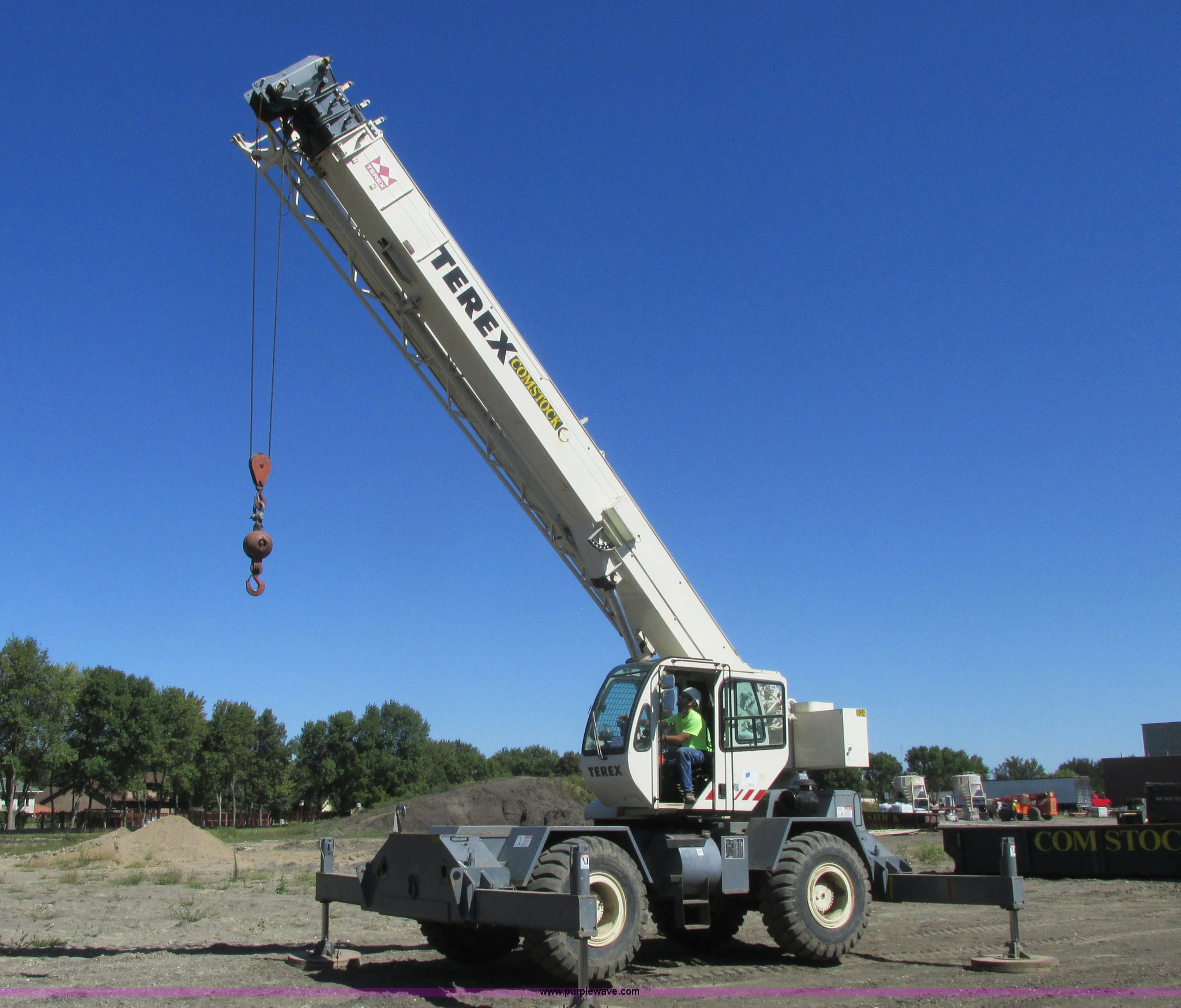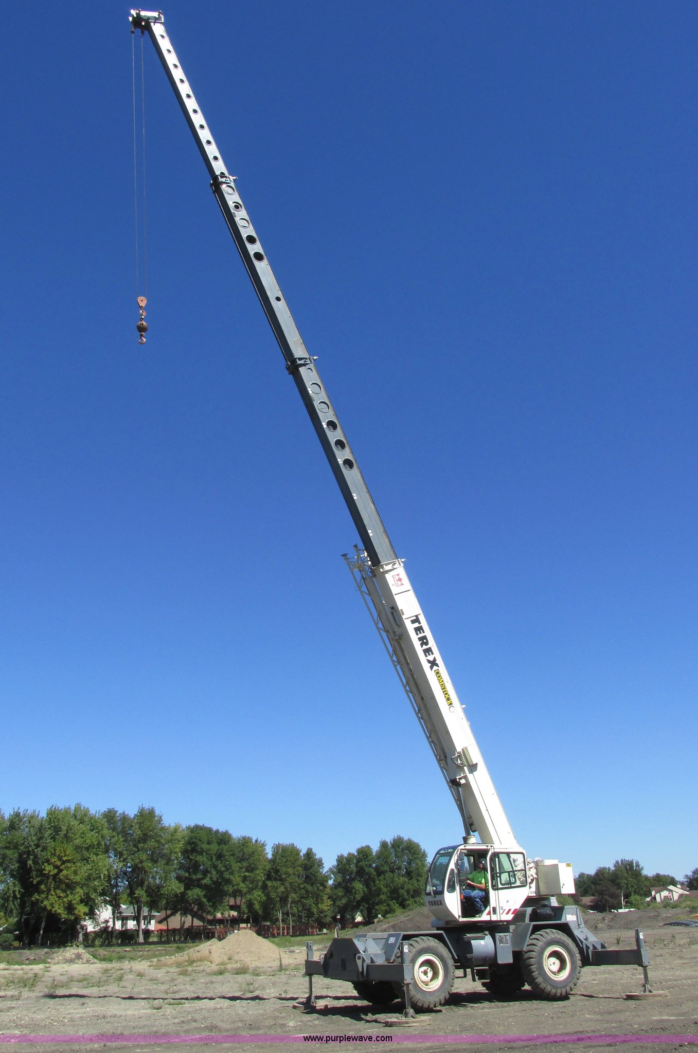 Purple Wave is selling a used Rough or All Terrain Crane in North Dakota. This item is a 2000 Terex RT230 rough terrain crane with the following: 8,769 hours on meter, Cummins 5.9L six cylinder turbo diesel engine, 130 HP, Powershift transmission, 3F-3R gears, Four wheel drive, Front wheel steer, All wheel steer, All wheel crab steer, 30 ton capacity, 94' boom, 147' maximum height with extension, Four section boom, Two section jib, 43'L total, 26' lattice jib, 17' slide out jib, Four part block, Air brakes, General E3 20.5-25 tires, 56,585 lbs. base operating weight, Annual inspection due August 2016, View inspection report, Serial 12010