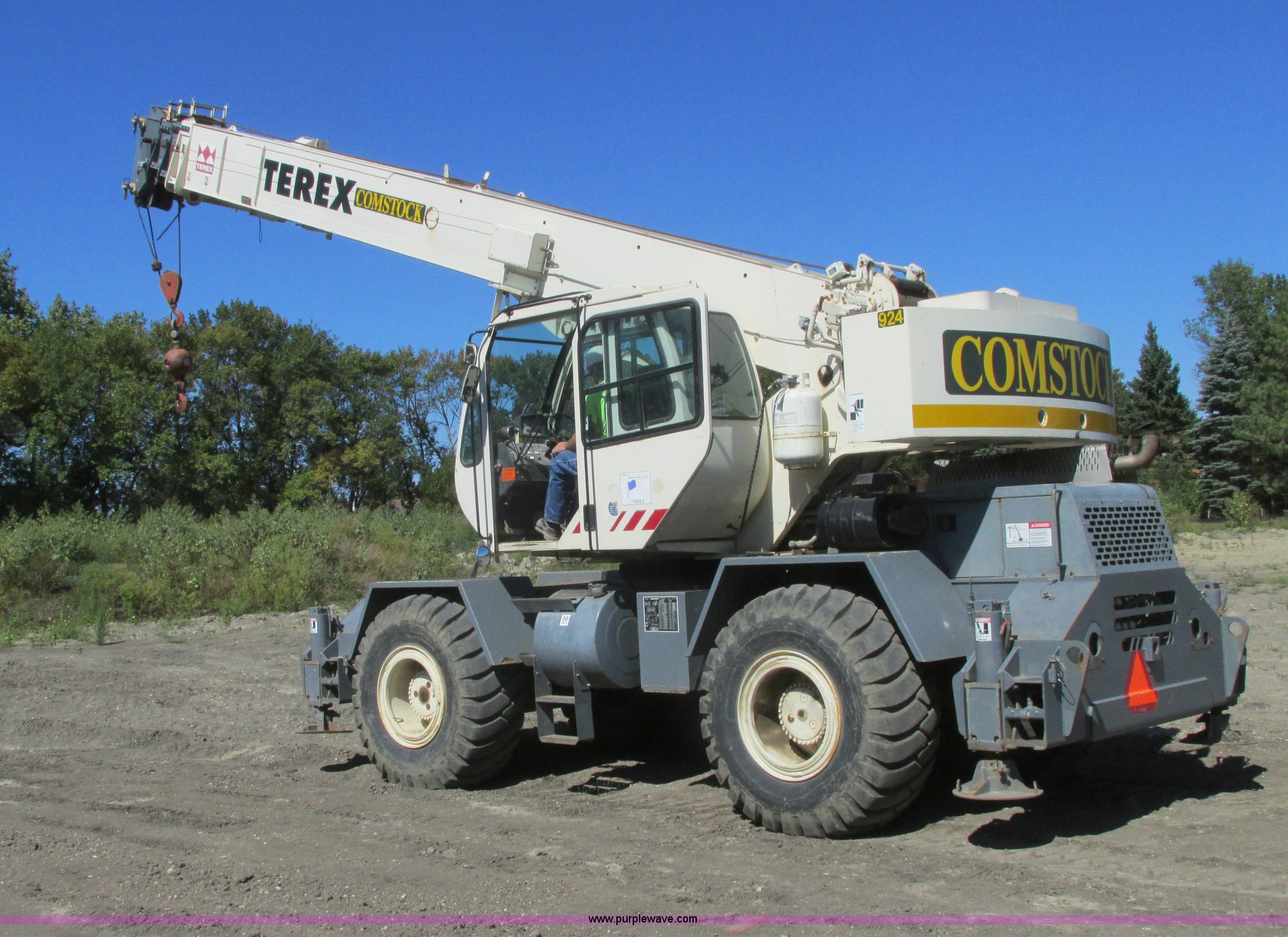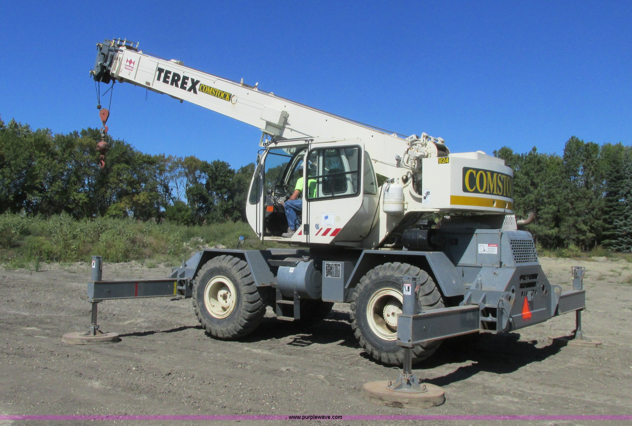 2000 Terex RT230 rough terrain crane. 8,769 hours on meter, Cummins 5.9L six cylinder turbo diesel engine 130 HP, Powershift transmission 3F-3R gears, Four wheel drive, Front wheel steer, All wheel steer, All wheel crab steer, 30 ton capacity, 94' boom, 147' maximum height with extension, Four section boom, Two section jib 43'L total, 26' lattice jib, 17' slide out jib, Four part block, Air brakes, General E3 20.5-25 tires, 56,585 lbs. base operating weight, Annual inspection due August 2016, View inspection report , Serial 12010. View equipment video. Comstock Construction. 280 11th Street South. Wahpeton, ND 58075