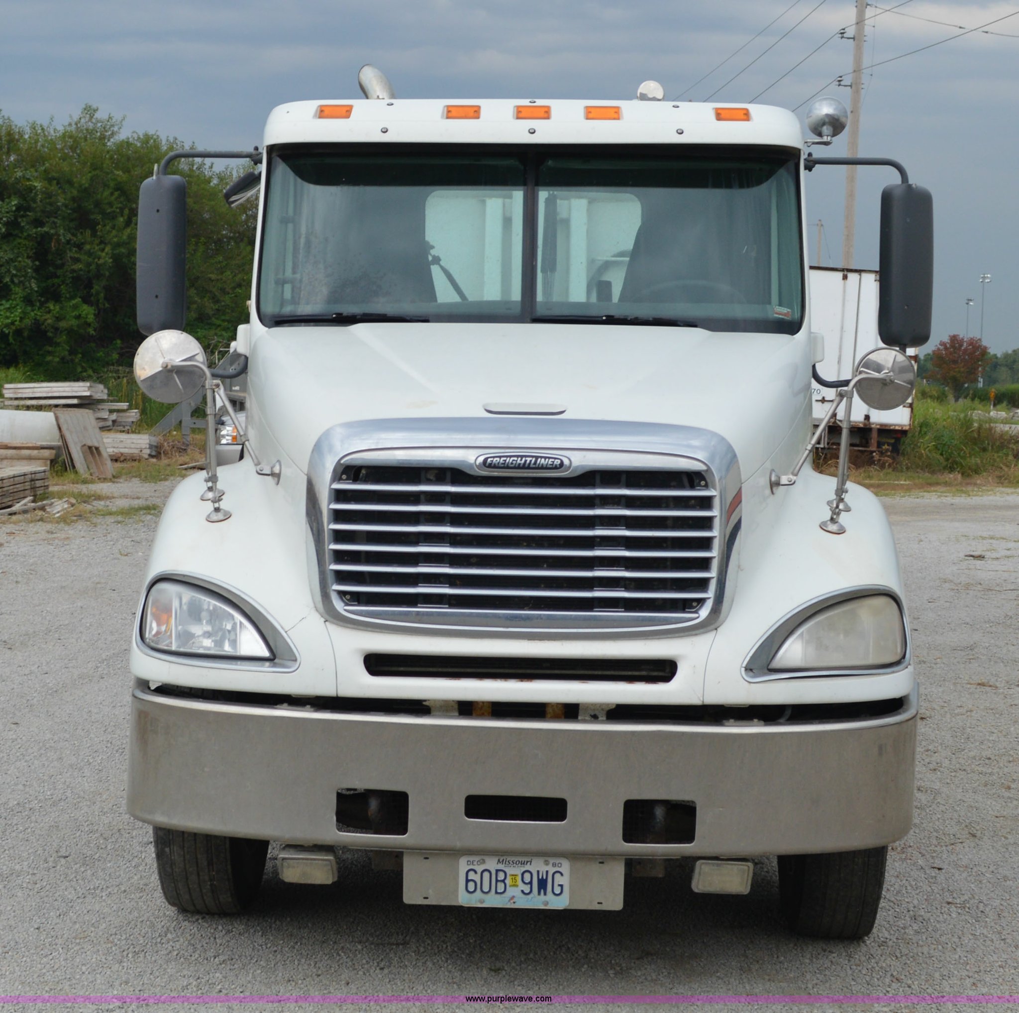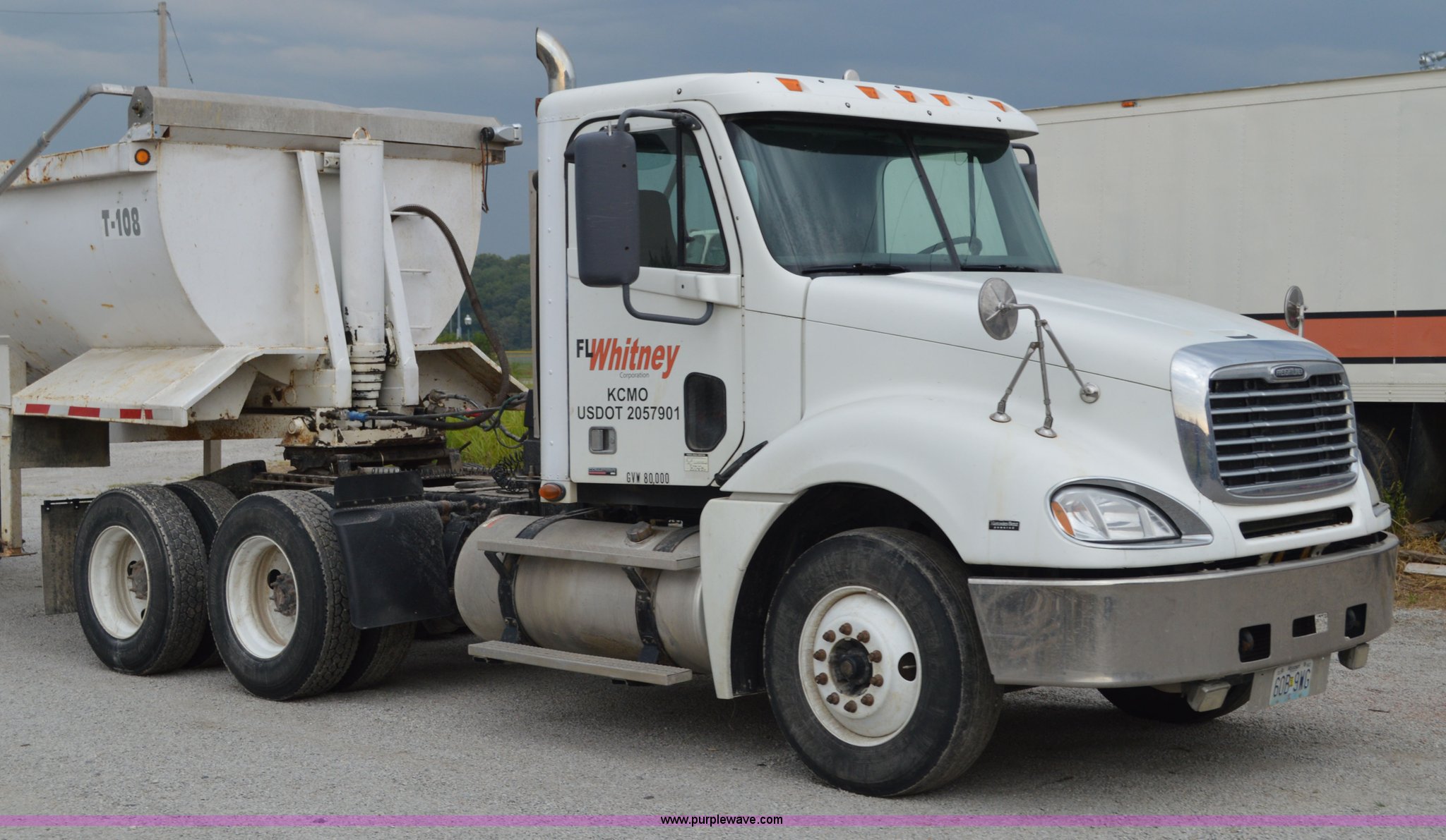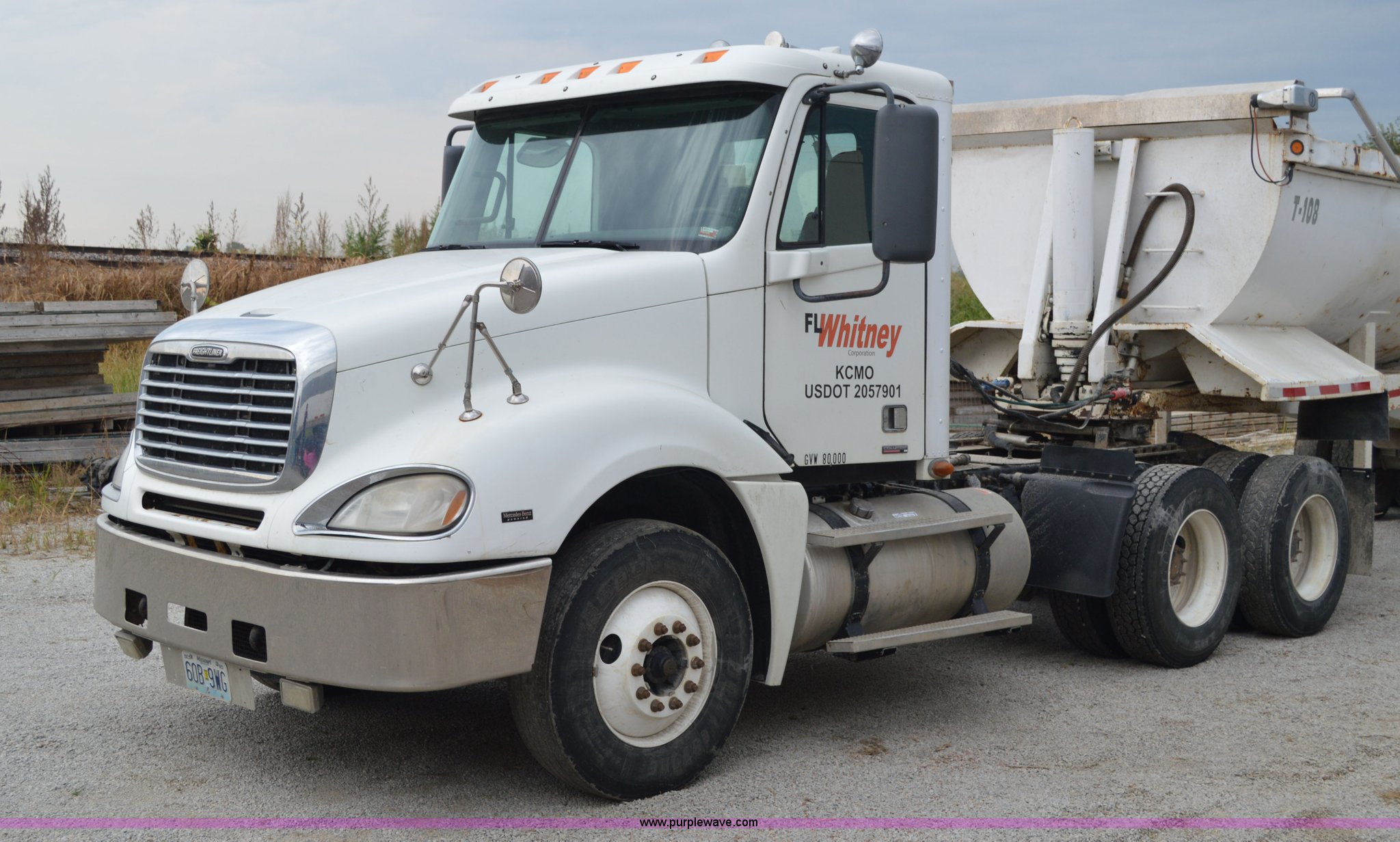 Purple Wave is selling a used Truck Tractor in Missouri. This item is a 2007 Freightliner Columbia semi truck with the following: 536,822 miles on odometer, Mercedes-Benz MBE 400 12.8L L6 diesel engine, AC and heat, AM/FM/CD, Power windows, Air suspension seat, PTO, Wet kit, Exterior visor, Aluminum air operated sliding fifth wheel plate, Single rear exhaust stack, Quarter fenders, Air suspension, Air brakes, 295/75R22.5 tires