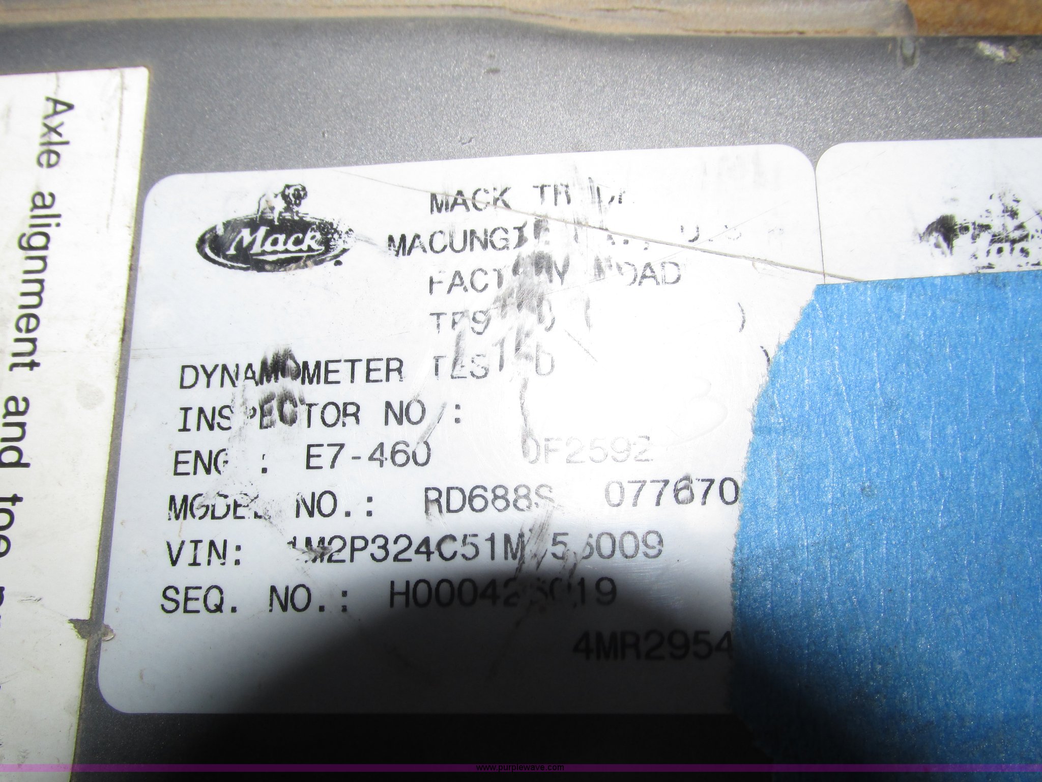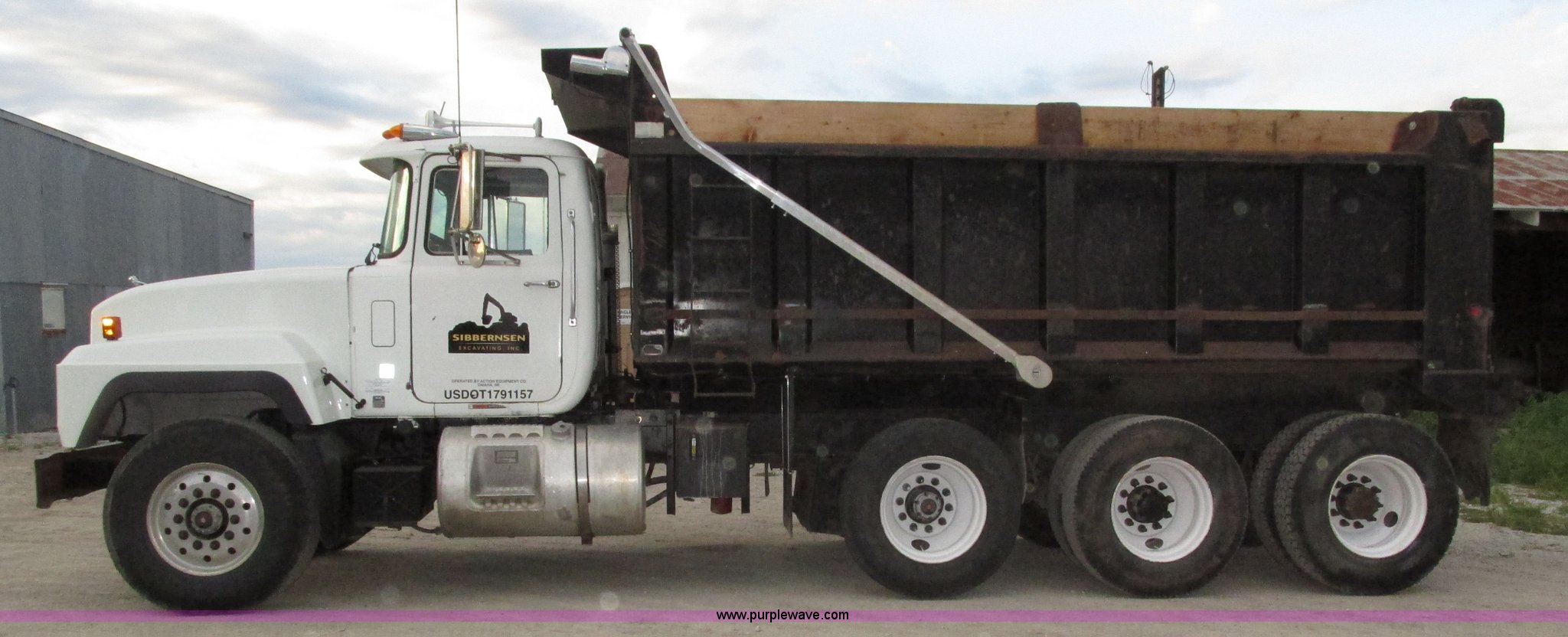 2001 Mack RD688S dump truck. 277,734 miles on odometer, Mack E7 12.0L L6 turbo diesel engine 460 HP, Serial 0F2592, Mack 13 speed manual transmission, Locking power divider, AC and heat, Cruise, Panasonic CQ-CX160U AM/FM/CD/MP3, Heated mirrors, Air suspension seat, Block heater, Muncie PTO, Exterior visor, Bibeau heated steel dump body Model BMT-400, 16'L, 108"H from ground to top side boards, Single ram hoist, Roll-over tarp, Air operated end gate, Bed liner, Dual fuel tanks, Mud flaps, Single rear exhaust stack, Spring suspension, Air brakes, Engine brake, 228" wheelbase, 385/65R22.5 front tires, 295/75R22.5 pusher axle tires, 11R22.5 rear tires, Windshield cracked, CB radio is not included, Replaced in 2015: Dump cylinder, bedliner, LED lights, remack 13sp trans, clutch, air compressor, brakes/hardware, tag axle air bags, aero tarp, pintle hitch, wheel bearings/seals, Unit# 1209. Vehicle has an E-Title in the State of Nebraska. Buyer will receive a paper title within 30 days from verification of funds. 1M2P324C51M056009. Sibbernsen Excavating, Inc.. 25470 Rainwood Road. Valley, NE 68064