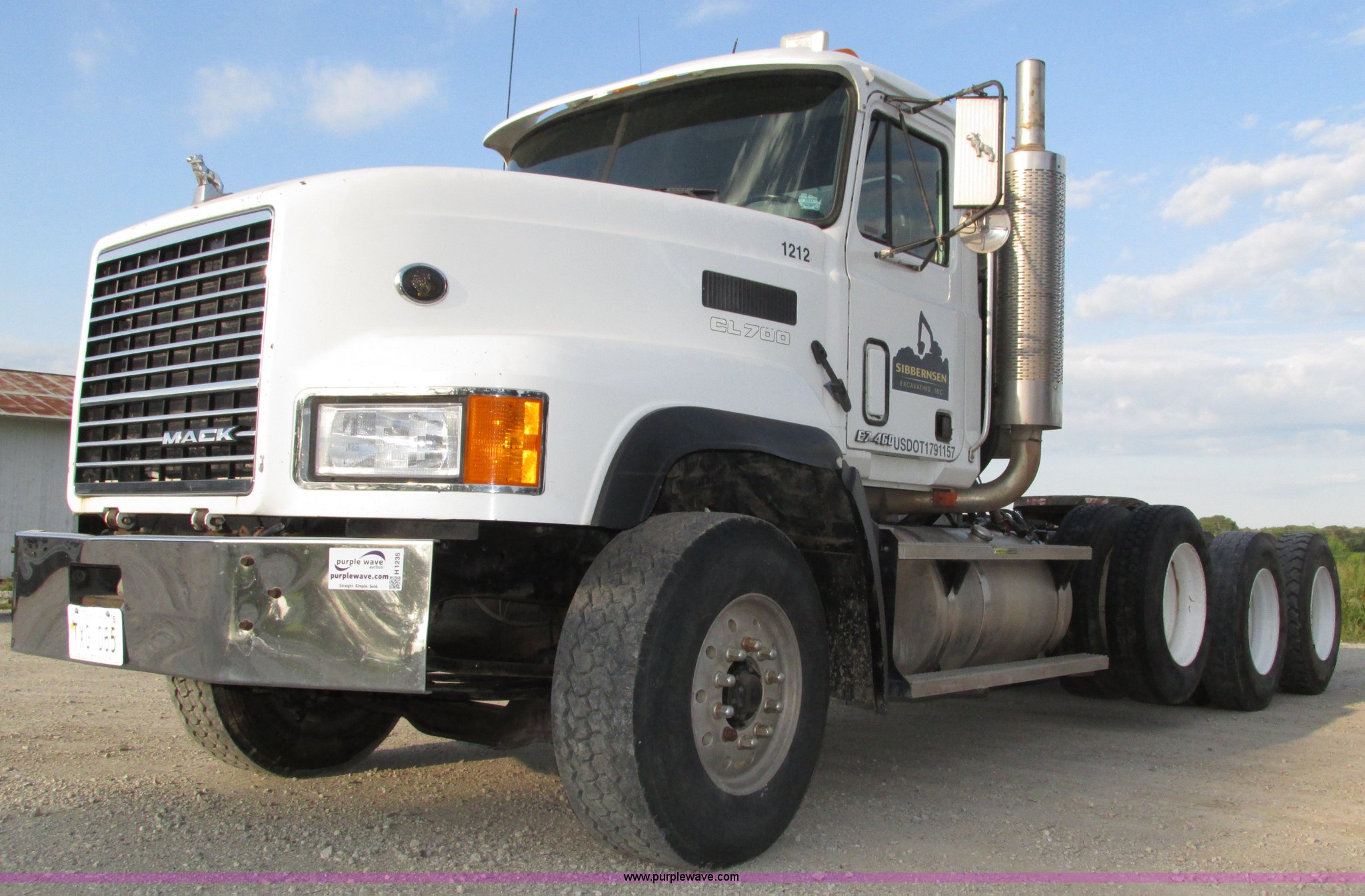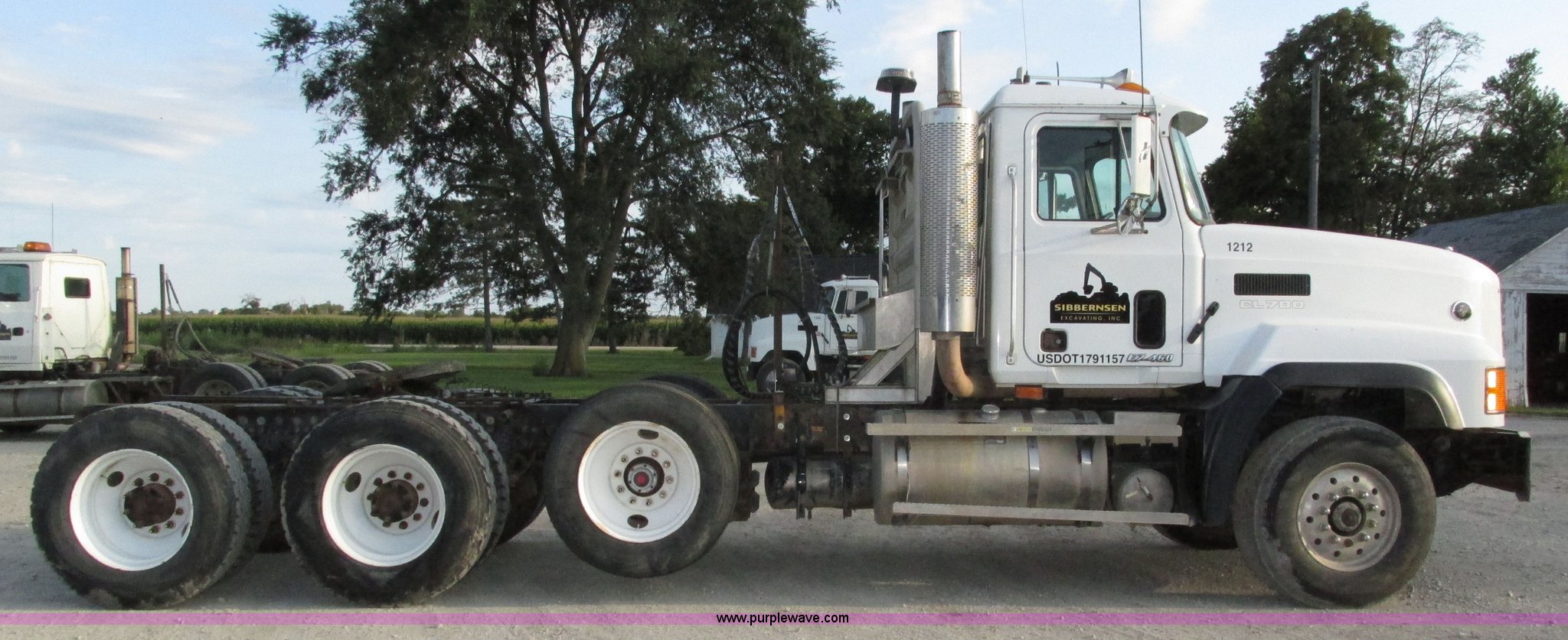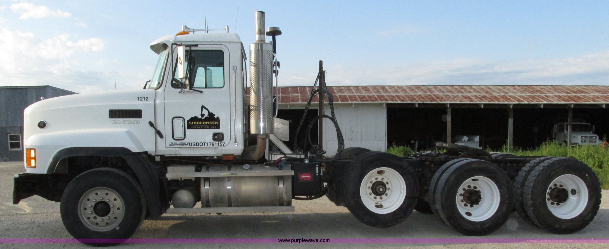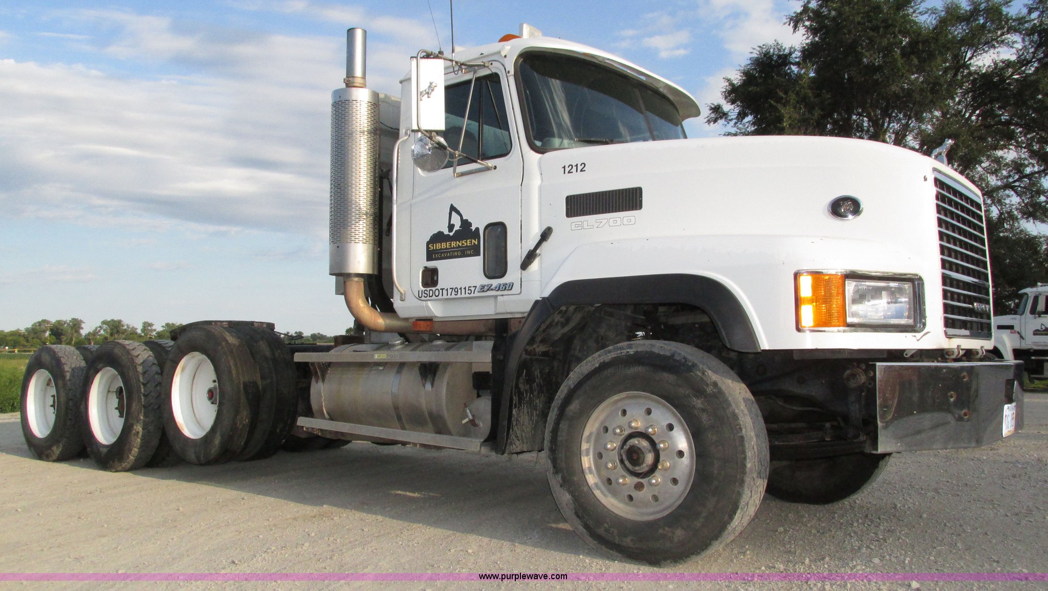 2001 Mack CL713 semi truck. 387,937 miles on odometer, 17,532 hours on meter, Miles and hours may vary, vehicle is still in use, Mack E7 12.0L L6 diesel engine Remanufactured engine installed 2013, Serial BRF3689, Maxitorque T2180 18 speed manual transmission, Locking power divider, AC and heat, Tilt, Cruise, Panasonic 2100B AM/FM/cassette/weatherband, Heated mirrors, Air ride cab, Block heater, Exterior visor, Muncie PTO, Wet kit, Dump valves, Headache rack Window, Chain hanger, Storage, Lights, Air operated sliding fifth wheel plate, Dual rear exhaust stacks, Dual fuel tanks, Watson AC-220110-10 pusher axle Serial 00-10-1-306, Air suspension, Air brakes, Engine brake, Aluminum front wheels, 385/65R22.5 front tires, 285/75R24.5 pusher axle tires, 11R24.5 rear tires, 2013 Remack E7460, Wet kit installed 2015, Interior/exterior cosmetic damage, Broken hi/low trans switch, high side only, Unit# 1212. Vehicle has an E-Title in the State of Nebraska. Buyer will receive a paper title within 30 days from verification of funds. 1M2AD62Y41W011169. Sibbernsen Excavating, Inc.. 25470 Rainwood Road. Valley, NE 68064