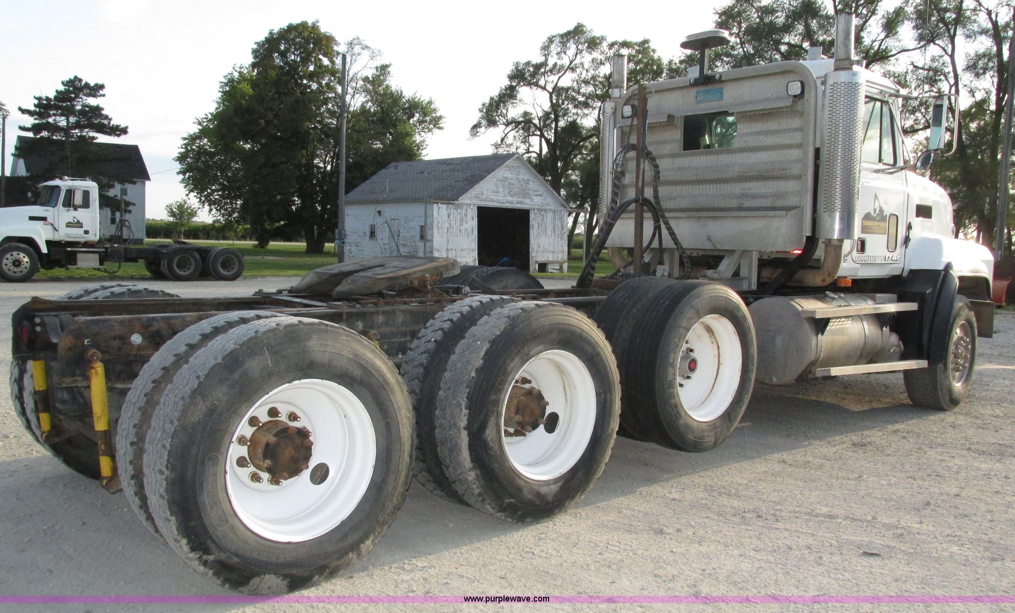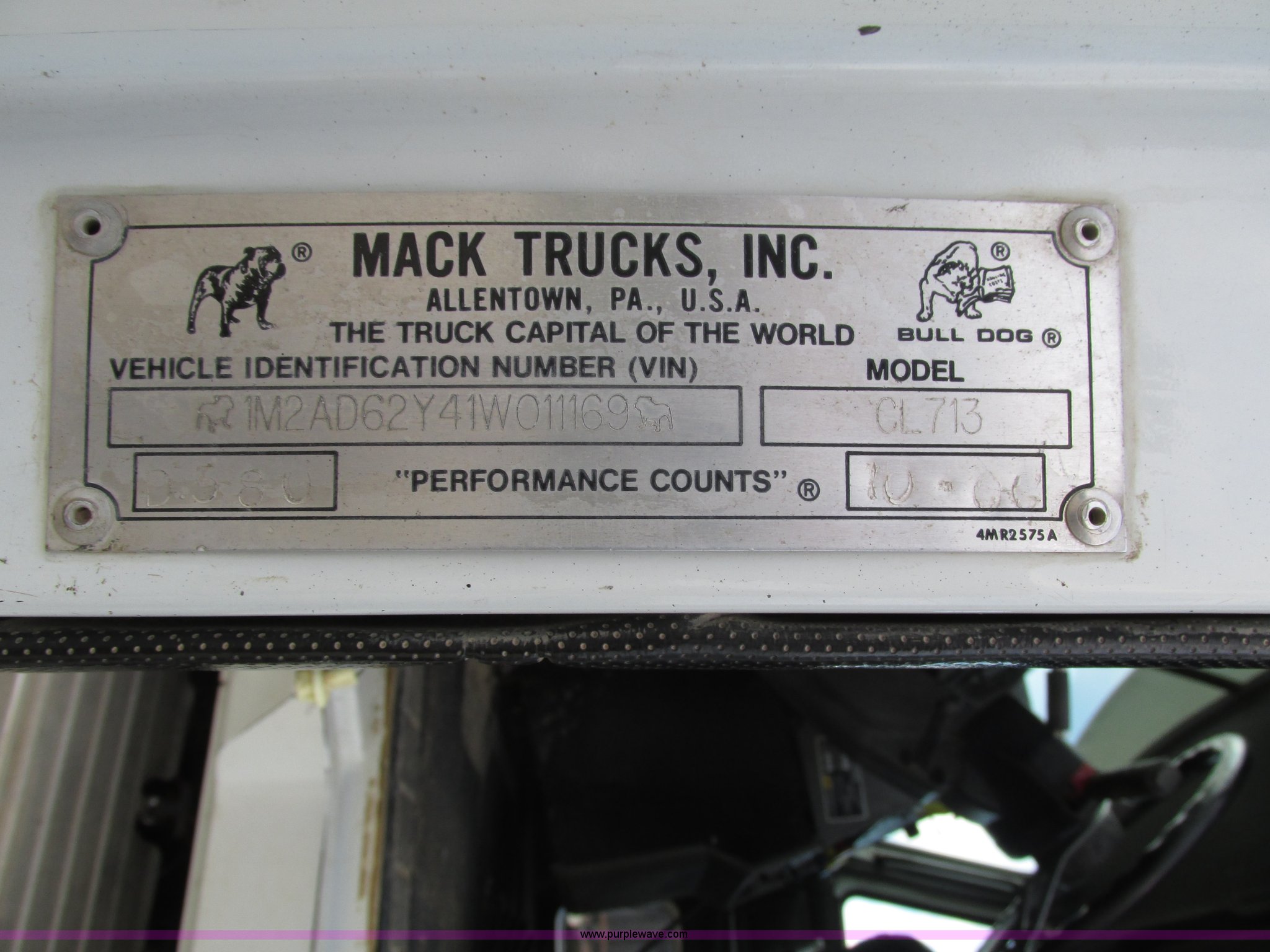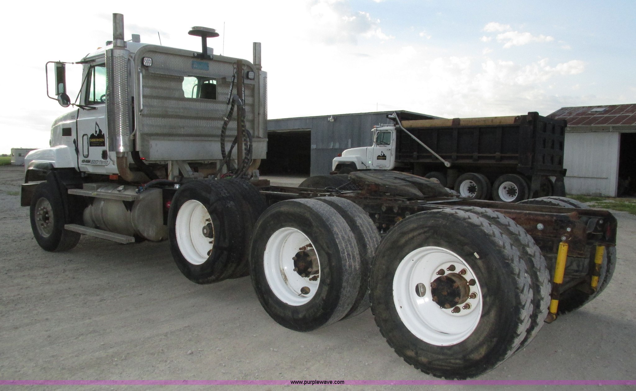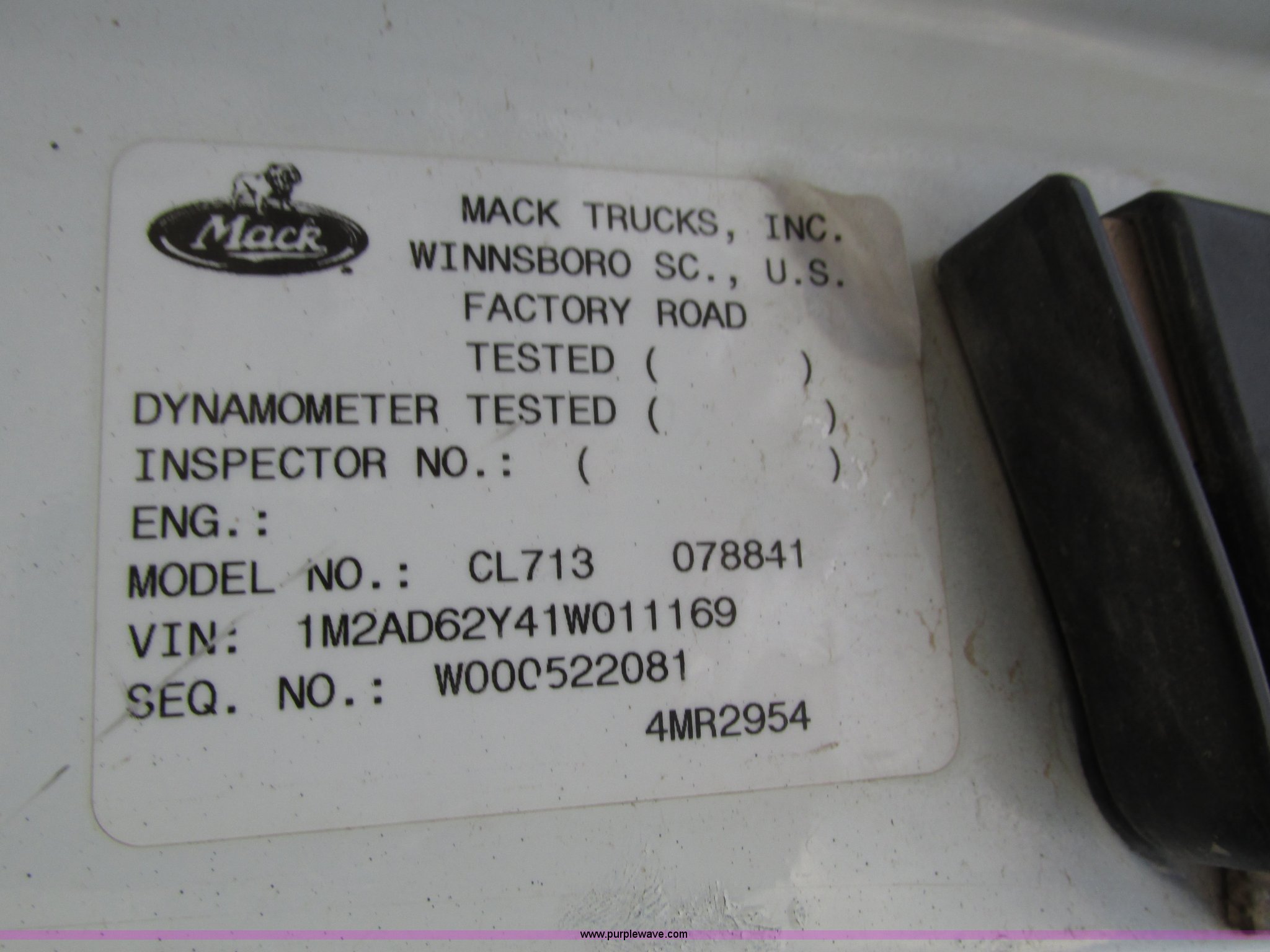 Purple Wave is selling a used Truck Tractor in Nebraska. This item is a 2001 Mack CL713 semi truck with the following: 387,937 miles on odometer, 17,532 hours on meter, Miles and hours may vary, vehicle is still in use, Mack E7 12.0L L6 diesel engine, Remanufactured engine installed 2013, Serial BRF3689, Maxitorque T2180 18 speed manual transmission, Locking power divider, AC and heat, Tilt, Cruise, Panasonic 2100B AM/FM/cassette/weatherband, Heated mirrors, Air ride cab, Block heater, Exterior visor, Muncie PTO, Wet kit, Dump valves, Headache rack, Window, Chain hanger, Storage, Lights, Air operated sliding fifth wheel plate, Dual rear exhaust stacks, Dual fuel tanks, Watson AC-220110-10 pusher axle, Serial 00-10-1-306, Air suspension, Air brakes, Engine brake, Aluminum front wheels, 385/65R22.5 front tires, 285/75R24.5 pusher axle tires, 11R24.5 rear tires, 2013 Remack E7460, Wet kit installed 2015, Interior/exterior cosmetic damage, Broken hi/low trans switch, high side only, Unit# 1212