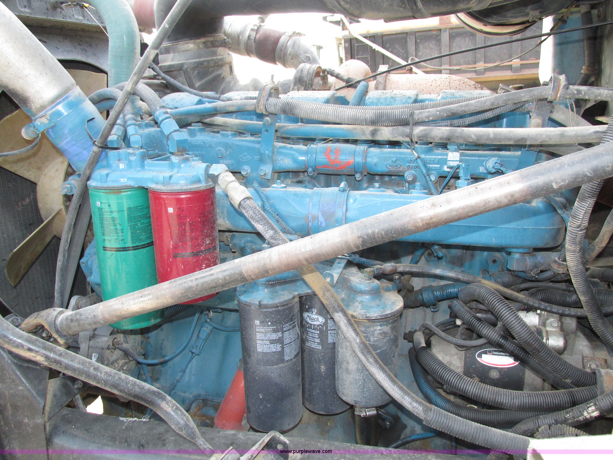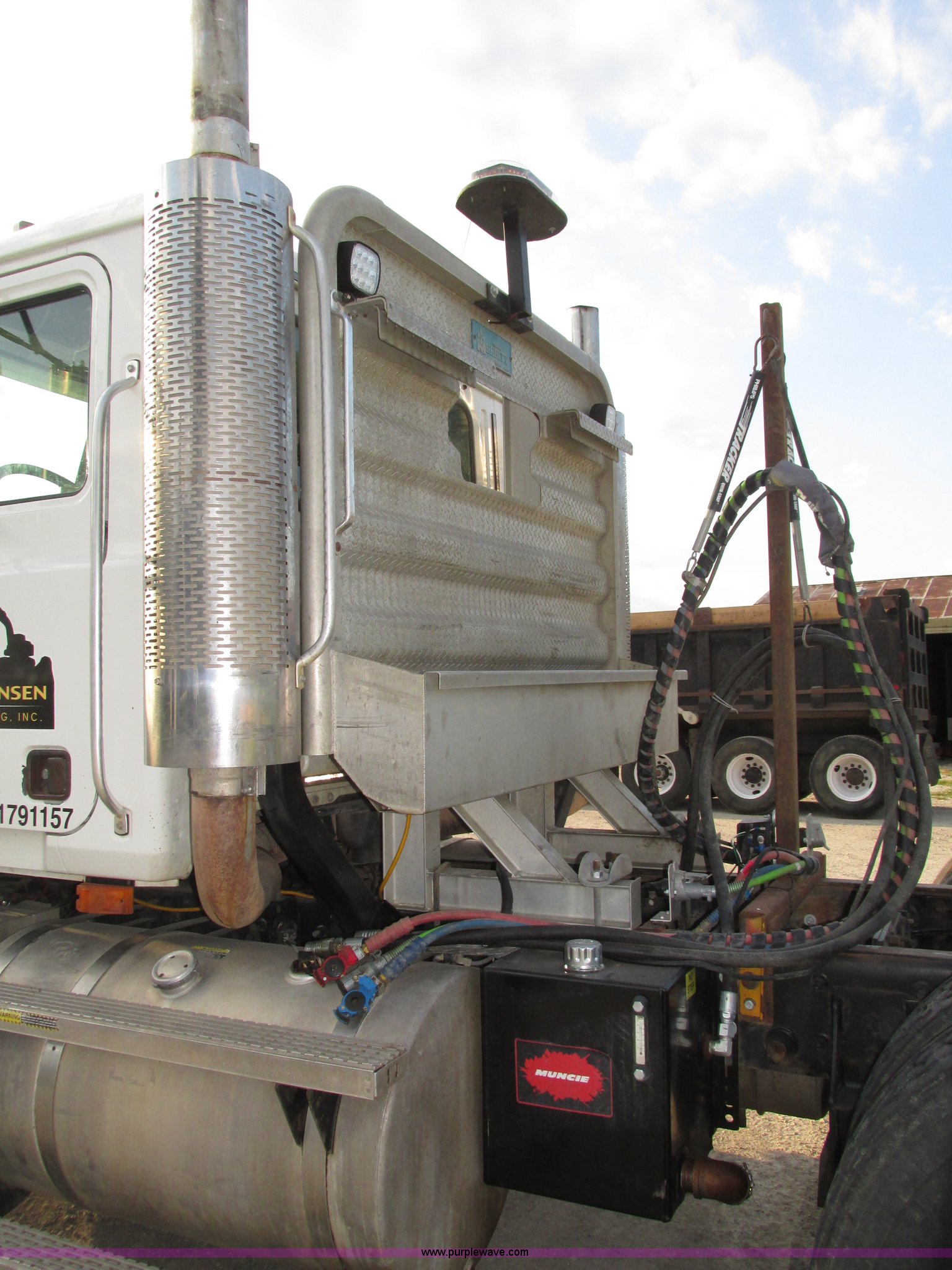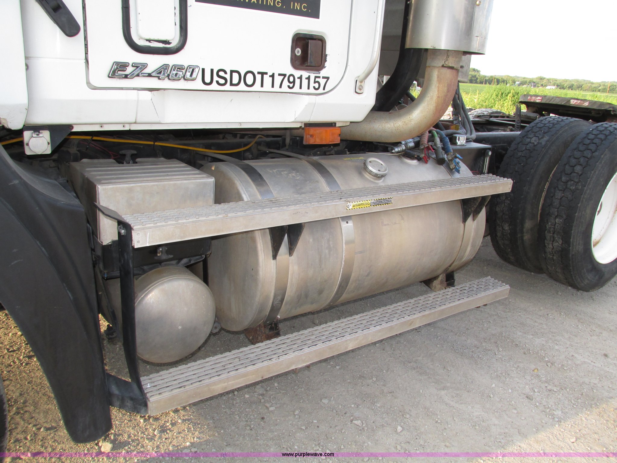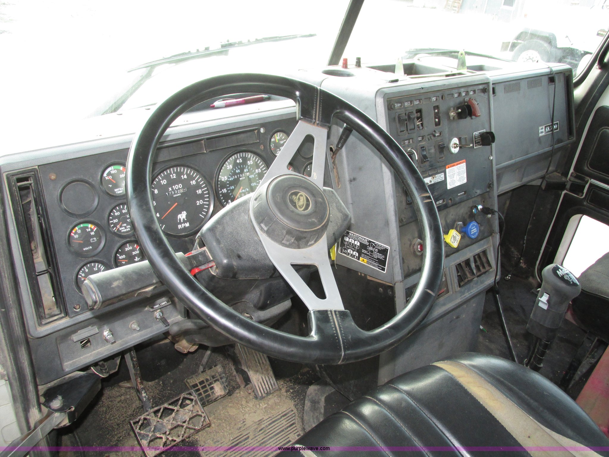 Purple Wave is selling a used Truck Tractor in Nebraska. This item is a 2001 Mack CL713 semi truck with the following: 387,937 miles on odometer, 17,532 hours on meter, Miles and hours may vary, vehicle is still in use, Mack E7 12.0L L6 diesel engine, Remanufactured engine installed 2013, Serial BRF3689, Maxitorque T2180 18 speed manual transmission, Locking power divider, AC and heat, Tilt, Cruise, Panasonic 2100B AM/FM/cassette/weatherband, Heated mirrors, Air ride cab, Block heater, Exterior visor, Muncie PTO, Wet kit, Dump valves, Headache rack, Window, Chain hanger, Storage, Lights, Air operated sliding fifth wheel plate, Dual rear exhaust stacks, Dual fuel tanks, Watson AC-220110-10 pusher axle, Serial 00-10-1-306, Air suspension, Air brakes, Engine brake, Aluminum front wheels, 385/65R22.5 front tires, 285/75R24.5 pusher axle tires, 11R24.5 rear tires, 2013 Remack E7460, Wet kit installed 2015, Interior/exterior cosmetic damage, Broken hi/low trans switch, high side only, Unit# 1212
