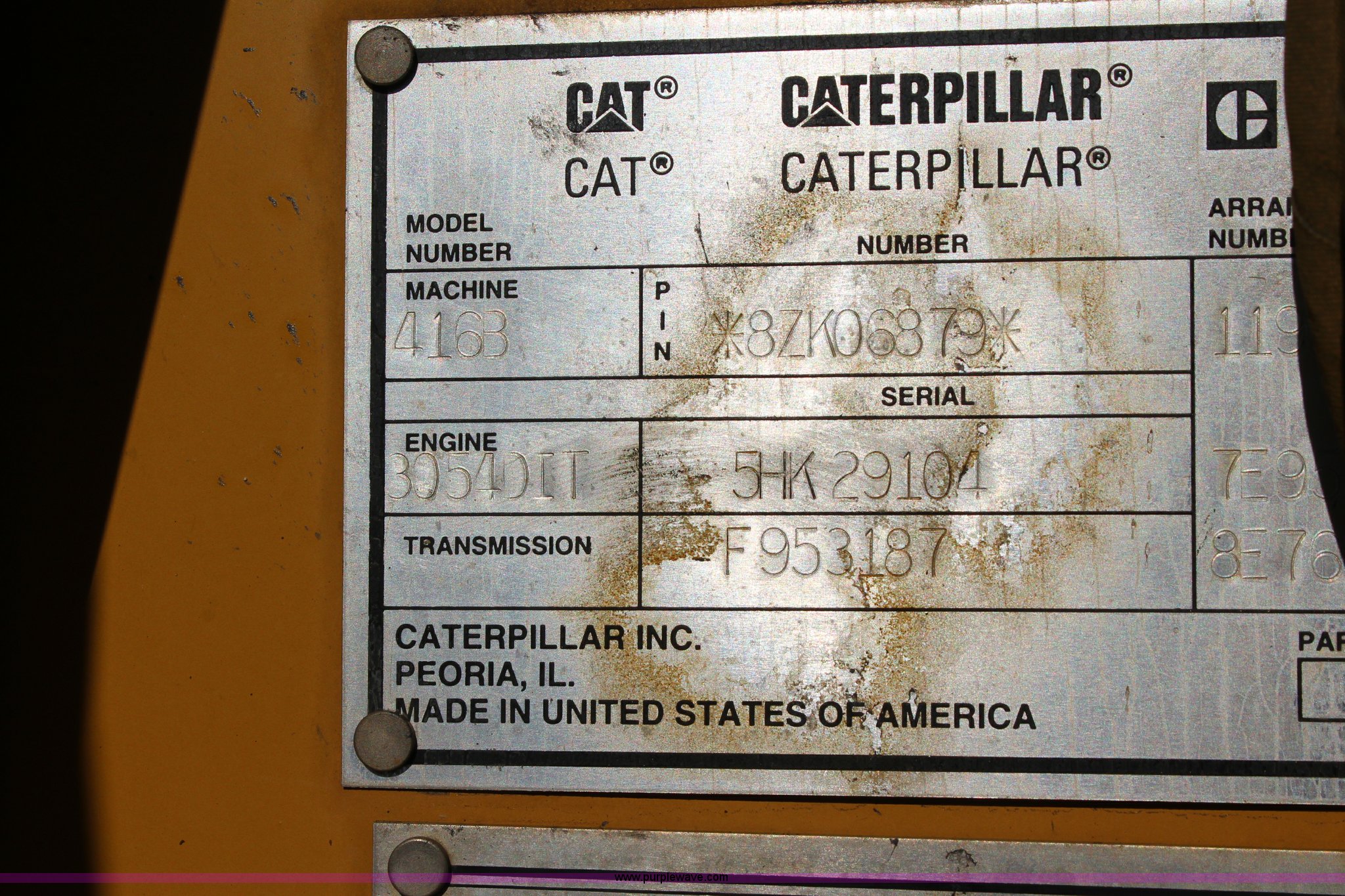 1999 Caterpillar 416B backhoe. 1,572 hours on meter, Caterpillar 3054DIT four cylinder diesel engine 74 HP, Serial 5HK06879, Shuttle shift transmission 4F-4R gears, Four wheel drive, EROPS, AC and heat, Suspension seat, Wobble stick backhoe controls, Front and rear work lights, 90"W loader bucket, E-stick, 36"W backhoe bucket Weld-on cutting edge, (6) teeth, Manual quick coupler, Front counter weights, 12.5/80-18 front tires, 19.5-24 rear tires, 13,700 lbs. base operating weight, Serial 8ZK06879. View equipment video. Paola, KS 66071