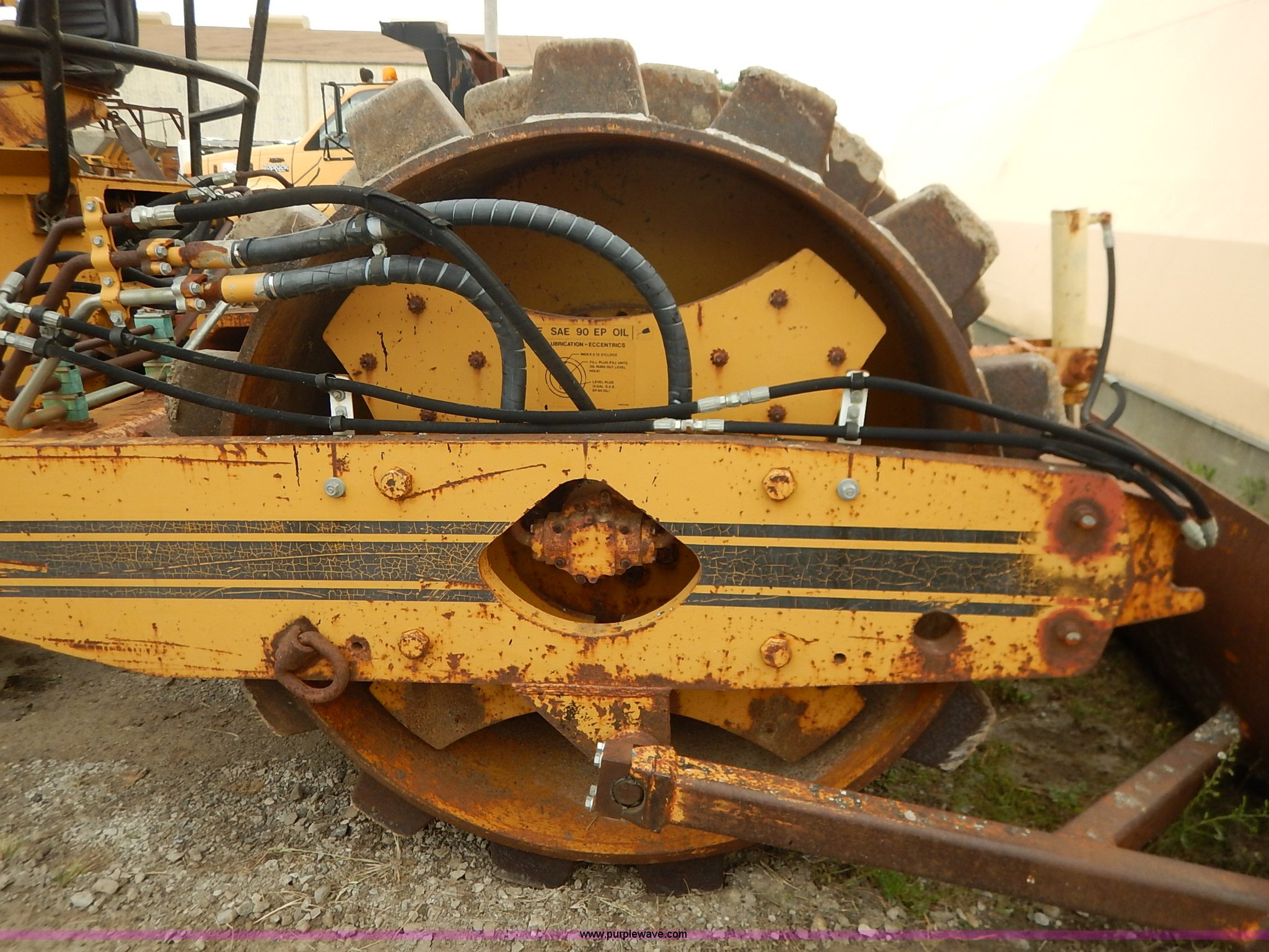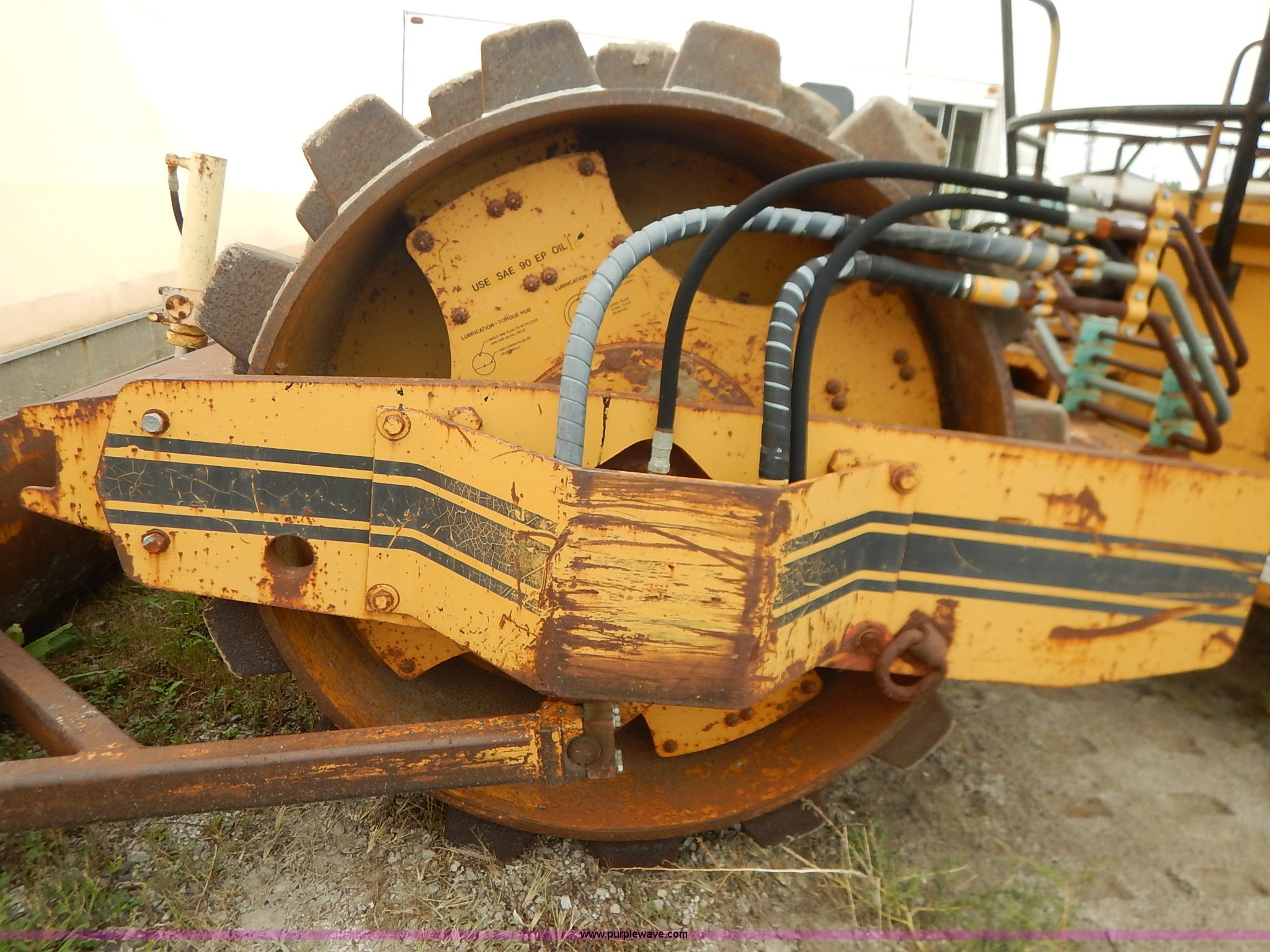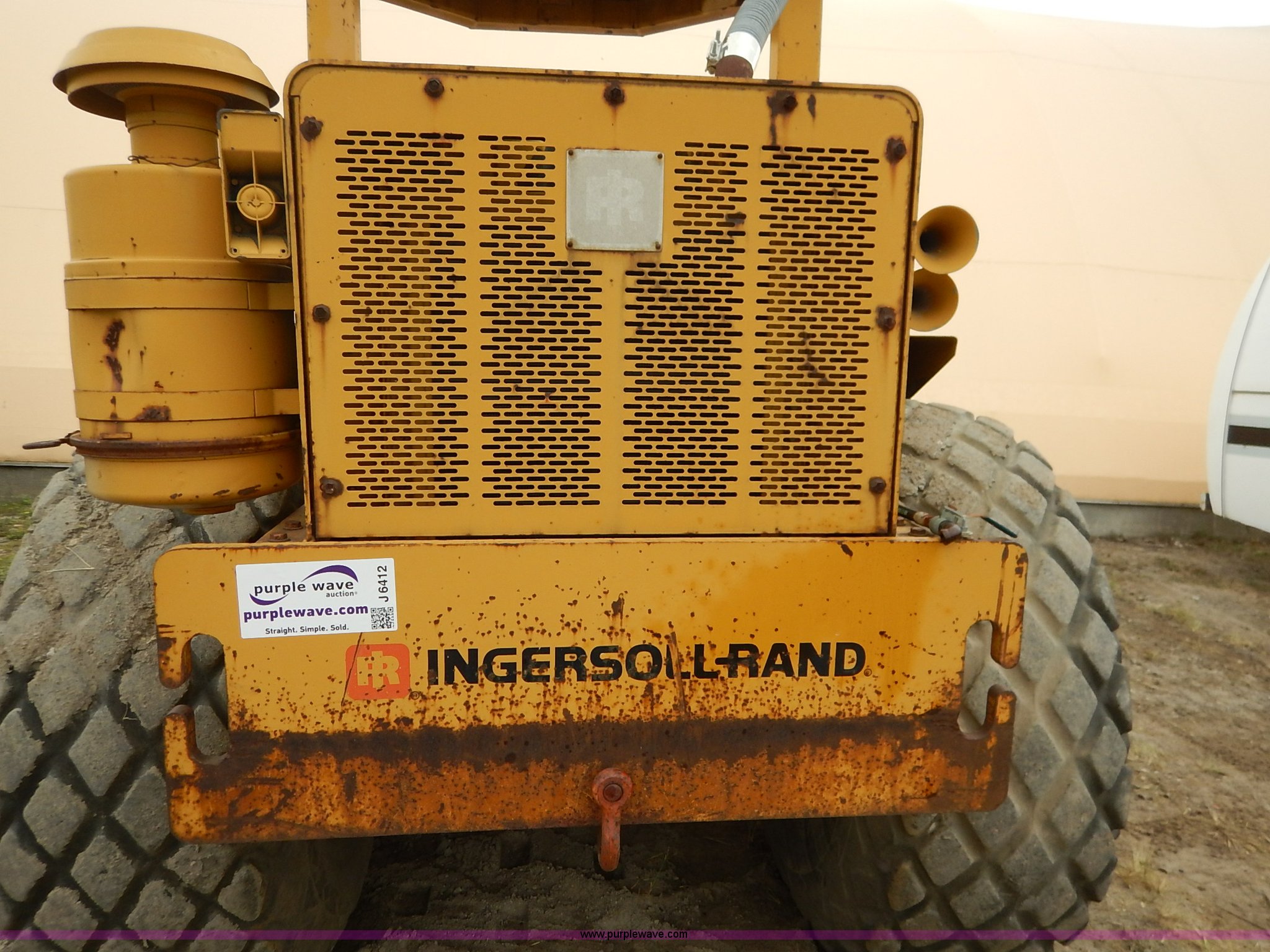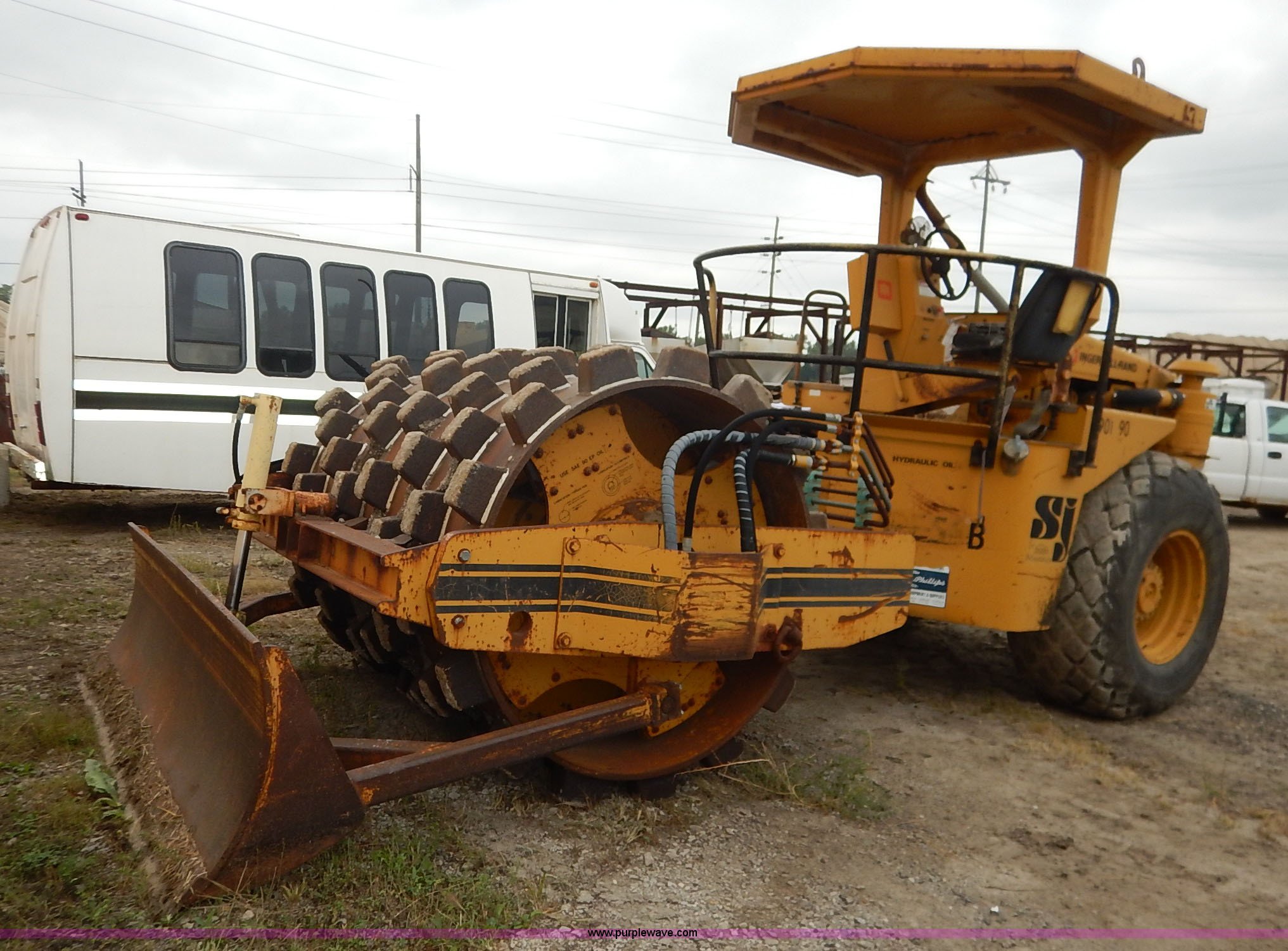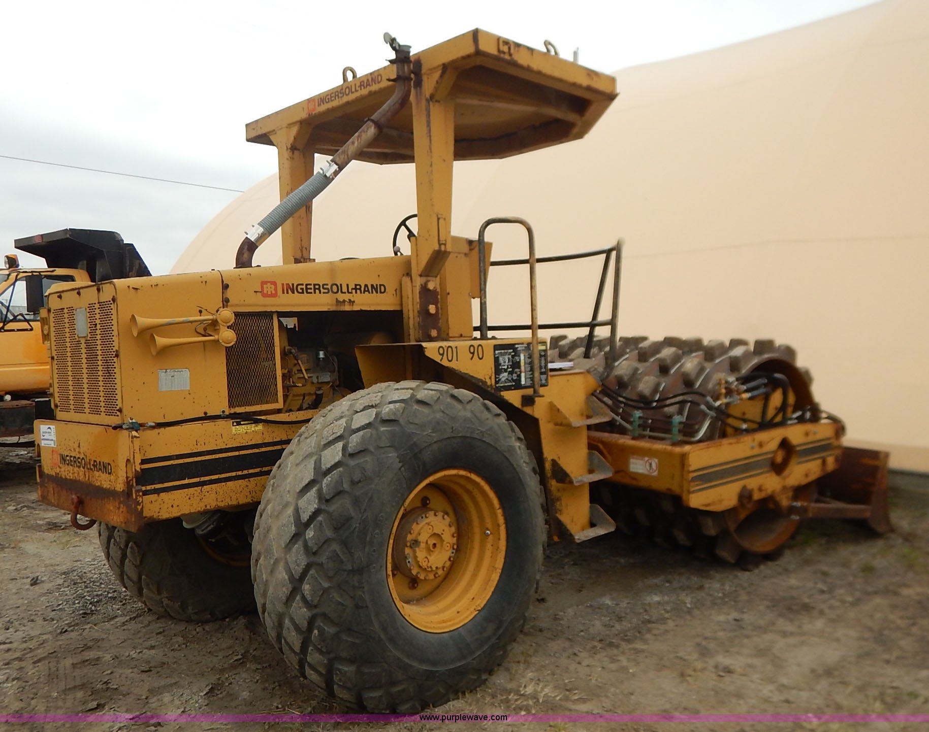 Purple Wave is selling a used Single Drum Roller Compactor in Missouri. This item is a 1985 Ingersoll Rand SPF-56B articulated single drum vibratory compactor with the following: Caterpillar 3204DI four cylinder turbo diesel engine, Serial PC00390, ROPS, Serial 20398, Vinyl seat, 85"W x 53" diameter pad foot drum, 102" front blade, Weld-on cutting edge, Travel hitch, Air horns, Air brakes, Goodyear 23.1-26 tires, 25,450 lbs. base operating weight, Serial 7376-S