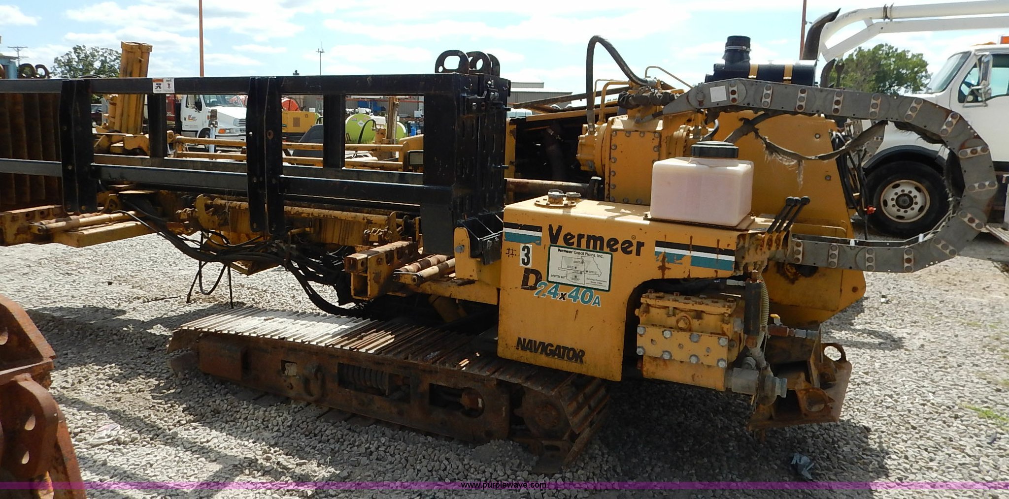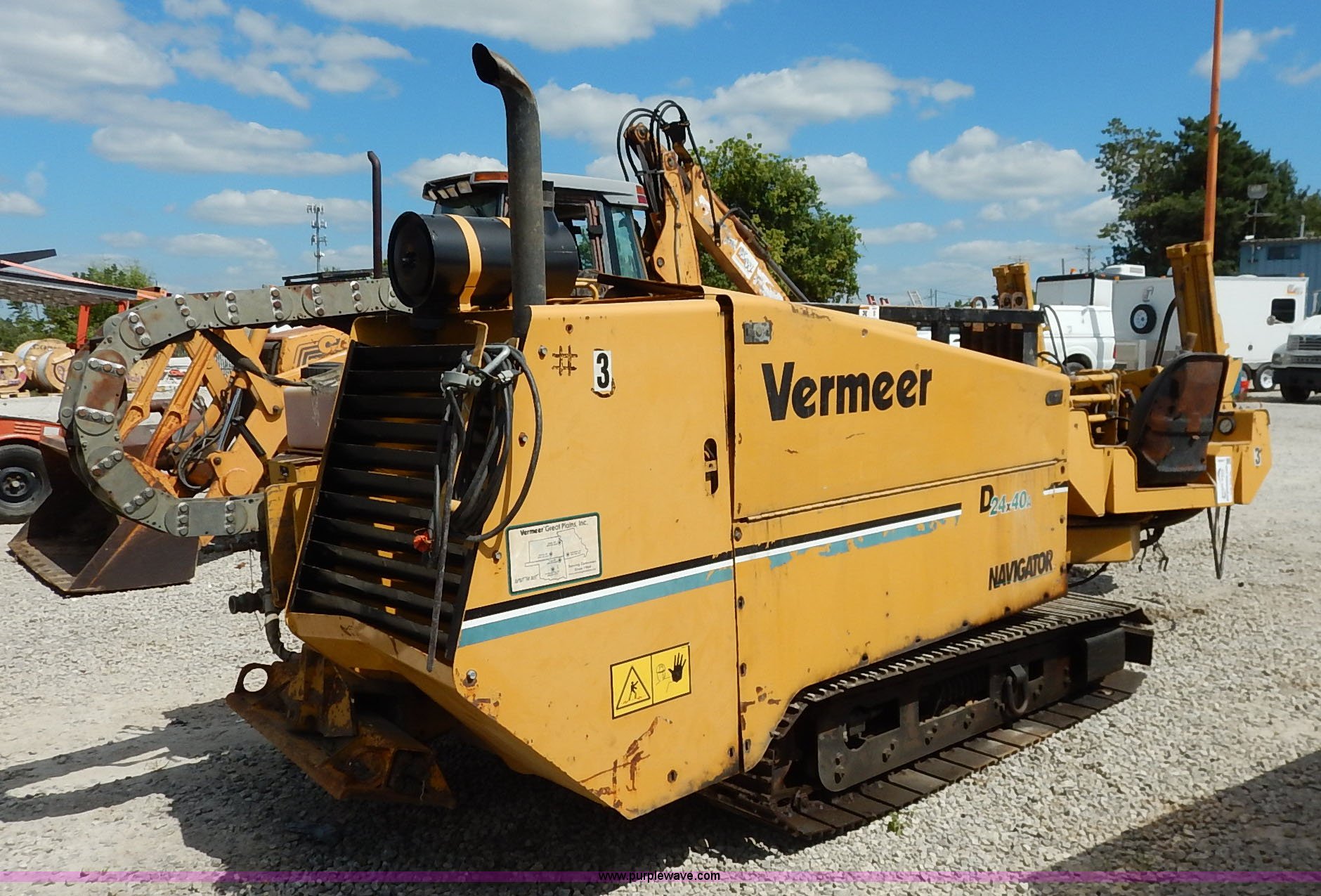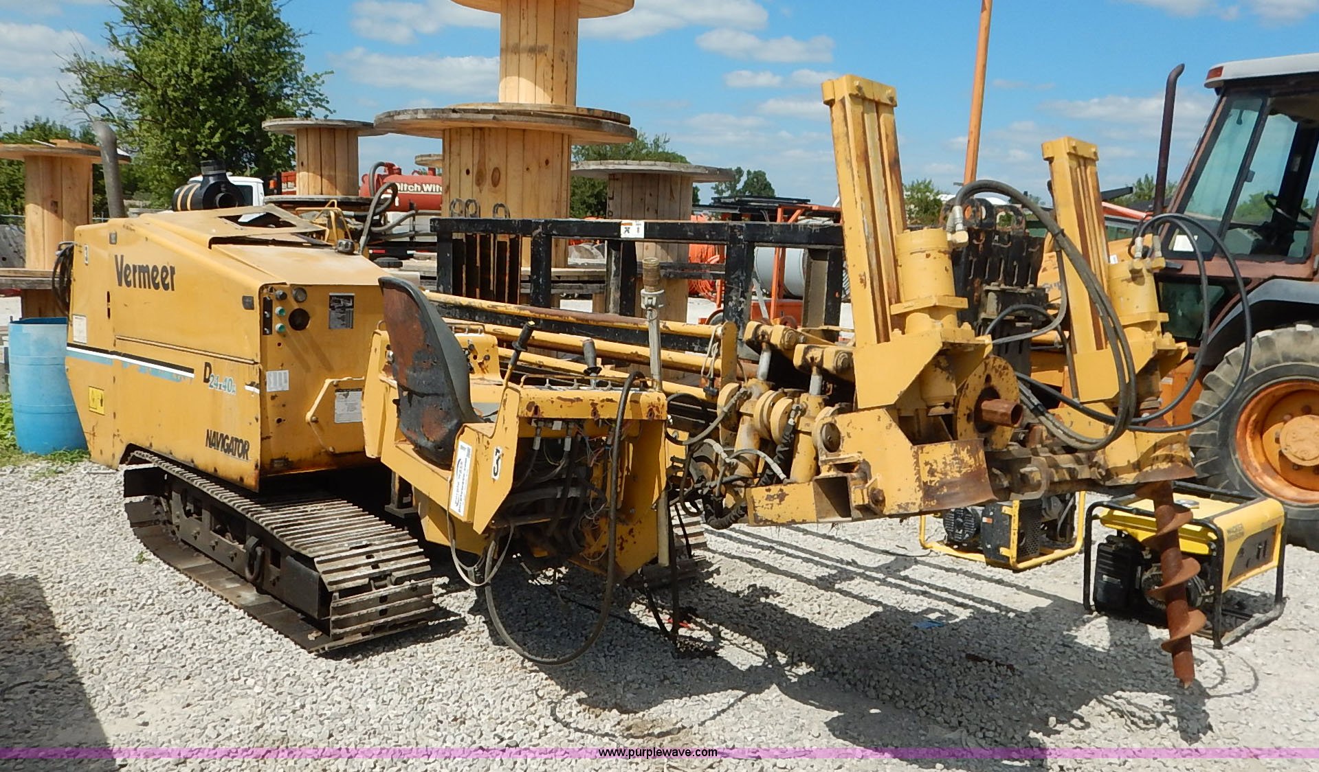 Purple Wave is selling a used Directional Boring Unit in Kansas. This item is a 1999 Vermeer D24X40A Navigator directional drill with the following: Cummins four cylinder diesel engine, Non-operational engine, Vinyl seat, Rear stabilizer, 16"W steel triple grouser track pads, Rod rack, 10' rod, 7" auger bit, Serial 1VRS160Z0X1001127, Unit# 3