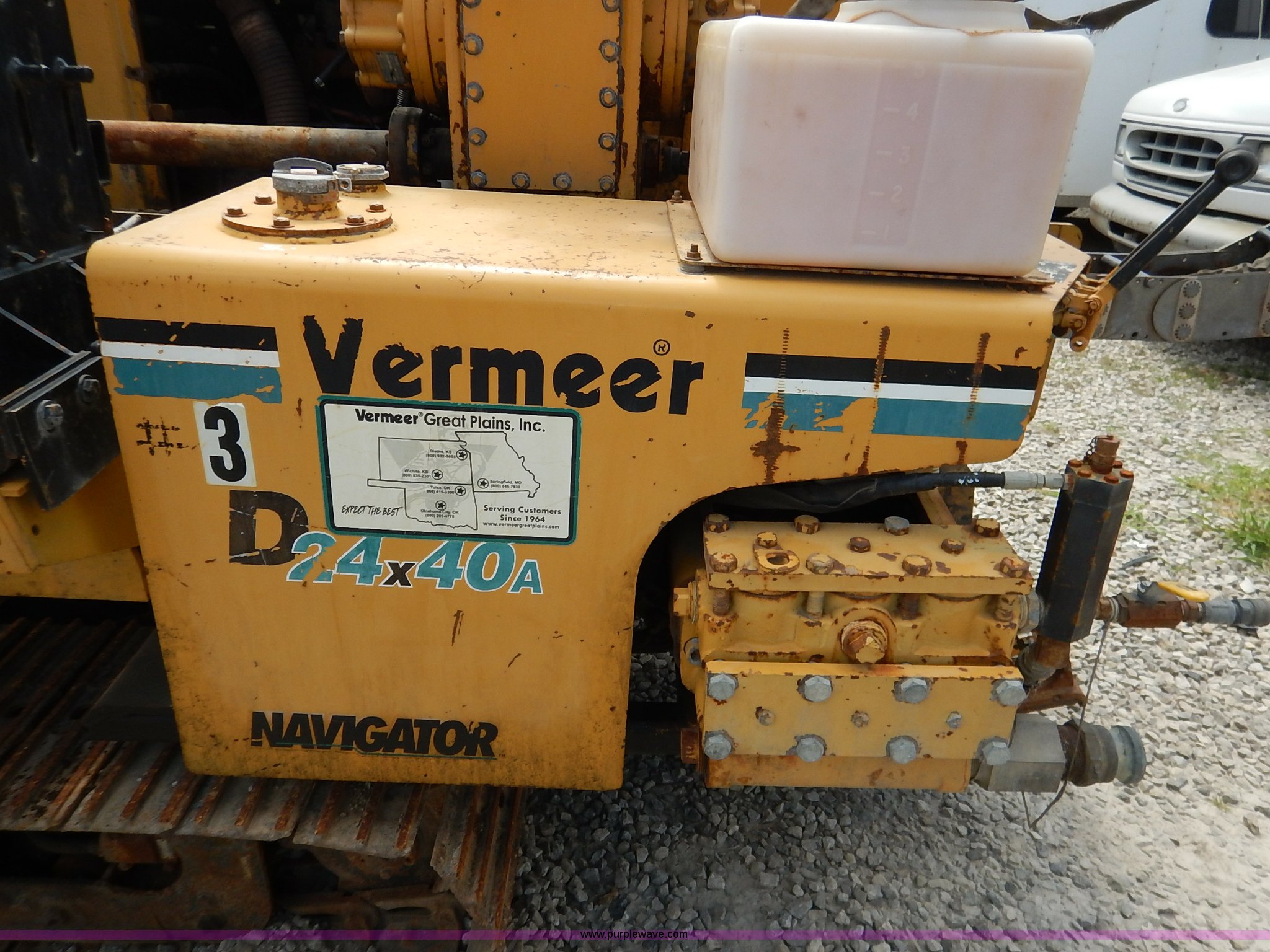 1999 Vermeer D24X40A Navigator directional drill. Cummins four cylinder diesel engine Non-operational engine, Vinyl seat, Rear stabilizer, 16"W steel triple grouser track pads, Rod rack, 10' rod, 7" auger bit, Serial 1VRS160Z0X1001127, Unit# 3. K&W Underground. 15608 S. Keeler Terrace. Olathe, KS 66062