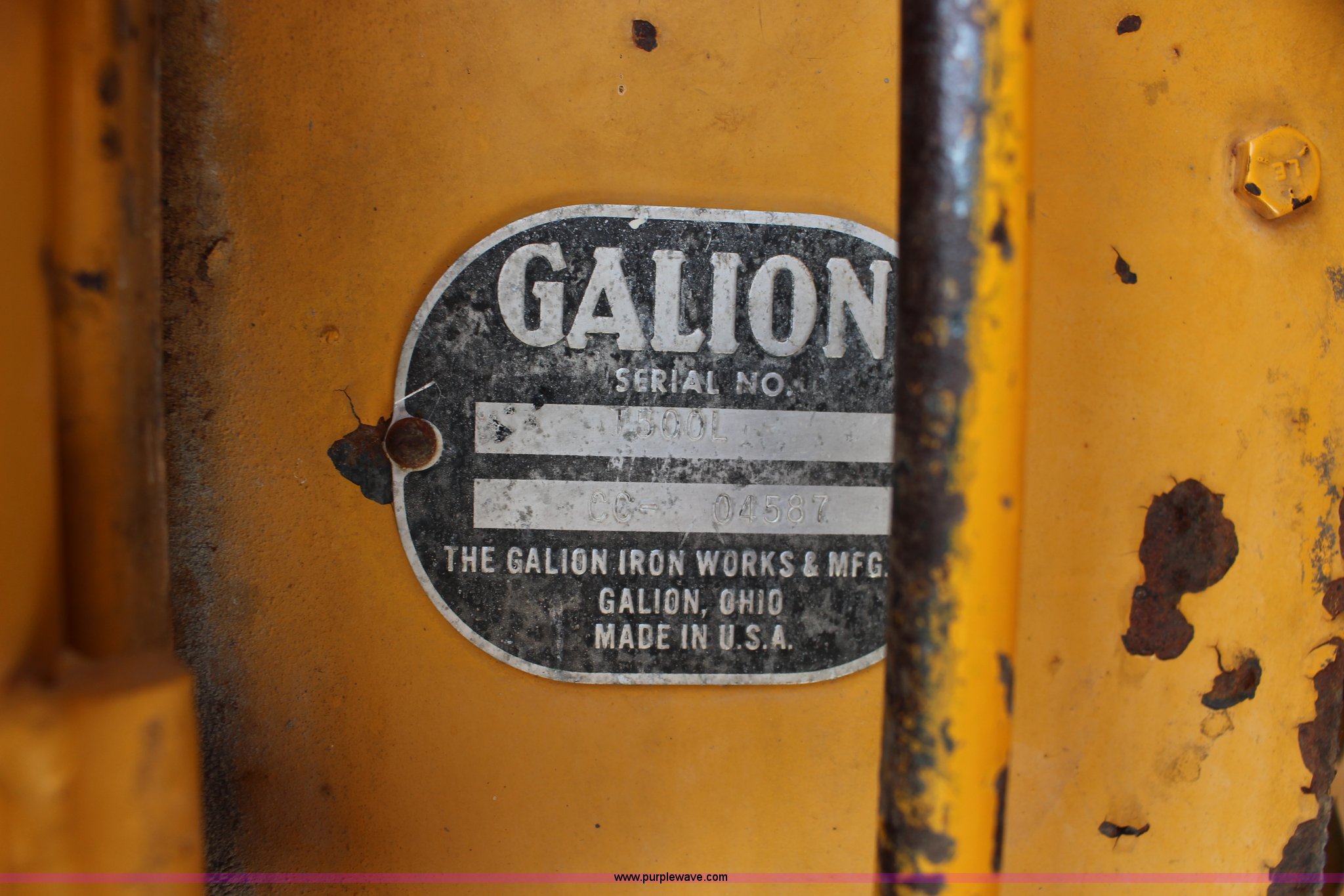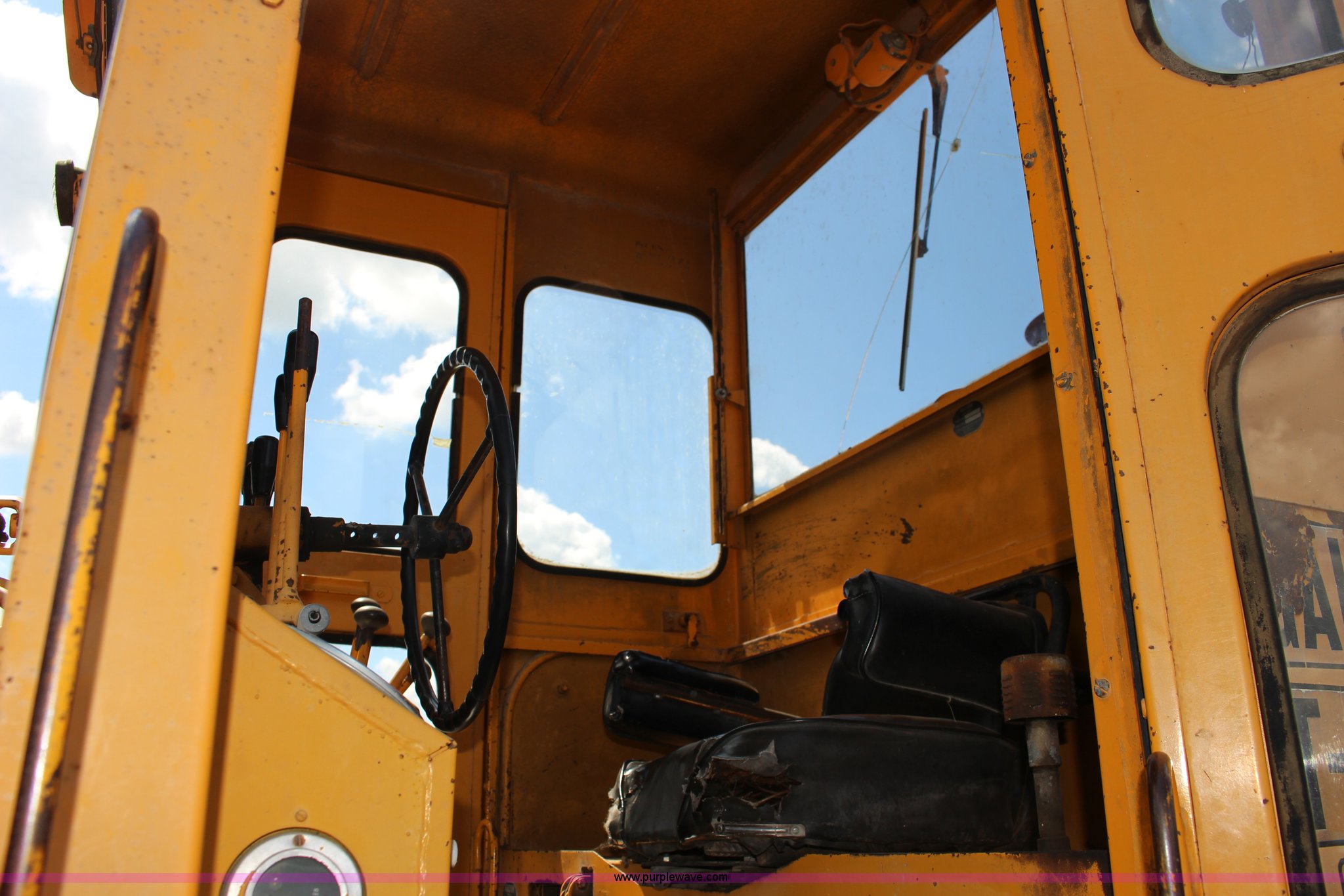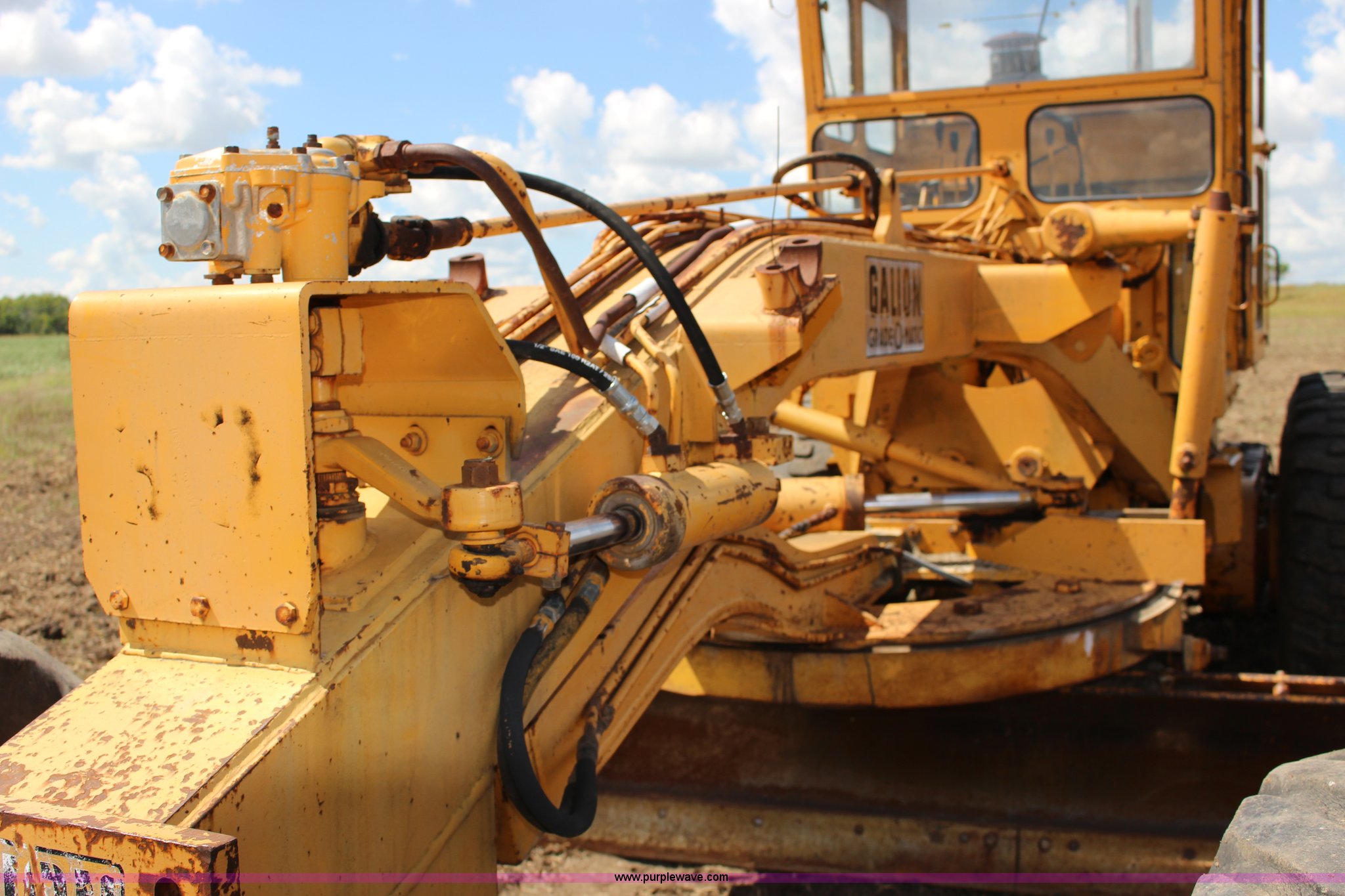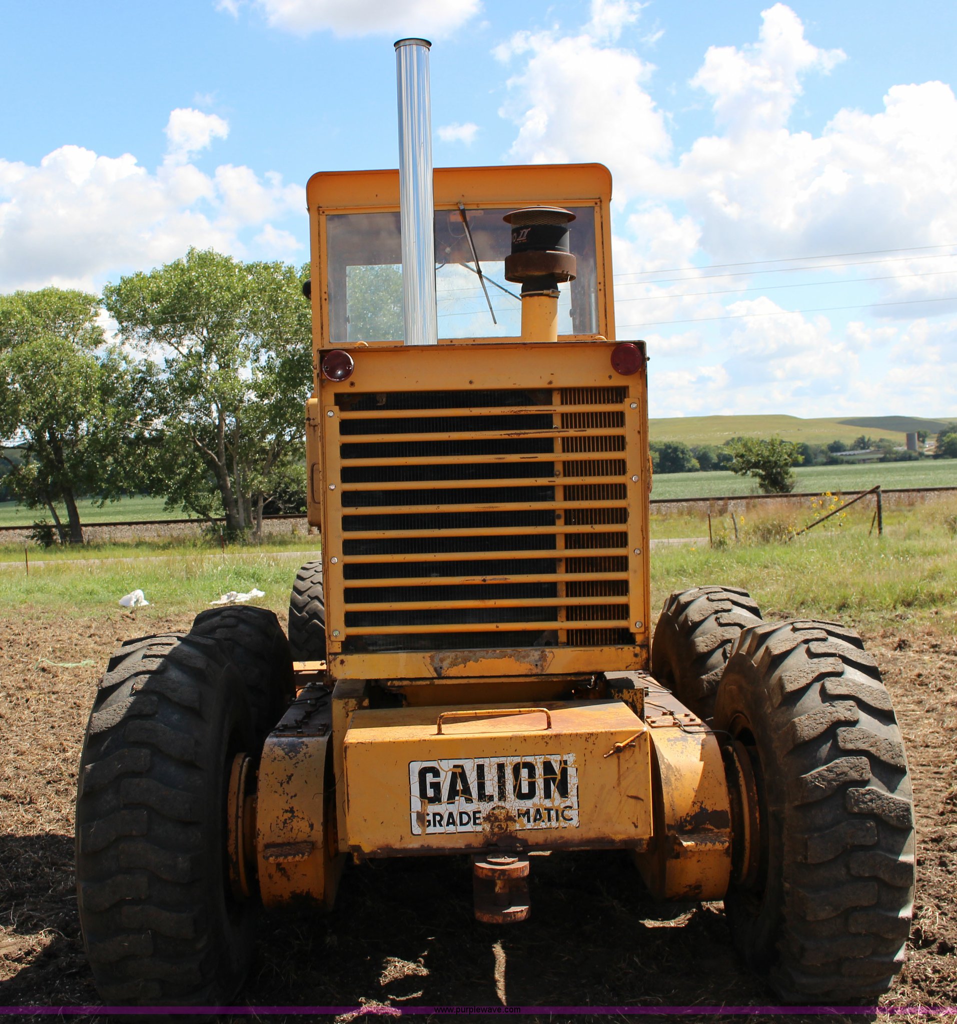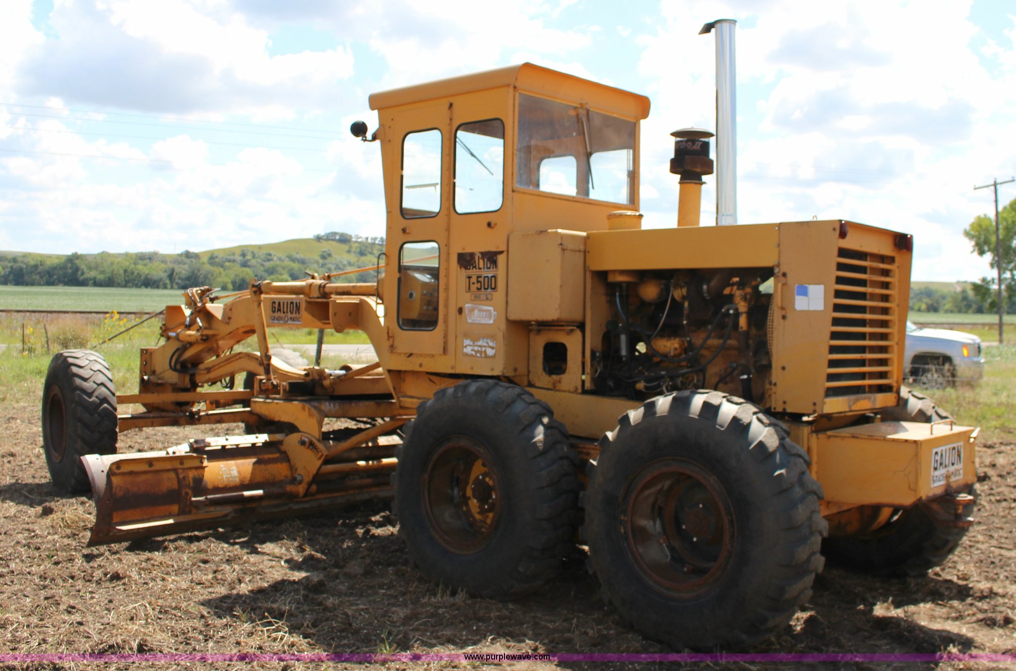 Purple Wave is selling a used Motor Grader in Kansas. This item is a Galion T500 L Series motor grader with the following: 6,596 hours on meter, Cummins six cylinder diesel engine, Powershift transmission, 4F-4R gears, 14' moldboard, Side shift, Front wheel tilt, 14.00-24TG tires, Recent brake work, Recently serviced, Fluid and filter changed, Serial CC04587