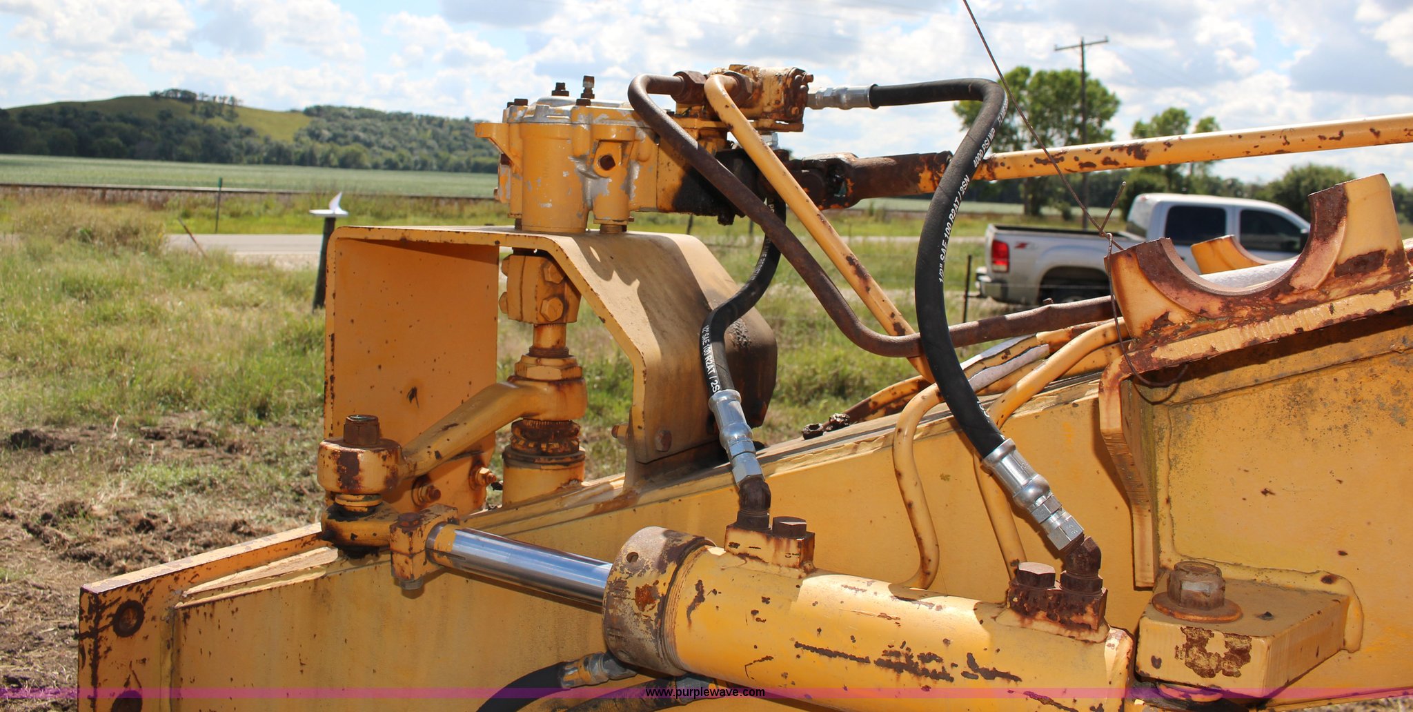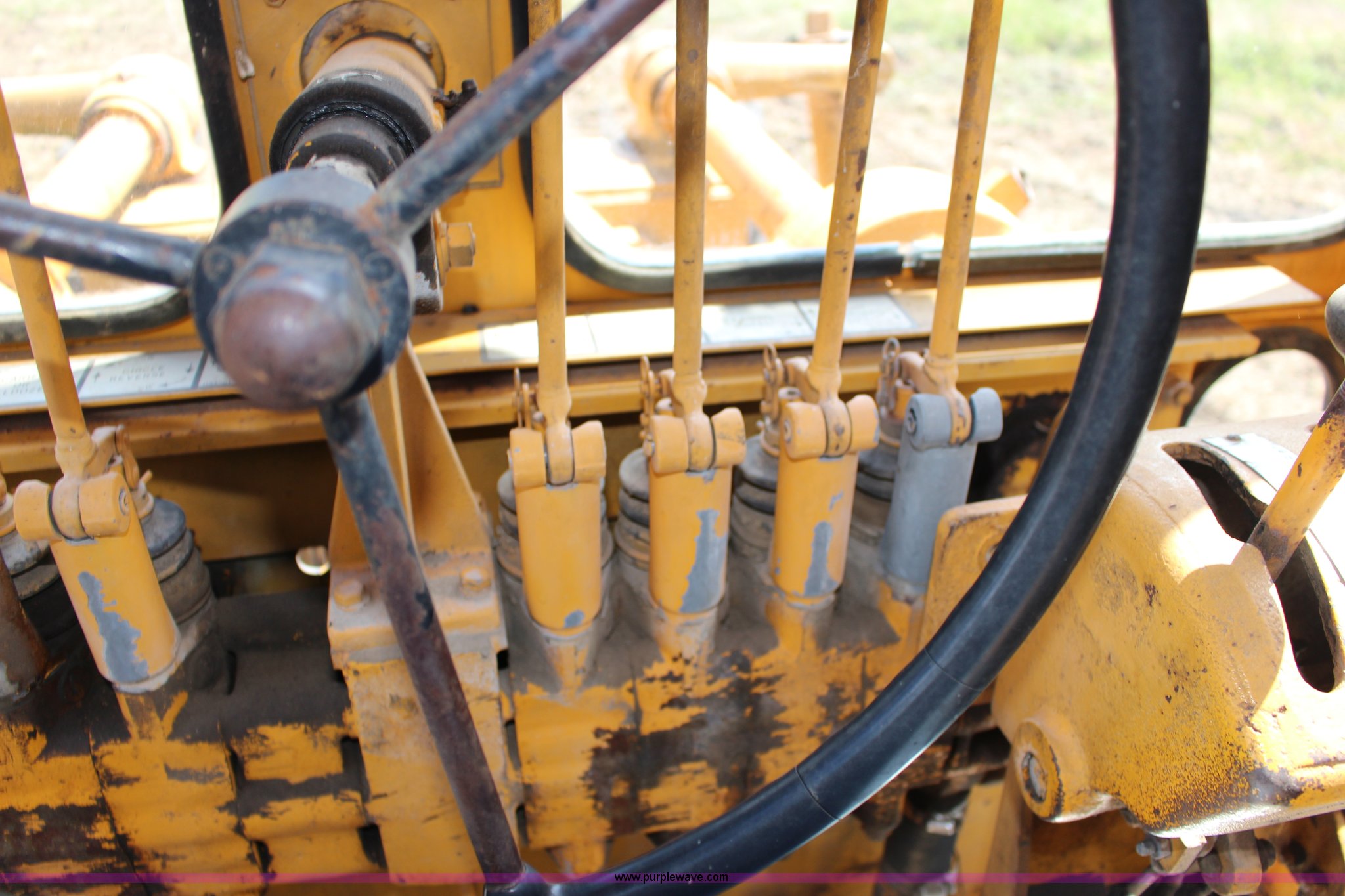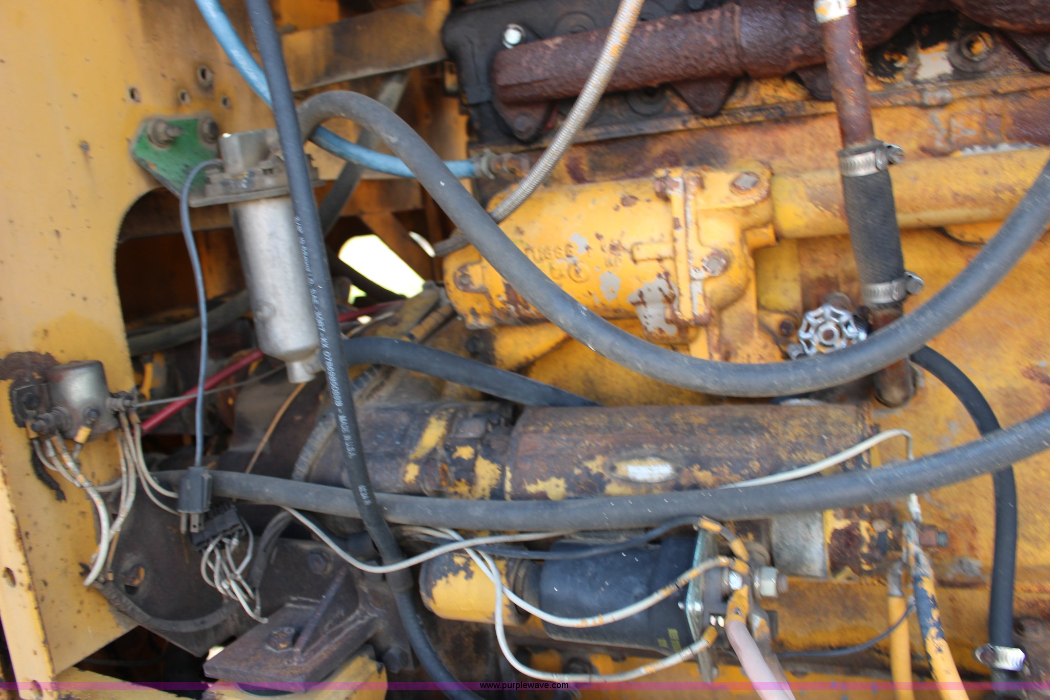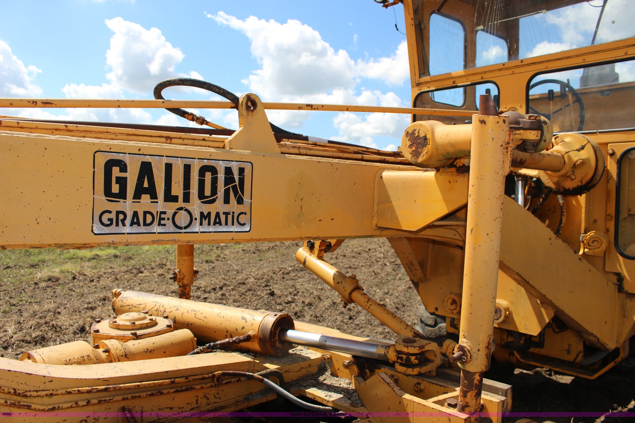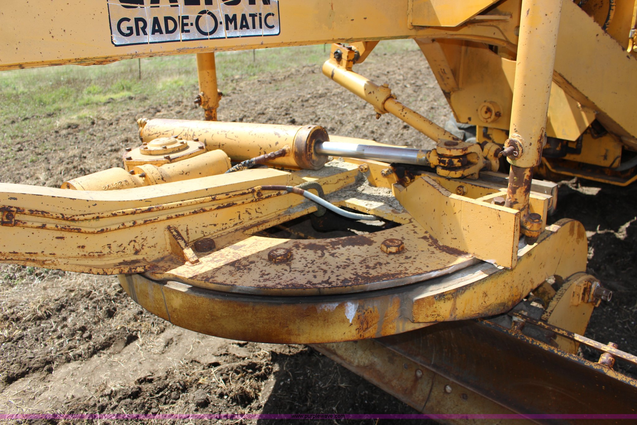 Purple Wave is selling a used Motor Grader in Kansas. This item is a Galion T500 L Series motor grader with the following: 6,596 hours on meter, Cummins six cylinder diesel engine, Powershift transmission, 4F-4R gears, 14' moldboard, Side shift, Front wheel tilt, 14.00-24TG tires, Recent brake work, Recently serviced, Fluid and filter changed, Serial CC04587