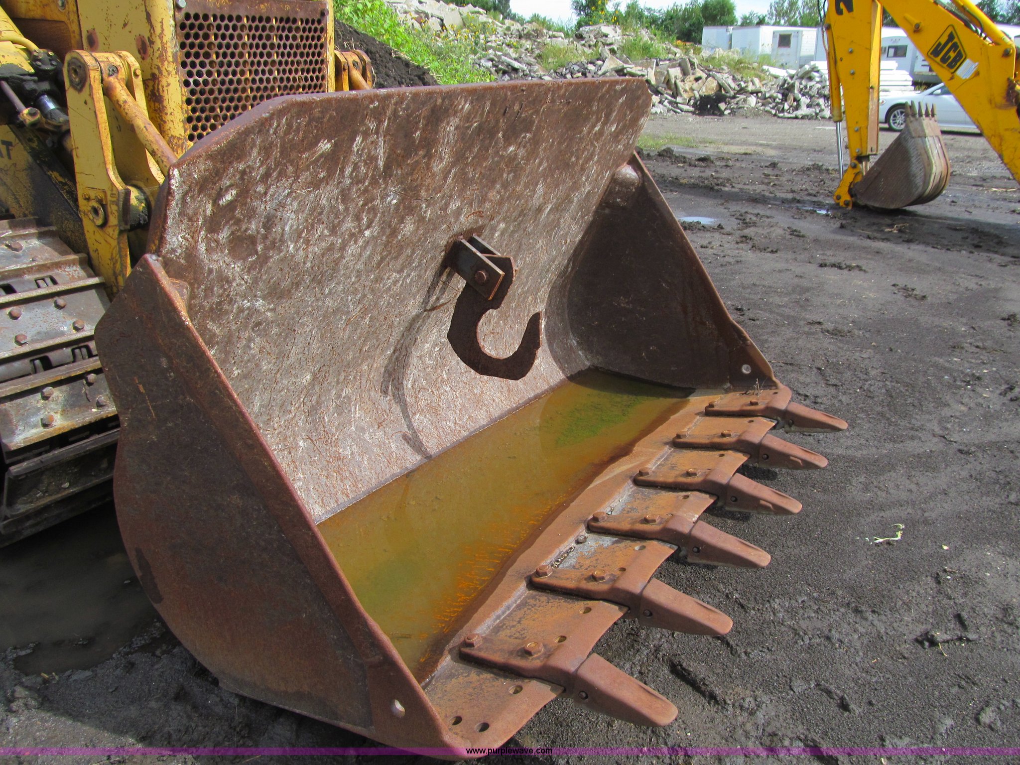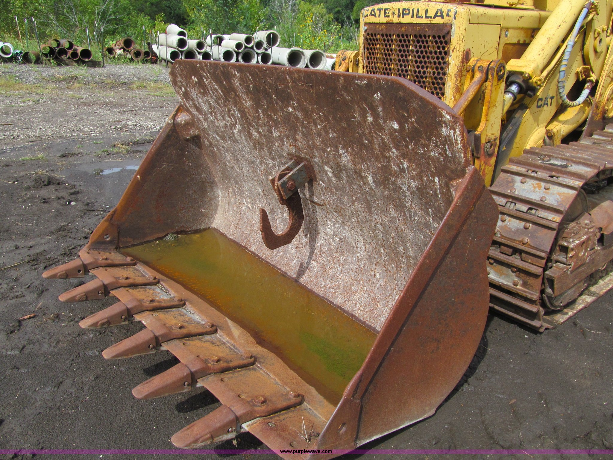 Purple Wave is selling a used Crawler Loader in Iowa. This item is a 1978 Caterpillar 955L track loader with the following: 5,720 hours on meter, Caterpillar D330 7.0L four cylinder turbo diesel engine, 130 HP, Powershift transmission, 3F-3R gears, ROPS, Suspension seat, Two-lever bucket controls, 98"W bucket, (6) weld-on teeth, Pin hitch plate, Rear counterweights, Barco SALT rails, Six bottom rollers, 17"W double grouser track pads, 33,126 lbs. base operating weight, Serial 85J11595