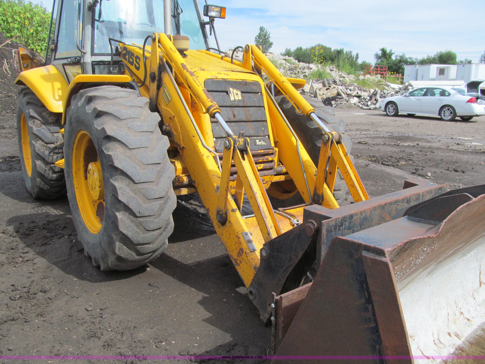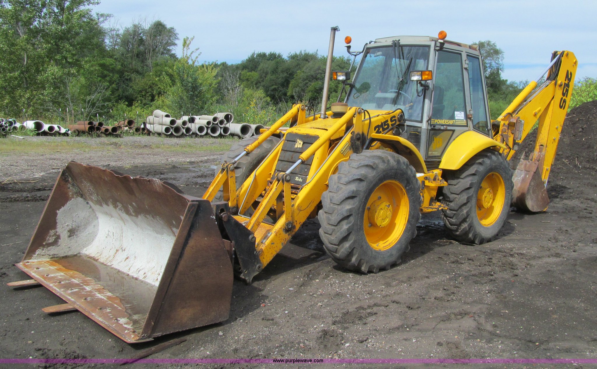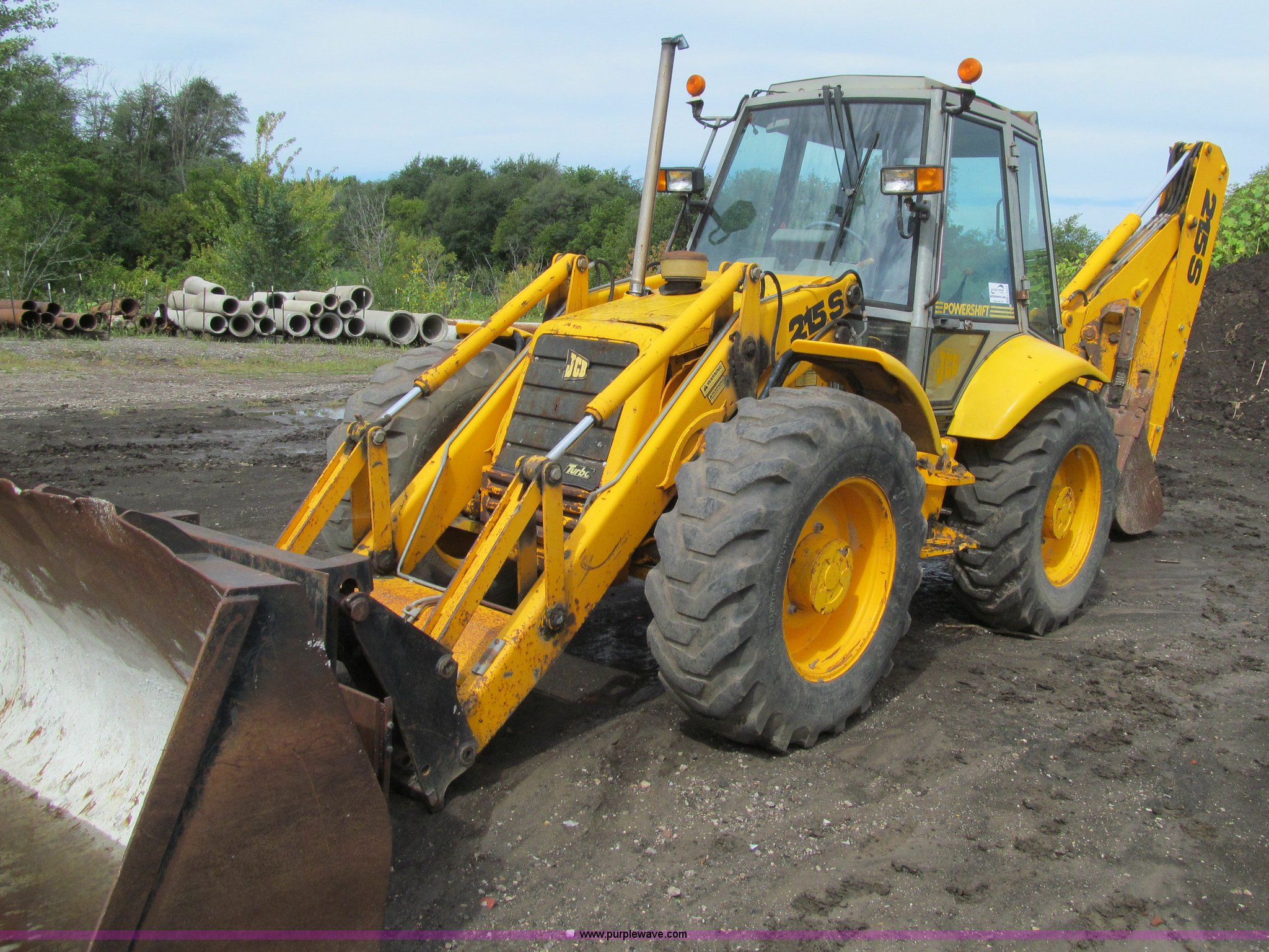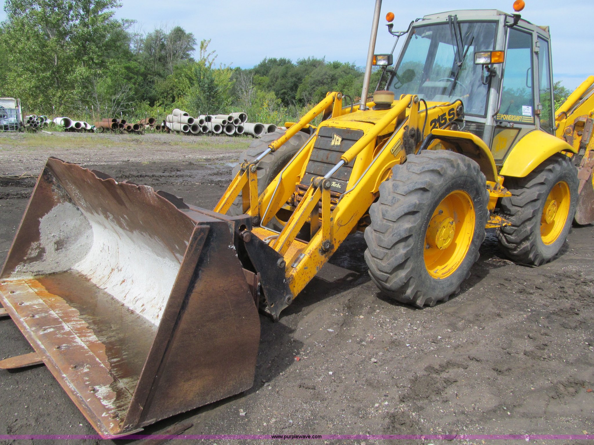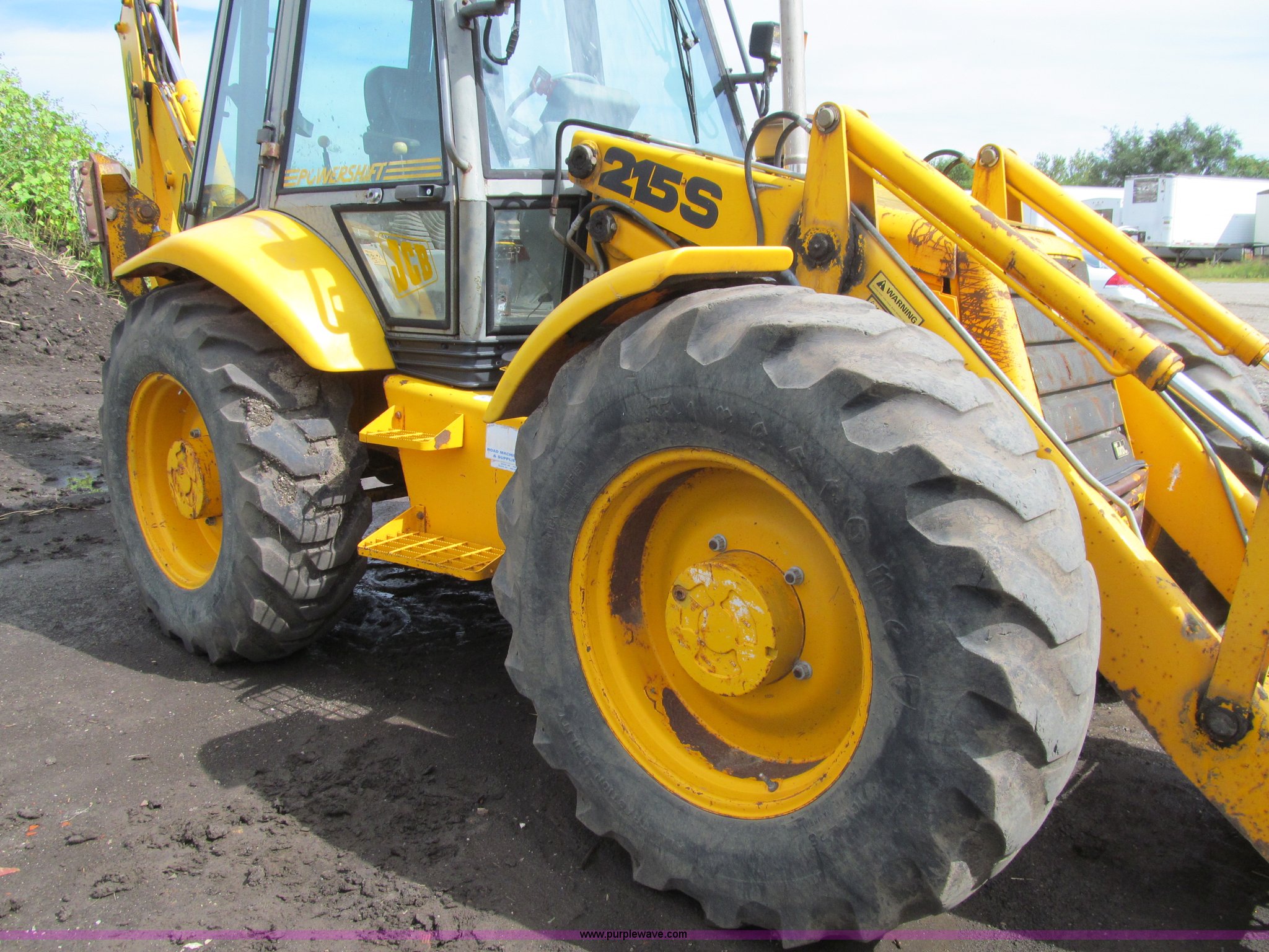 Purple Wave is selling a used Tractor Loader Backhoe in Iowa. This item is a 1992 JCB 215S backhoe with the following: 7,231 hours on meter, JCB 444 268 C.I.D. four cylinder turbo diesel engine, 97 HP, Powershift transmission, 4F-4R gears, Four wheel drive, Four wheel steer, Differential lock, EROPS, Heat, Suspension seat, Wobble stick backhoe controls, Wipers, Hydraulic quick coupler, E-stick, 28"W backhoe bucket, (5) teeth, Outriggers, Street pads, Pallet forks, 42"L, Adjustable width carriage, Firestone 16.9-28 front tires, Firestone 16.9-28 rear tires, 18,223 lbs. base operating weight, Left engine enclosure bent, Non-operational driver's side door latch, Serial 215SOCPE408027, Unit# 3035