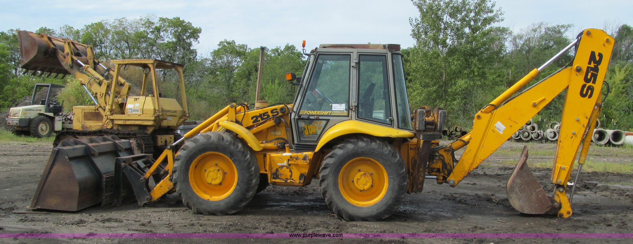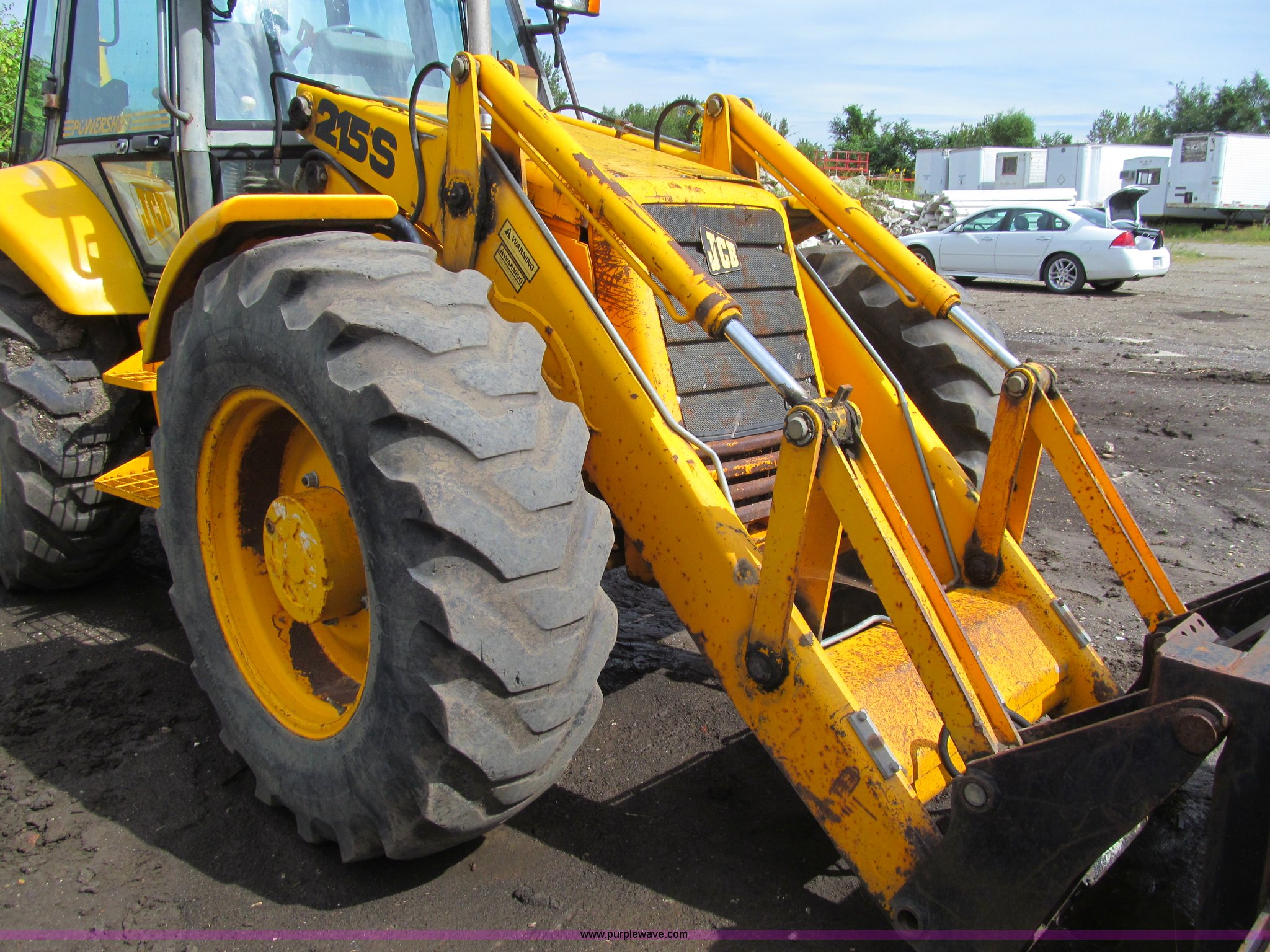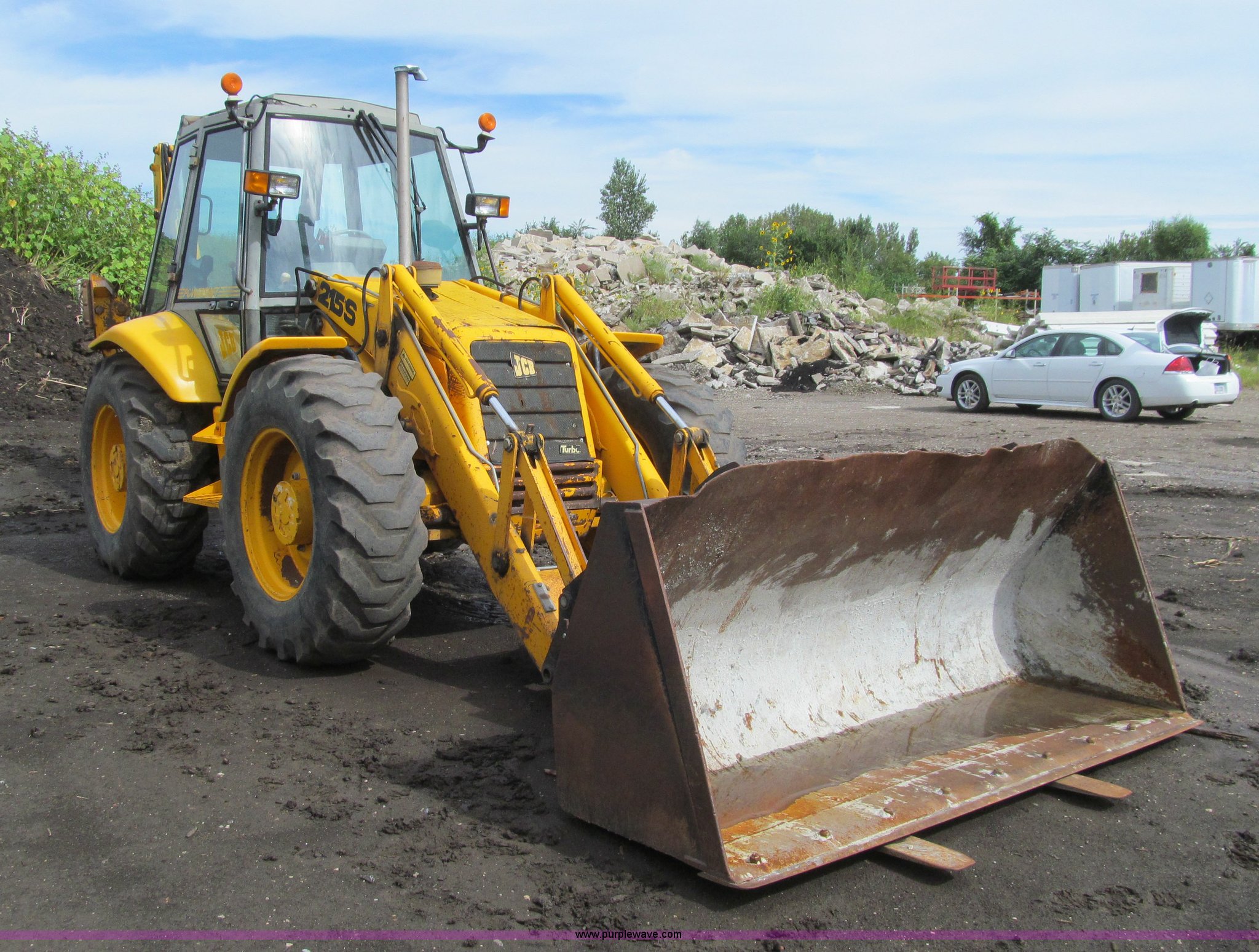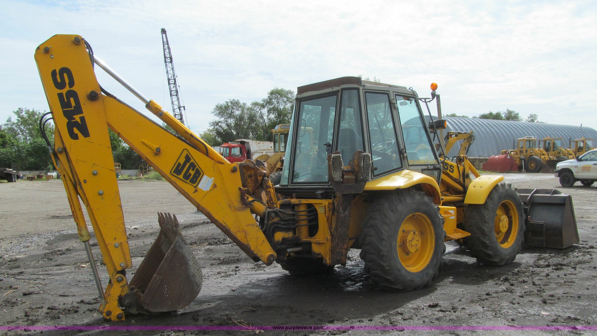 Purple Wave is selling a used Tractor Loader Backhoe in Iowa. This item is a 1992 JCB 215S backhoe with the following: 7,231 hours on meter, JCB 444 268 C.I.D. four cylinder turbo diesel engine, 97 HP, Powershift transmission, 4F-4R gears, Four wheel drive, Four wheel steer, Differential lock, EROPS, Heat, Suspension seat, Wobble stick backhoe controls, Wipers, Hydraulic quick coupler, E-stick, 28"W backhoe bucket, (5) teeth, Outriggers, Street pads, Pallet forks, 42"L, Adjustable width carriage, Firestone 16.9-28 front tires, Firestone 16.9-28 rear tires, 18,223 lbs. base operating weight, Left engine enclosure bent, Non-operational driver's side door latch, Serial 215SOCPE408027, Unit# 3035
