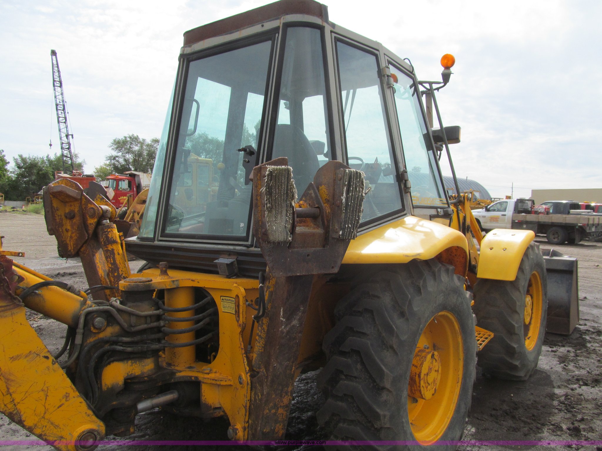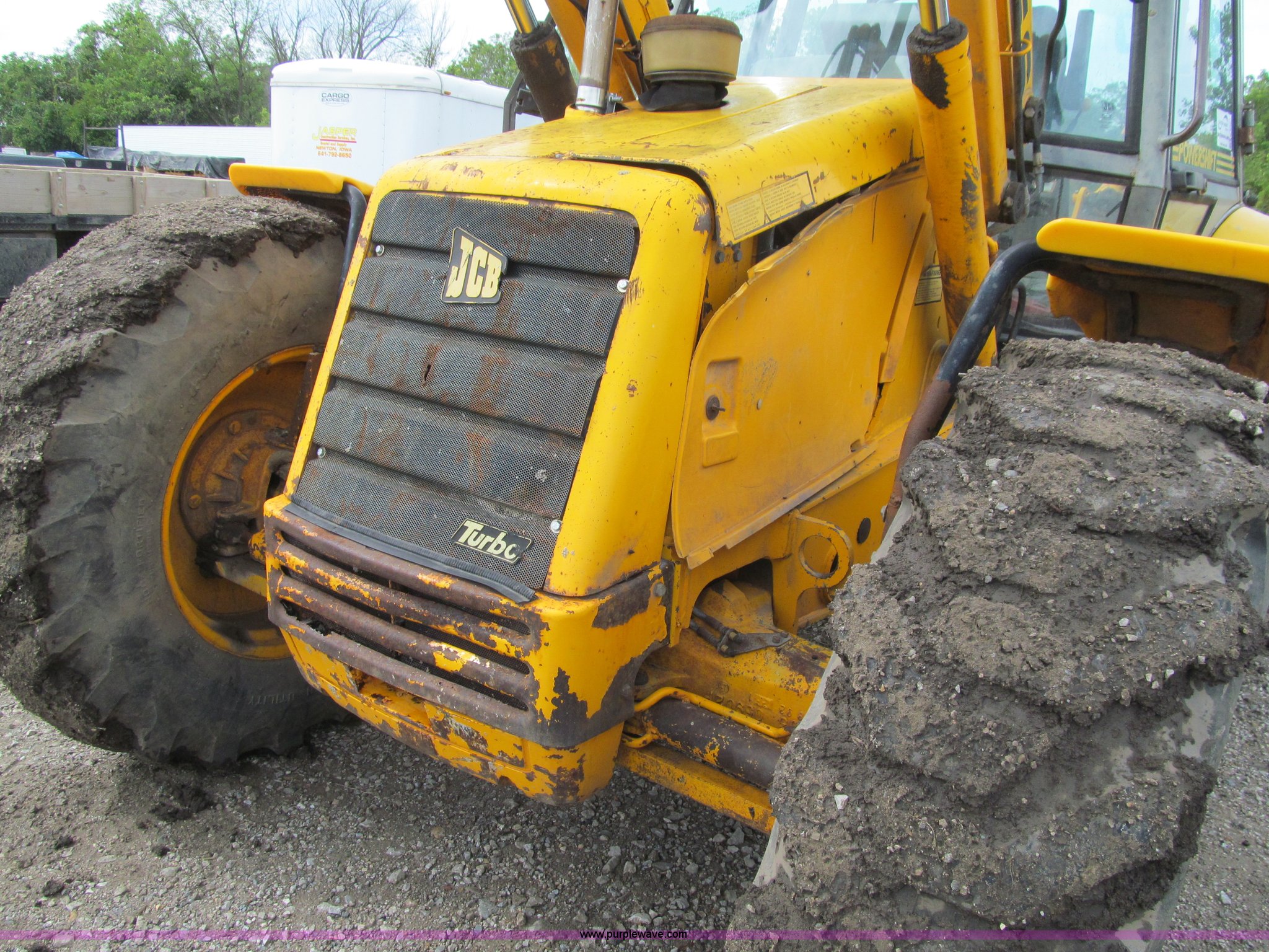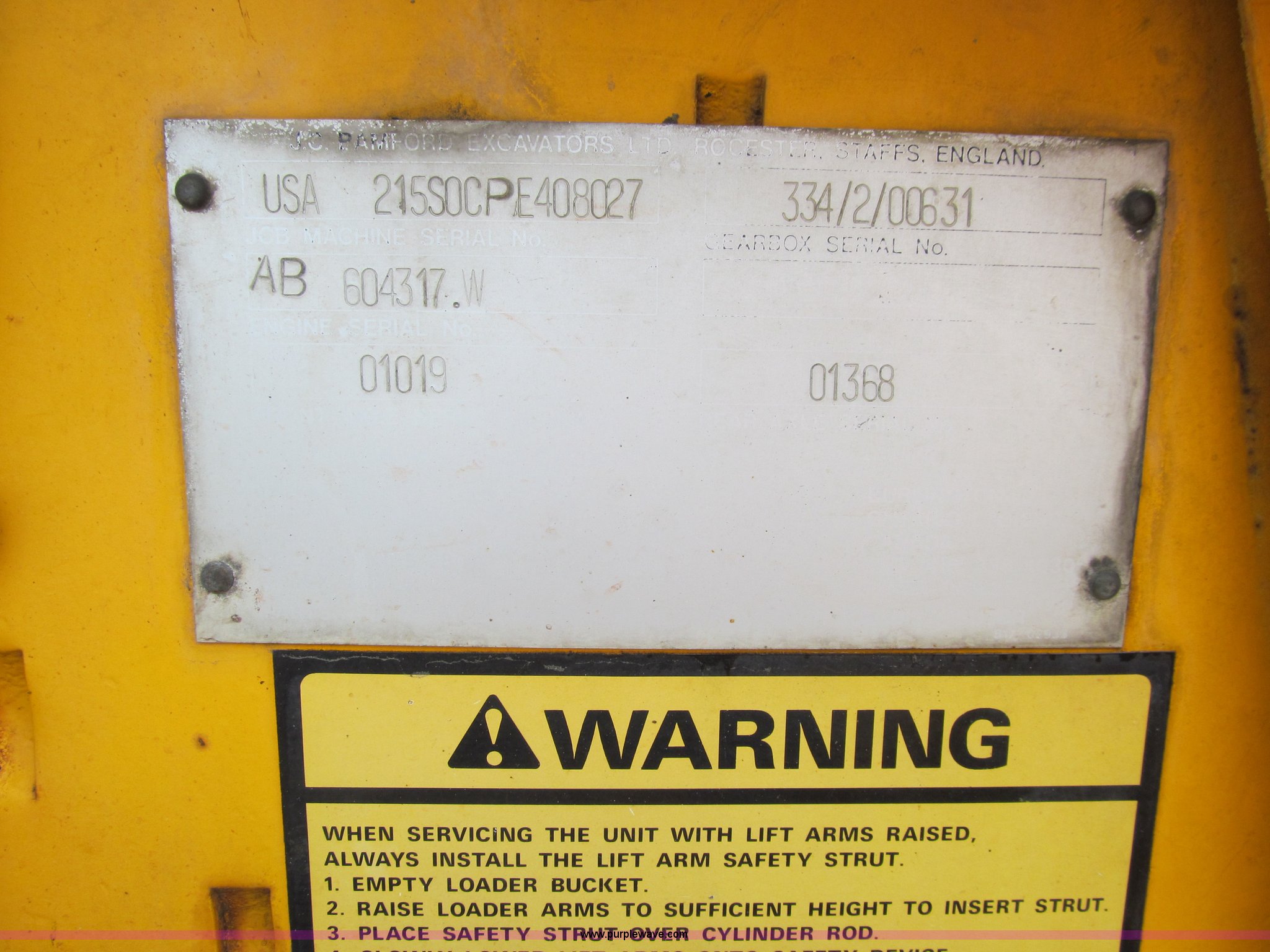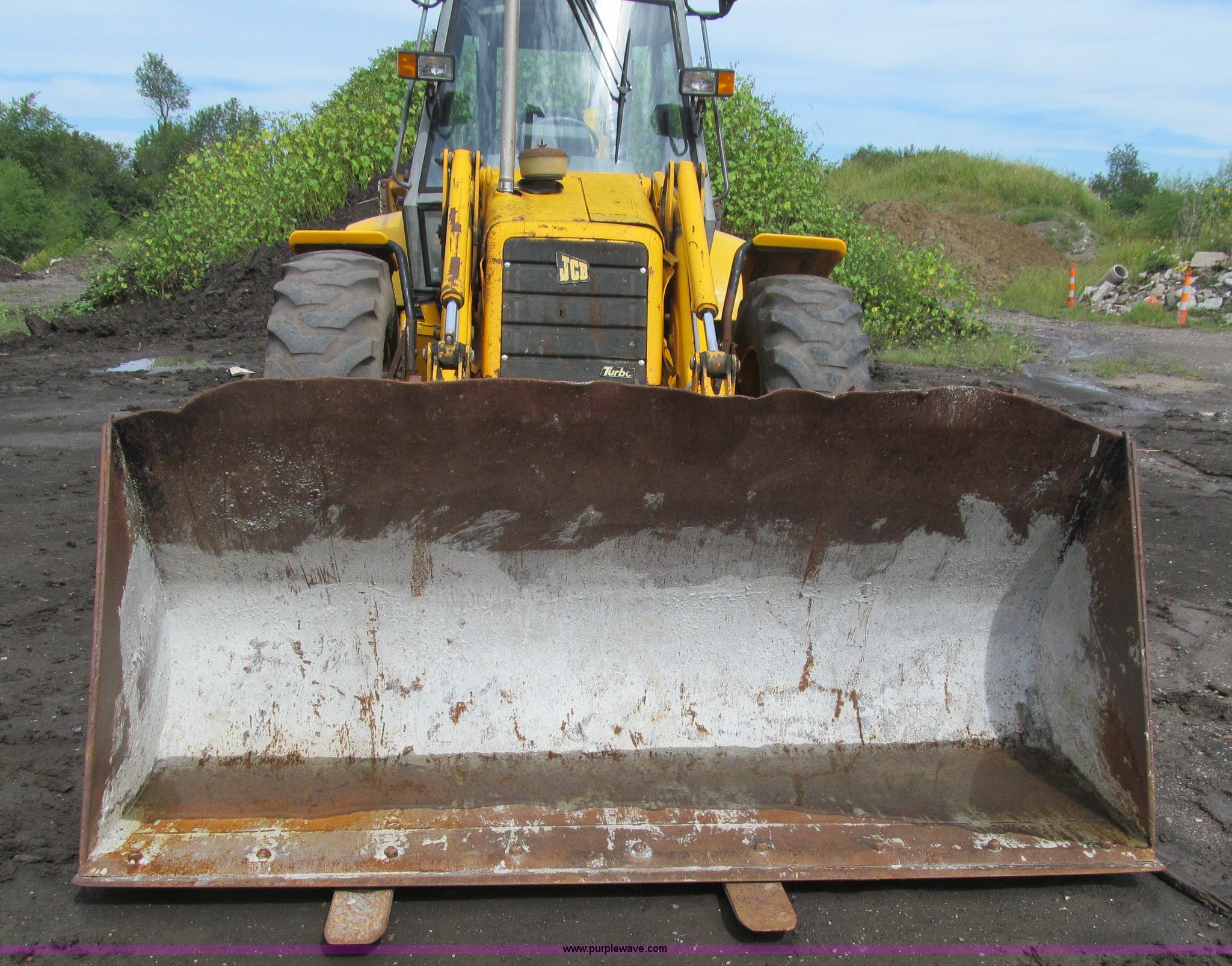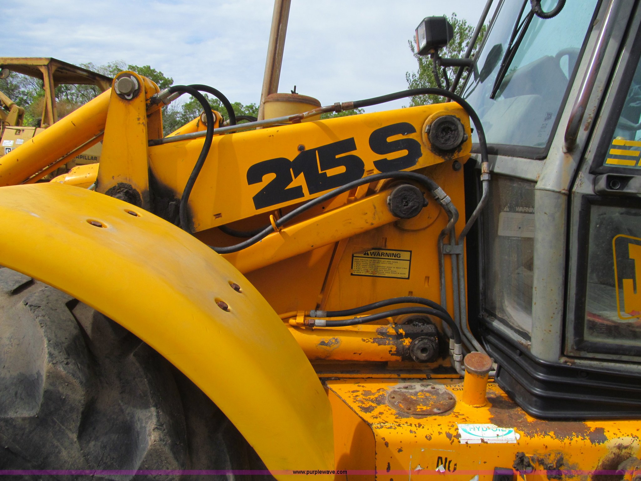 Purple Wave is selling a used Tractor Loader Backhoe in Iowa. This item is a 1992 JCB 215S backhoe with the following: 7,231 hours on meter, JCB 444 268 C.I.D. four cylinder turbo diesel engine, 97 HP, Powershift transmission, 4F-4R gears, Four wheel drive, Four wheel steer, Differential lock, EROPS, Heat, Suspension seat, Wobble stick backhoe controls, Wipers, Hydraulic quick coupler, E-stick, 28"W backhoe bucket, (5) teeth, Outriggers, Street pads, Pallet forks, 42"L, Adjustable width carriage, Firestone 16.9-28 front tires, Firestone 16.9-28 rear tires, 18,223 lbs. base operating weight, Left engine enclosure bent, Non-operational driver's side door latch, Serial 215SOCPE408027, Unit# 3035