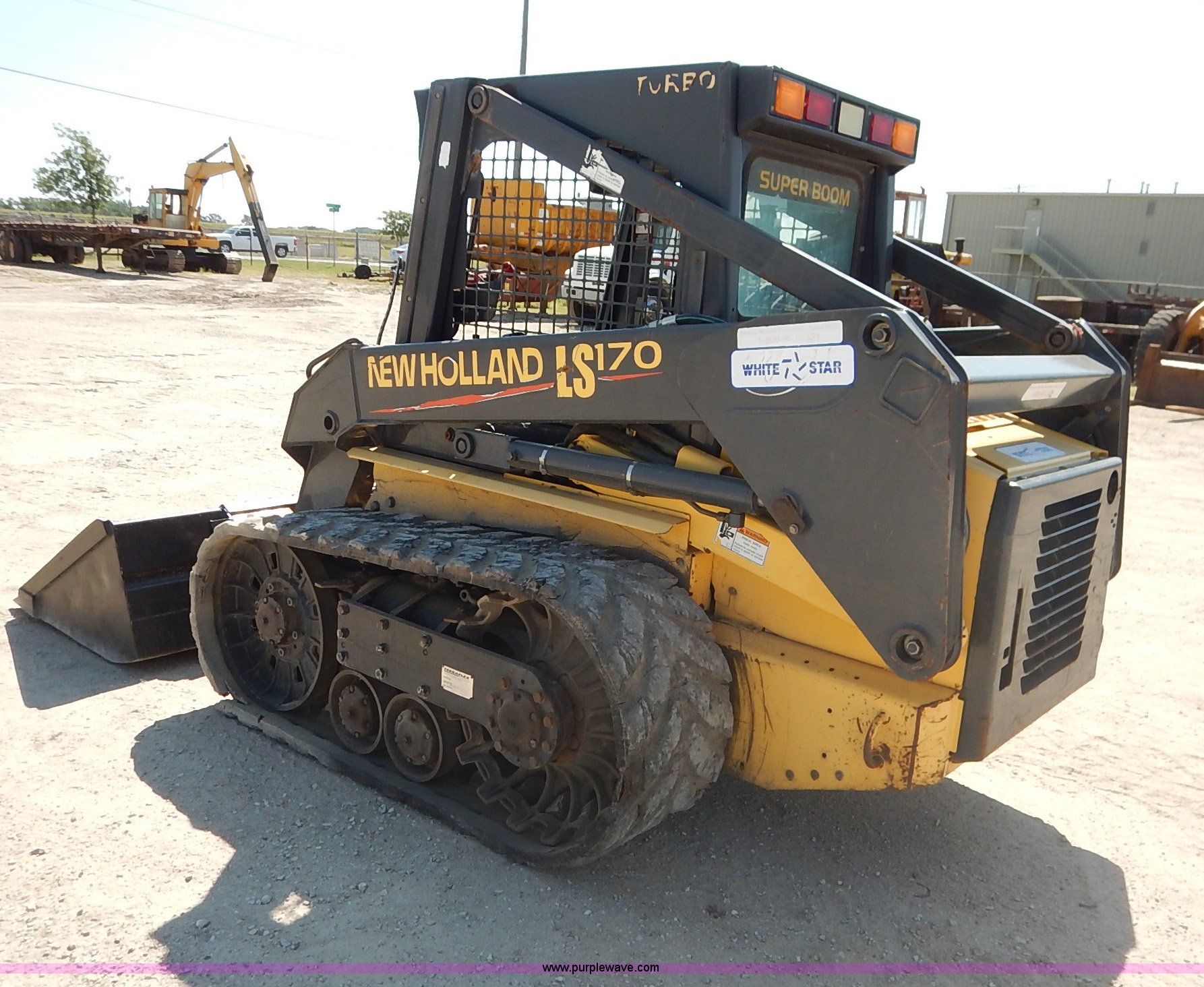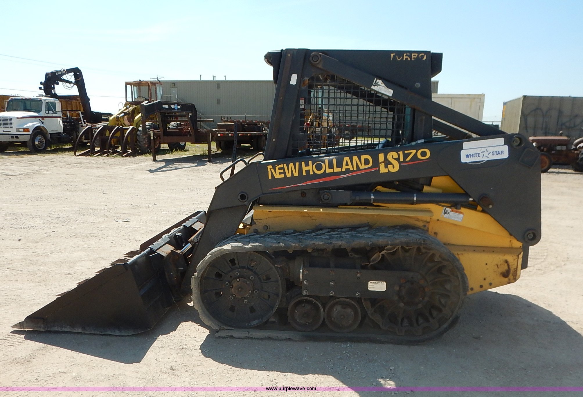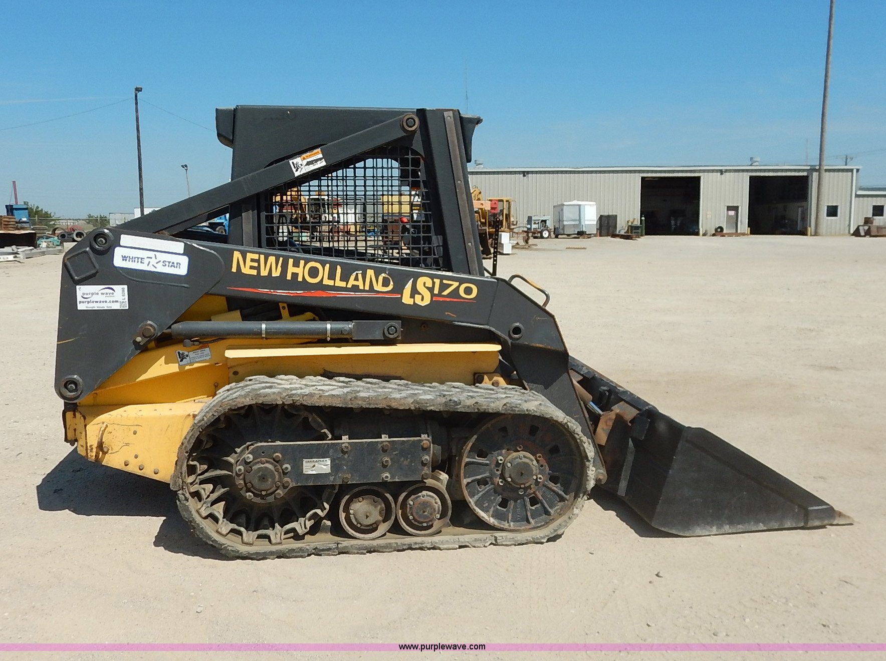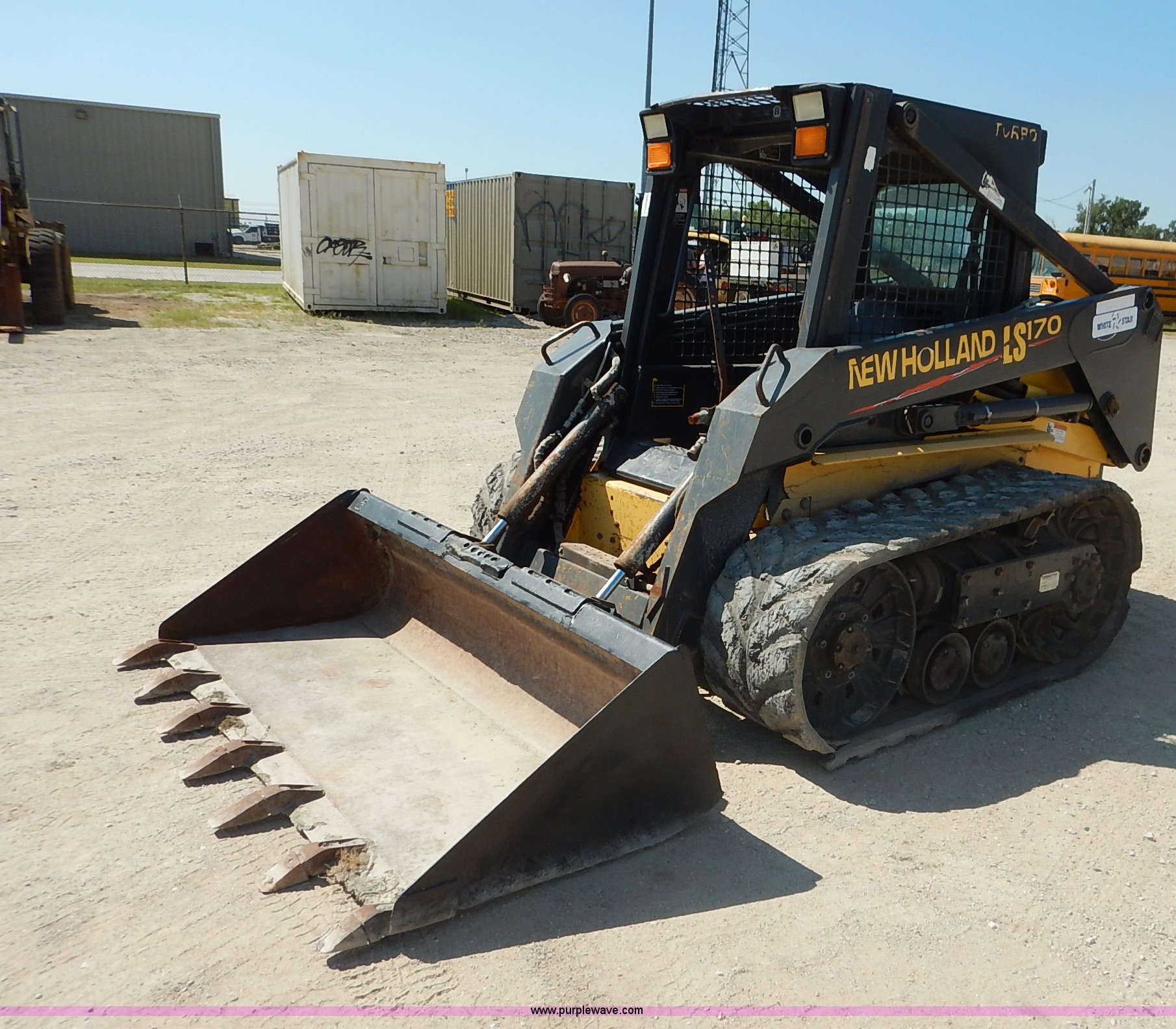 Purple Wave is selling a used Skid Steer Loader in Kansas. This item is a 2002 New Holland LS170 skid steer with the following: 3,133 hours on meter, Case New Holland four cylinder turbo diesel engine, Hydrostatic transmission, Enclosed cab, Hand and foot controls, EMS panel, No door, Rear glass only, 77""W bucket, Weld-on cutting edge, Weld-on teeth, Manual quick coupler, Auxiliary hydraulics, Terra Flex 16" tracks, Serial 174628