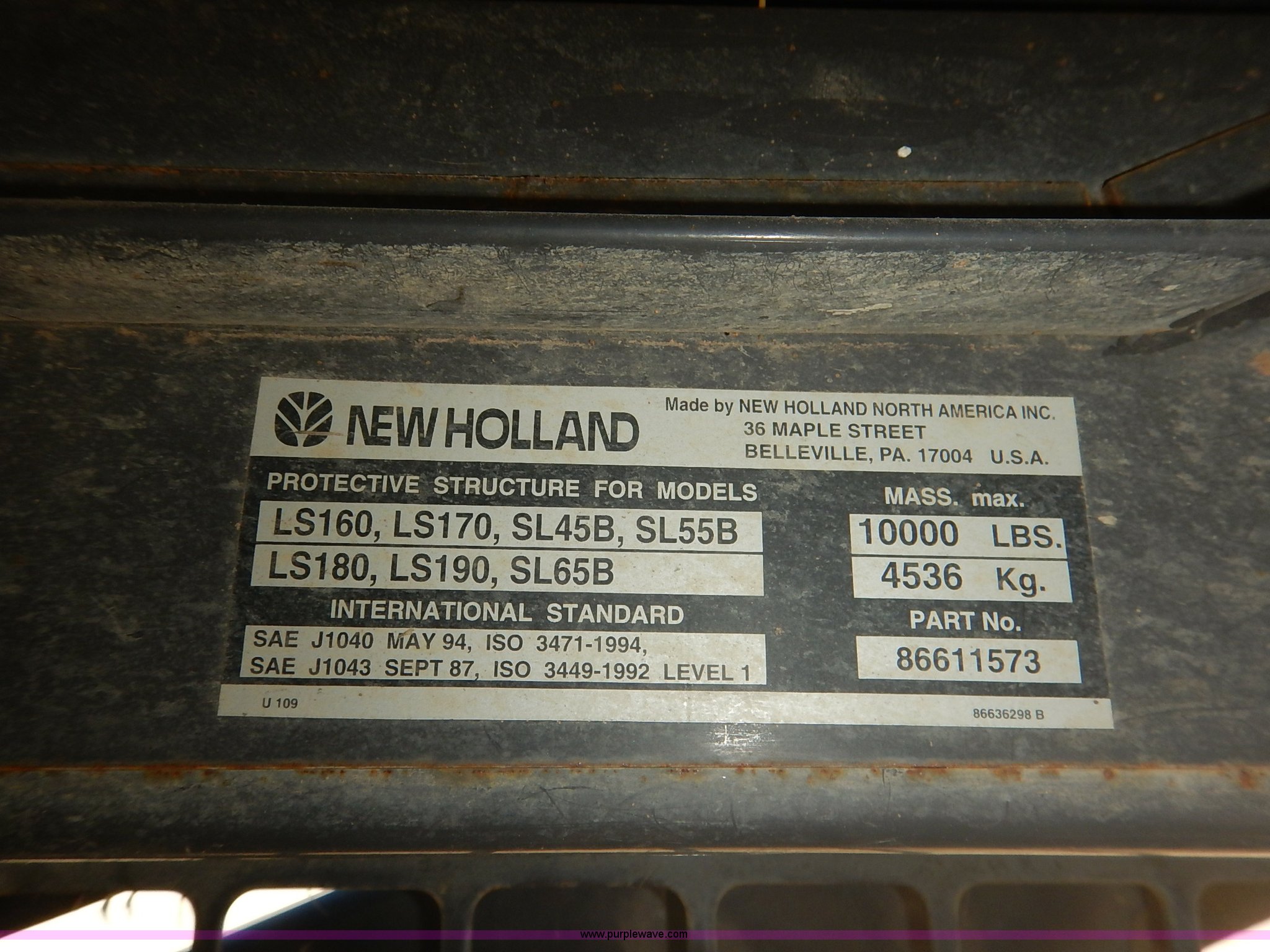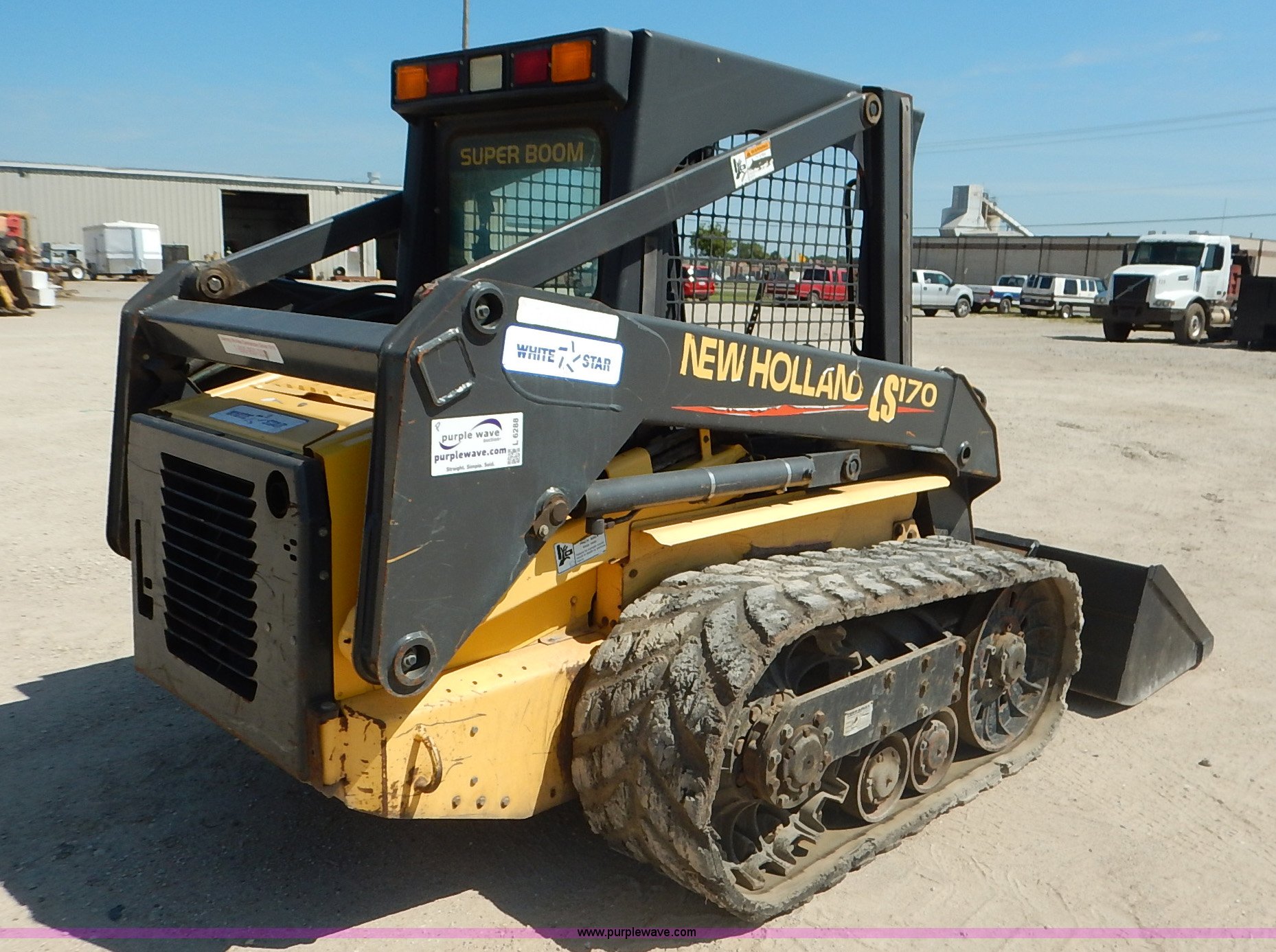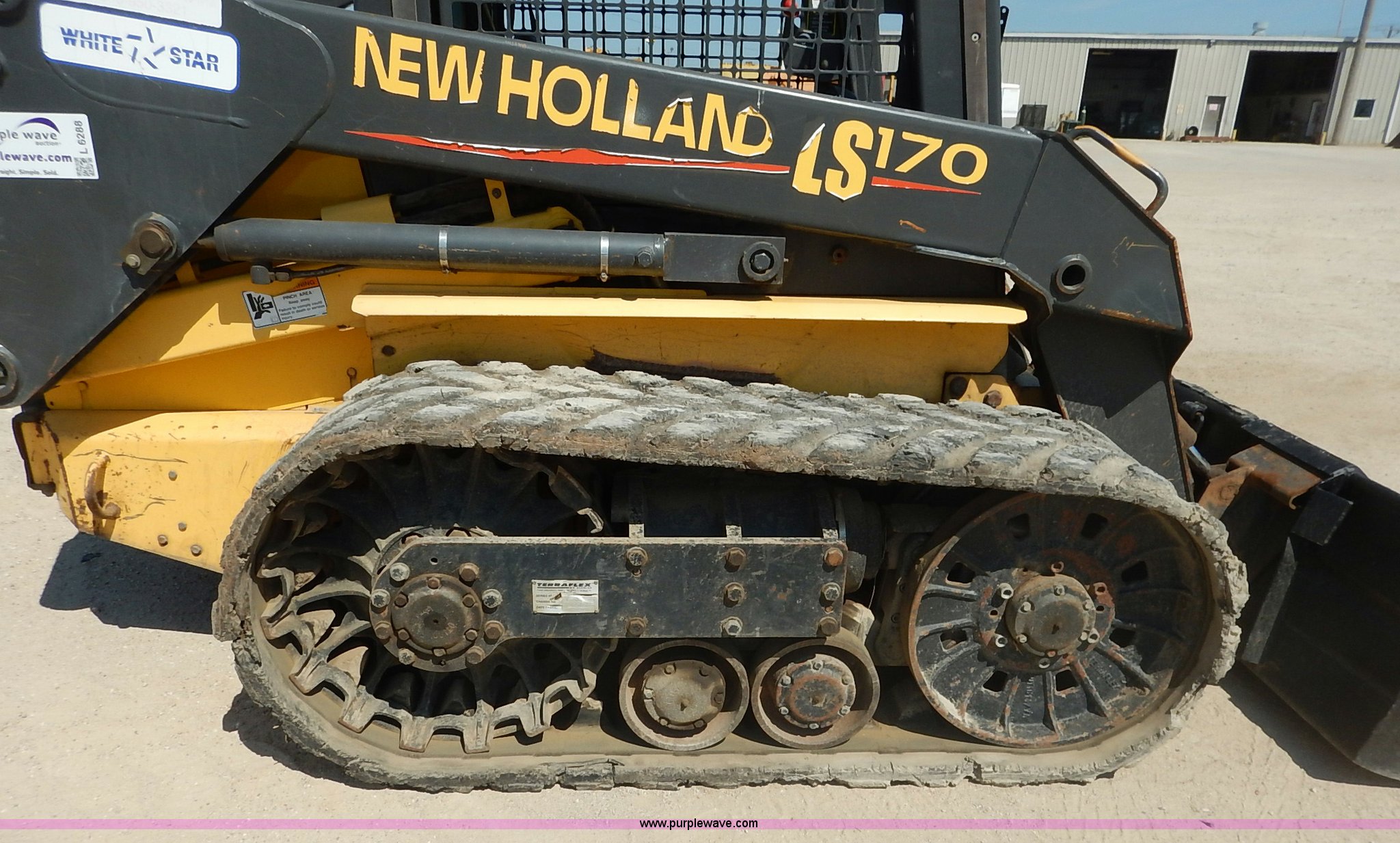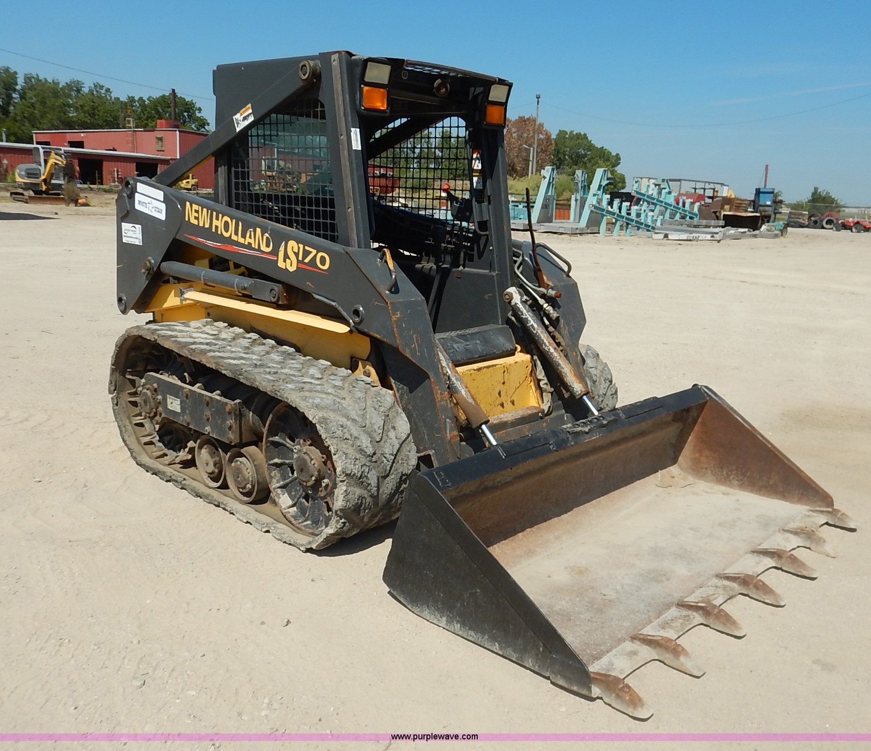 Purple Wave is selling a used Skid Steer Loader in Kansas. This item is a 2002 New Holland LS170 skid steer with the following: 3,133 hours on meter, Case New Holland four cylinder turbo diesel engine, Hydrostatic transmission, Enclosed cab, Hand and foot controls, EMS panel, No door, Rear glass only, 77""W bucket, Weld-on cutting edge, Weld-on teeth, Manual quick coupler, Auxiliary hydraulics, Terra Flex 16" tracks, Serial 174628