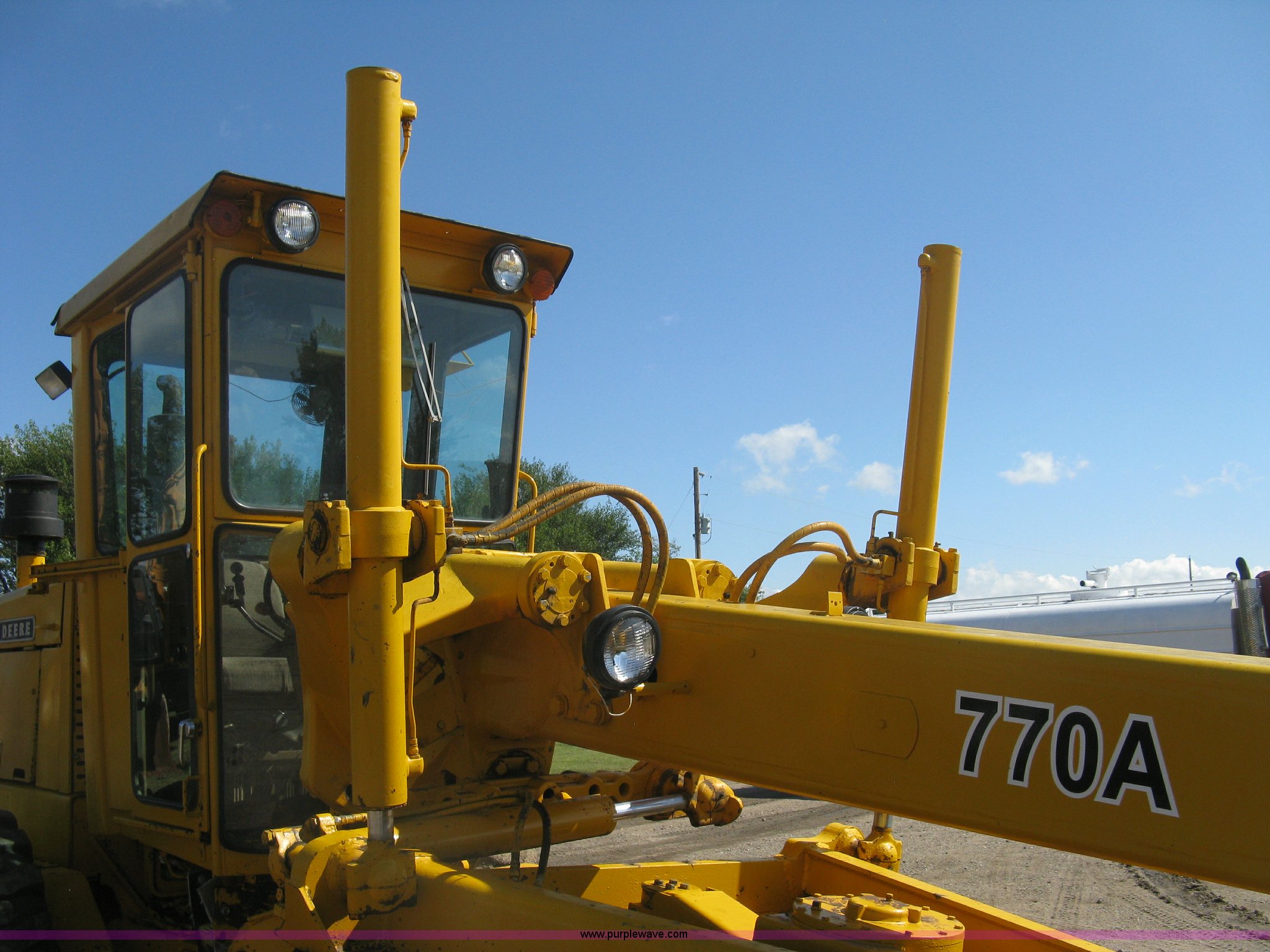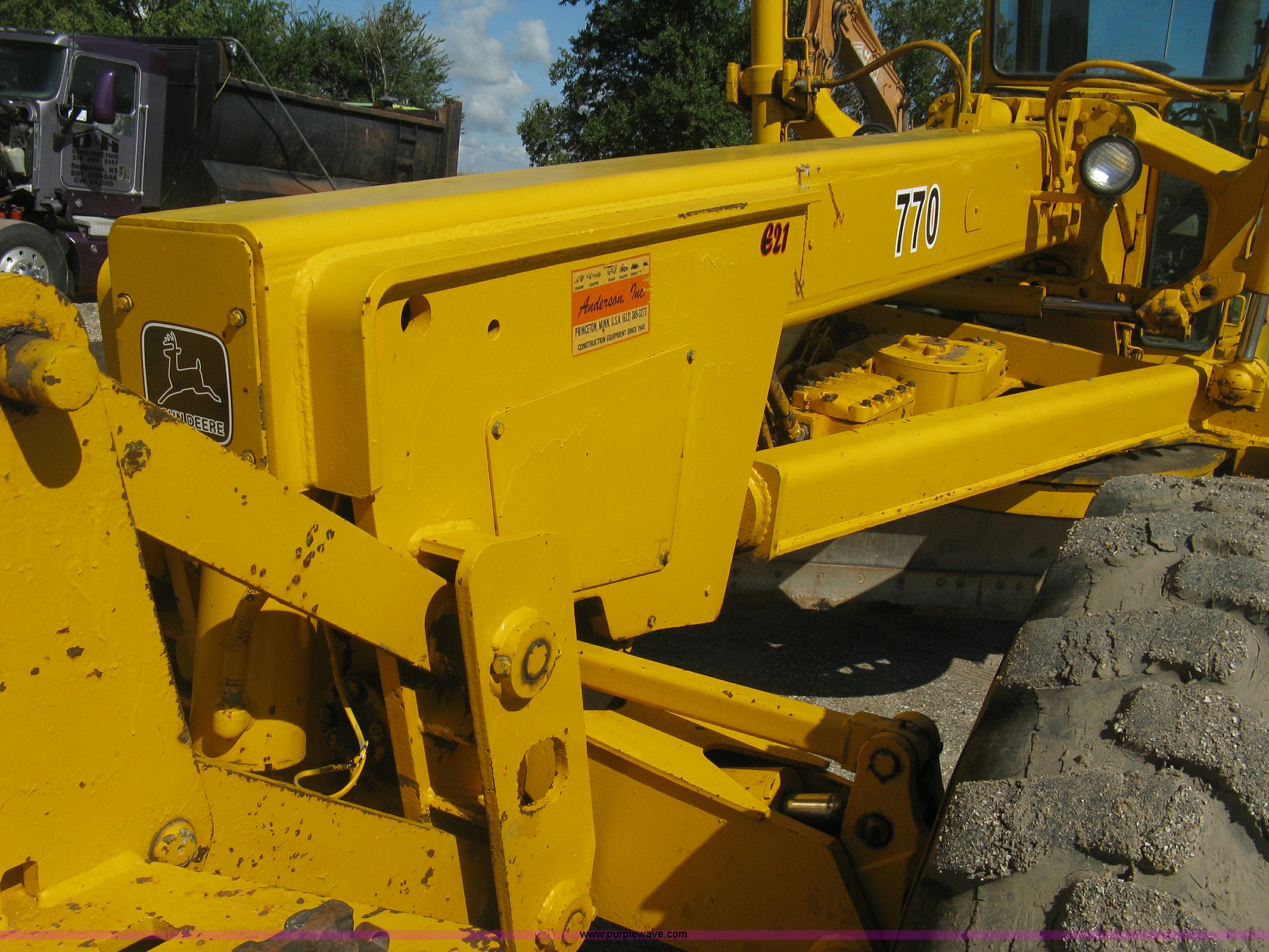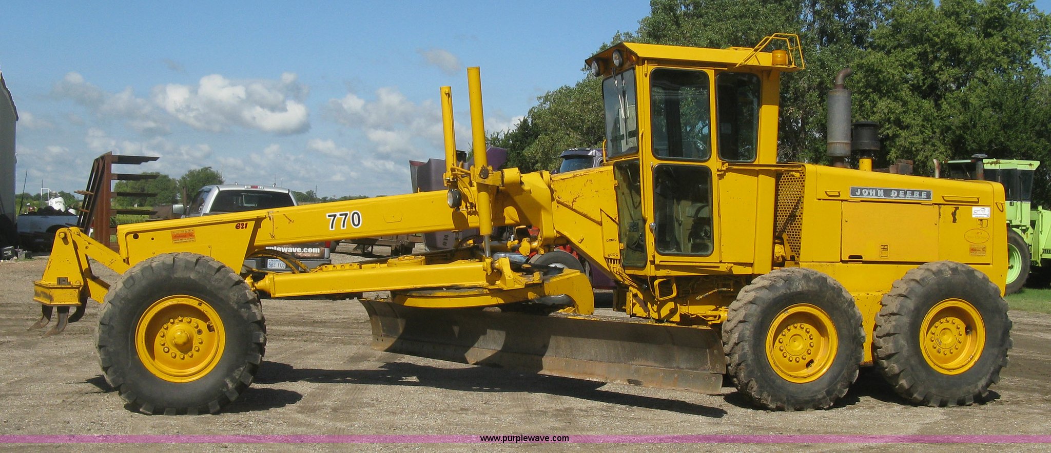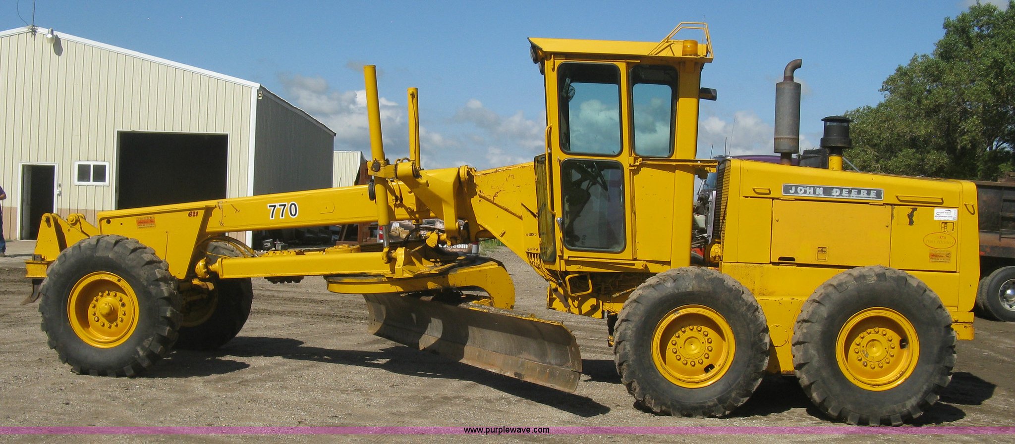 Purple Wave is selling a used Motor Grader in Kansas. This item is a 1979 John Deere 770 motor grader with the following: 8,568 hours on meter, John Deere 6531 six cylinder diesel engine, Powershift transmission, EROPS, AC and heat, AM/FM, Suspension seat, 14'W moldboard, Front mounted scarifier, (3) teeth, 14.00-24TG tires, Crankshaft and bearings replaced, Windshield cracked, AC need charged, Serial 770A-08998T