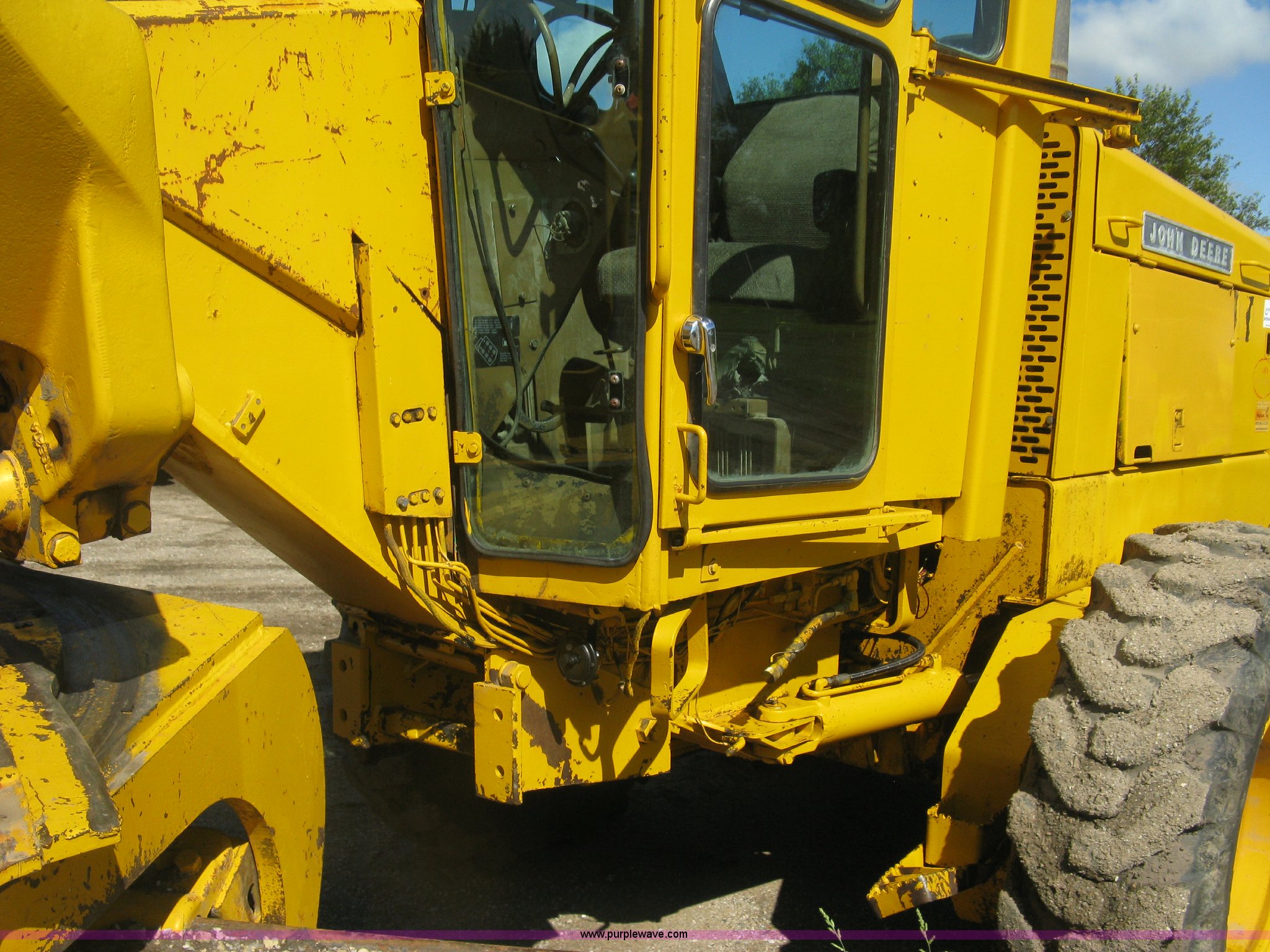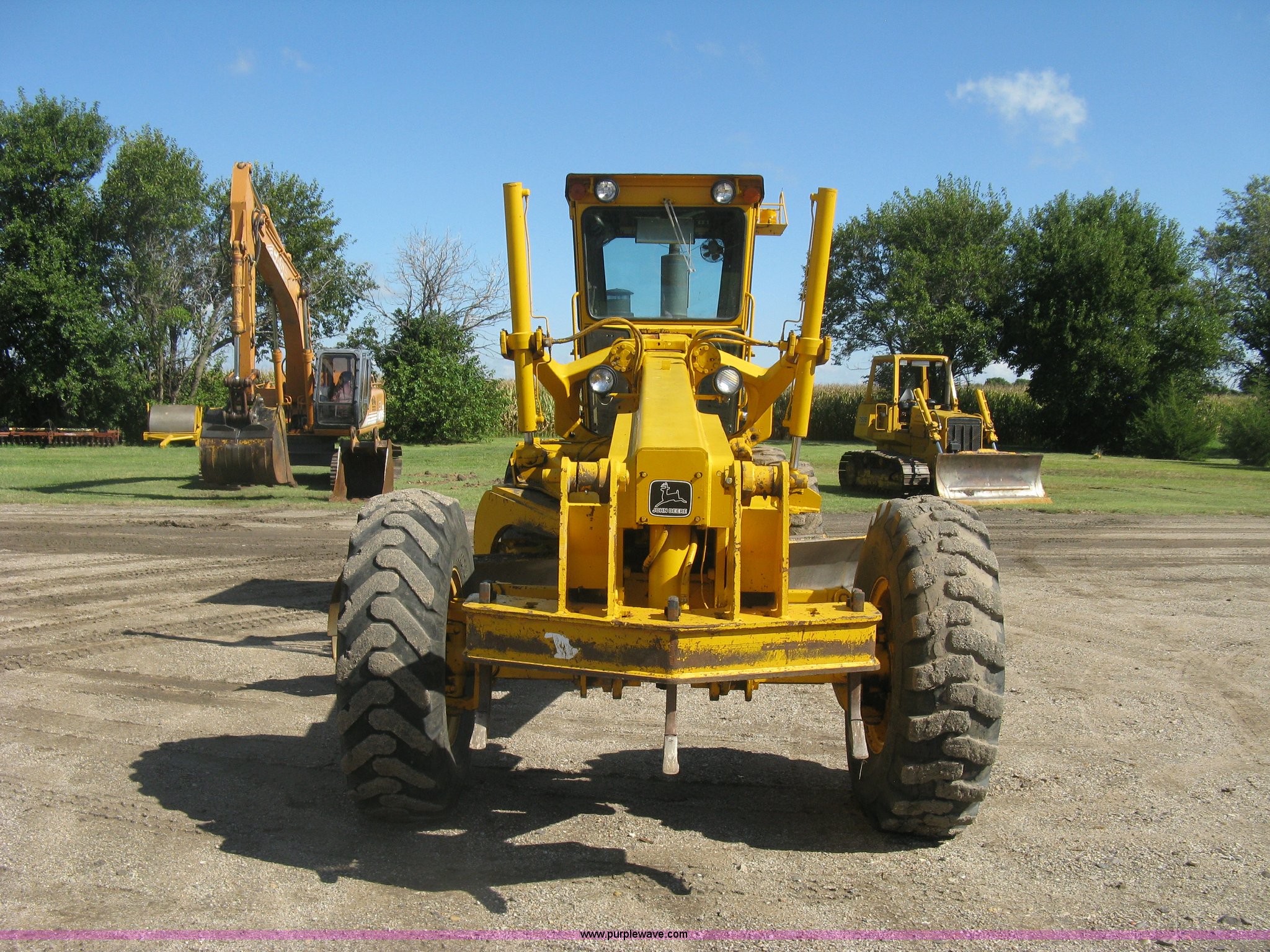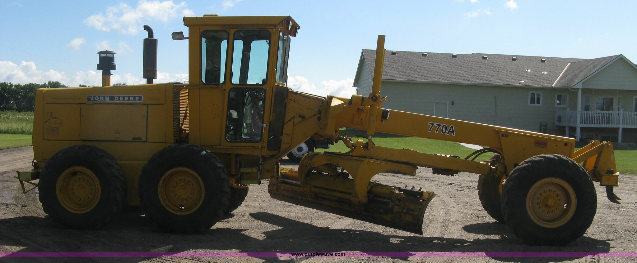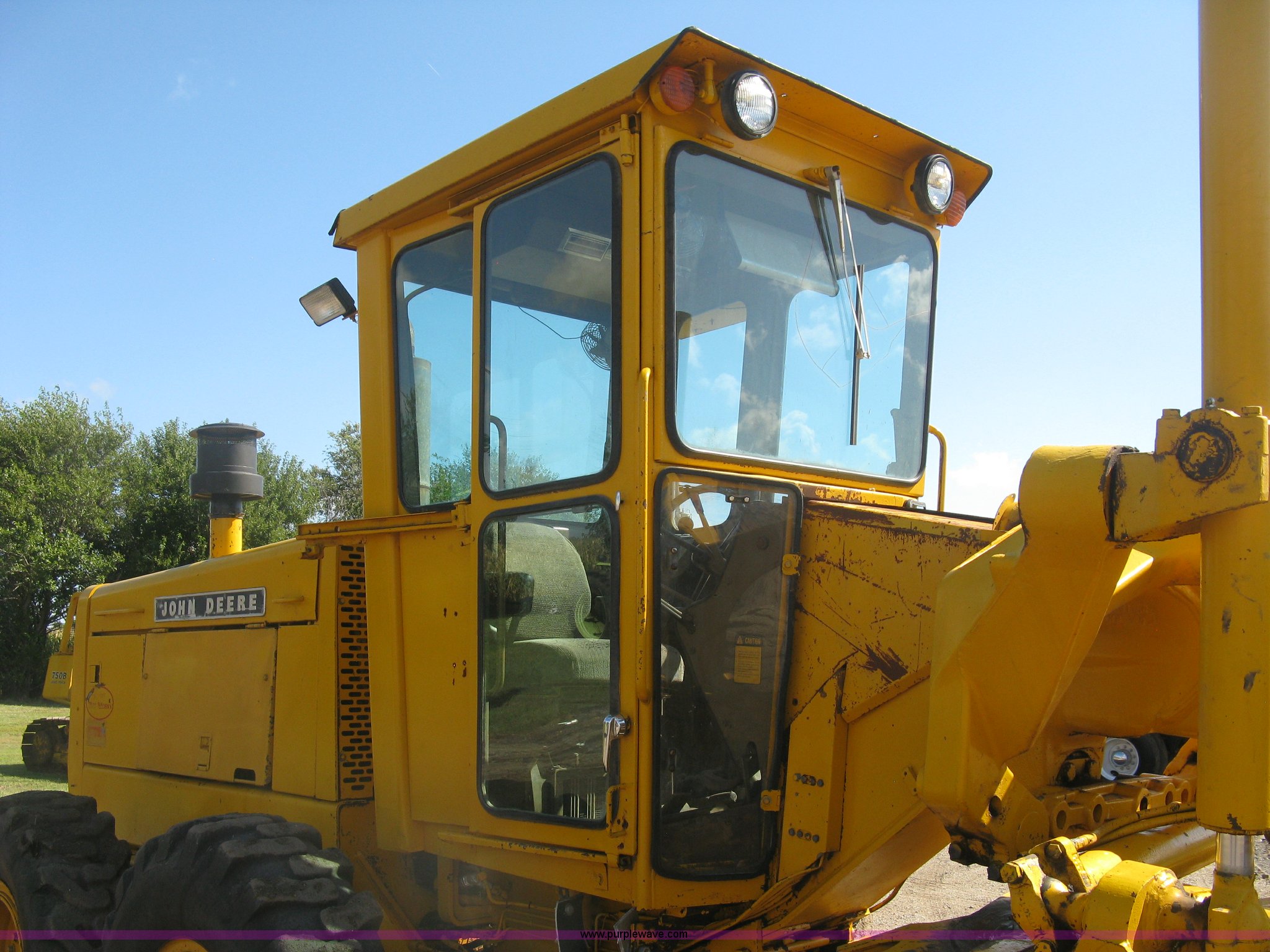 Purple Wave is selling a used Motor Grader in Kansas. This item is a 1979 John Deere 770 motor grader with the following: 8,568 hours on meter, John Deere 6531 six cylinder diesel engine, Powershift transmission, EROPS, AC and heat, AM/FM, Suspension seat, 14'W moldboard, Front mounted scarifier, (3) teeth, 14.00-24TG tires, Crankshaft and bearings replaced, Windshield cracked, AC need charged, Serial 770A-08998T