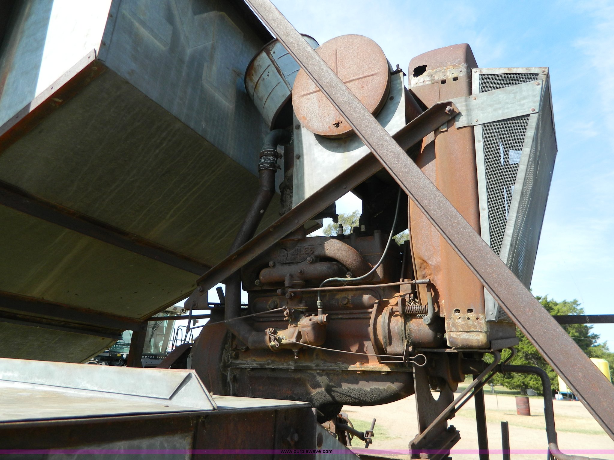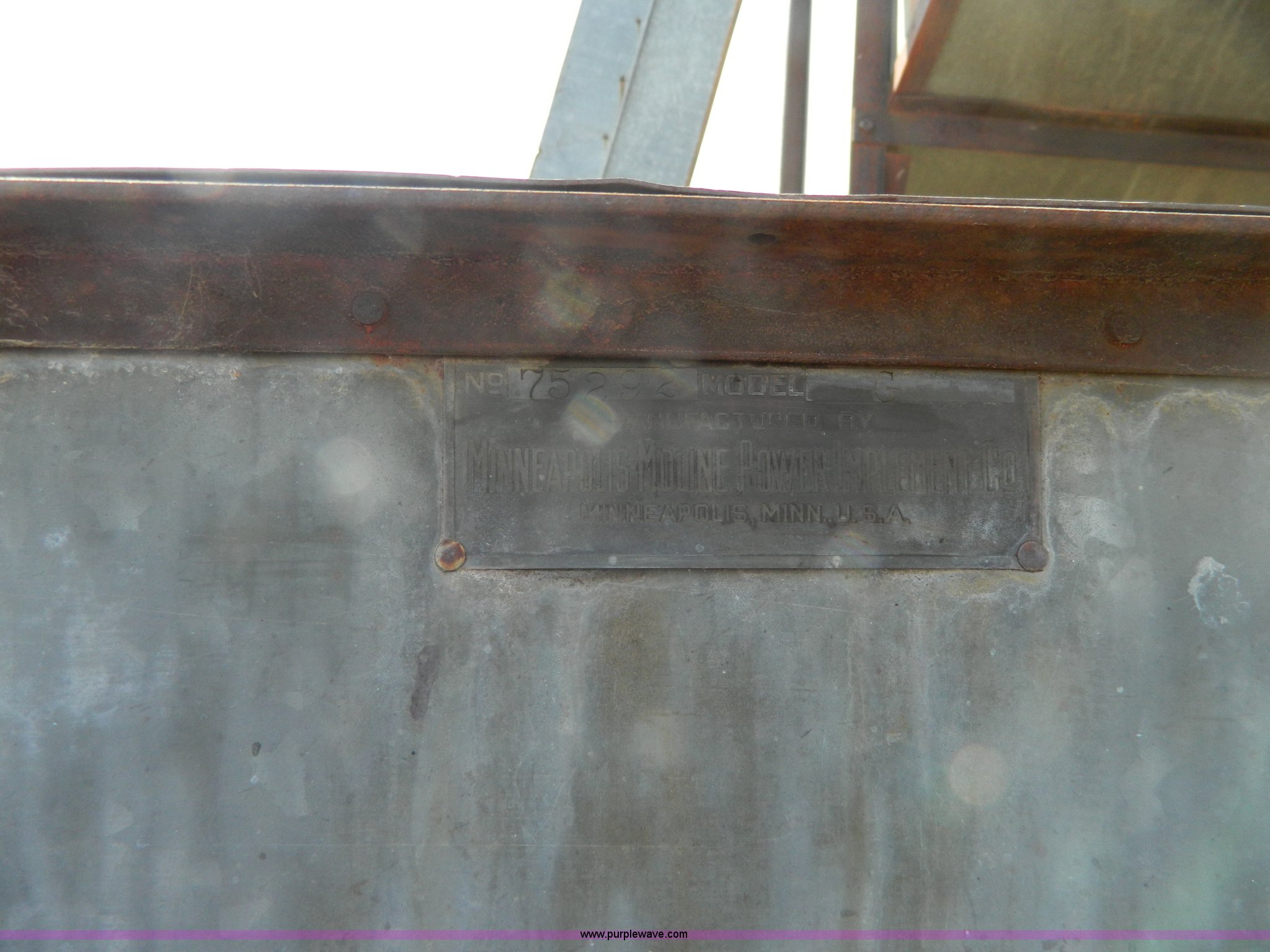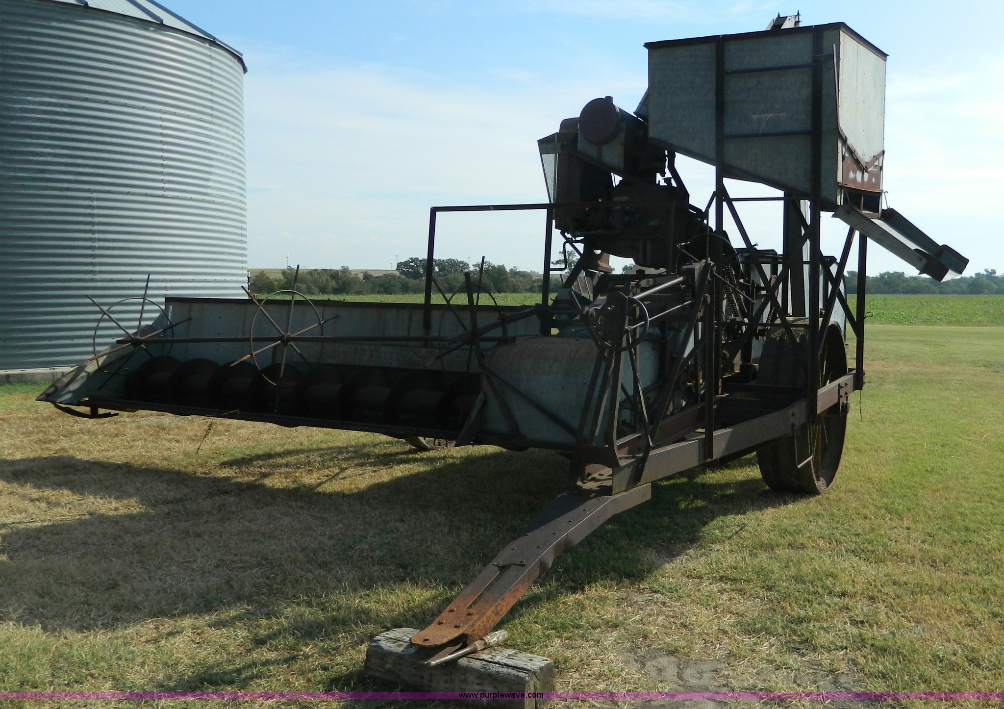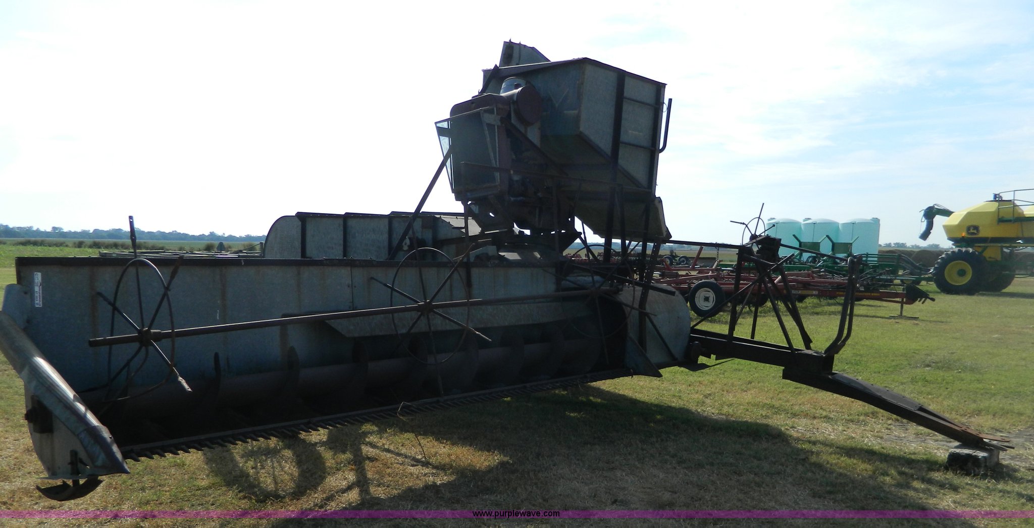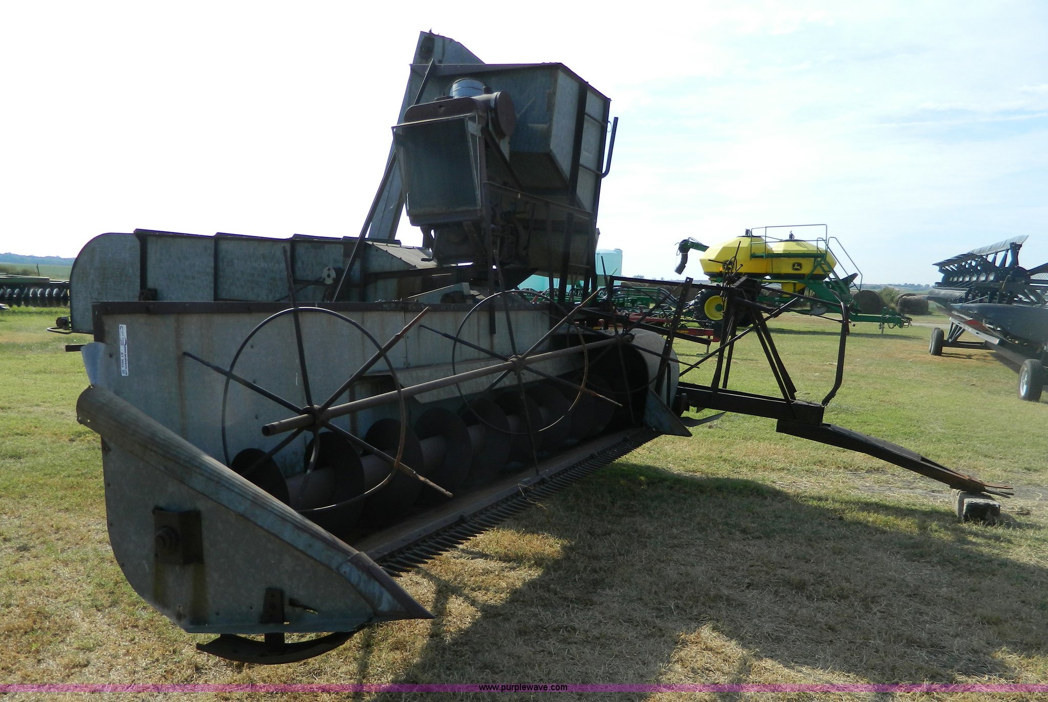 Purple Wave is selling a used Combine in Kansas. This item is a Minneapolis Moline G pull type harvester with the following: Hercules OOC gas engine, Serial 230094, 12' head, Pin hitch, Serial 75292